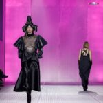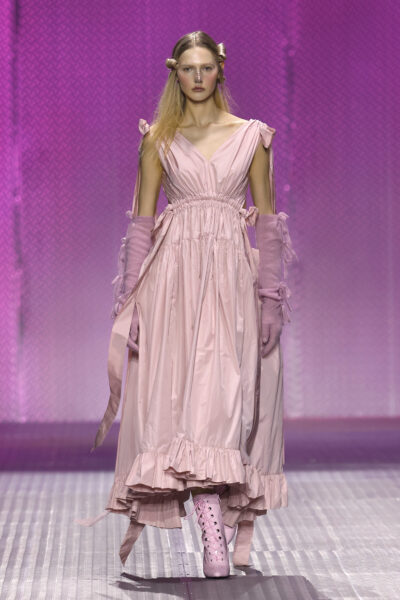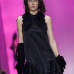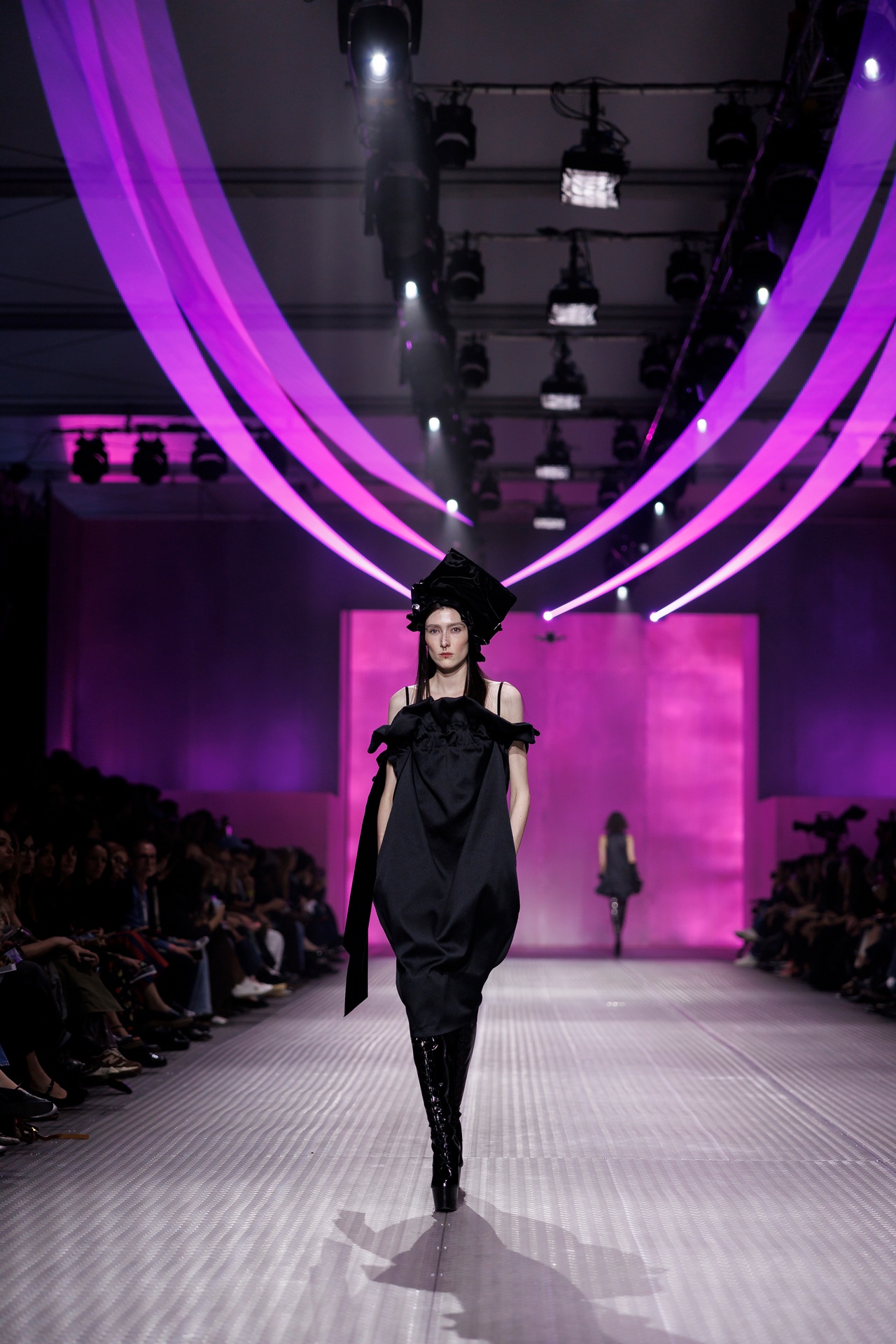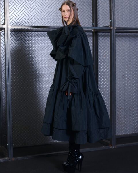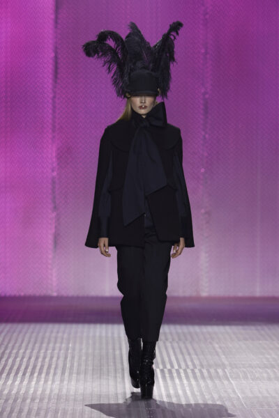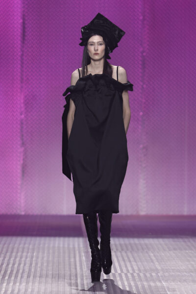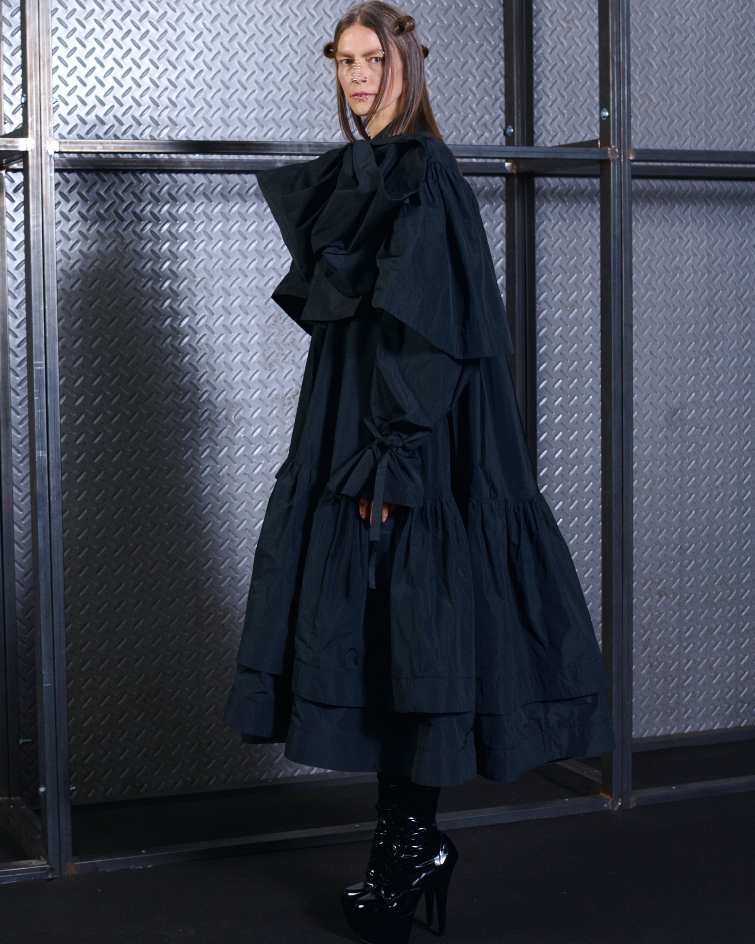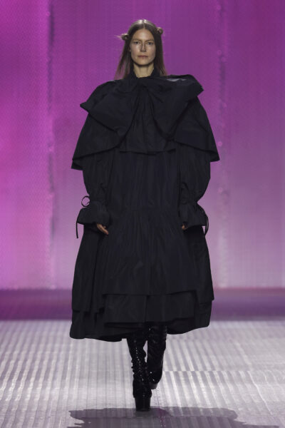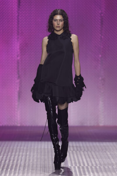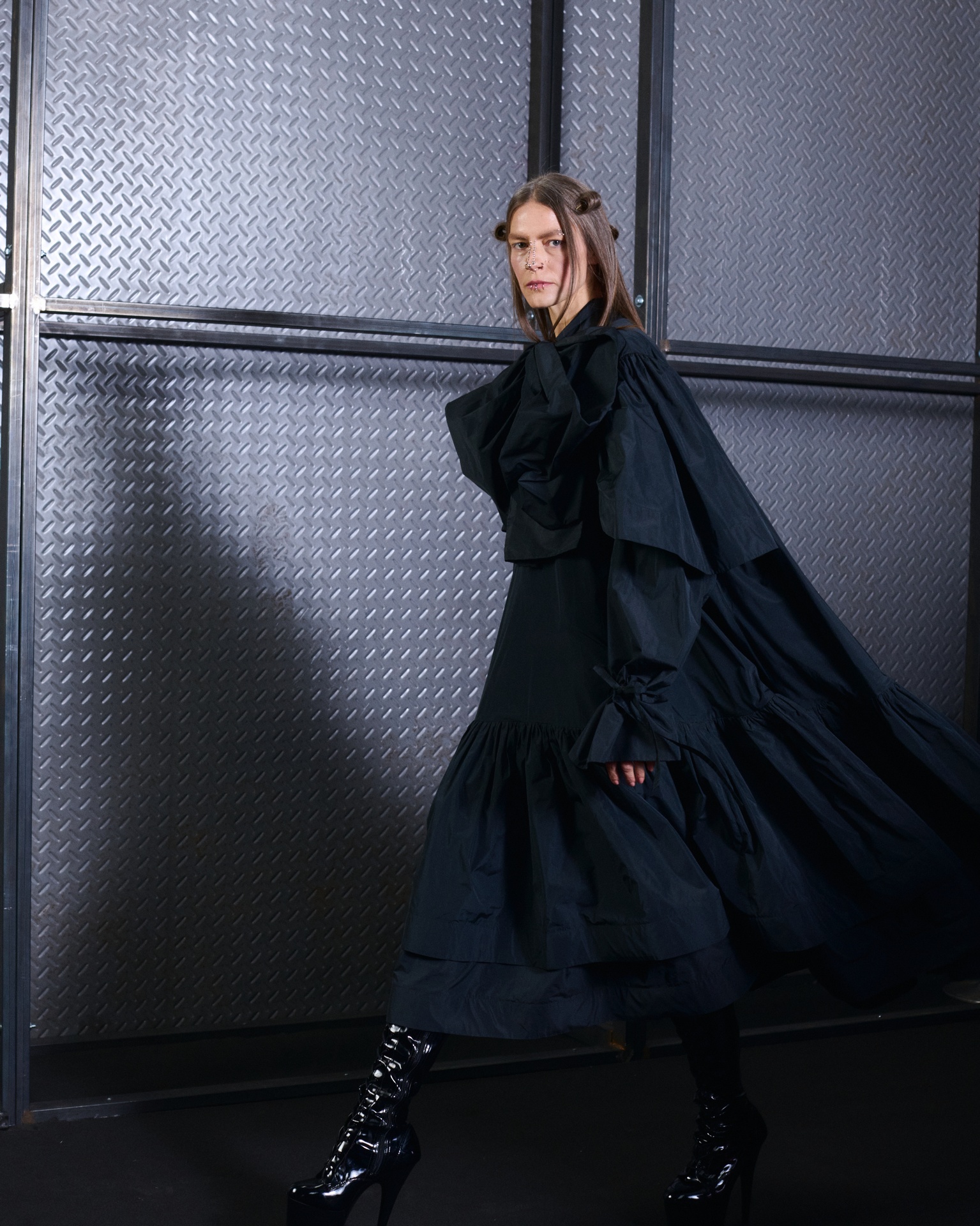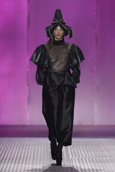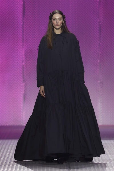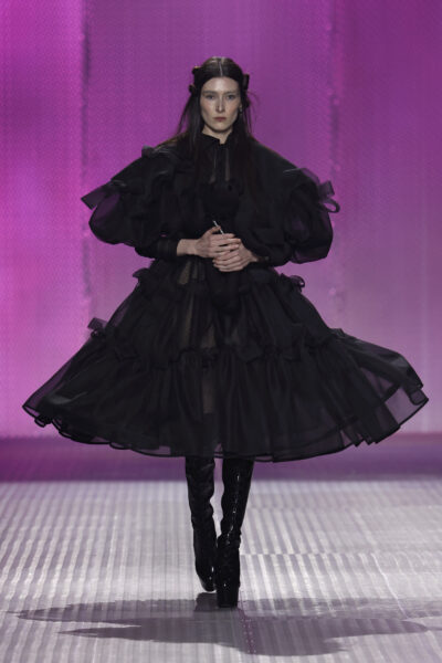 The collection inhabits the romanticism of the 19th century and the refined echoes of haute couture from the 1950s and 1960s. Naïve and kitsch coexist, as well as the melancholic tenderness of the sad clown, theatrical gestures, and historical evocations. Like a curtain slowly rising, cinema and music from all eras appear, alongside the immortal shadow of Anna Maria Mazzini, weaving a universe where dreams and memory walk hand in hand.