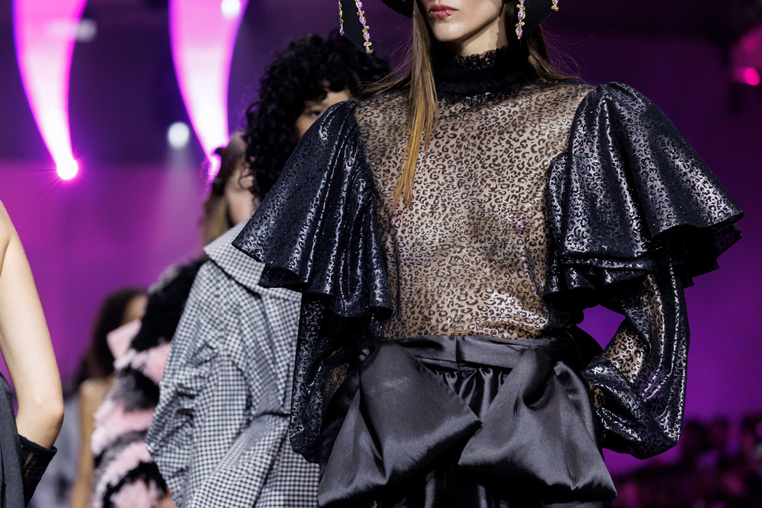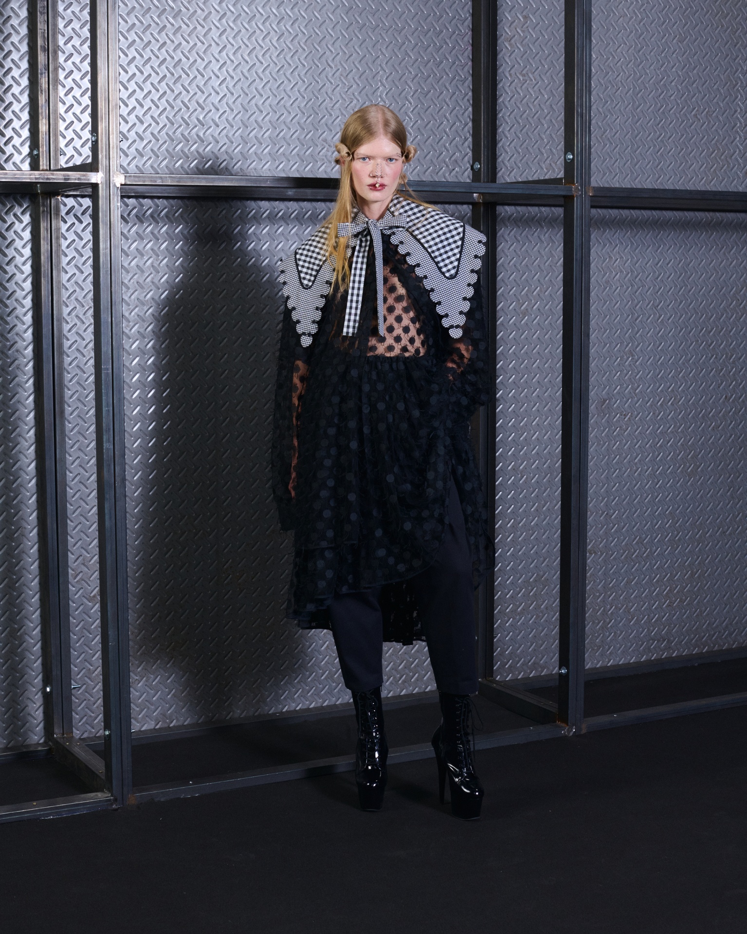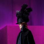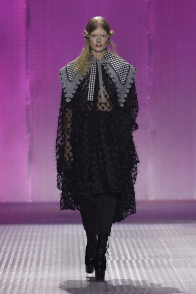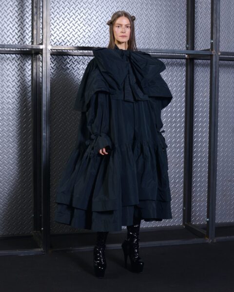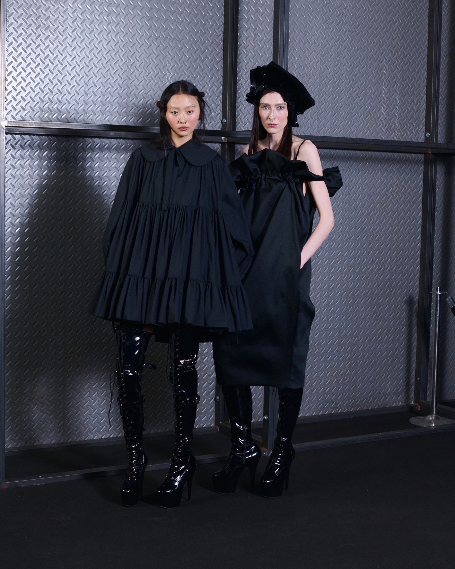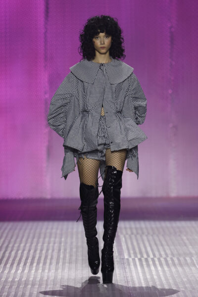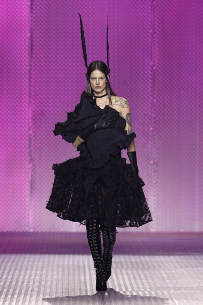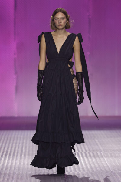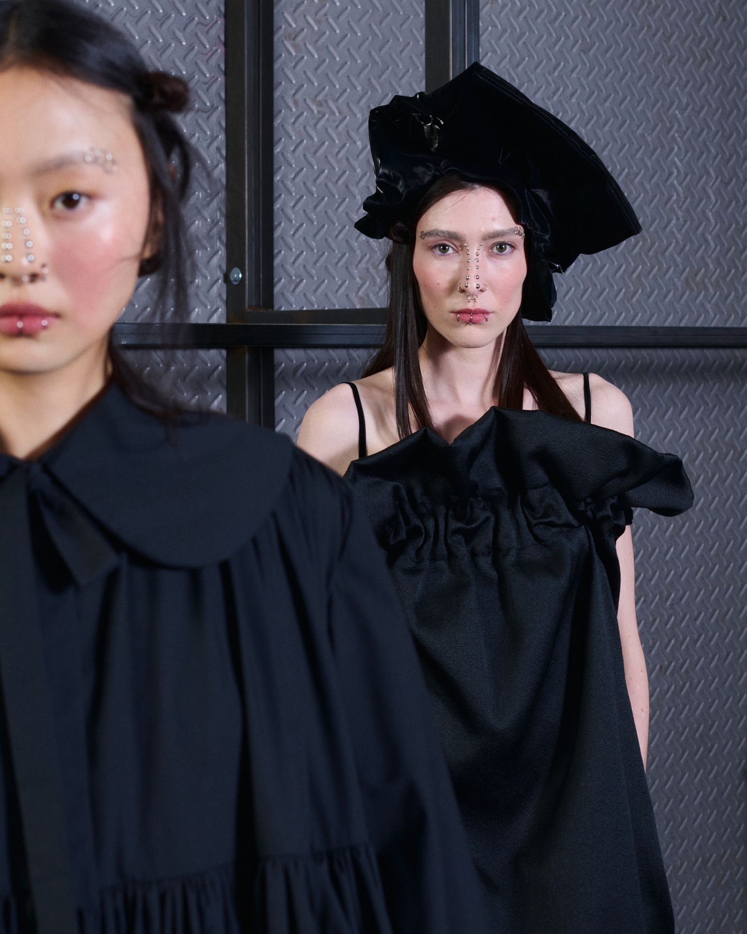 The collection inhabits the romanticism of the 19th century and the refined echoes of haute couture from the 1950s and 1960s. Naïve and kitsch coexist, as well as the melancholic tenderness of the sad clown, theatrical gestures, and historical evocations. Like a curtain slowly rising, cinema and music from all eras appear, alongside the immortal shadow of Anna Maria Mazzini, weaving a universe where dreams and memory walk hand in hand.