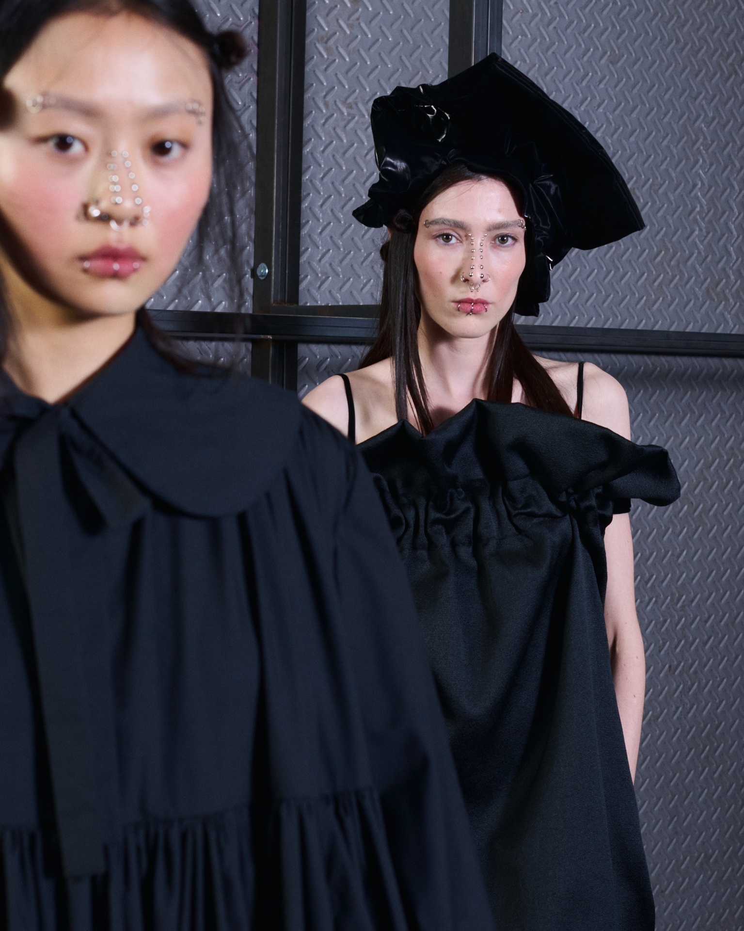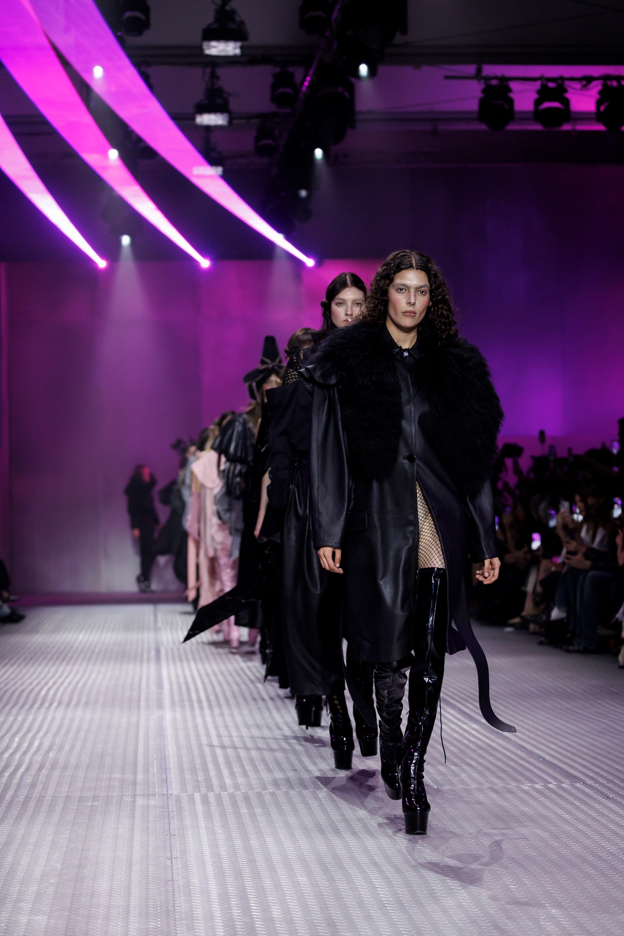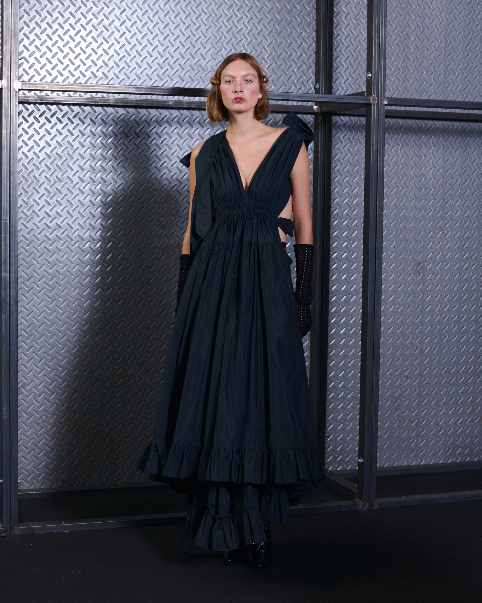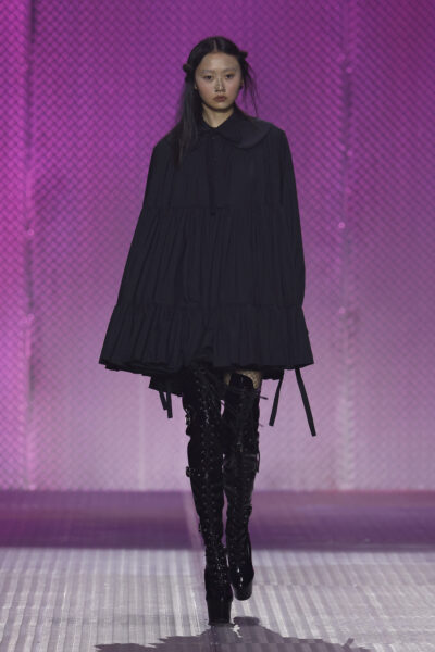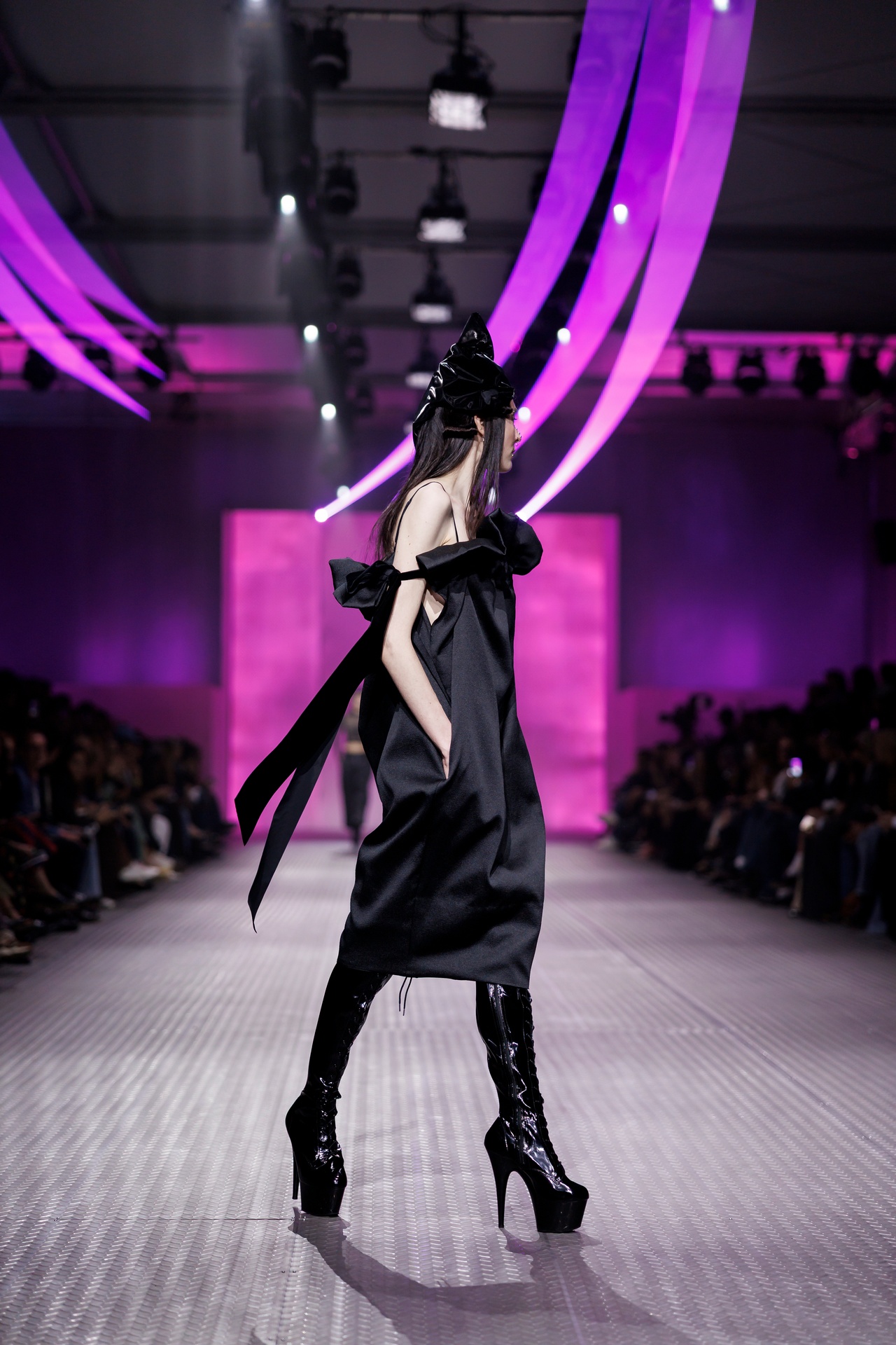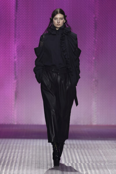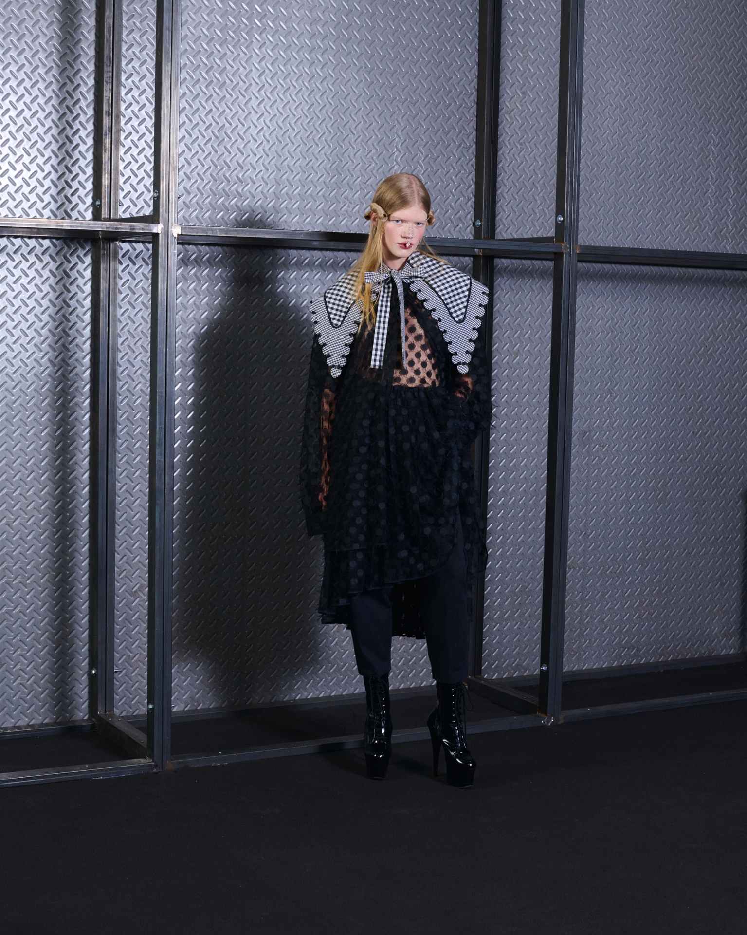 The collection inhabits the romanticism of the 19th century and the refined echoes of haute couture from the 1950s and 1960s. Naïve and kitsch coexist, as well as the melancholic tenderness of the sad clown, theatrical gestures, and historical evocations. Like a curtain slowly rising, cinema and music from all eras appear, alongside the immortal shadow of Anna Maria Mazzini, weaving a universe where dreams and memory walk hand in hand.