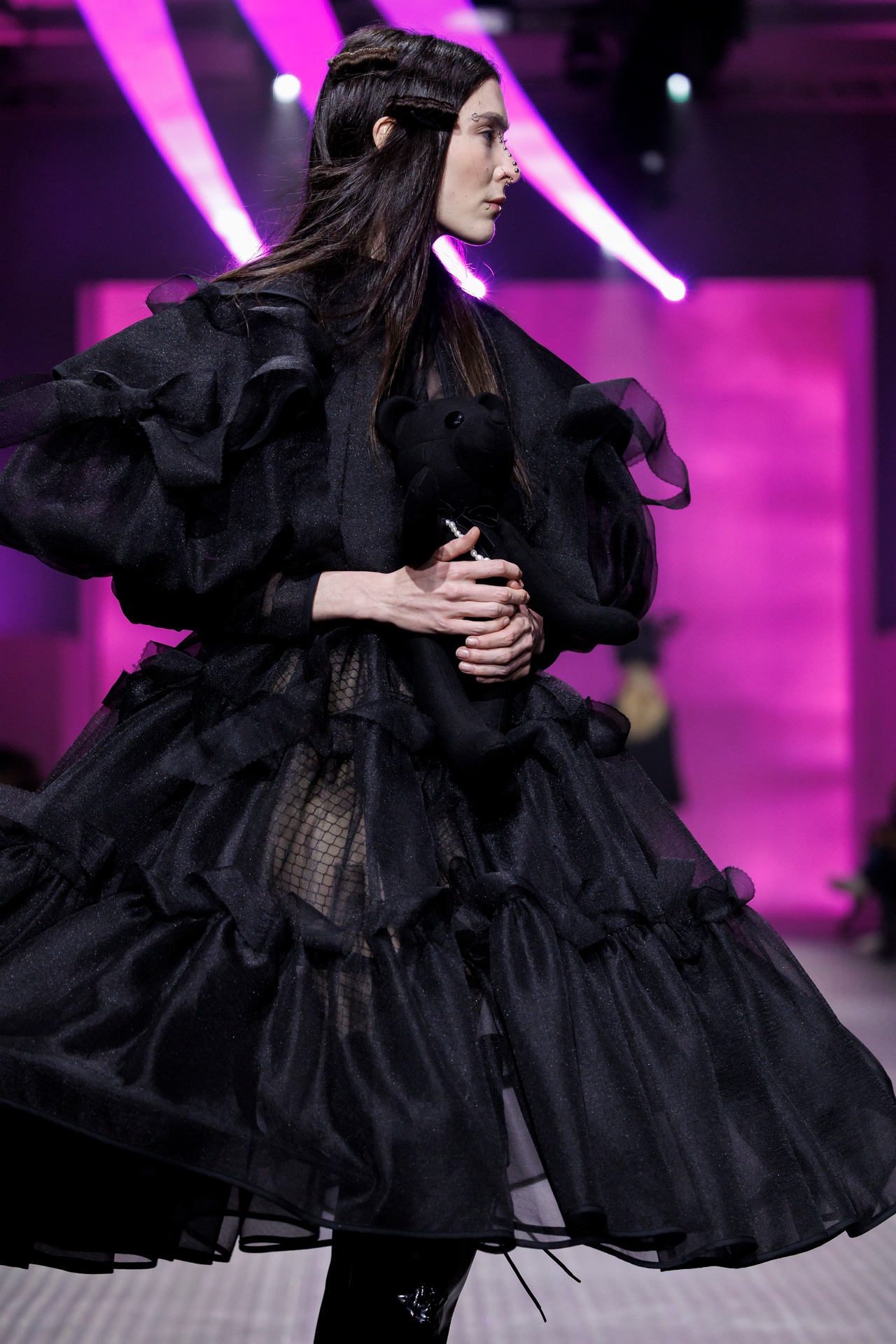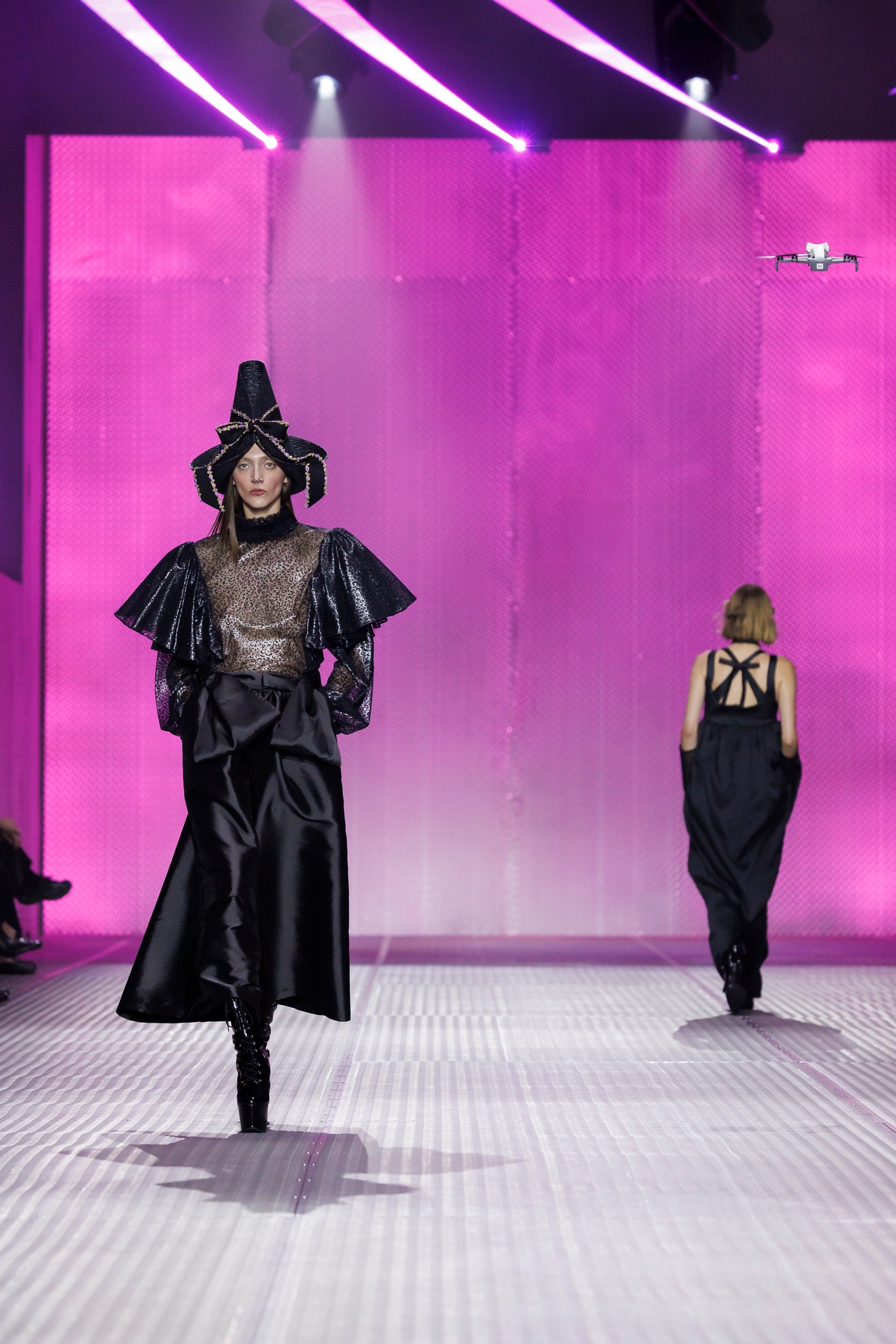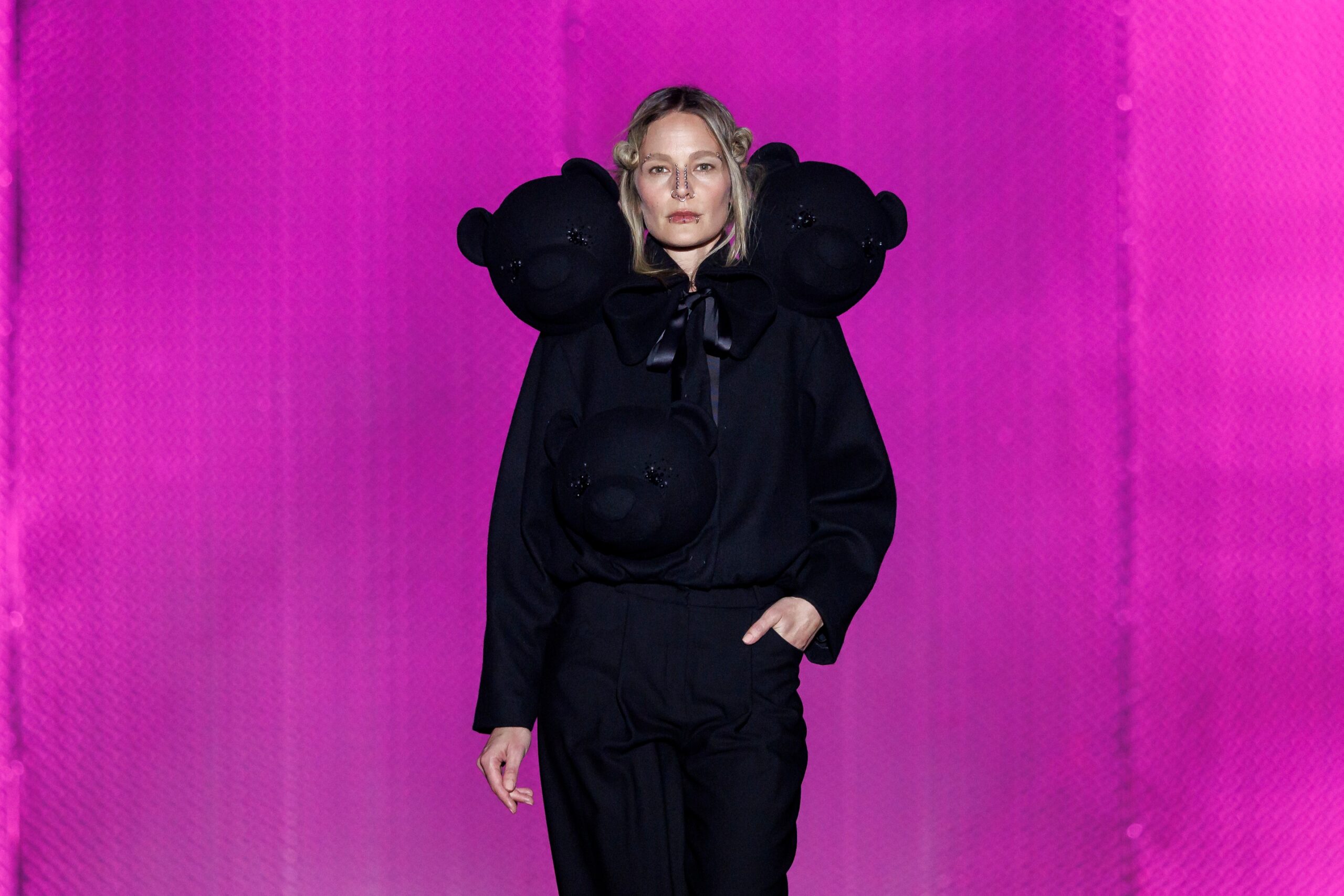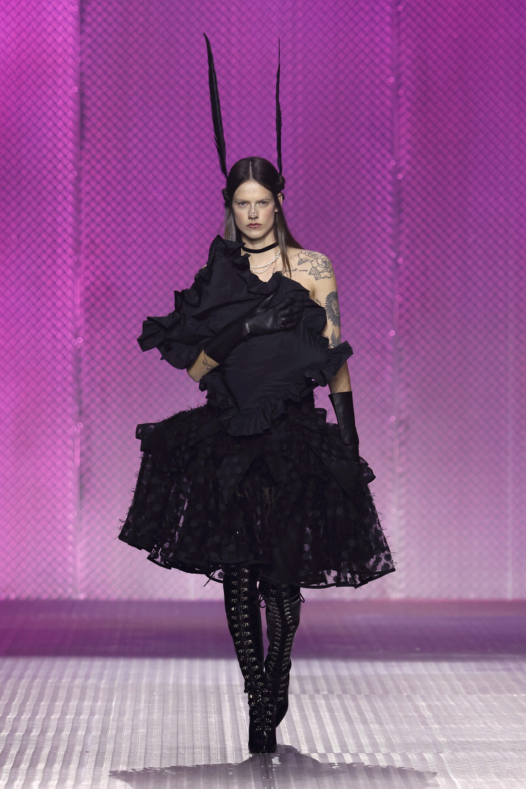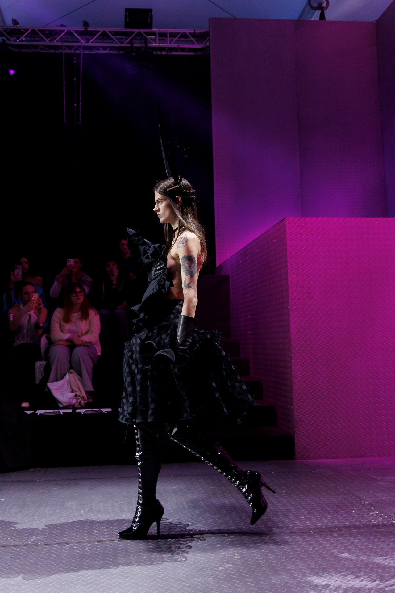 The collection inhabits the romanticism of the 19th century and the refined echoes of haute couture from the 1950s and 1960s. Naïve and kitsch coexist, as well as the melancholic tenderness of the sad clown, theatrical gestures, and historical evocations. Like a curtain slowly rising, cinema and music from all eras appear, alongside the immortal shadow of Anna Maria Mazzini, weaving a universe where dreams and memory walk hand in hand.