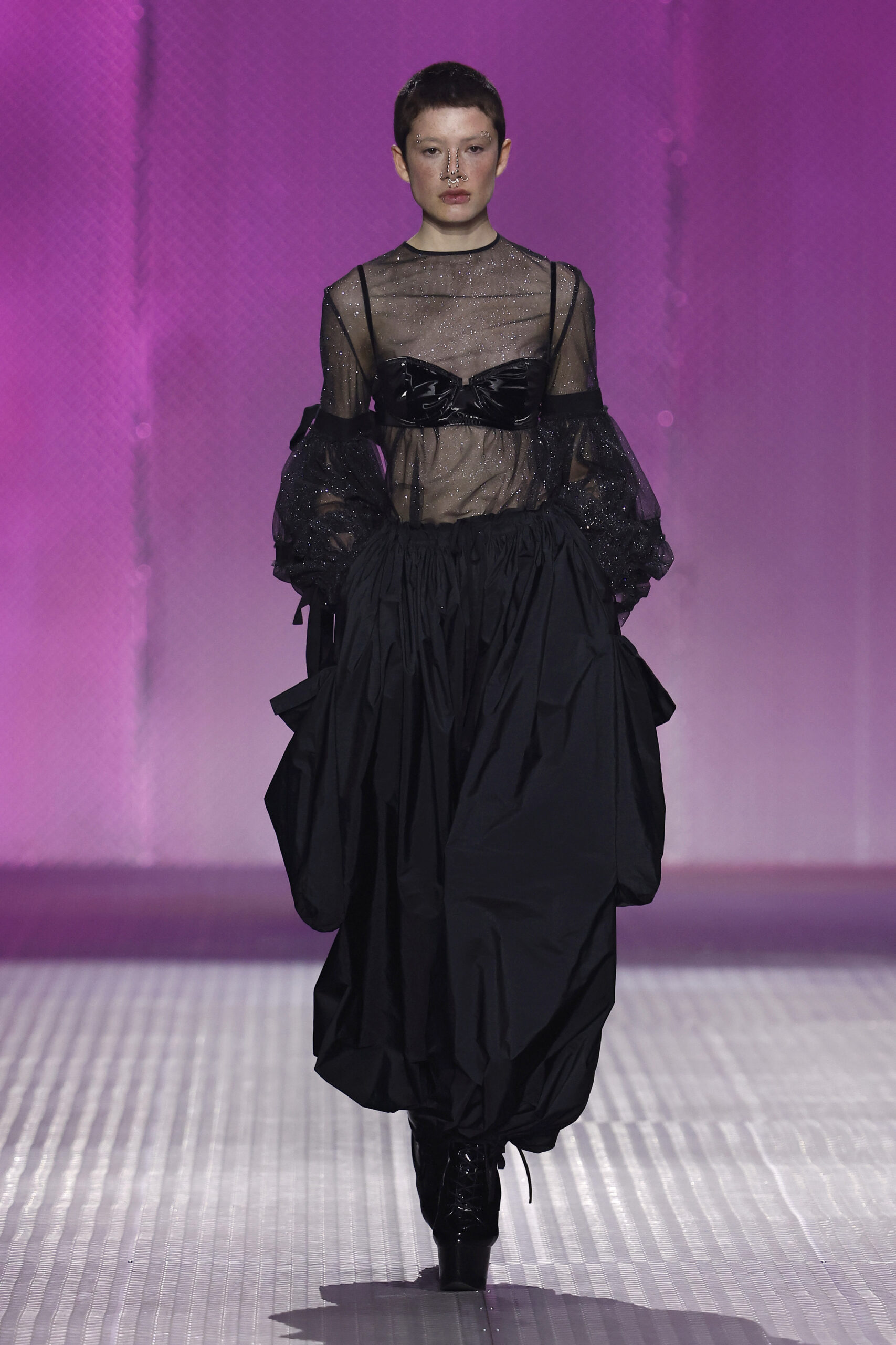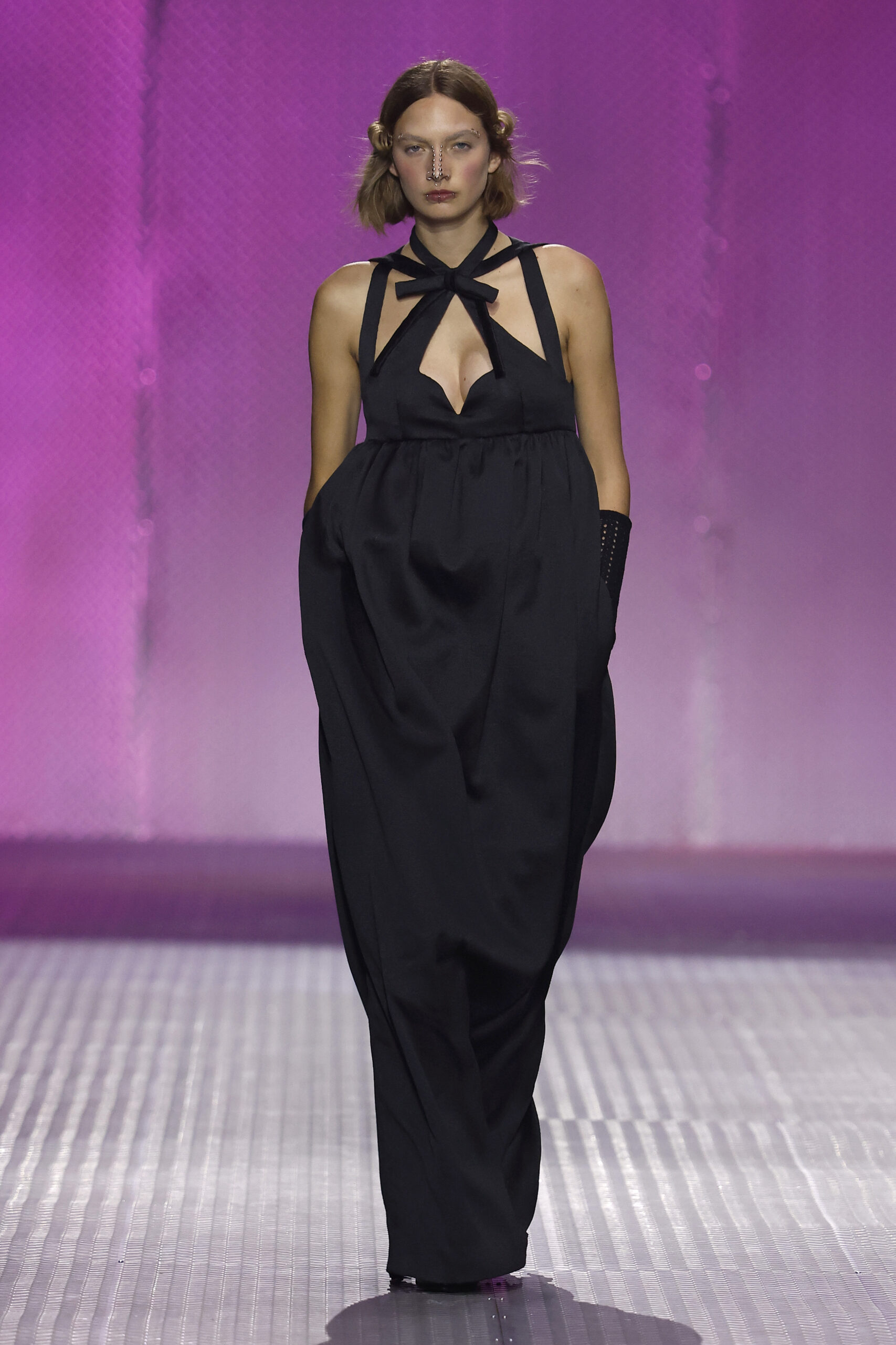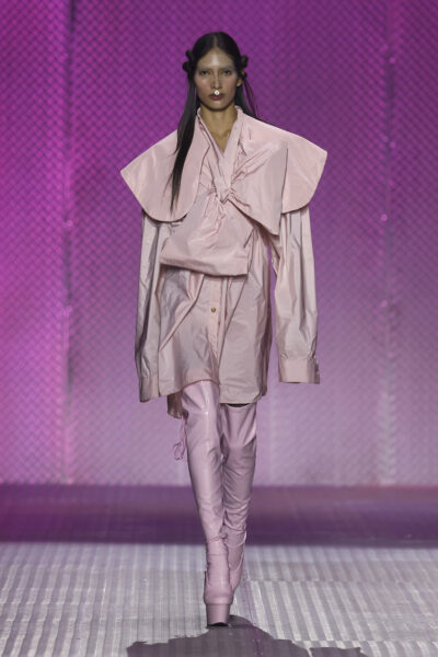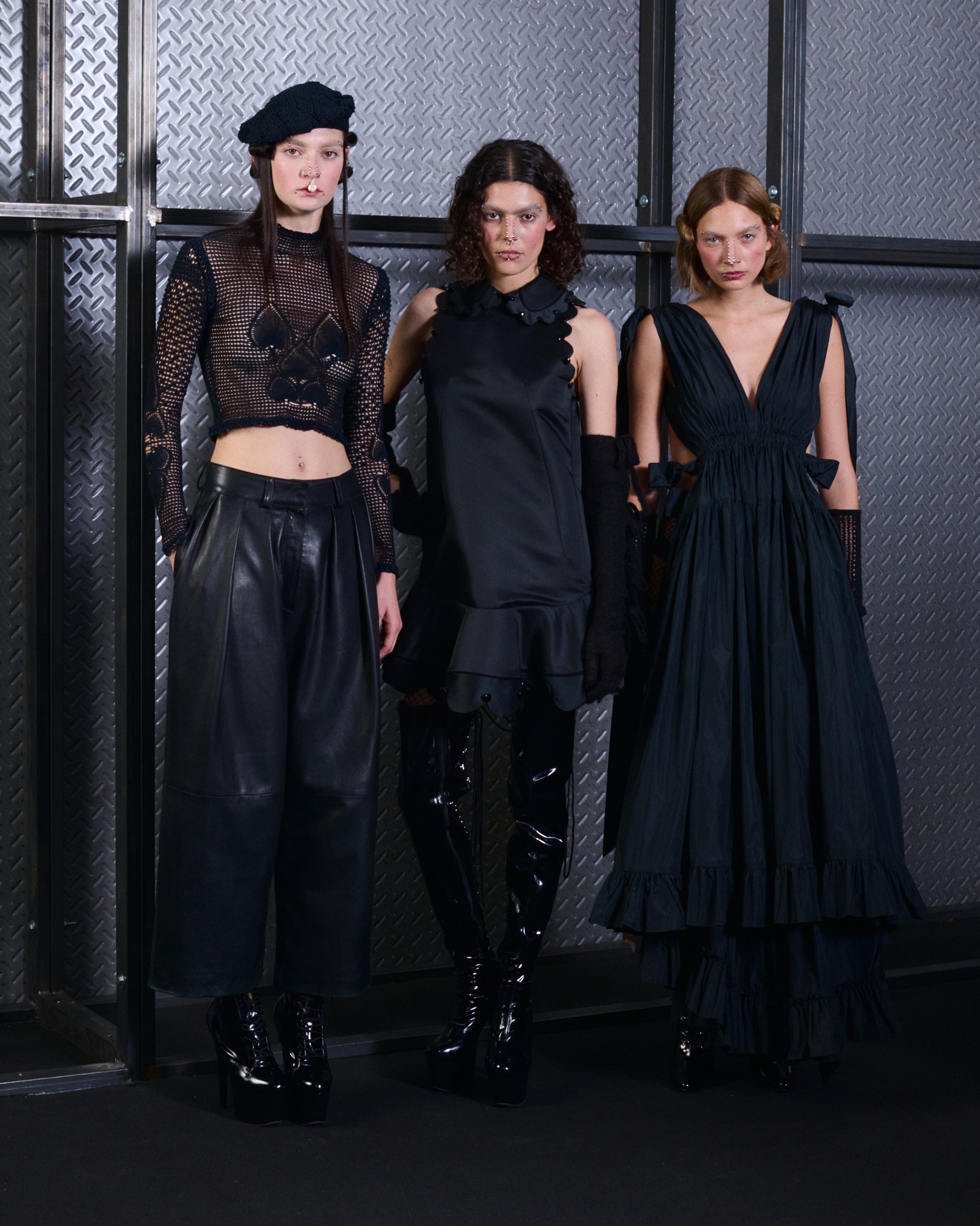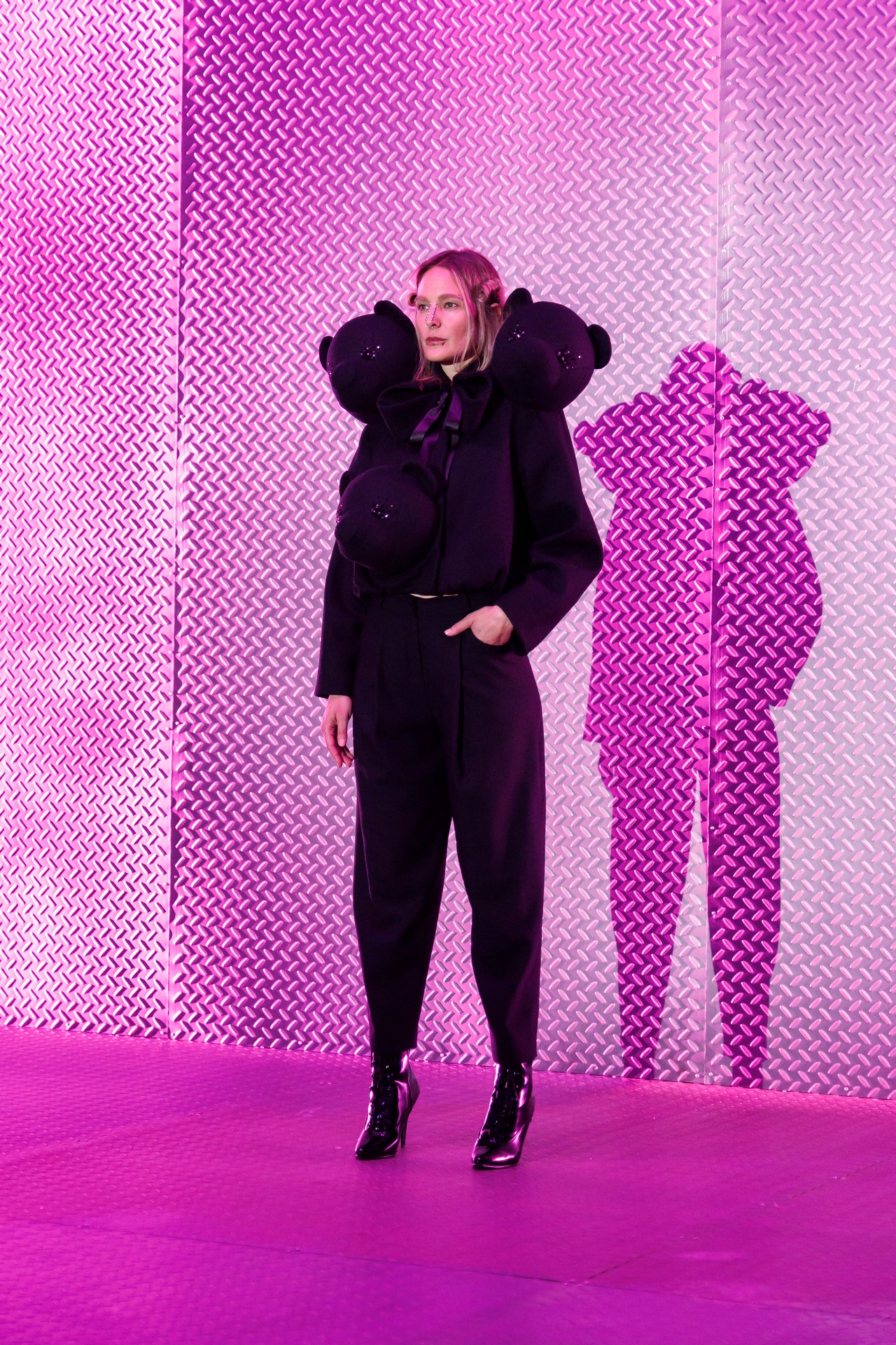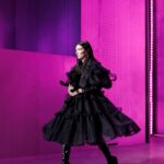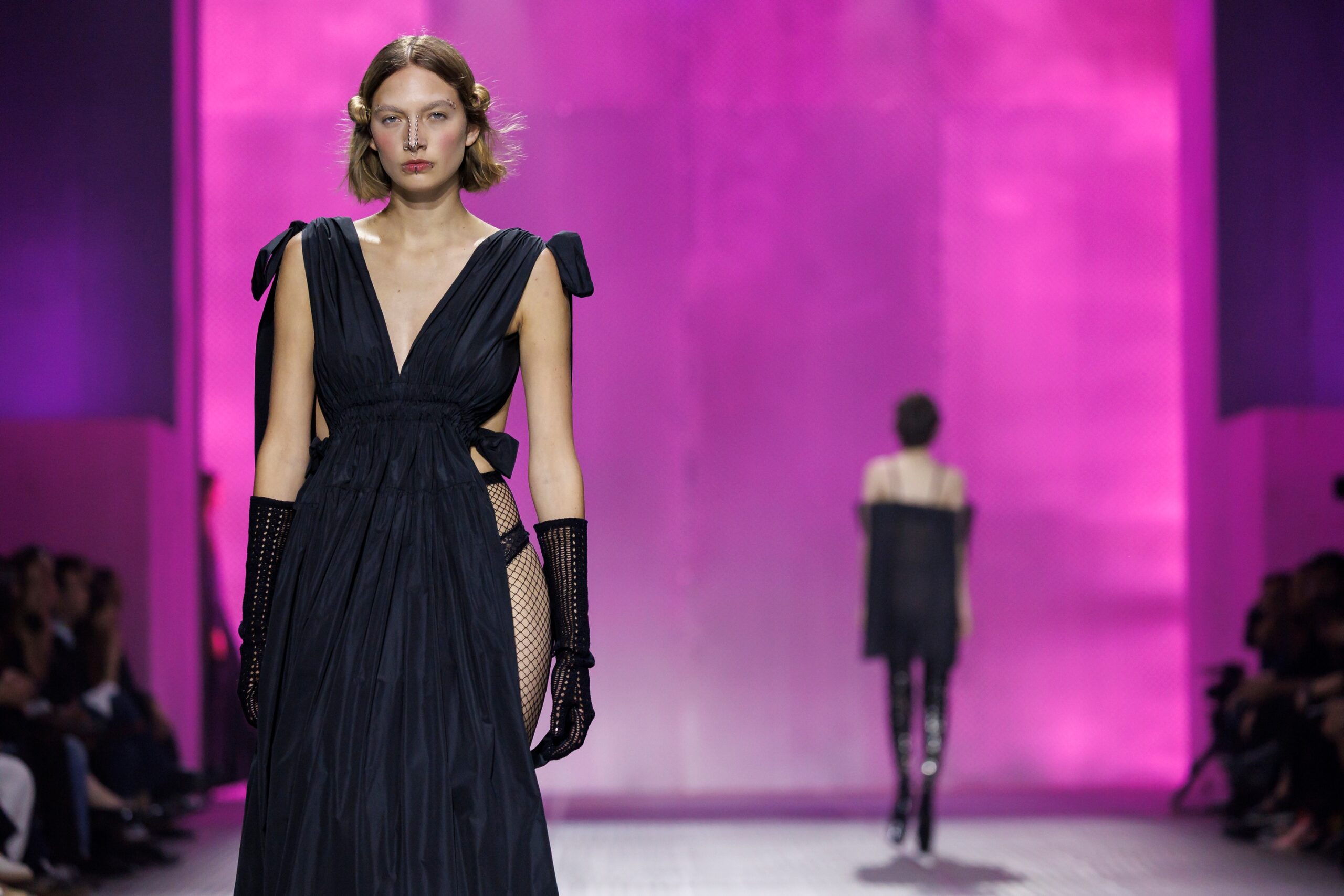 The collection inhabits the romanticism of the 19th century and the refined echoes of haute couture from the 1950s and 1960s. Naïve and kitsch coexist, as well as the melancholic tenderness of the sad clown, theatrical gestures, and historical evocations. Like a curtain slowly rising, cinema and music from all eras appear, alongside the immortal shadow of Anna Maria Mazzini, weaving a universe where dreams and memory walk hand in hand.