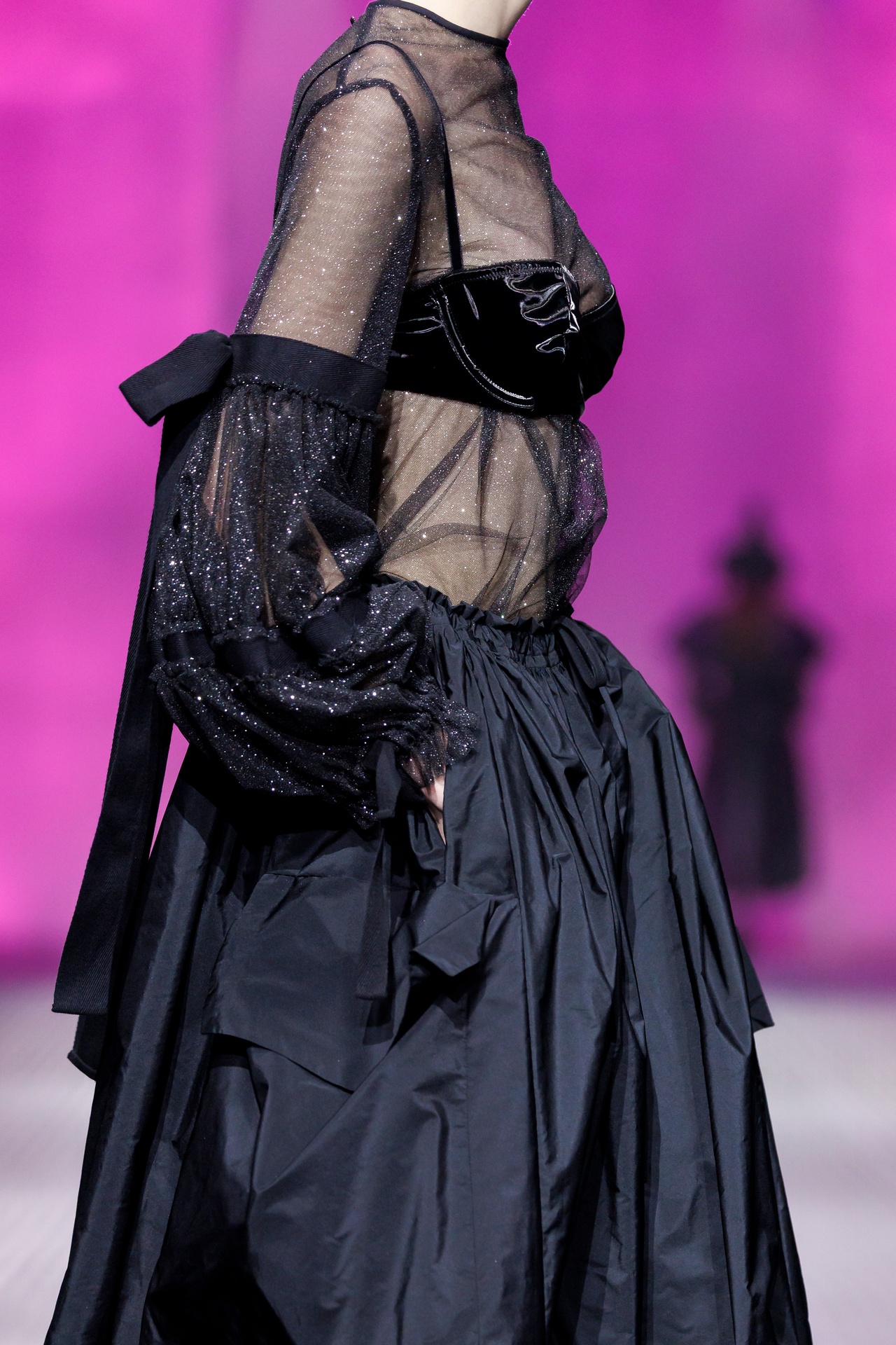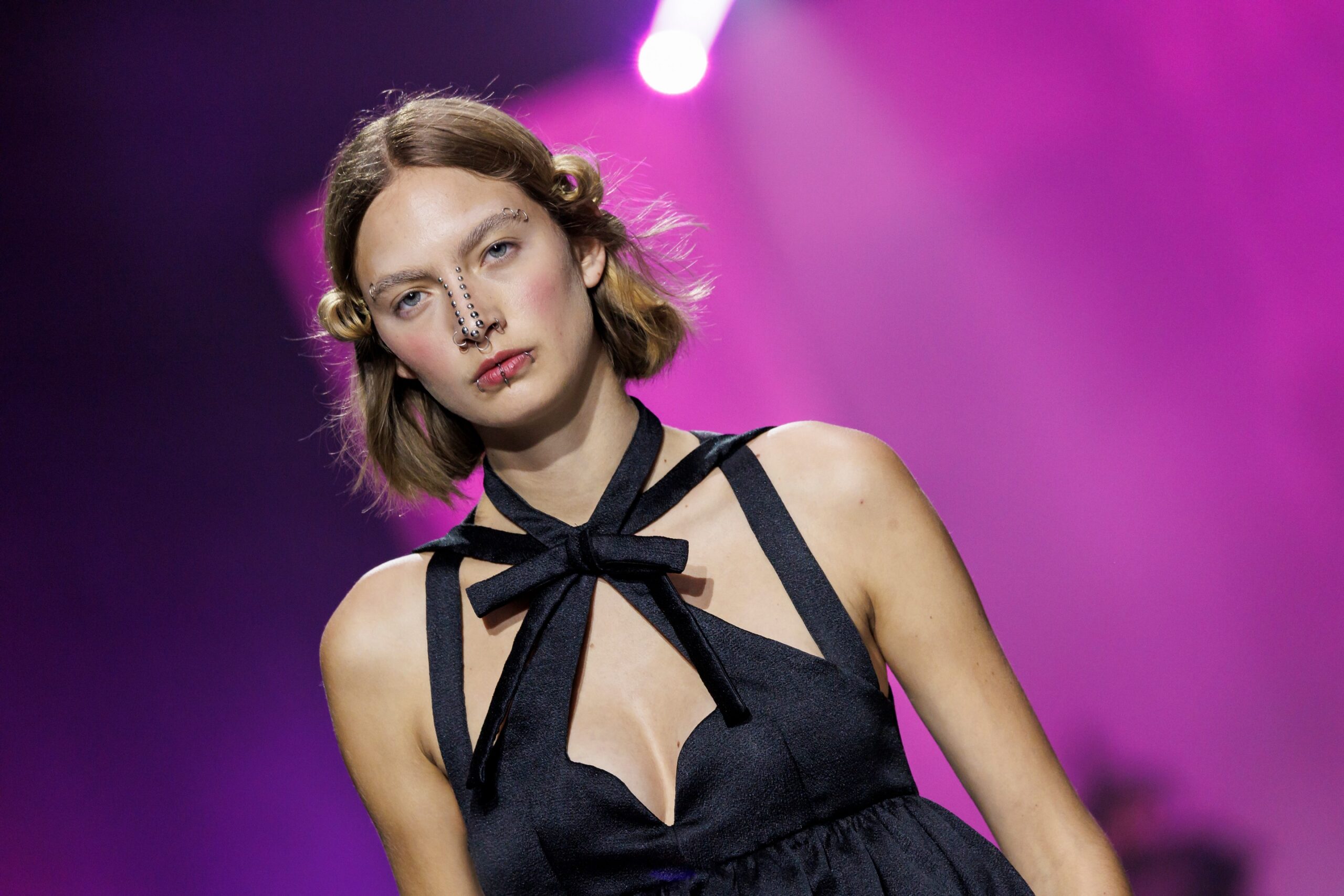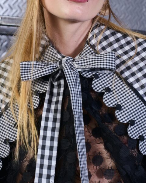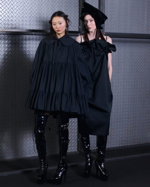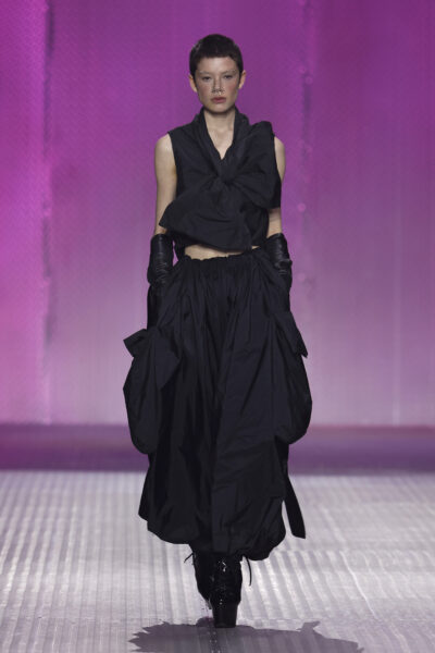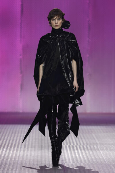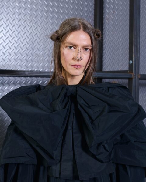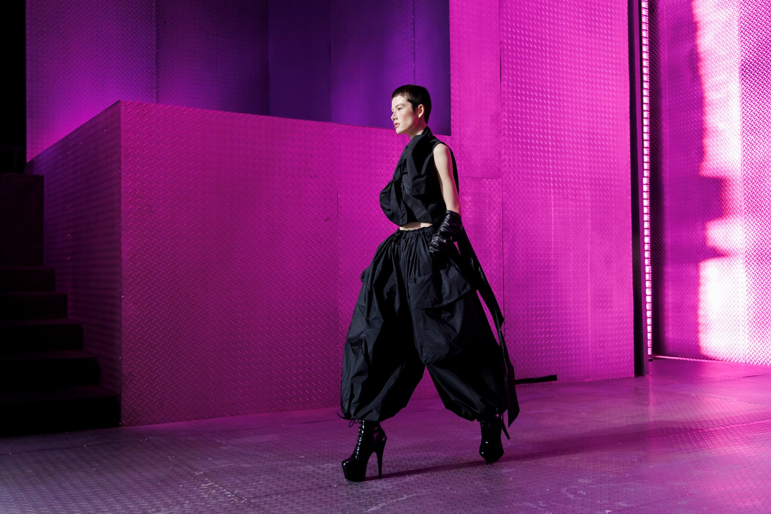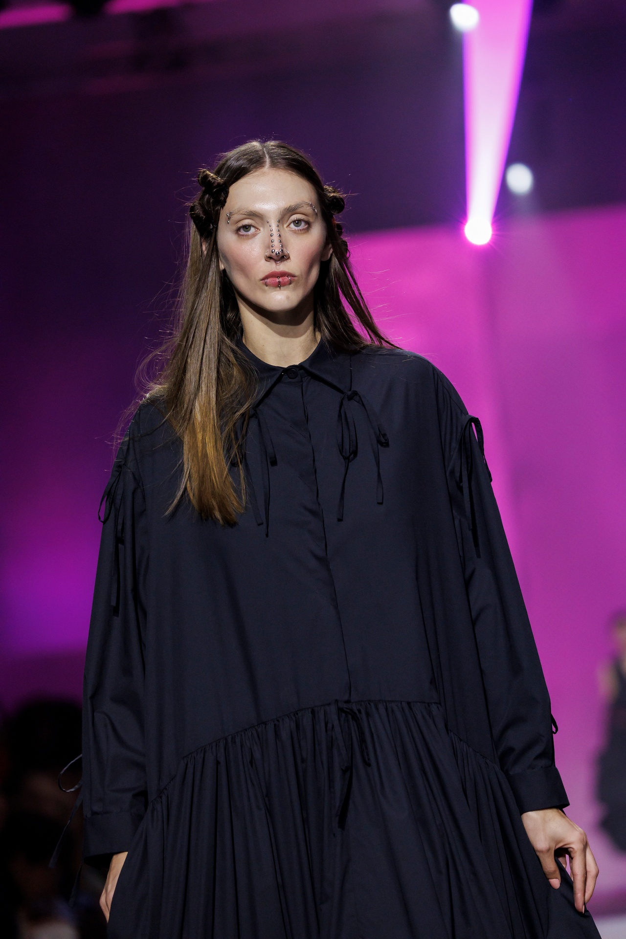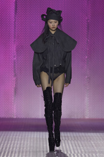 The collection inhabits the romanticism of the 19th century and the refined echoes of haute couture from the 1950s and 1960s. Naïve and kitsch coexist, as well as the melancholic tenderness of the sad clown, theatrical gestures, and historical evocations. Like a curtain slowly rising, cinema and music from all eras appear, alongside the immortal shadow of Anna Maria Mazzini, weaving a universe where dreams and memory walk hand in hand.