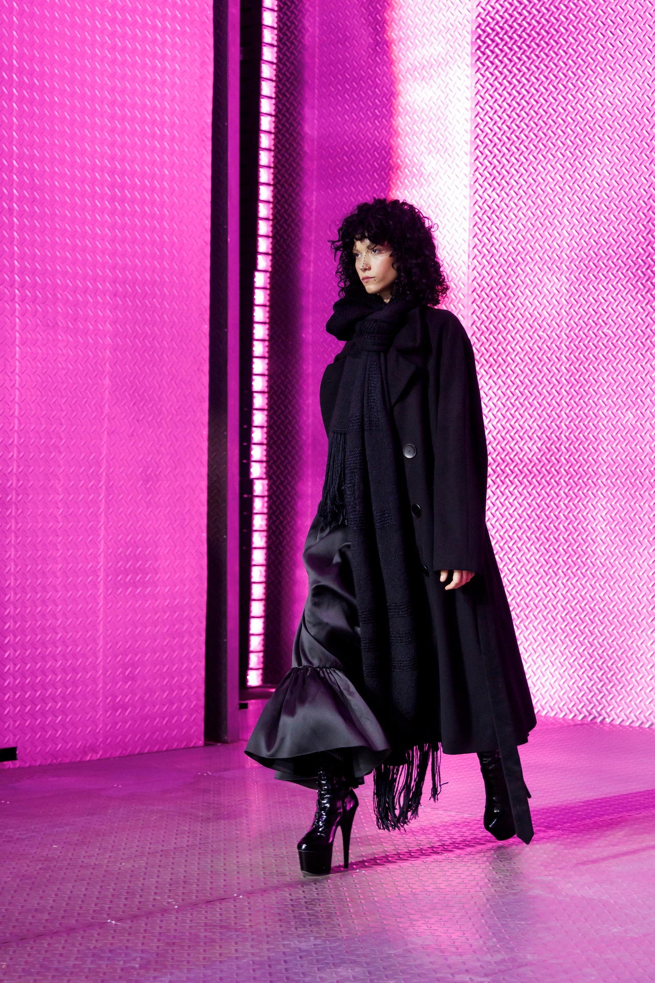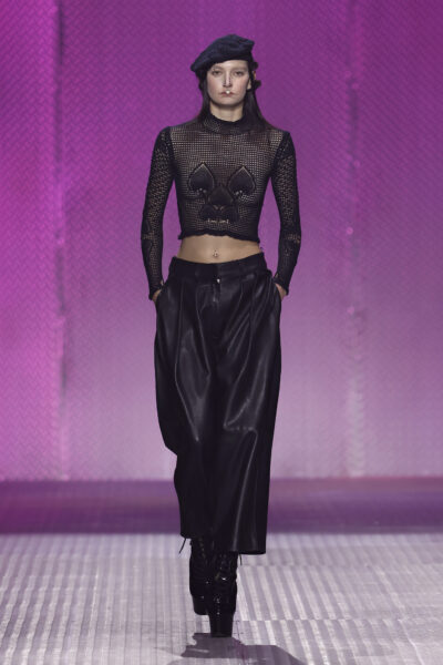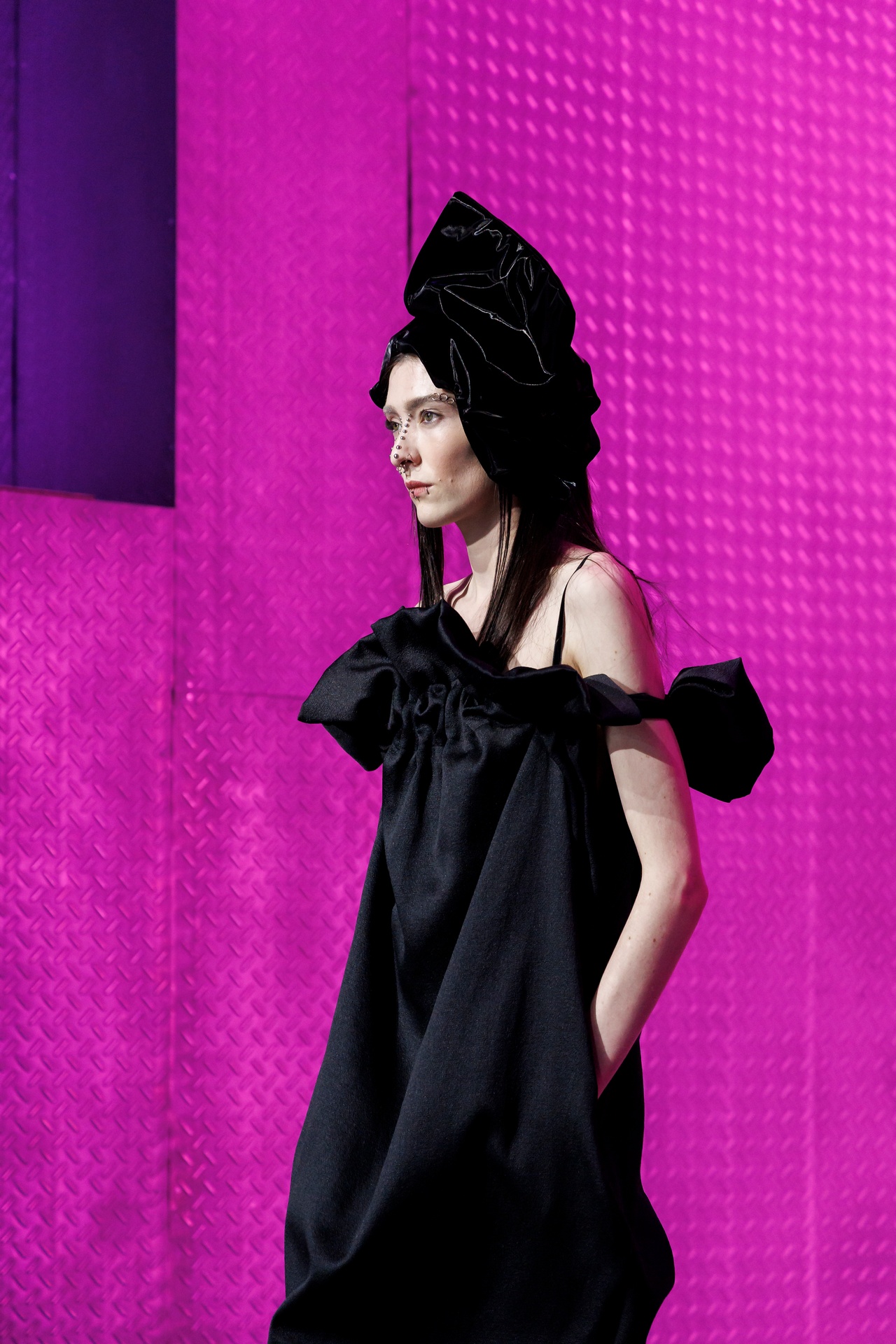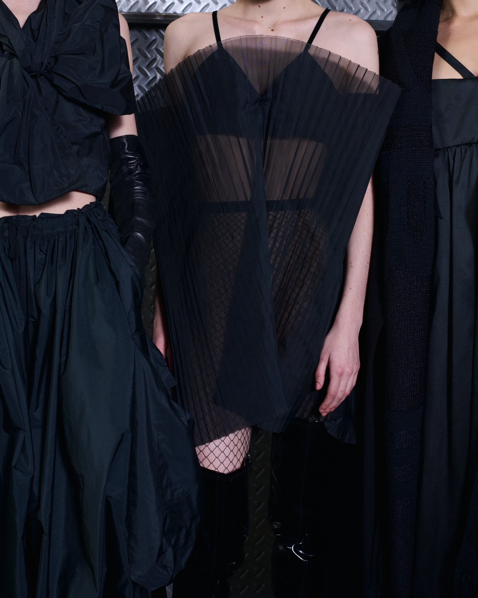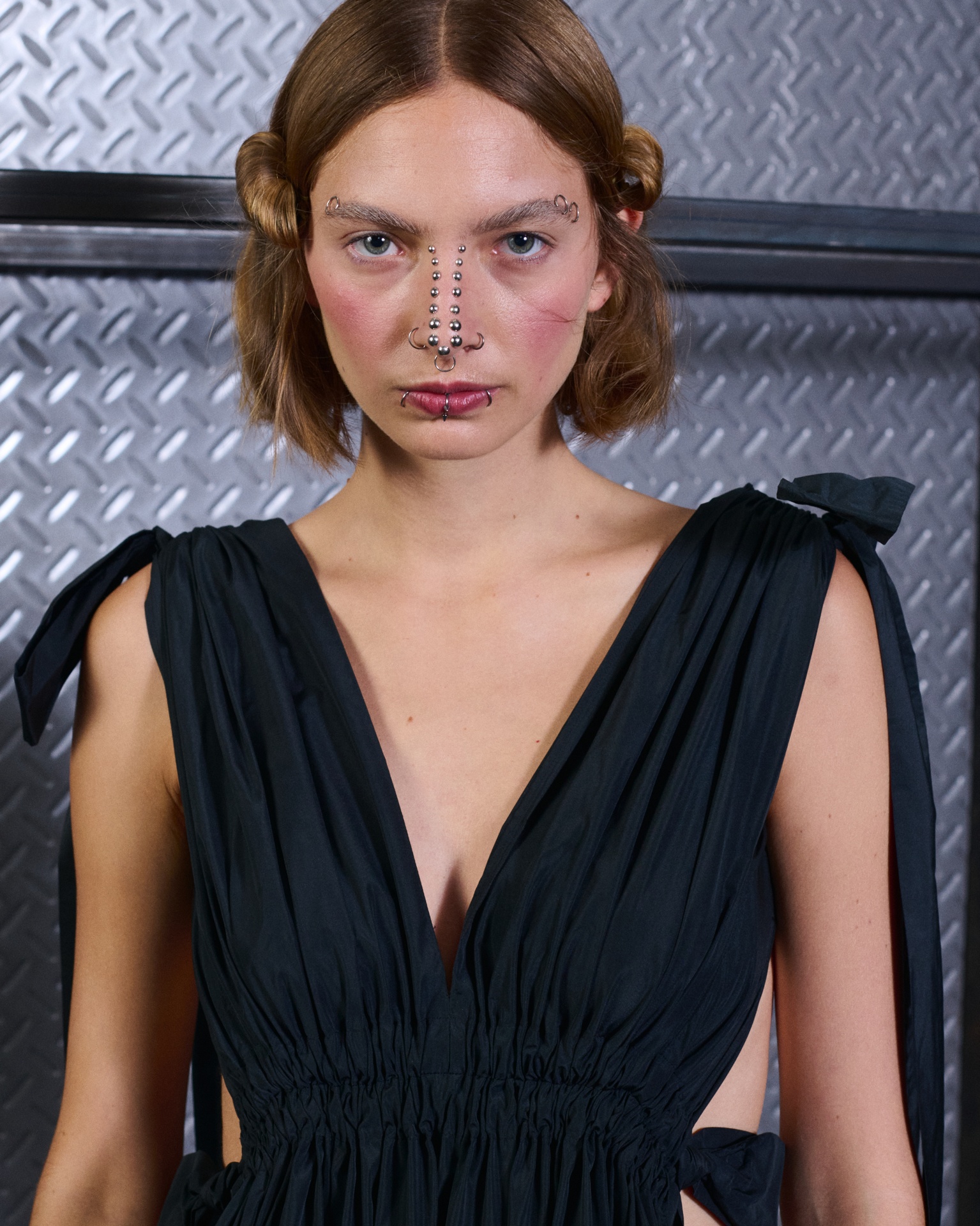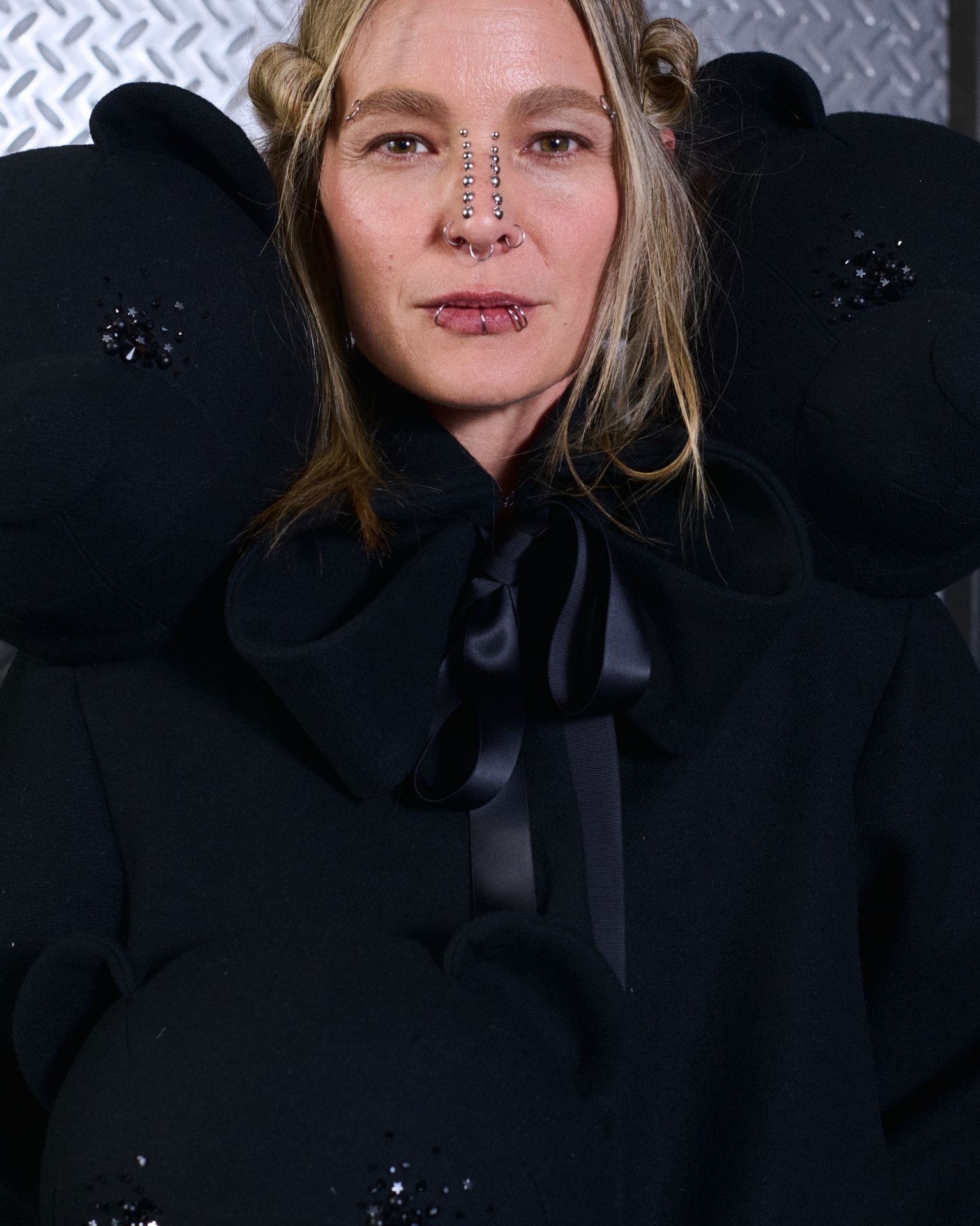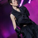 The collection inhabits the romanticism of the 19th century and the refined echoes of haute couture from the 1950s and 1960s. Naïve and kitsch coexist, as well as the melancholic tenderness of the sad clown, theatrical gestures, and historical evocations. Like a curtain slowly rising, cinema and music from all eras appear, alongside the immortal shadow of Anna Maria Mazzini, weaving a universe where dreams and memory walk hand in hand.