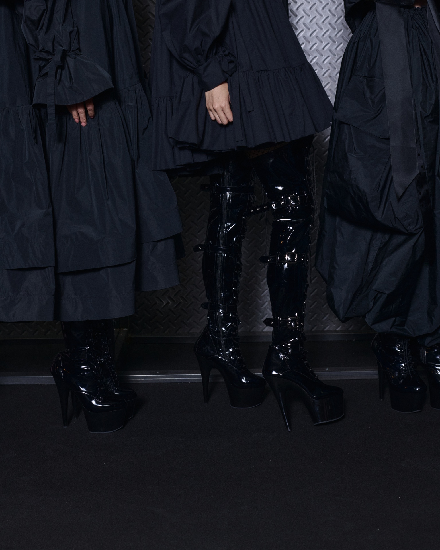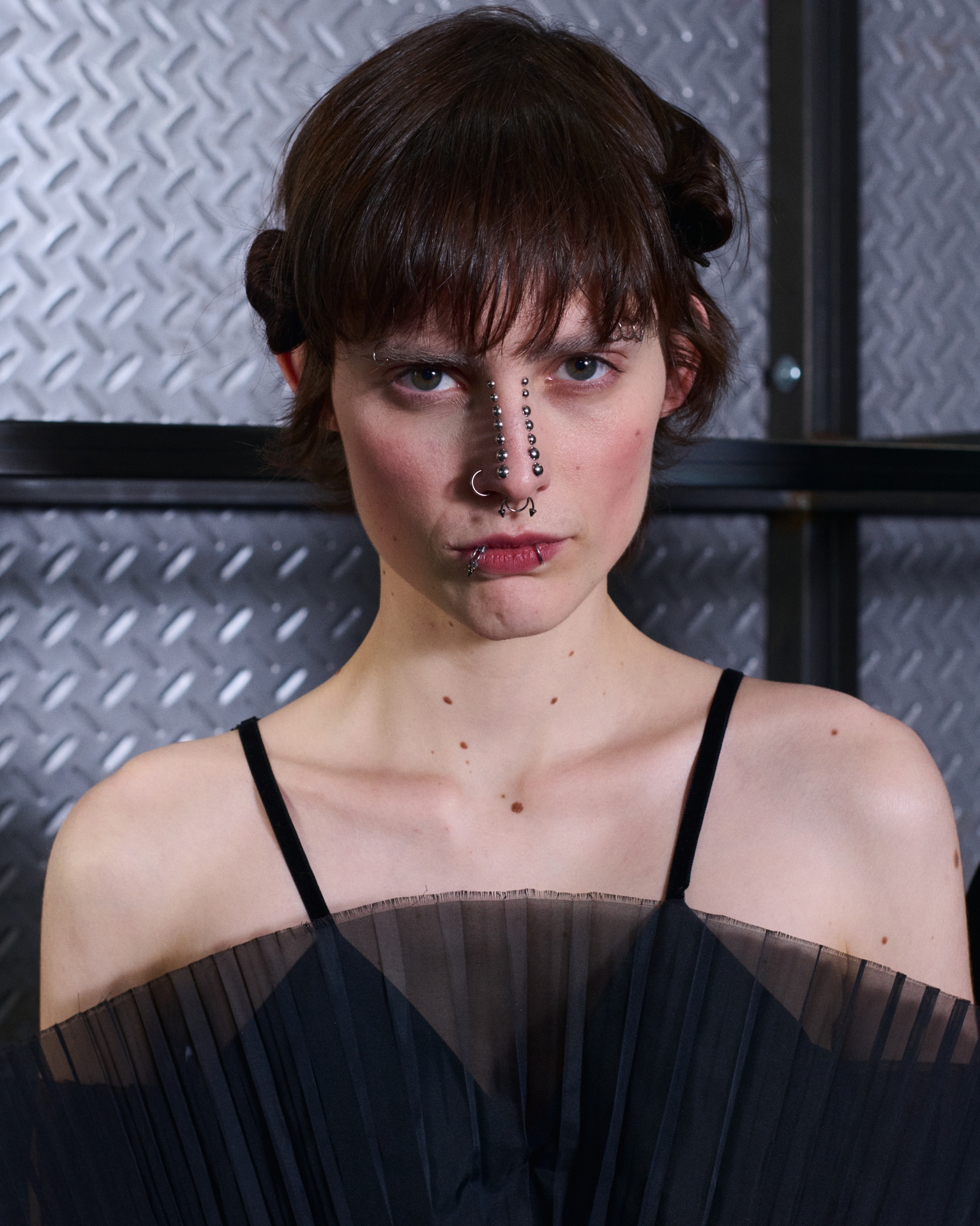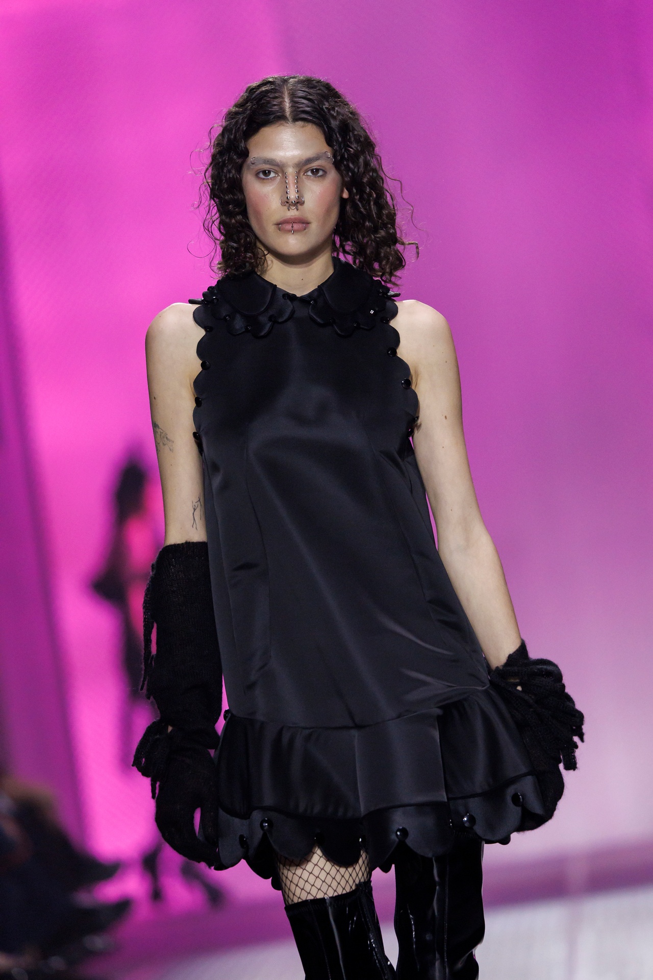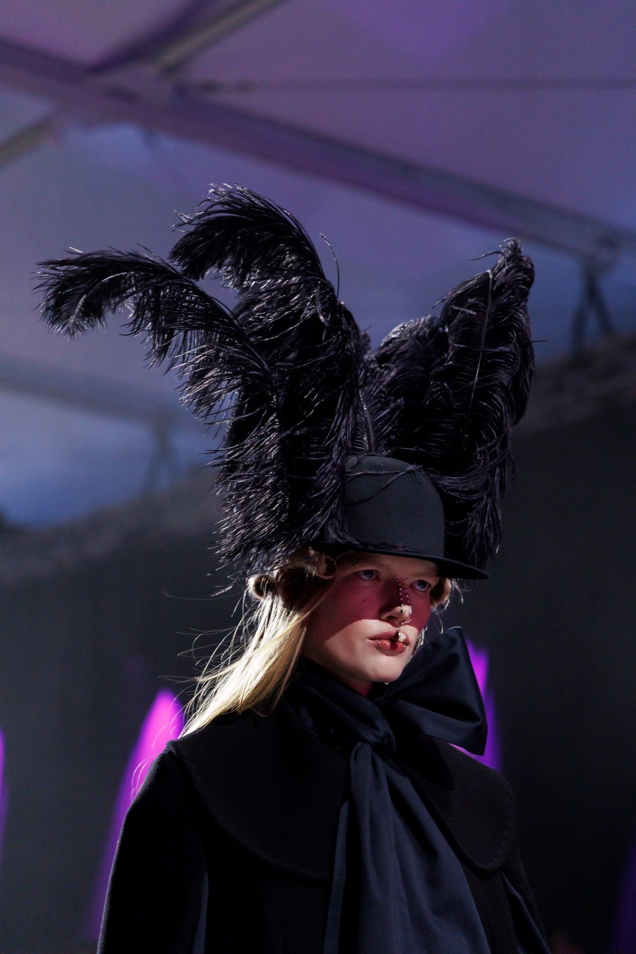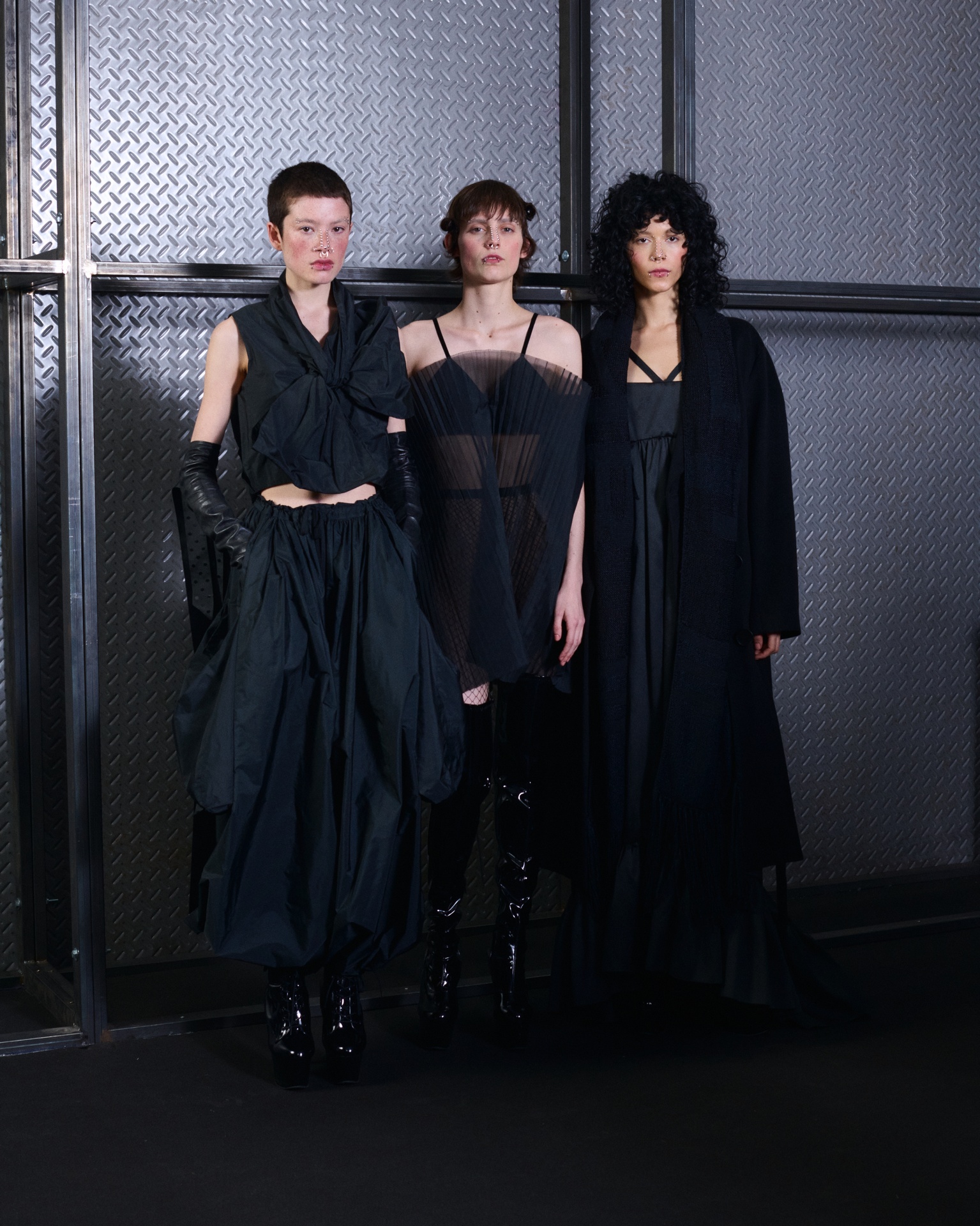 The collection inhabits the romanticism of the 19th century and the refined echoes of haute couture from the 1950s and 1960s. Naïve and kitsch coexist, as well as the melancholic tenderness of the sad clown, theatrical gestures, and historical evocations. Like a curtain slowly rising, cinema and music from all eras appear, alongside the immortal shadow of Anna Maria Mazzini, weaving a universe where dreams and memory walk hand in hand.