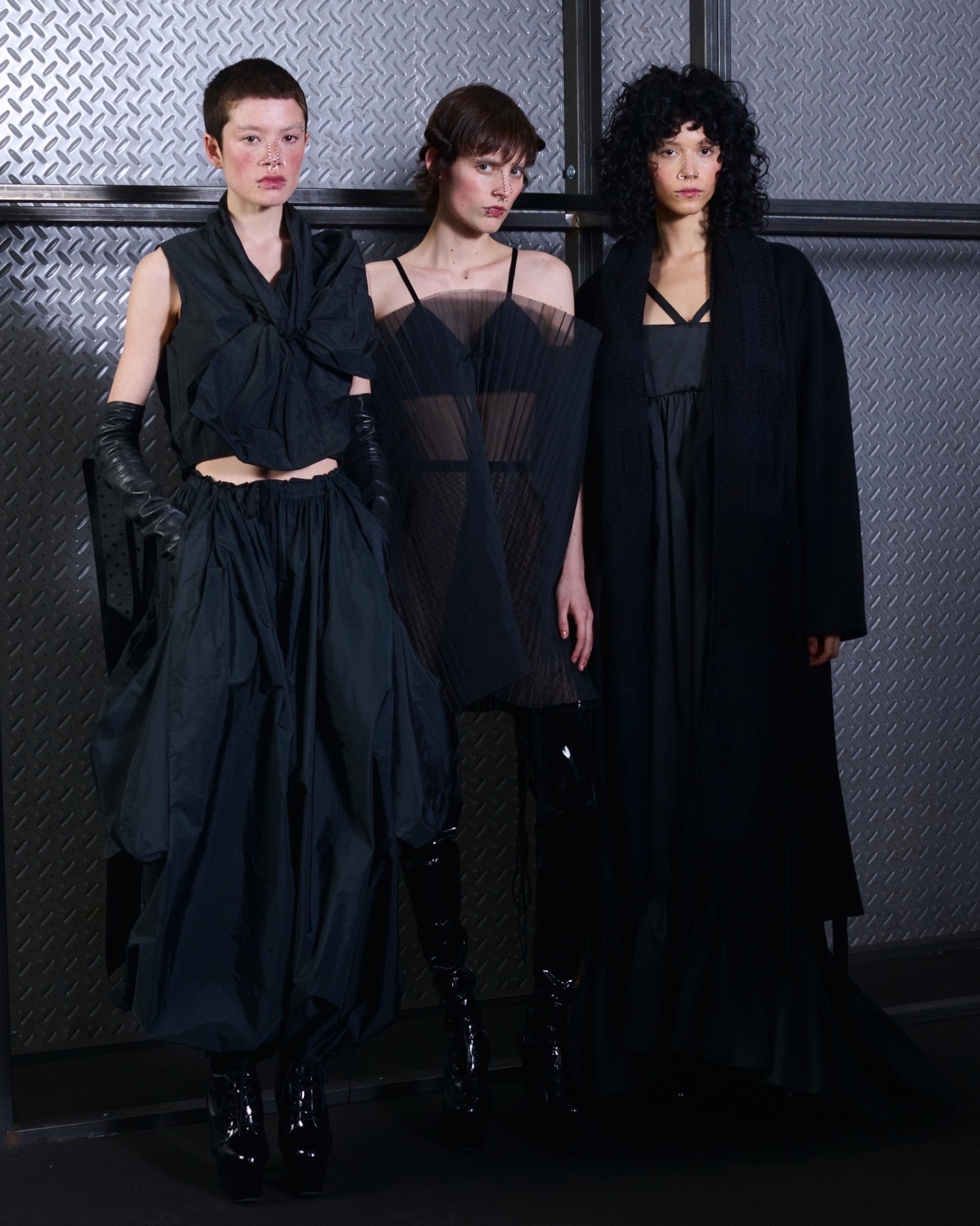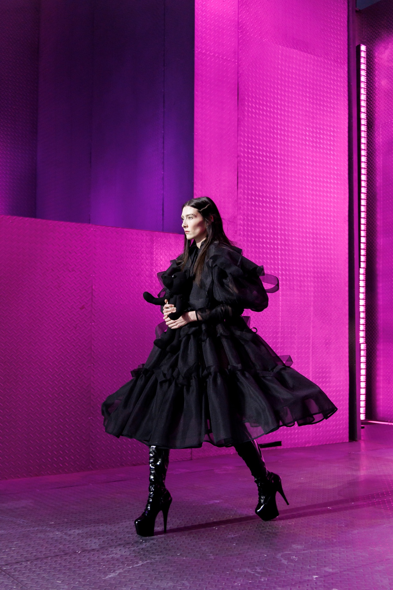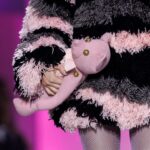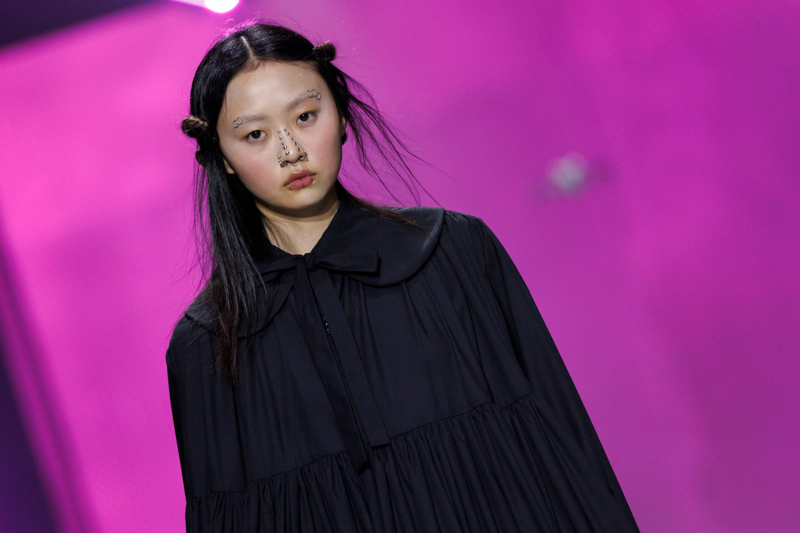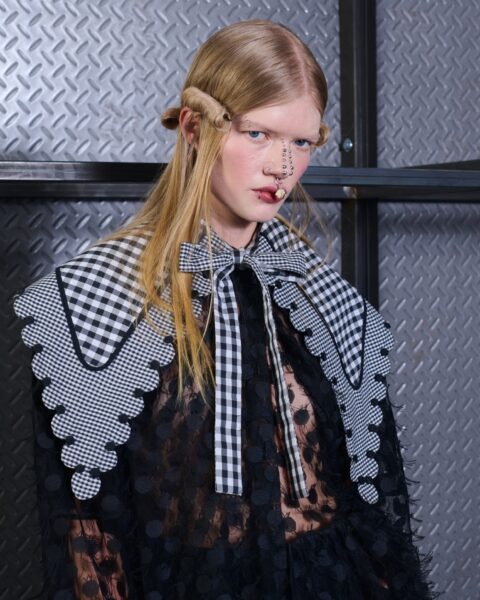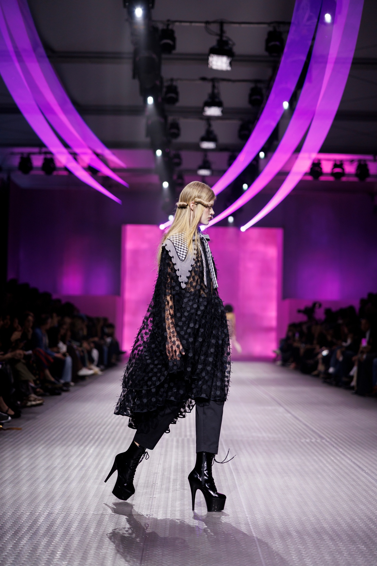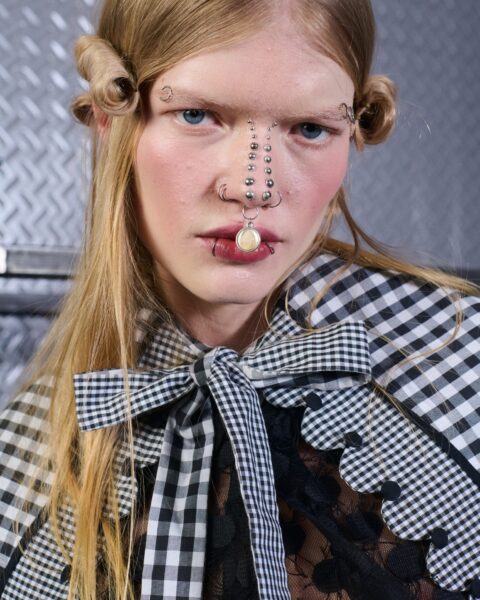 The collection inhabits the romanticism of the 19th century and the refined echoes of haute couture from the 1950s and 1960s. Naïve and kitsch coexist, as well as the melancholic tenderness of the sad clown, theatrical gestures, and historical evocations. Like a curtain slowly rising, cinema and music from all eras appear, alongside the immortal shadow of Anna Maria Mazzini, weaving a universe where dreams and memory walk hand in hand.
