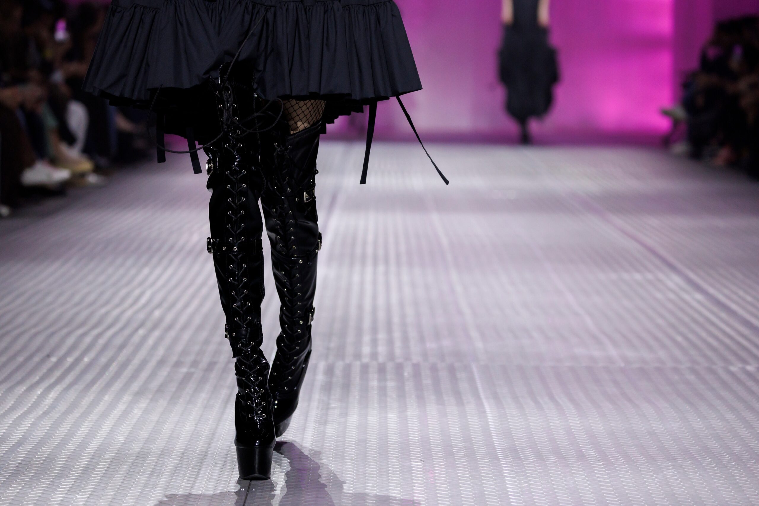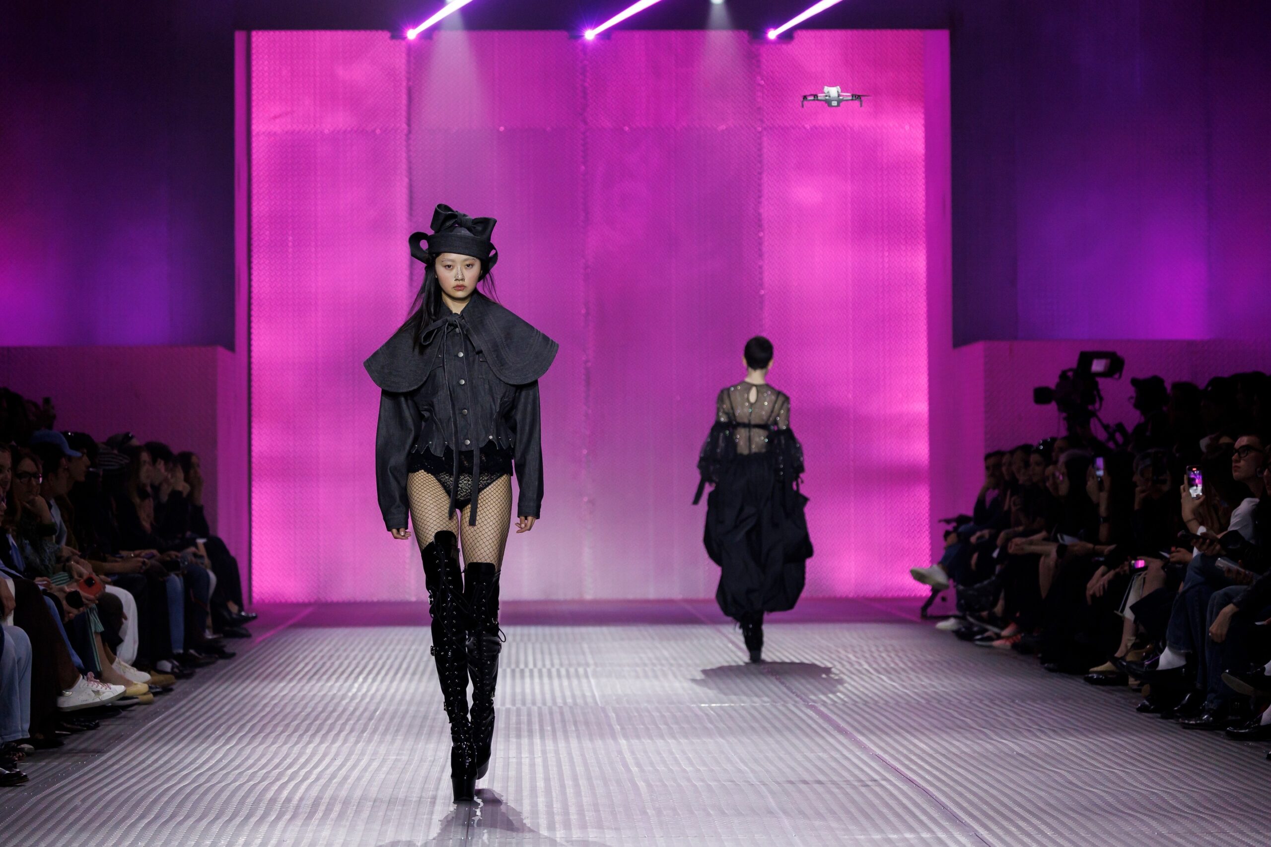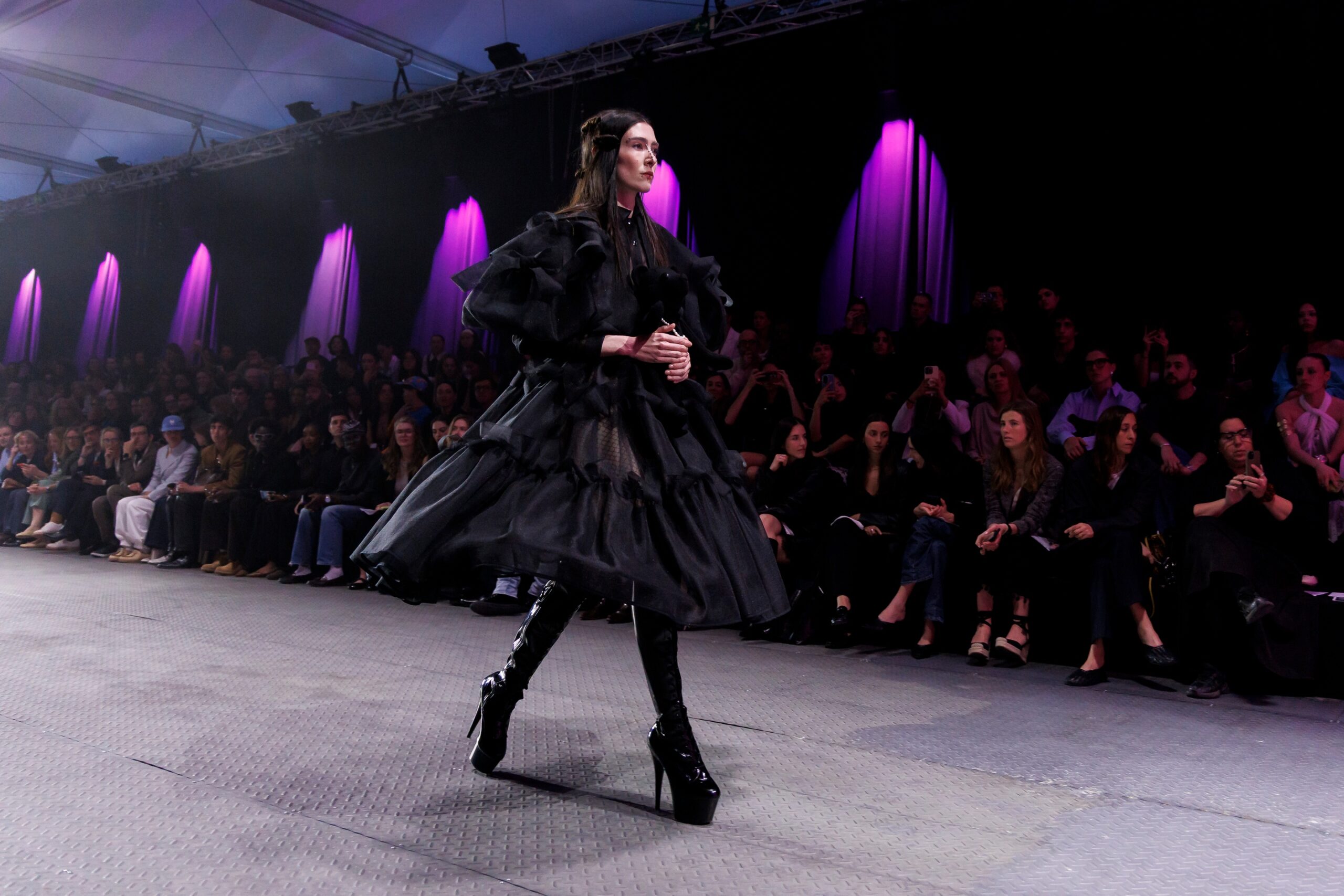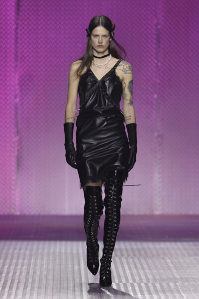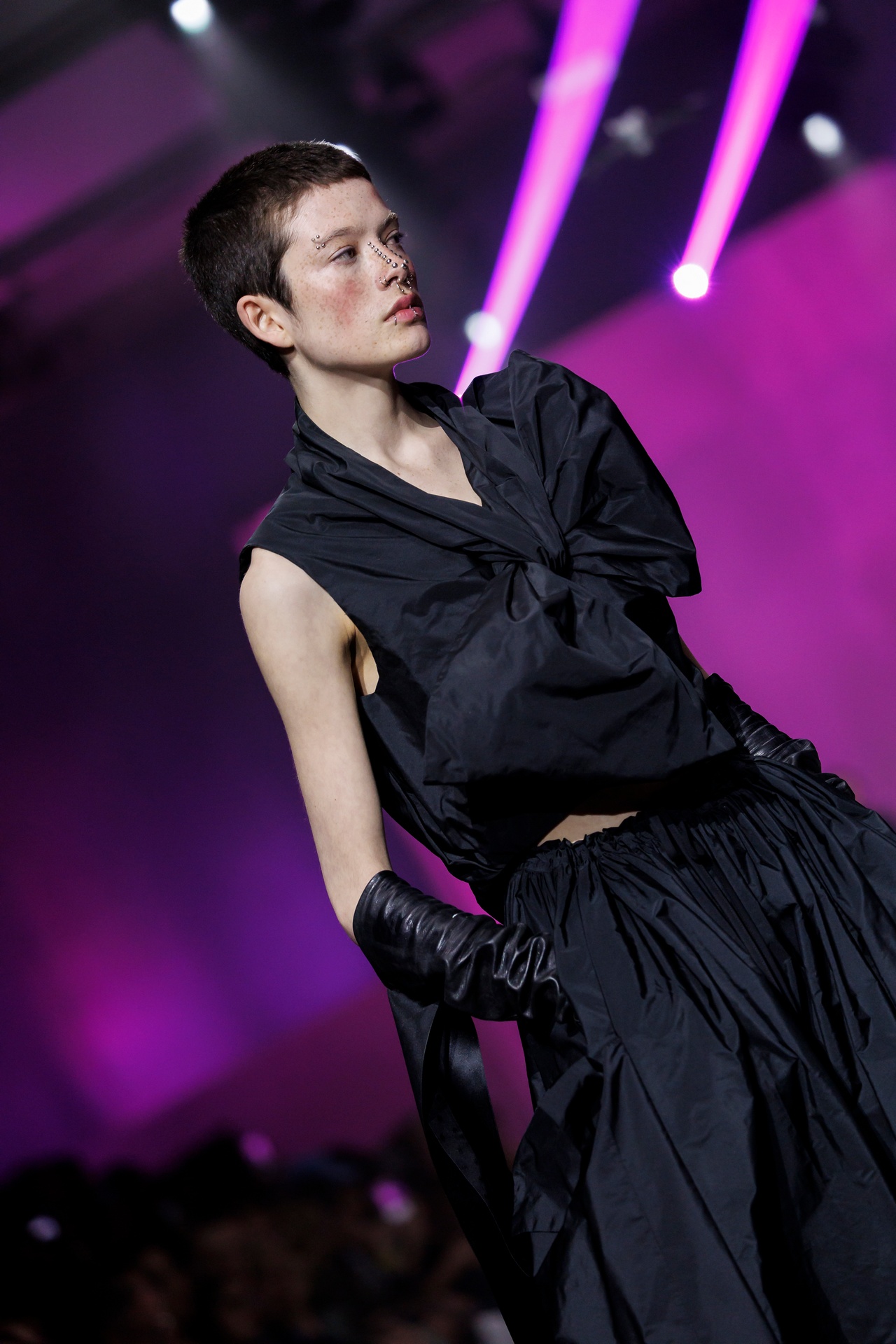 The collection inhabits the romanticism of the 19th century and the refined echoes of haute couture from the 1950s and 1960s. Naïve and kitsch coexist, as well as the melancholic tenderness of the sad clown, theatrical gestures, and historical evocations. Like a curtain slowly rising, cinema and music from all eras appear, alongside the immortal shadow of Anna Maria Mazzini, weaving a universe where dreams and memory walk hand in hand.