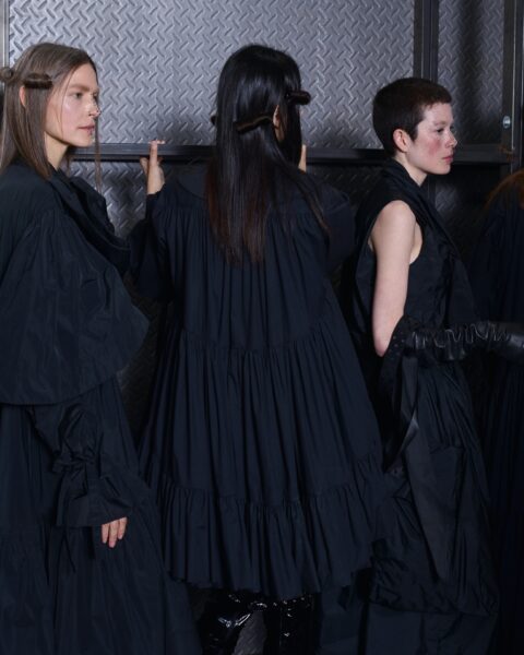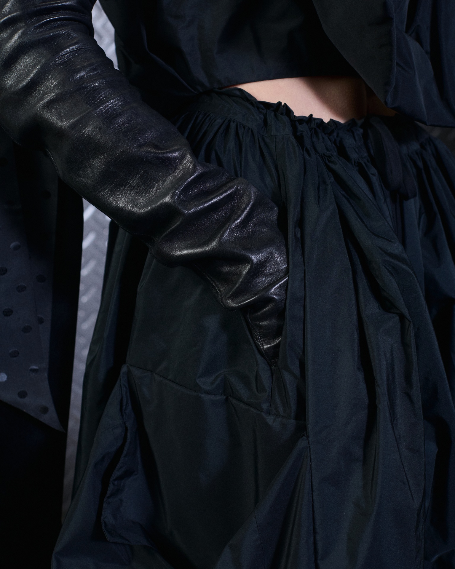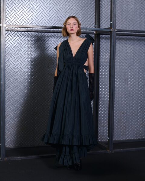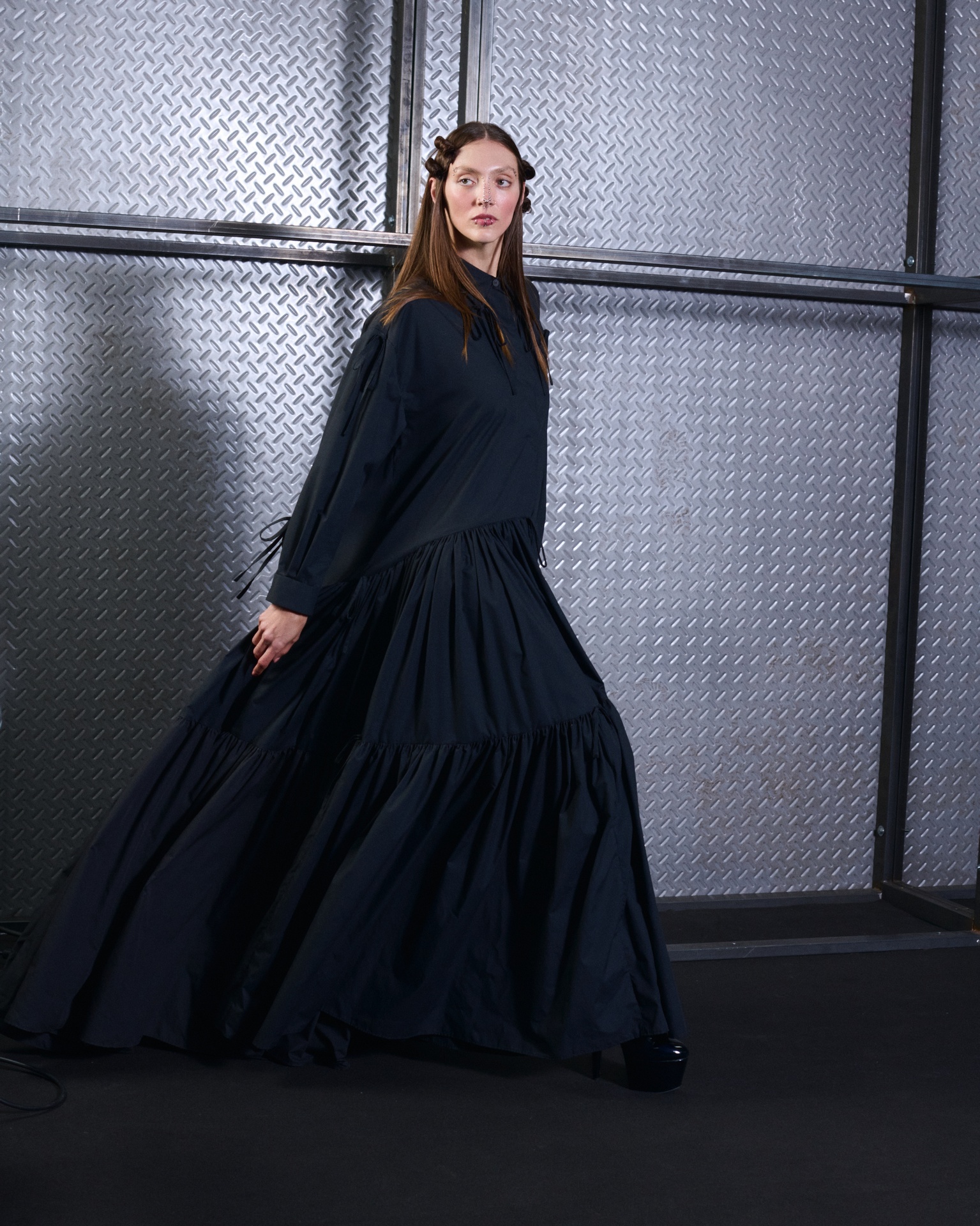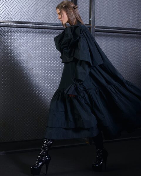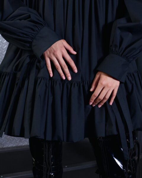 Each garment is born from patient hands, as if sewing were an ancient ritual. Noble fabrics whisper stories, expand into unexpected volumes, and shape a contemporary silhouette that, without abandoning the present, preserves the mark of the past. They carry an almost pastoral delicacy, a beauty that seems gathered at dawn, among soft mists and slanted light.