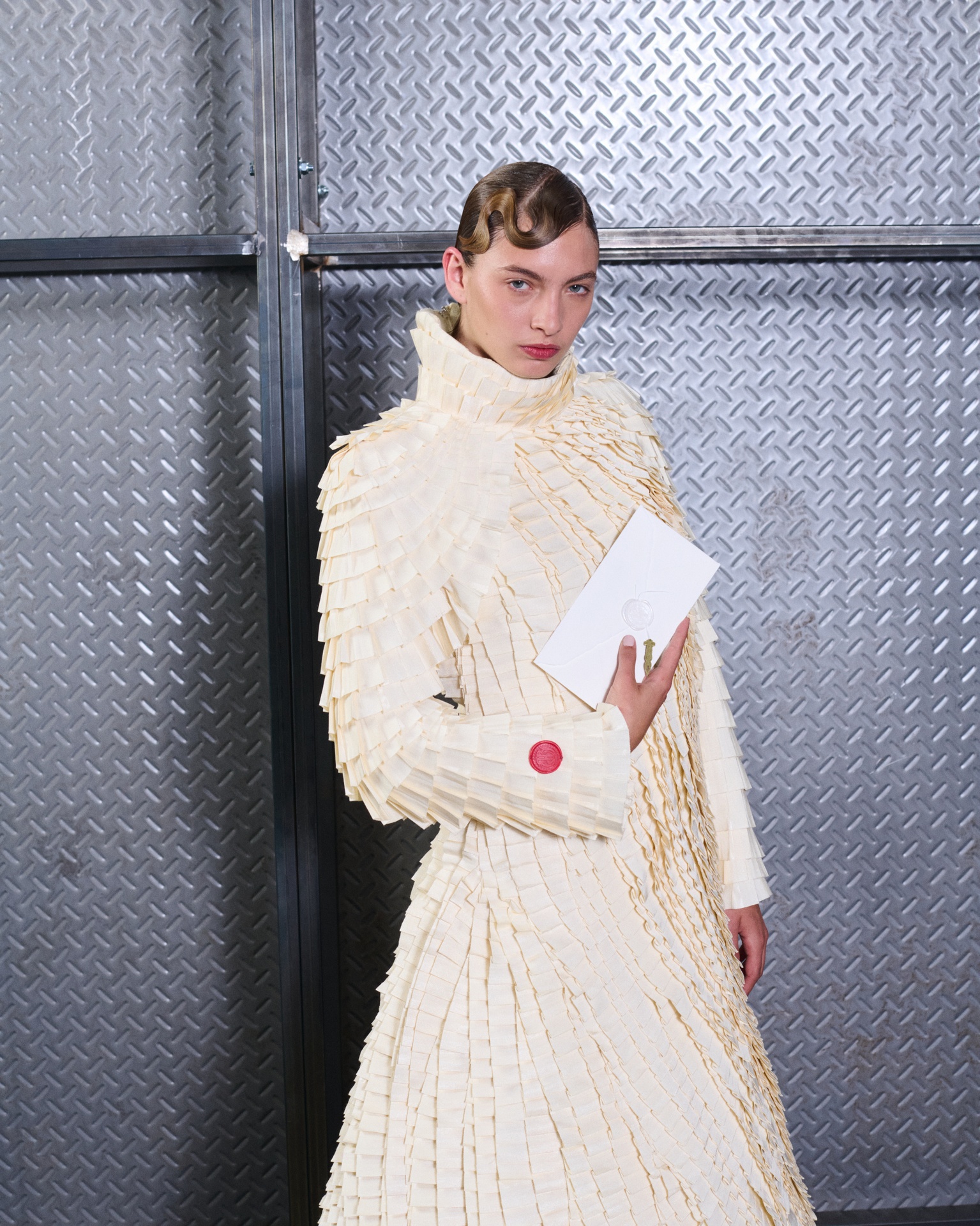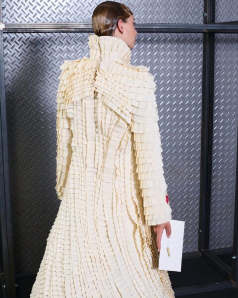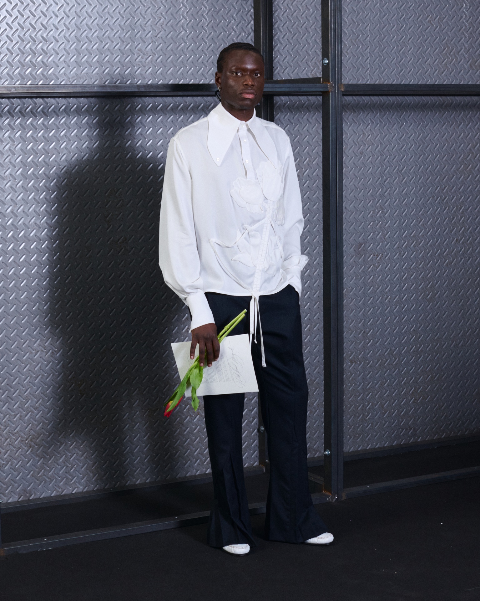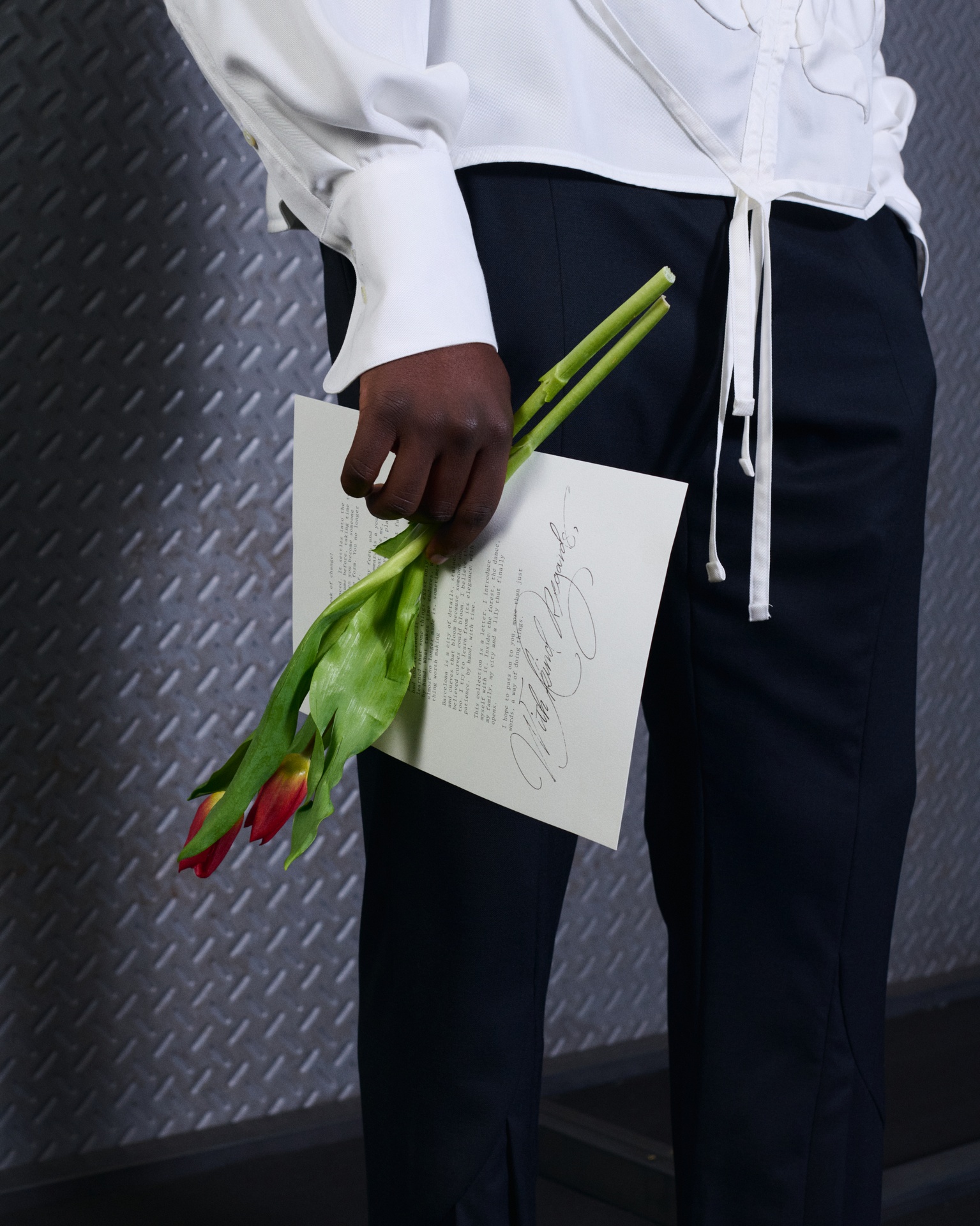 With Kind Regards is the first runway proposal presented by Ugo Boulard. Conceived as a letter of introduction in three chapters, the collection is structured around the epistolary universe: writing, paper, calligraphy, wax seals, and the letter understood as an intimate object, a symbol of memory and timelessness.