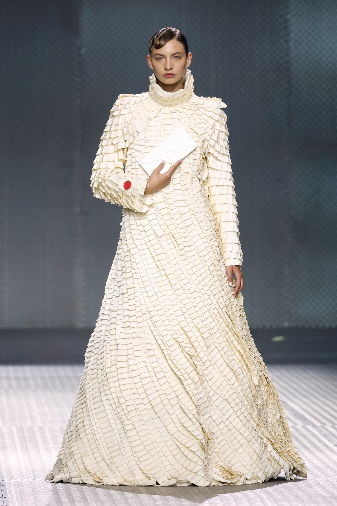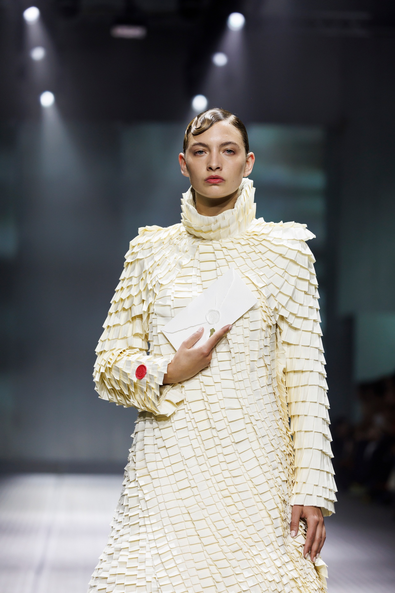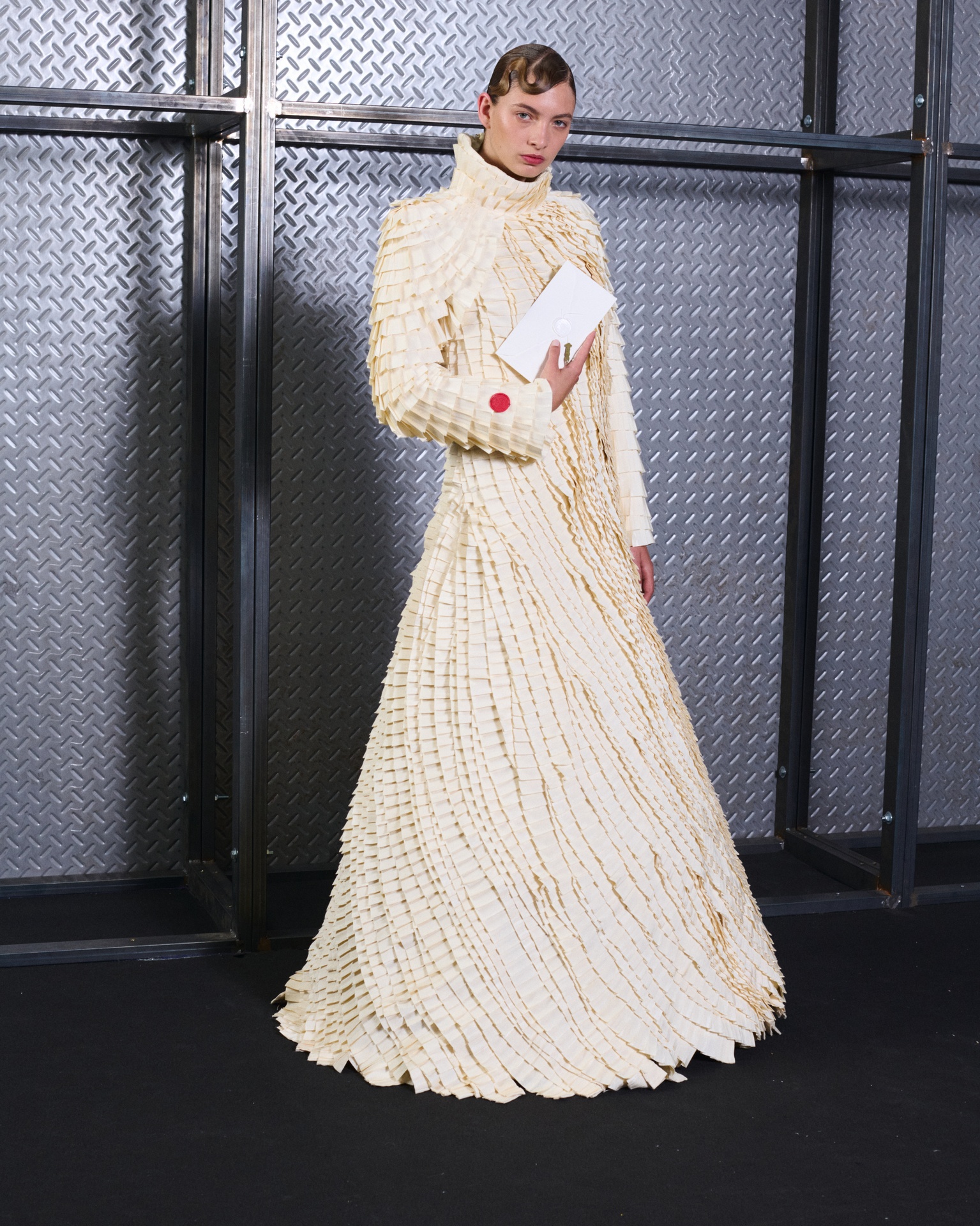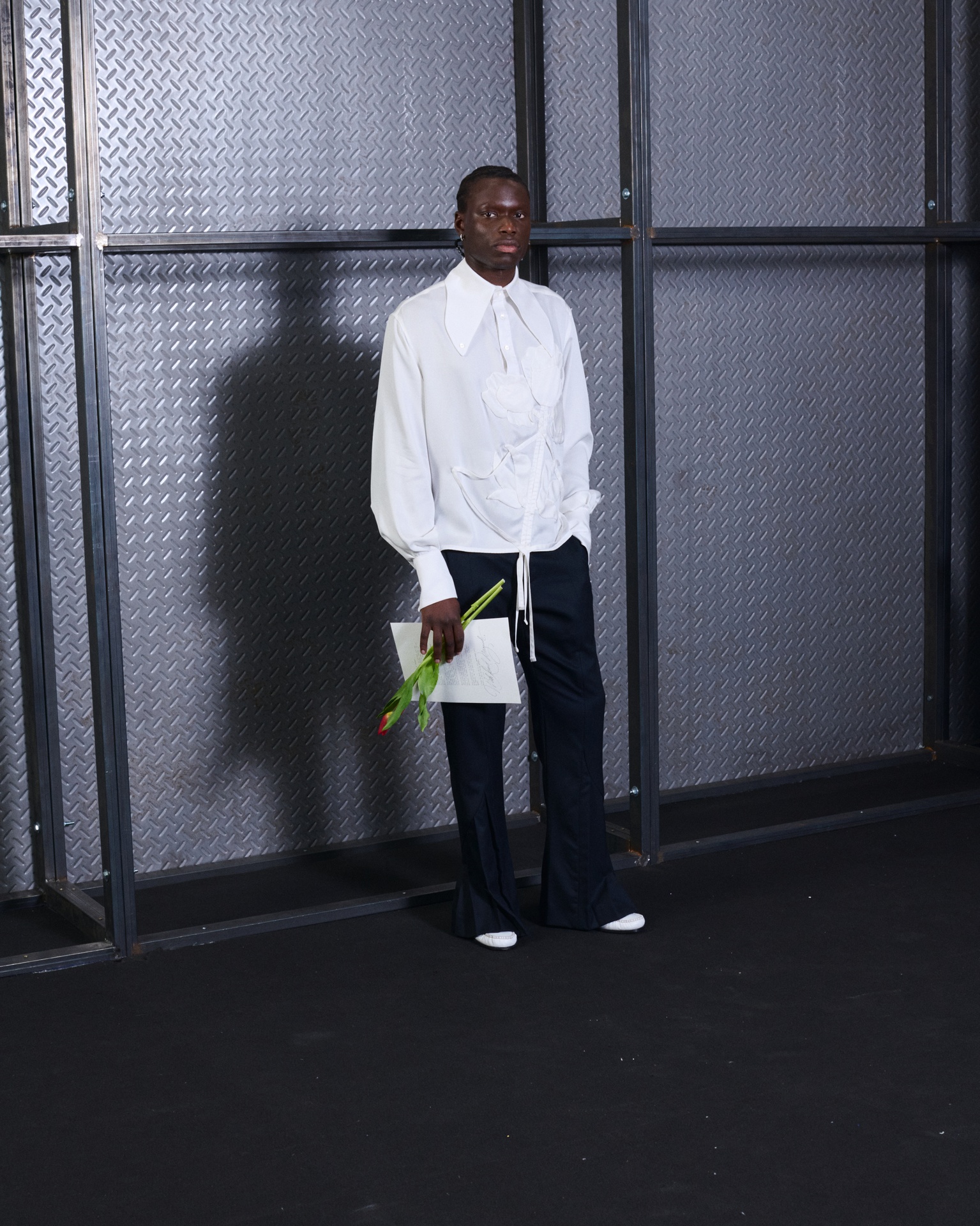 With Kind Regards is the first runway proposal presented by Ugo Boulard. Conceived as a letter of introduction in three chapters, the collection is structured around the epistolary universe: writing, paper, calligraphy, wax seals, and the letter understood as an intimate object, a symbol of memory and timelessness.