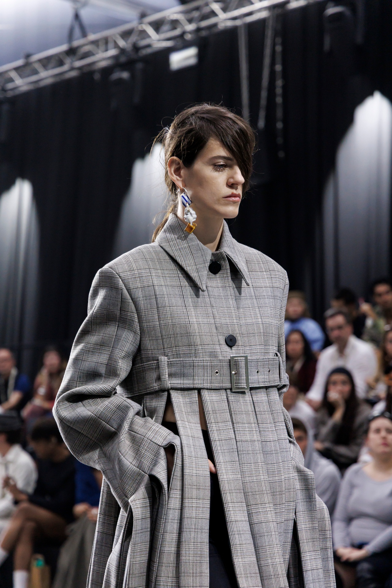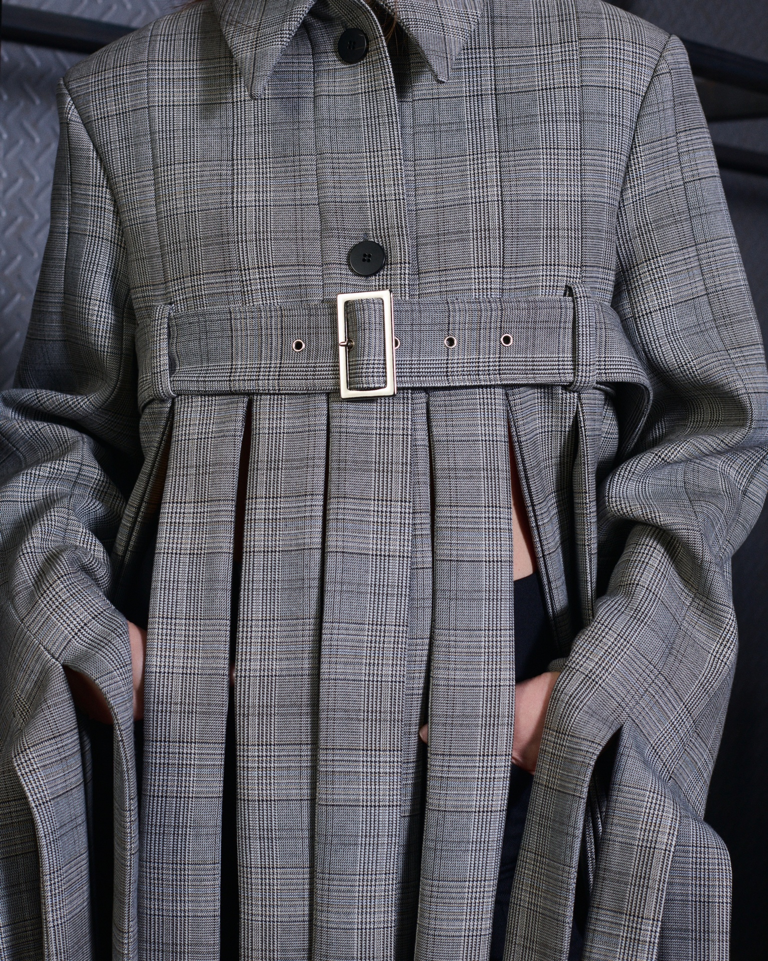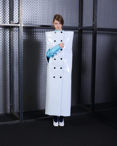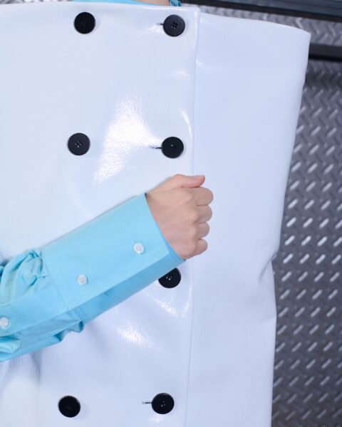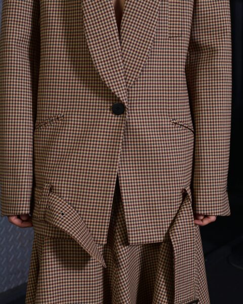 Collapse emerges from the meeting point of opposing forces: what is finished and what seems to be unraveling, order and fragmentation. The collection explores contradiction as a creative territory, where every formal decision responds to a precise intention. The garments feature marked asymmetries —shortened fronts, elongated backs, and unexpected proportions— generating movement and visual tension. Nothing is arbitrary; each imbalance operates as a conscious, almost architectural gesture. Classic tailoring, rigorous and structured, enters into dialogue with pieces built through recomposition. Fabrics assembled from remnants and patchworks evoke garments in progress, as if the material were still defining its final form.