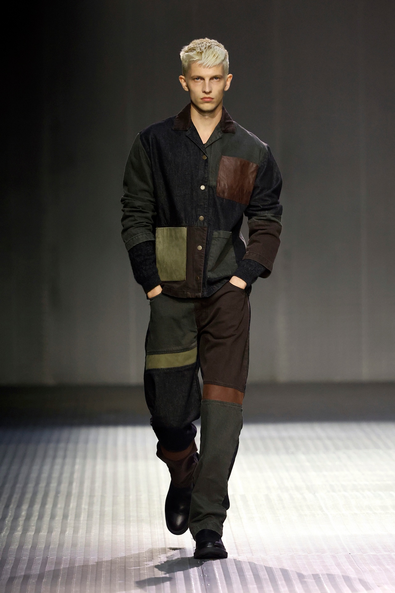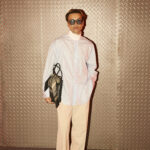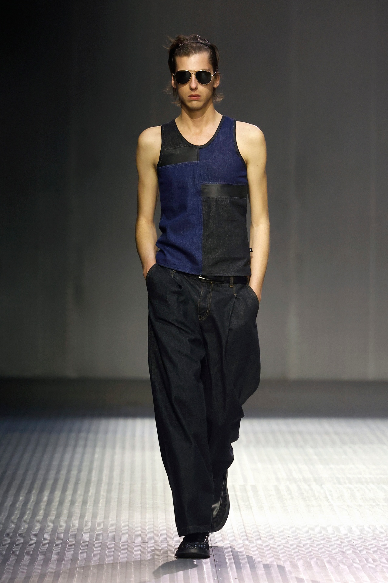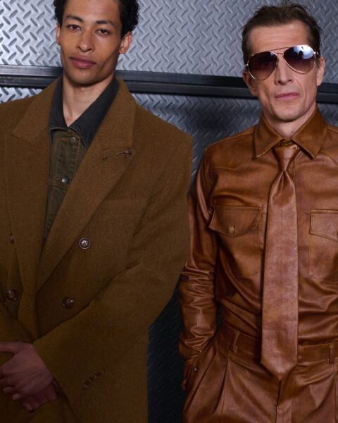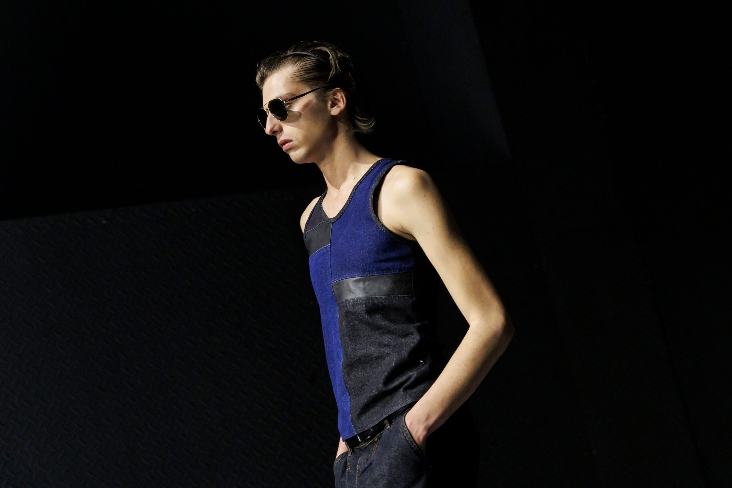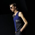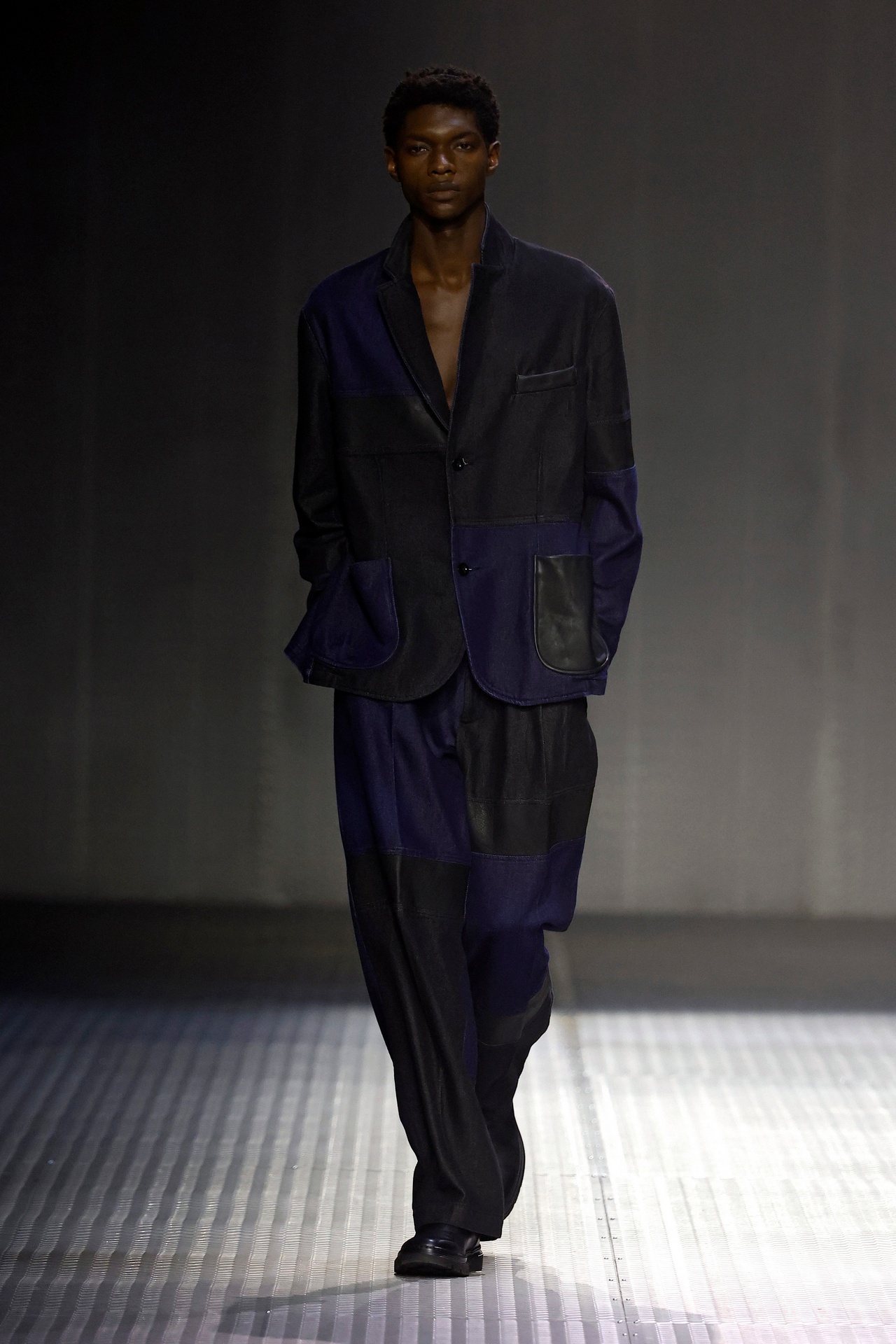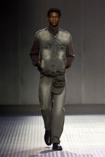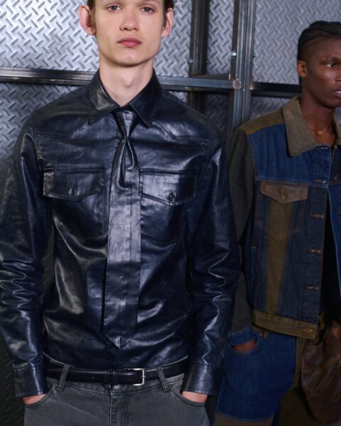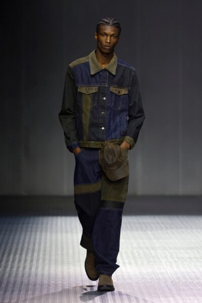 Las prendas se construyen a través de la composición. Los paneles se cruzan entre la sastrería y el denim, el cuero se encuentra con la lana y las superficies se organizan con precisión gráfica. Las costuras trazan líneas deliberadas sobre el cuerpo, convirtiendo el ensamblaje en lenguaje visual. El resultado no es nostálgico ni ornamental, sino controlado y arquitectónico.