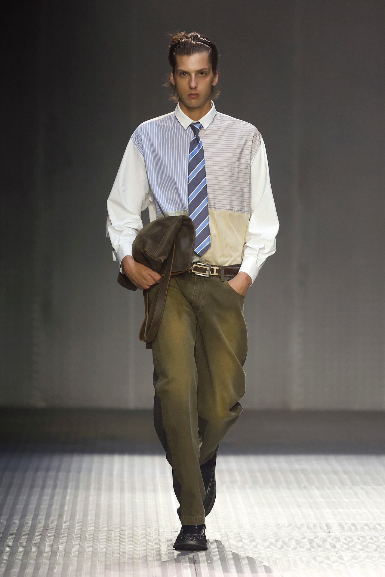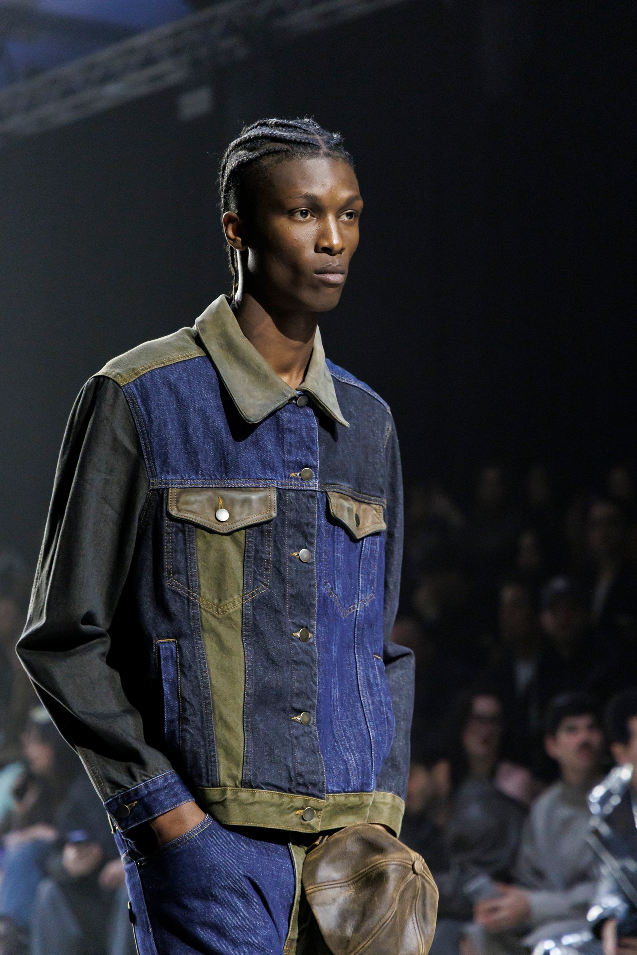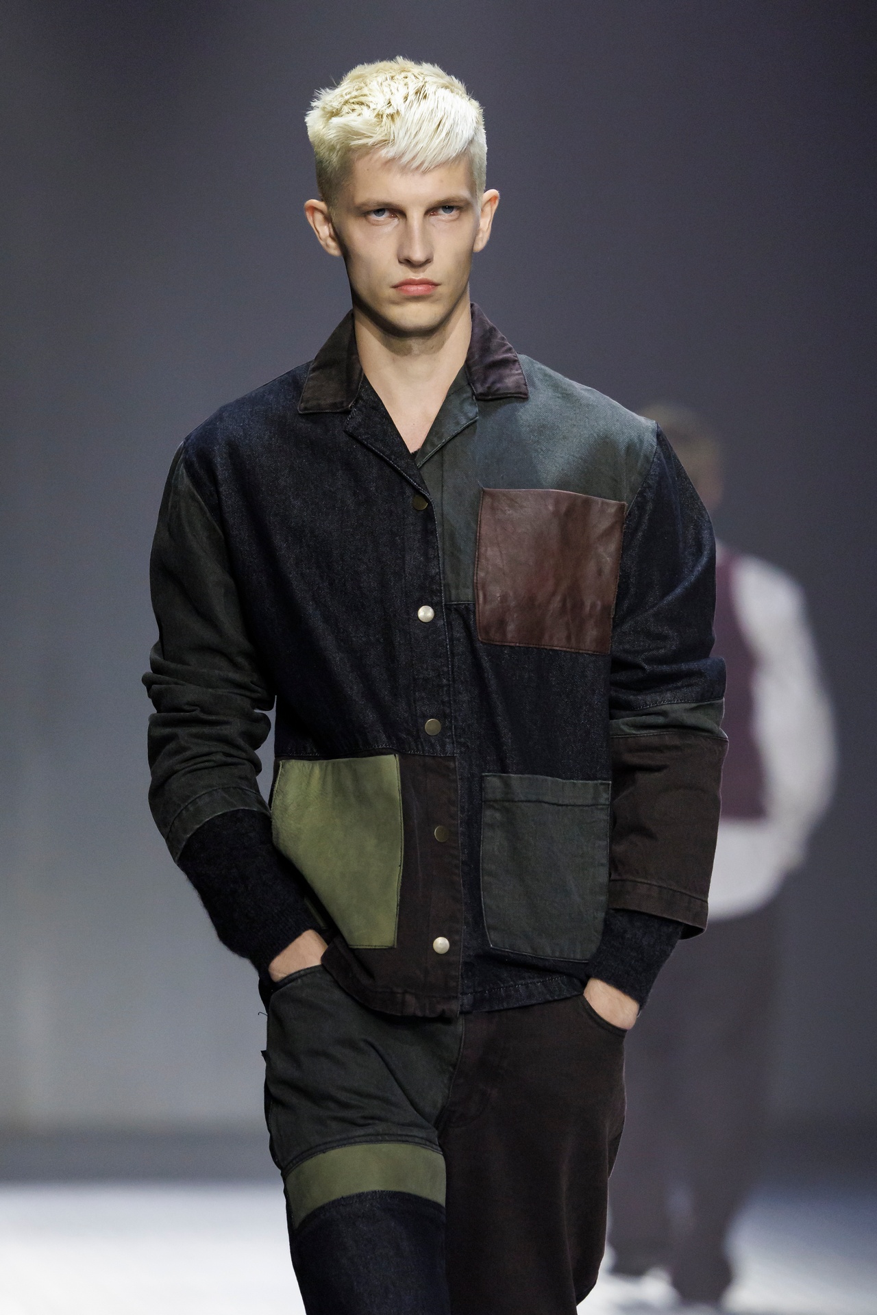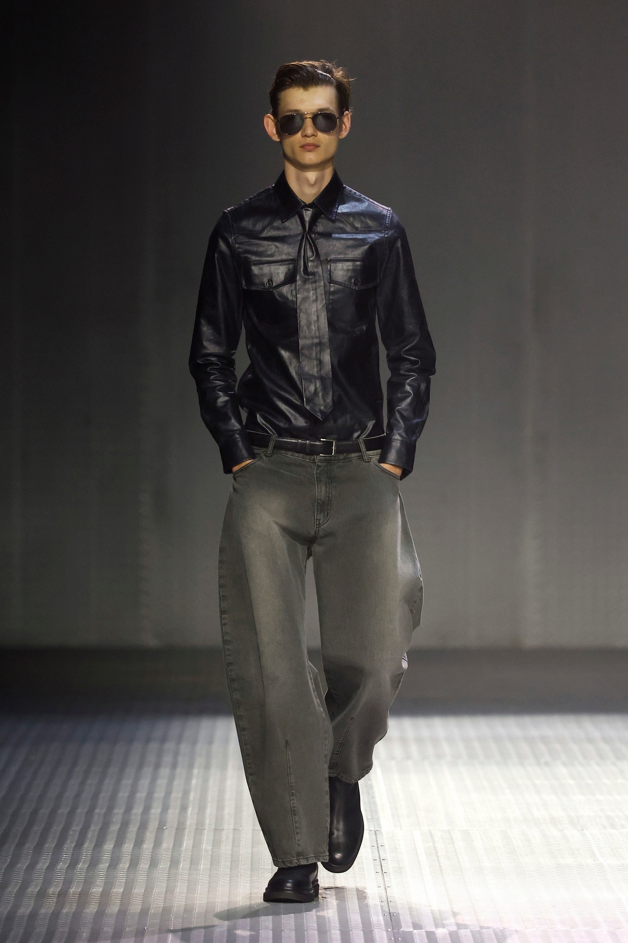 Las prendas se construyen a través de la composición. Los paneles se cruzan entre la sastrería y el denim, el cuero se encuentra con la lana y las superficies se organizan con precisión gráfica. Las costuras trazan líneas deliberadas sobre el cuerpo, convirtiendo el ensamblaje en lenguaje visual. El resultado no es nostálgico ni ornamental, sino controlado y arquitectónico.