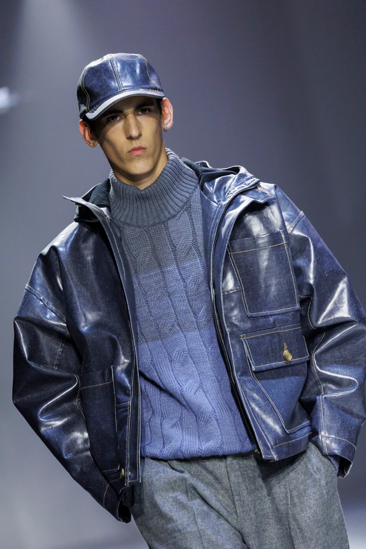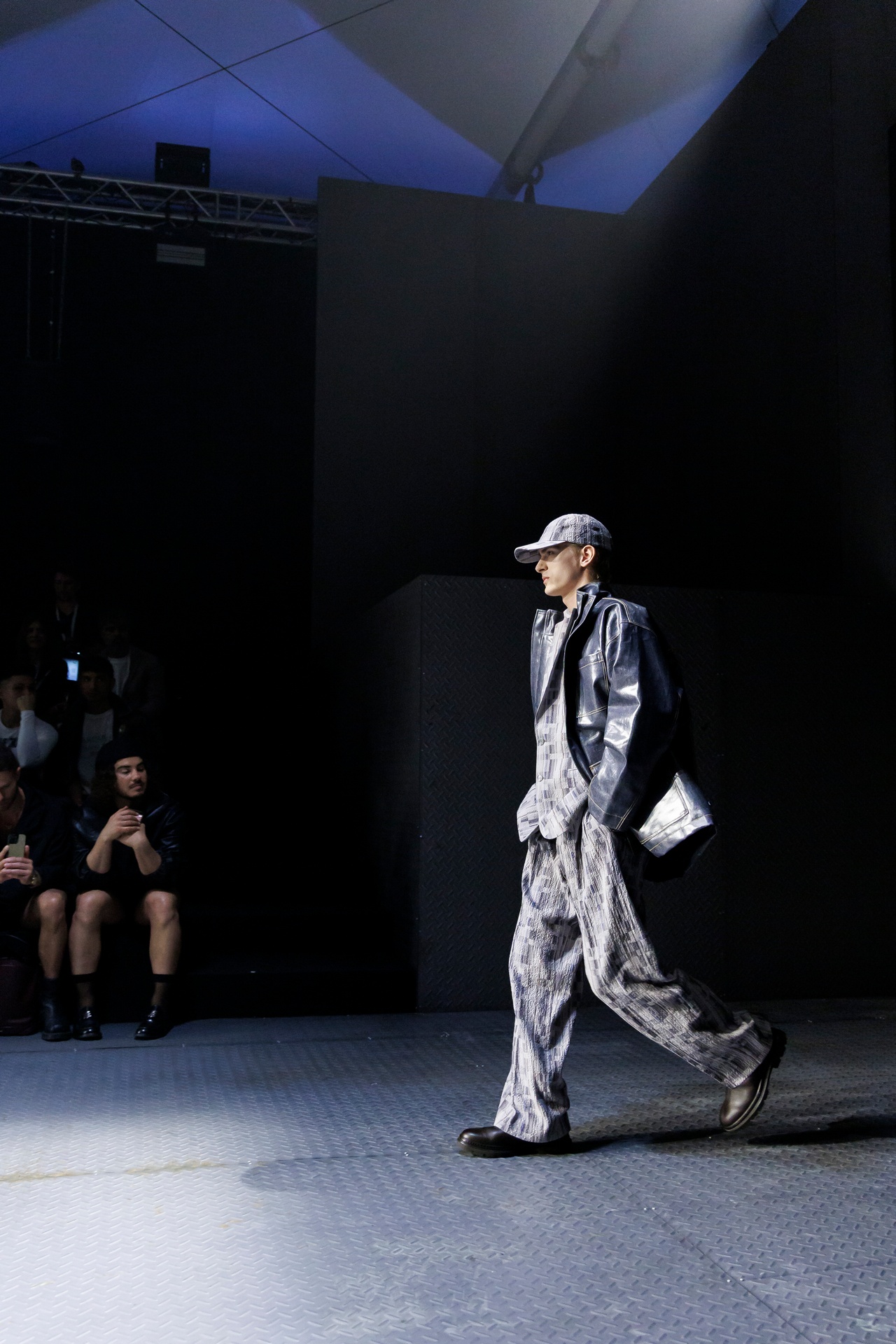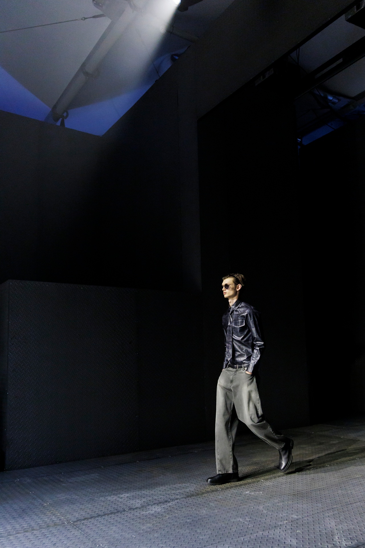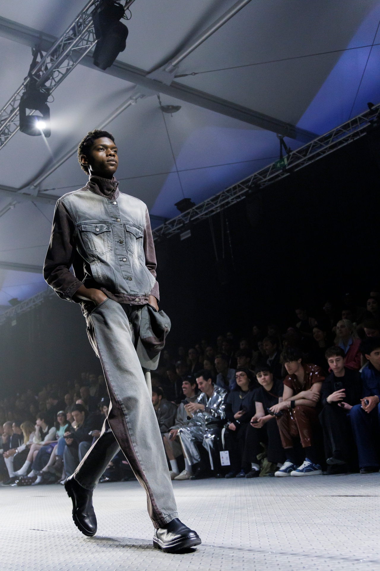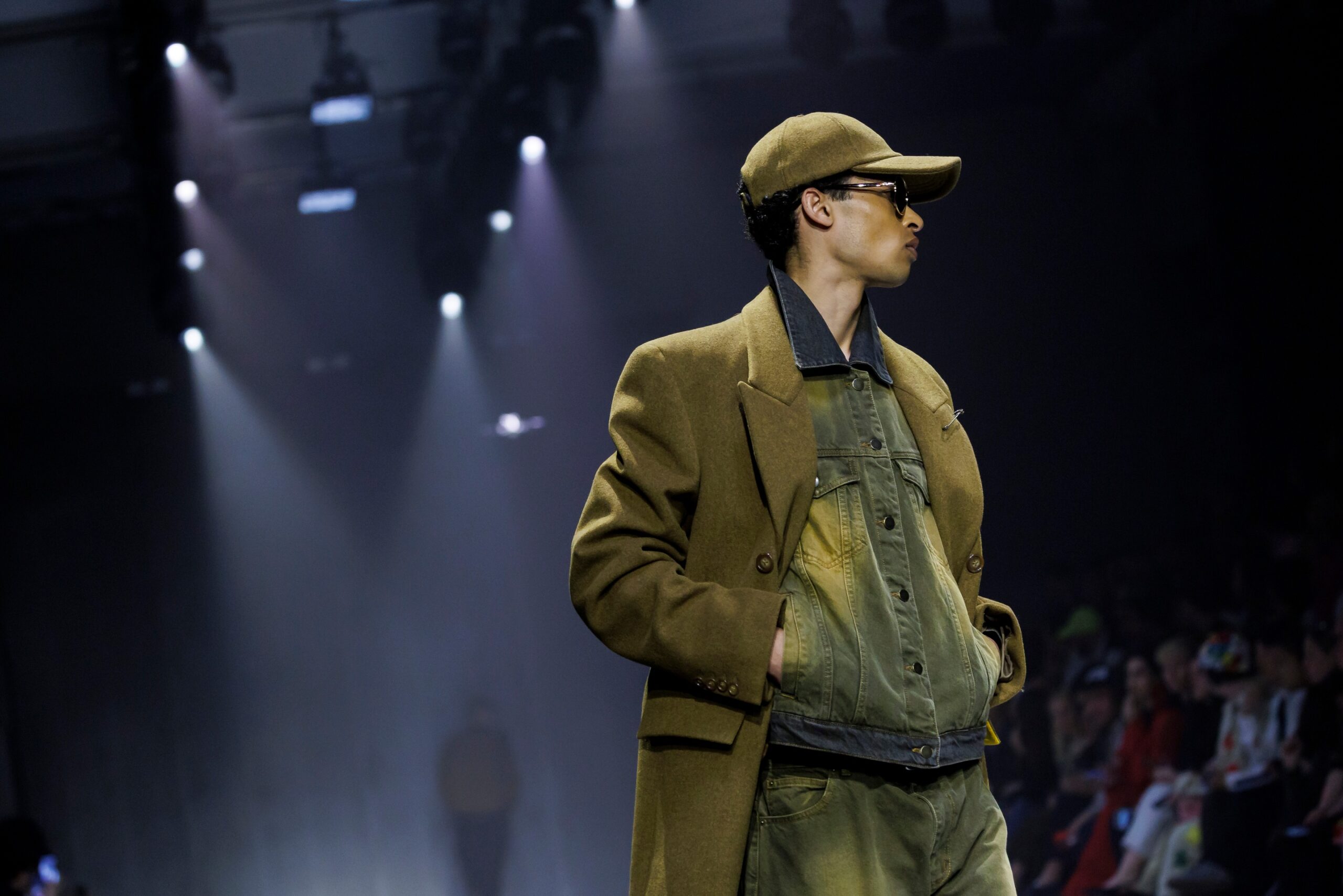 Las prendas se construyen a través de la composición. Los paneles se cruzan entre la sastrería y el denim, el cuero se encuentra con la lana y las superficies se organizan con precisión gráfica. Las costuras trazan líneas deliberadas sobre el cuerpo, convirtiendo el ensamblaje en lenguaje visual. El resultado no es nostálgico ni ornamental, sino controlado y arquitectónico.