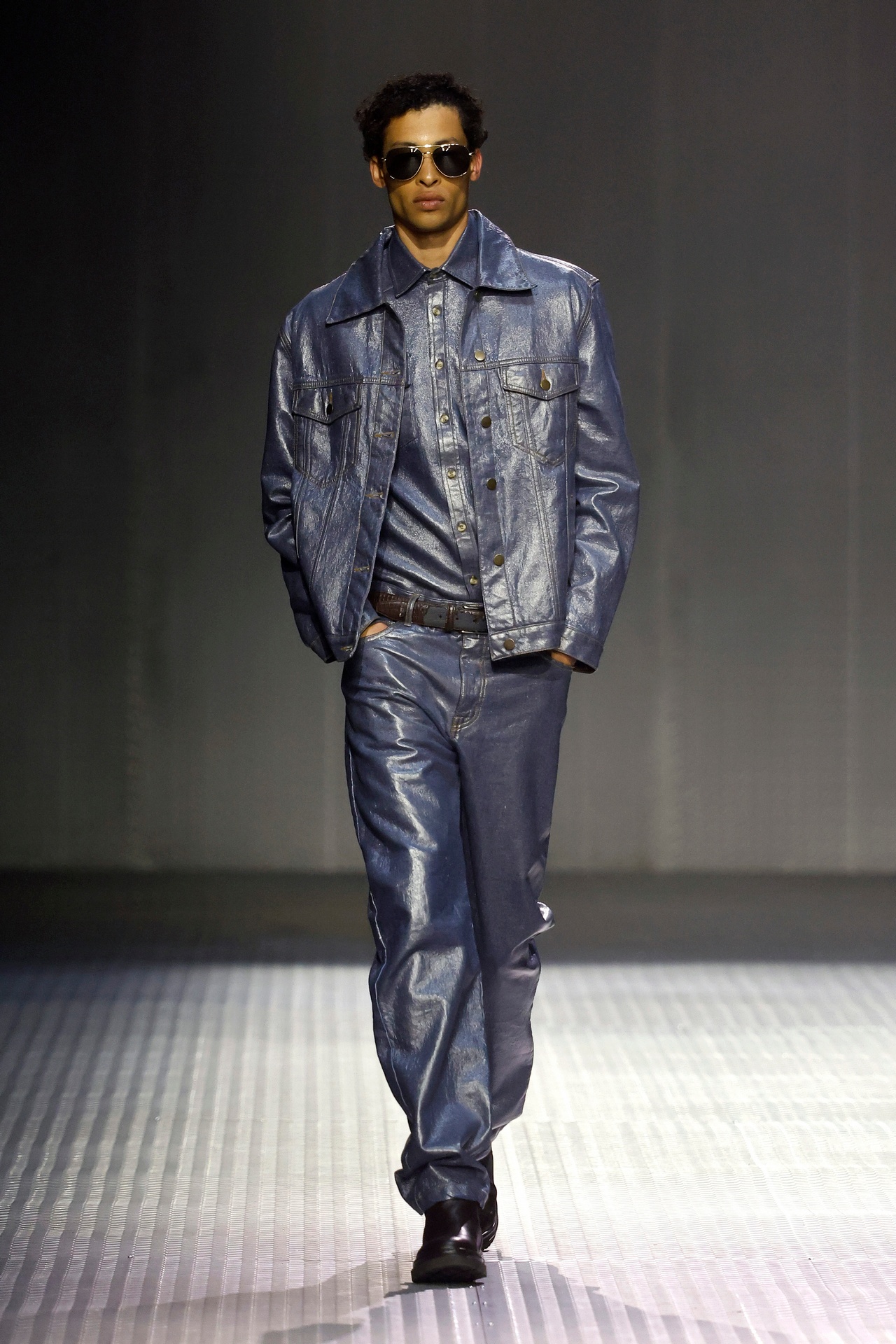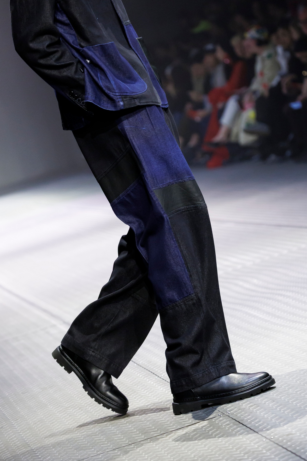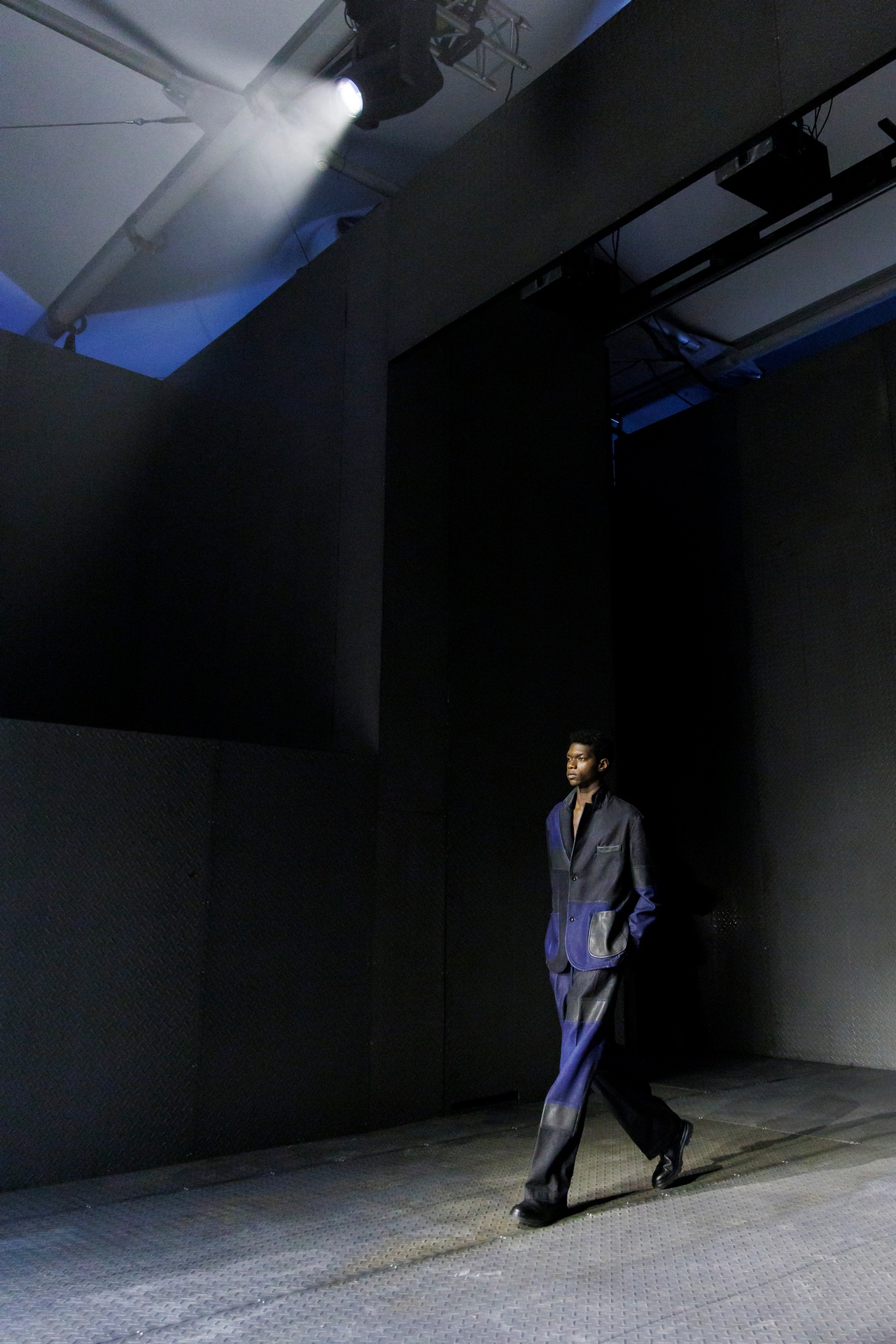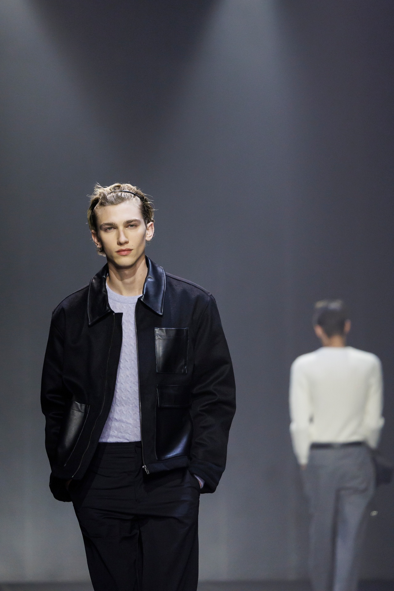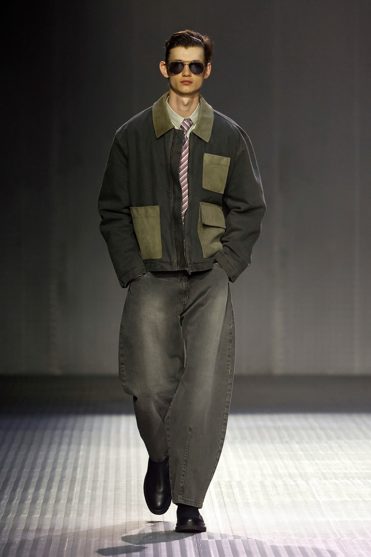 Las prendas se construyen a través de la composición. Los paneles se cruzan entre la sastrería y el denim, el cuero se encuentra con la lana y las superficies se organizan con precisión gráfica. Las costuras trazan líneas deliberadas sobre el cuerpo, convirtiendo el ensamblaje en lenguaje visual. El resultado no es nostálgico ni ornamental, sino controlado y arquitectónico.