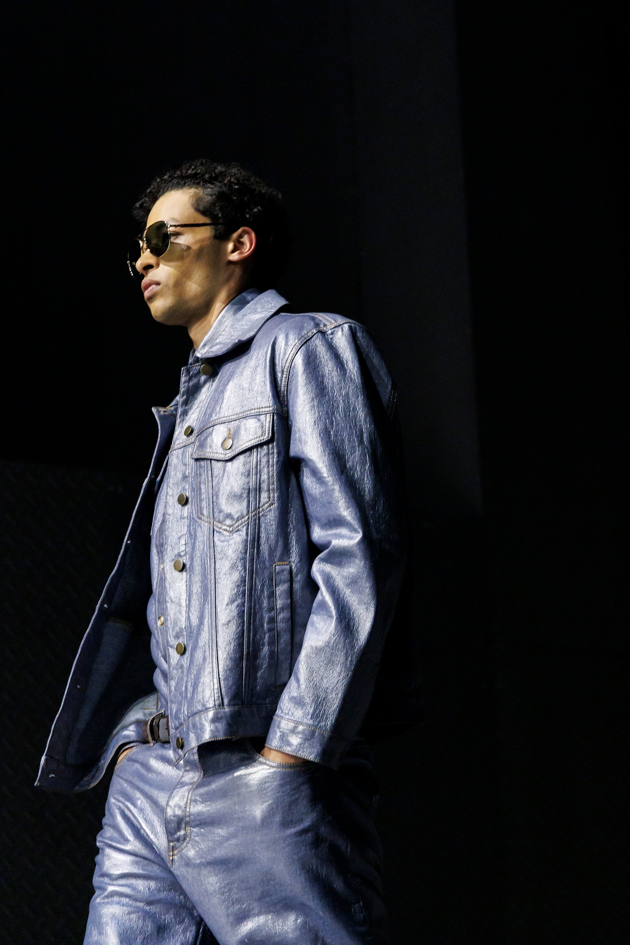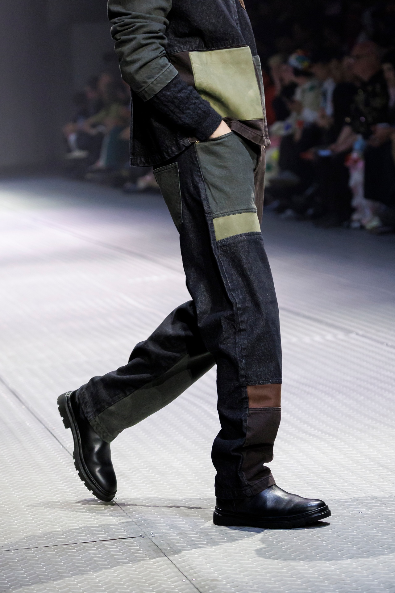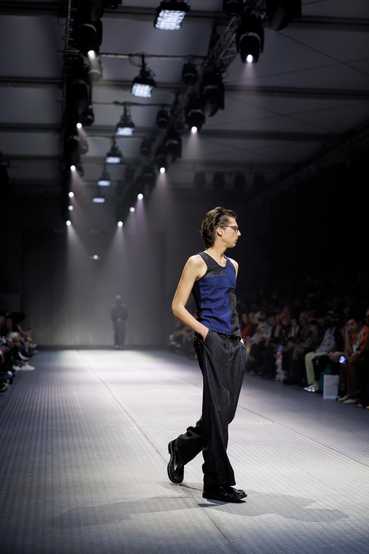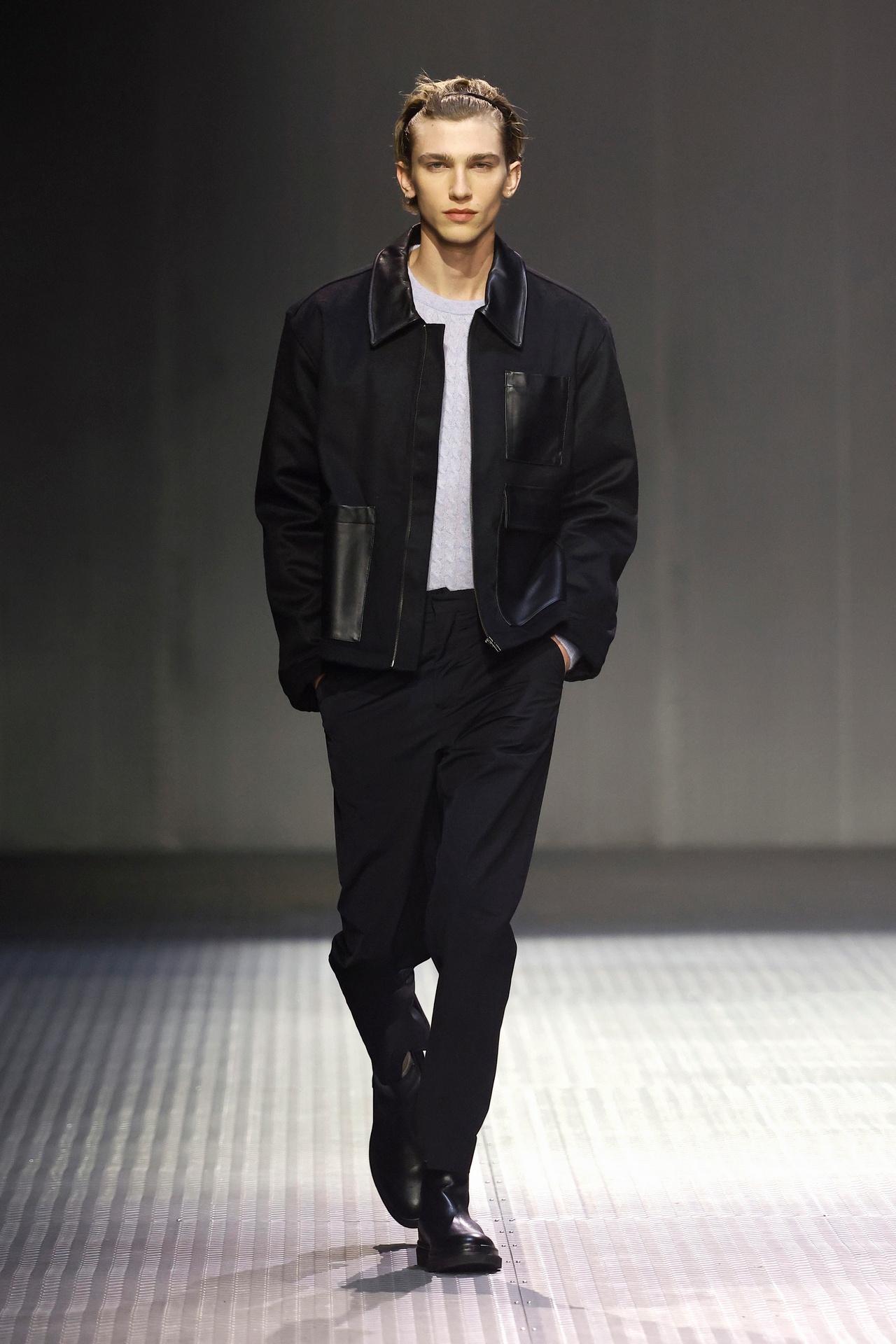 Las prendas se construyen a través de la composición. Los paneles se cruzan entre la sastrería y el denim, el cuero se encuentra con la lana y las superficies se organizan con precisión gráfica. Las costuras trazan líneas deliberadas sobre el cuerpo, convirtiendo el ensamblaje en lenguaje visual. El resultado no es nostálgico ni ornamental, sino controlado y arquitectónico.