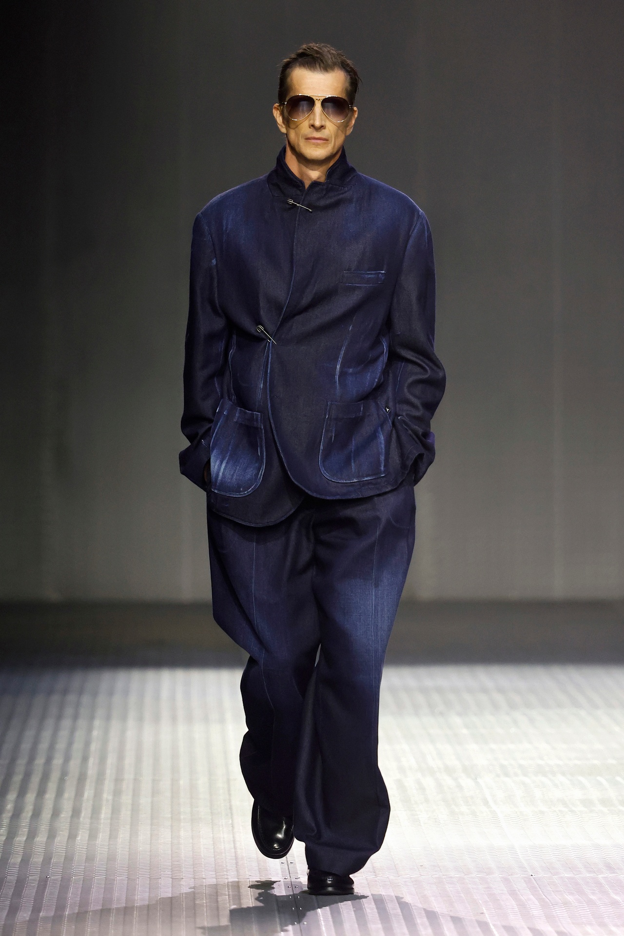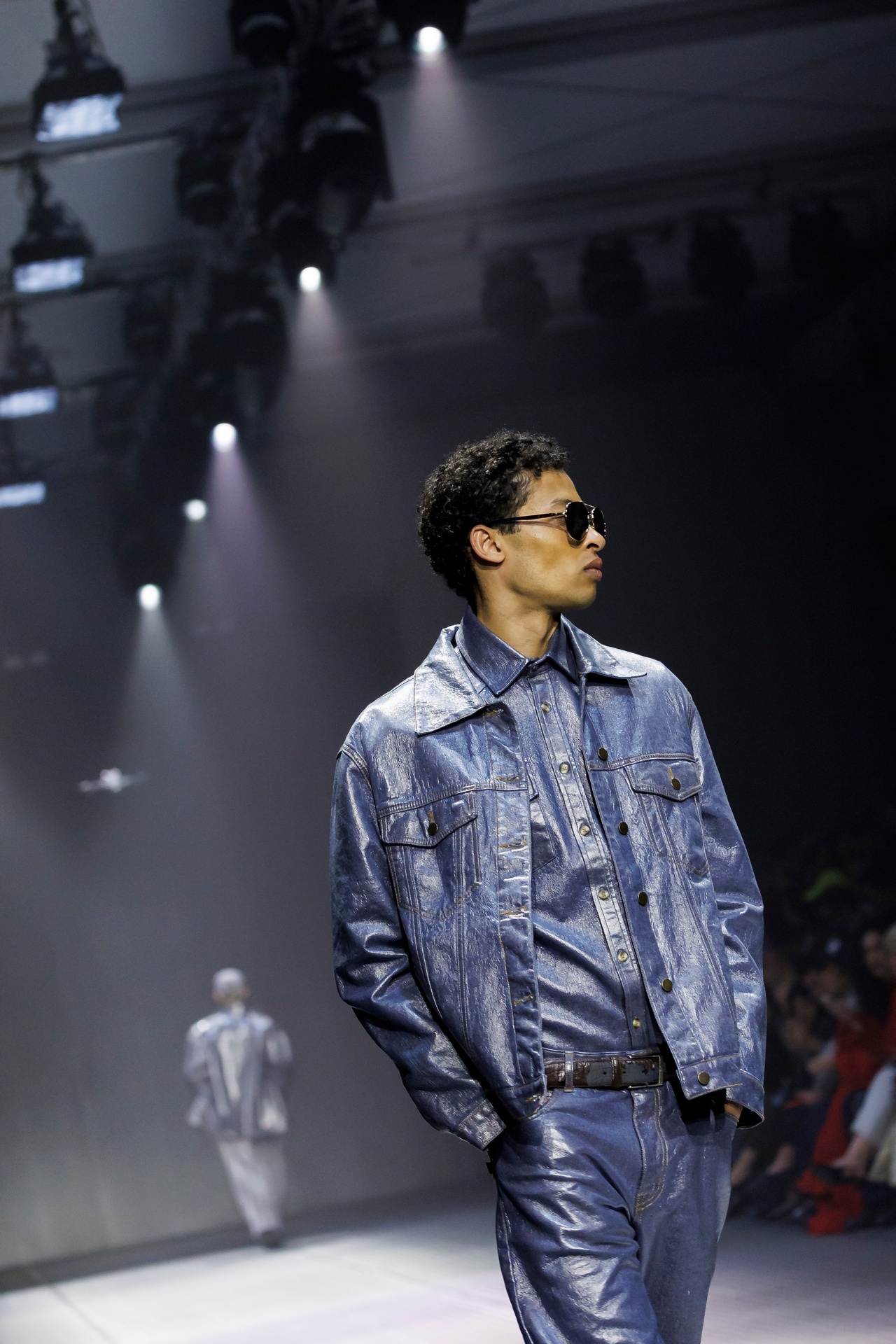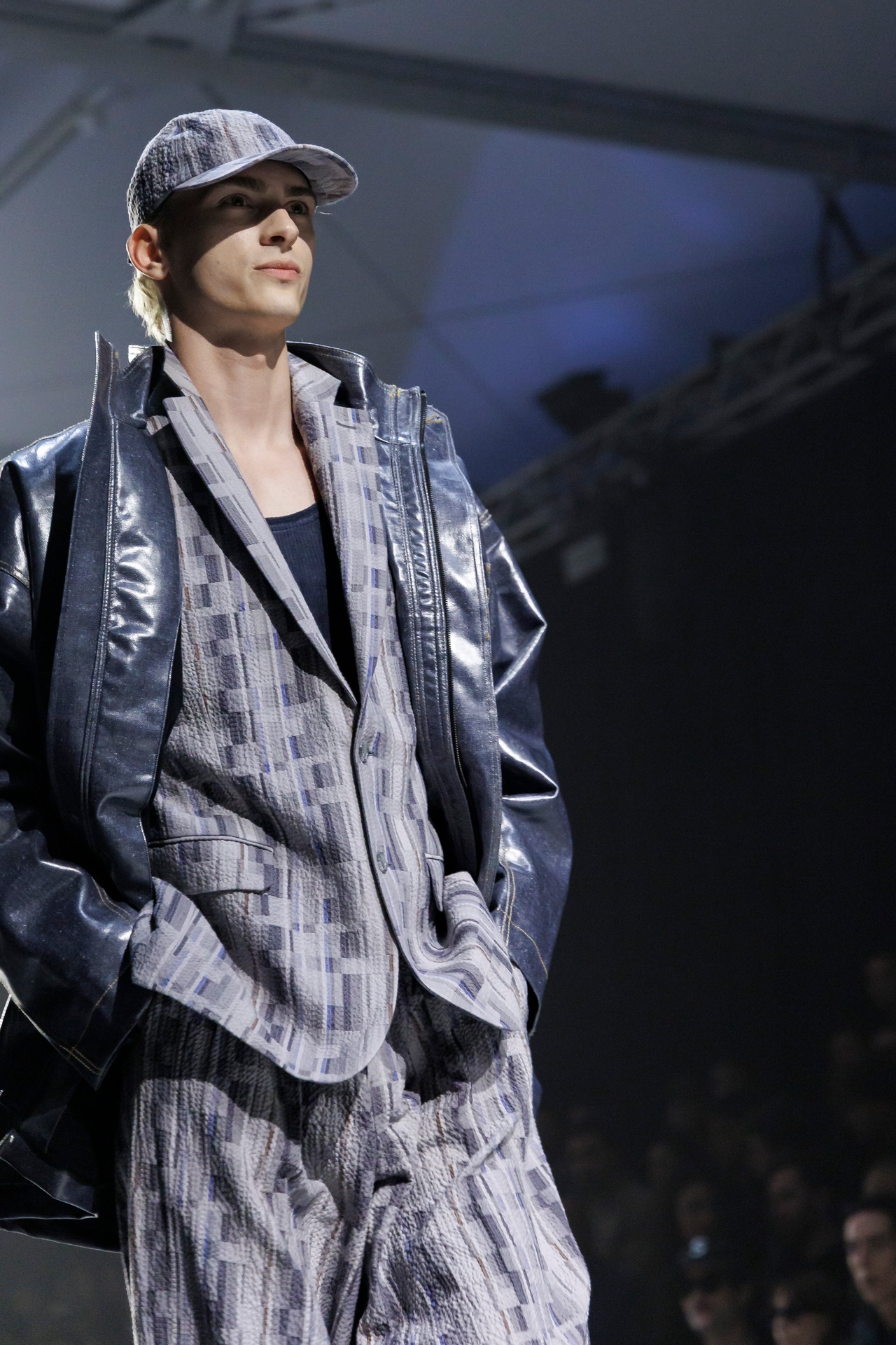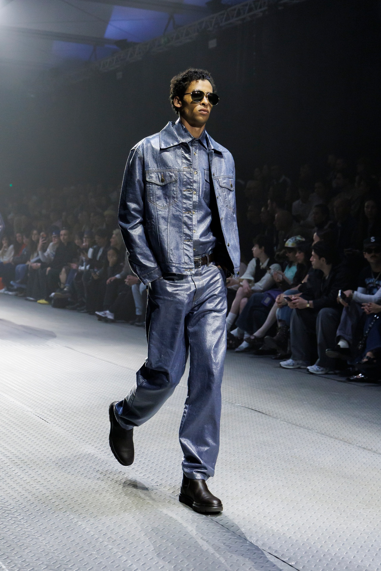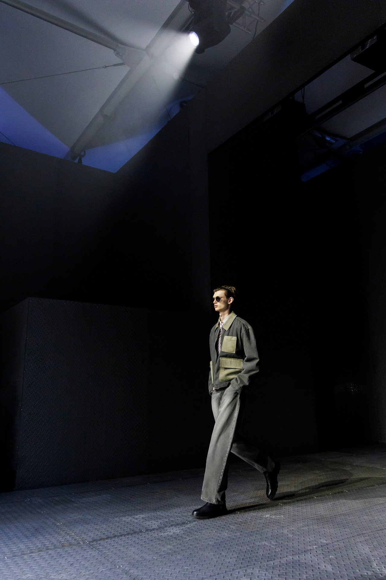 Las prendas se construyen a través de la composición. Los paneles se cruzan entre la sastrería y el denim, el cuero se encuentra con la lana y las superficies se organizan con precisión gráfica. Las costuras trazan líneas deliberadas sobre el cuerpo, convirtiendo el ensamblaje en lenguaje visual. El resultado no es nostálgico ni ornamental, sino controlado y arquitectónico.