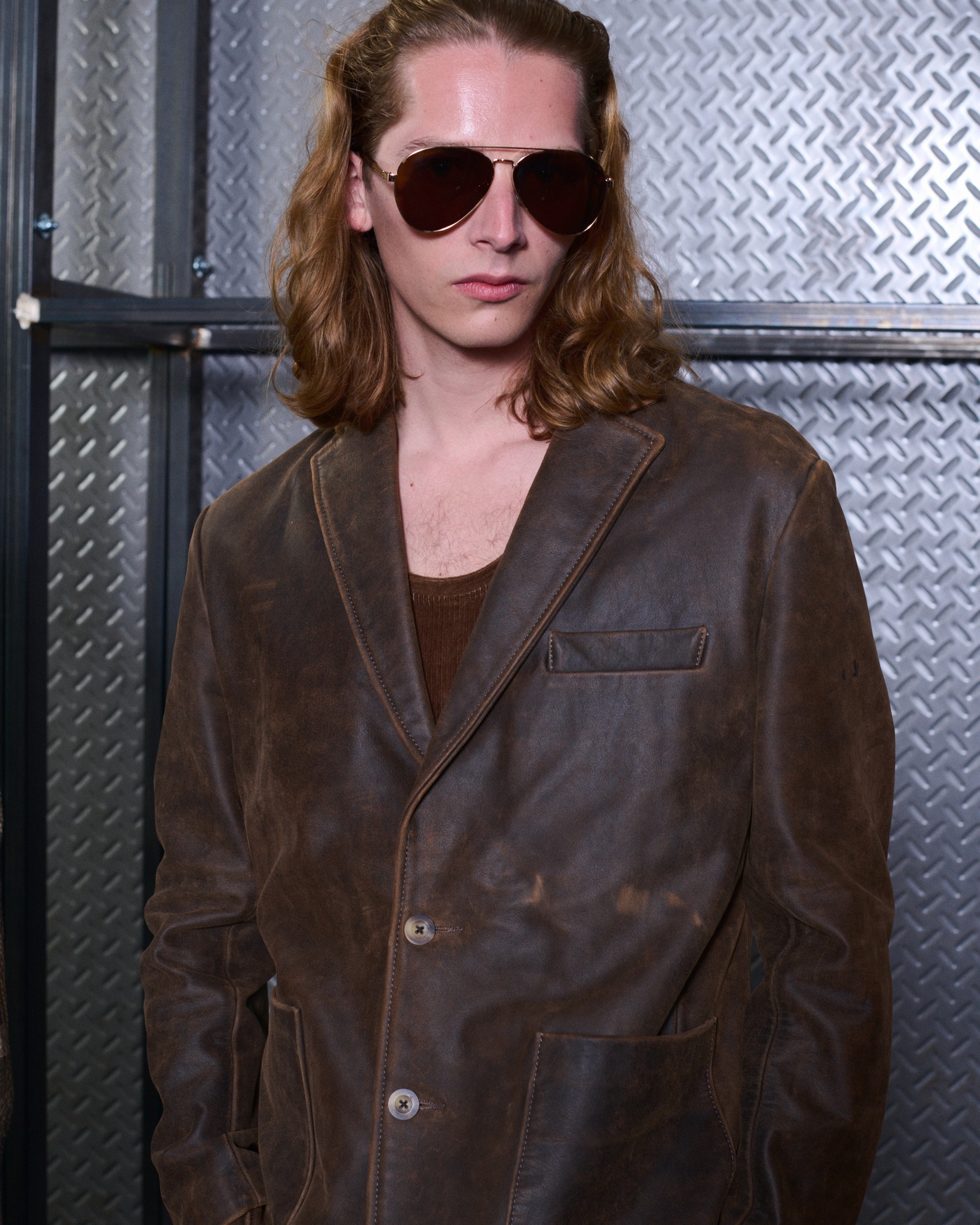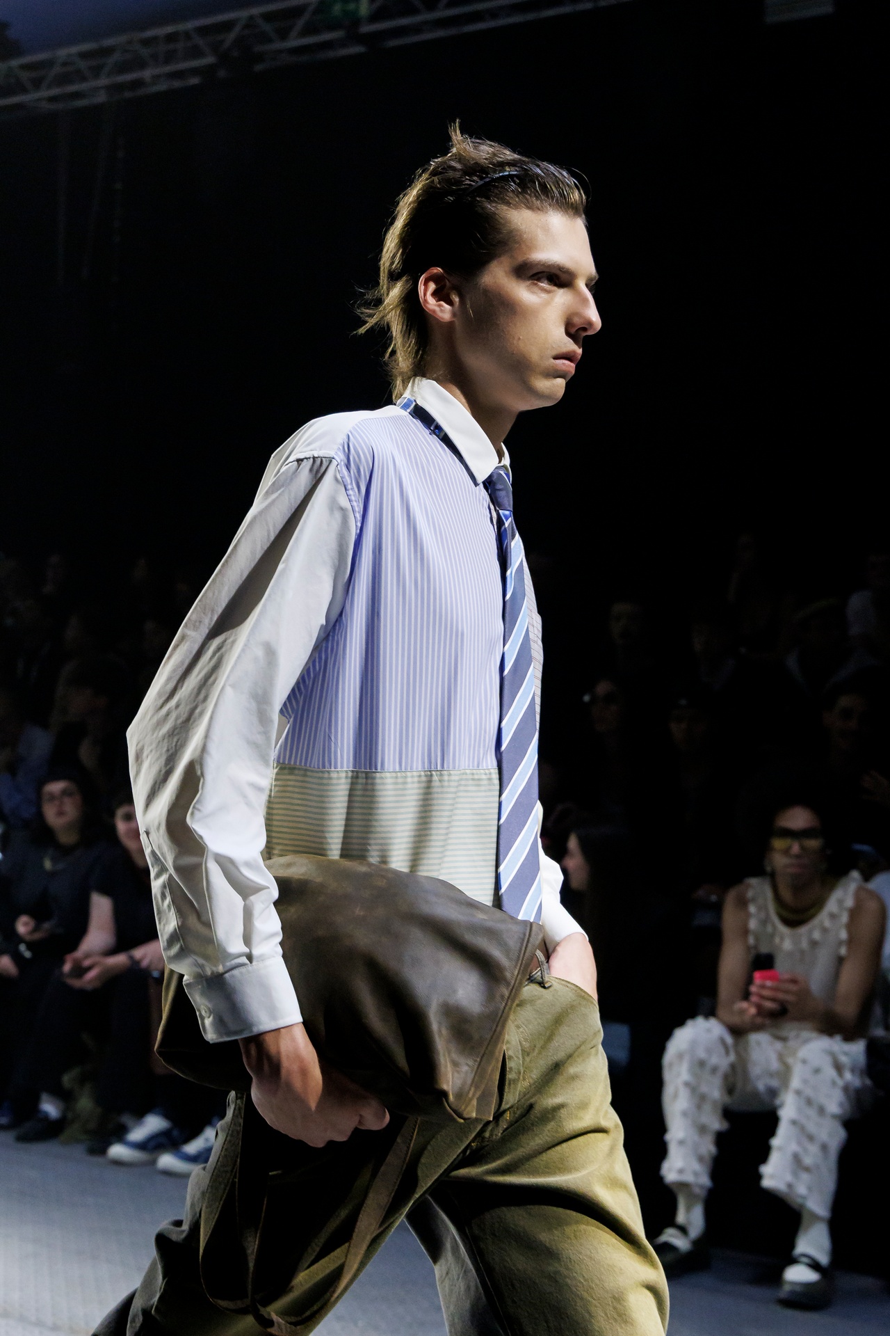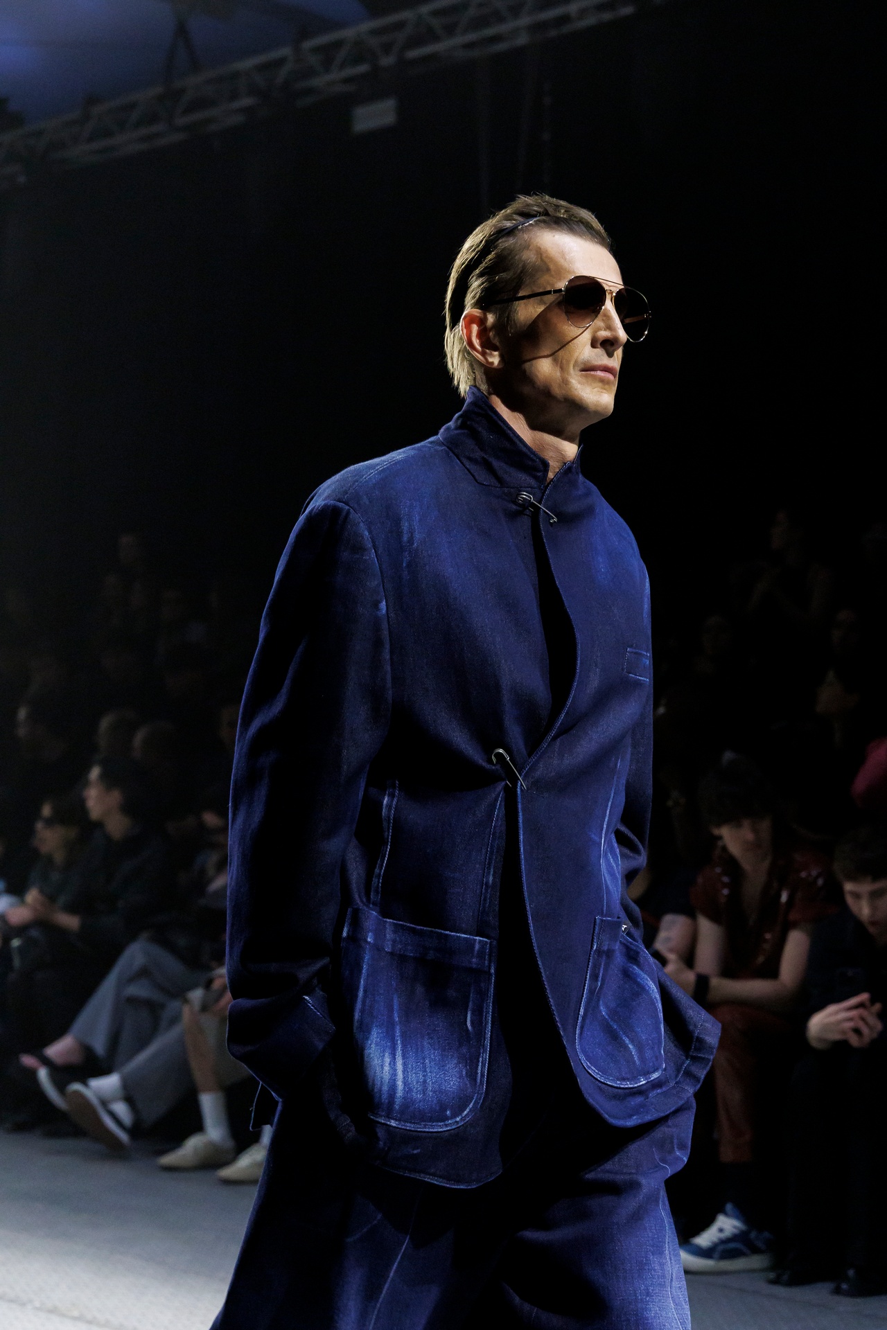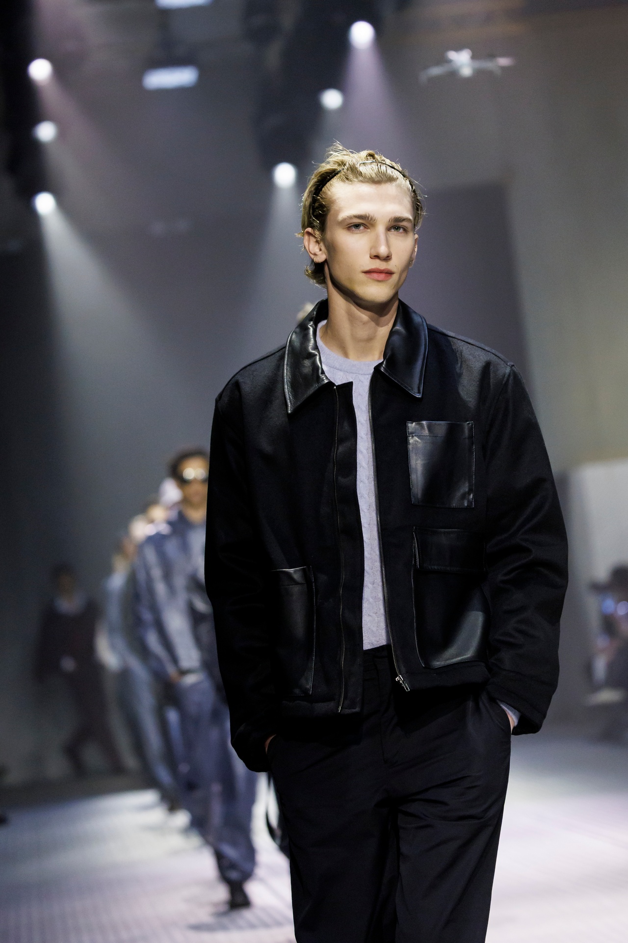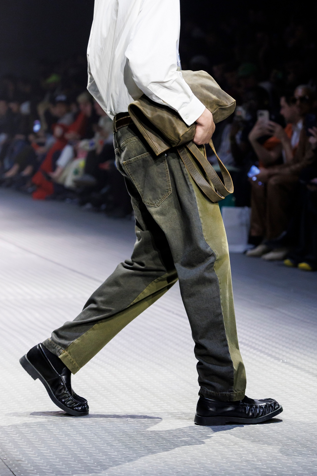 Las prendas se construyen a través de la composición. Los paneles se cruzan entre la sastrería y el denim, el cuero se encuentra con la lana y las superficies se organizan con precisión gráfica. Las costuras trazan líneas deliberadas sobre el cuerpo, convirtiendo el ensamblaje en lenguaje visual. El resultado no es nostálgico ni ornamental, sino controlado y arquitectónico.