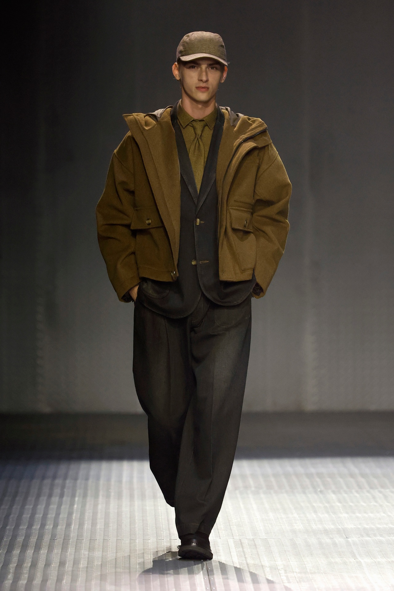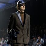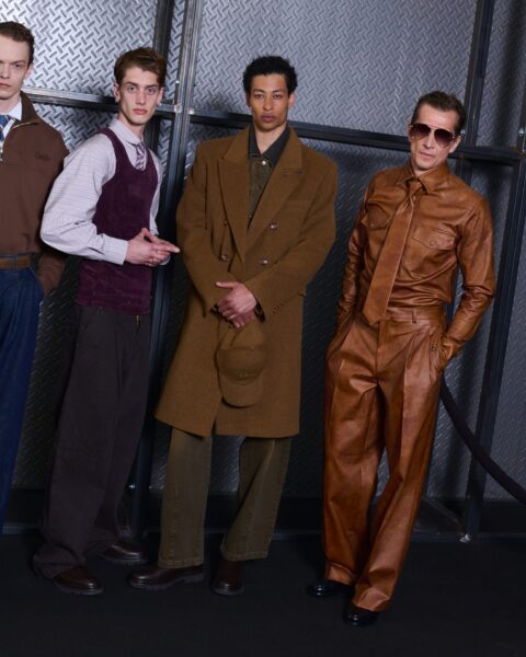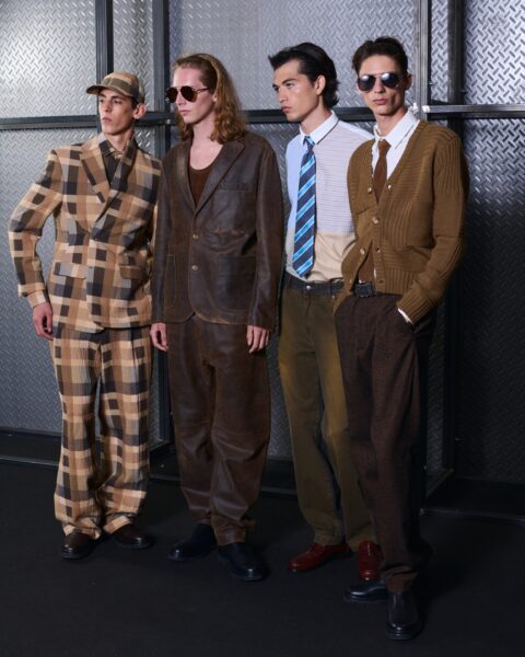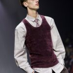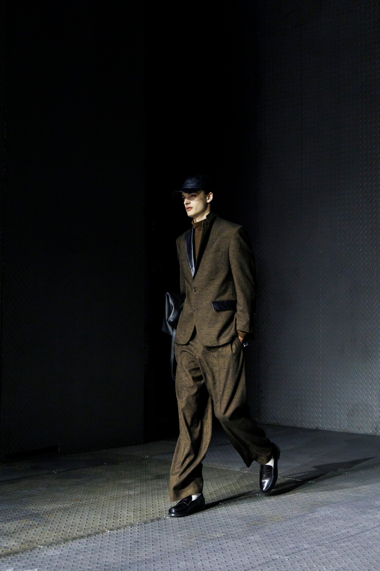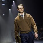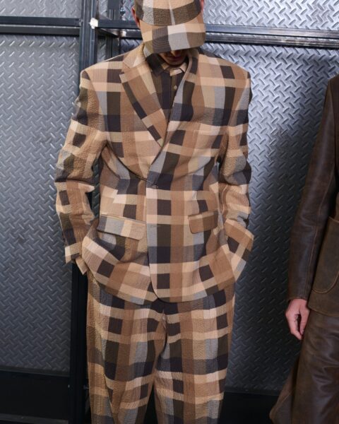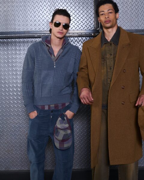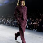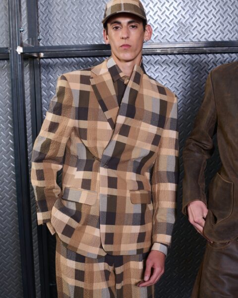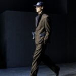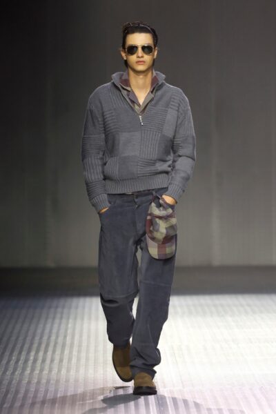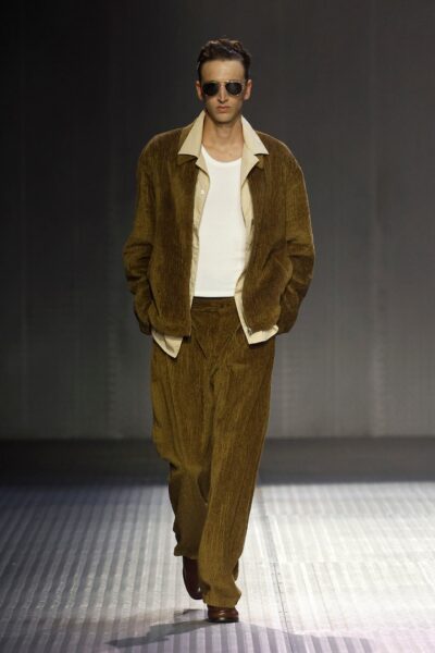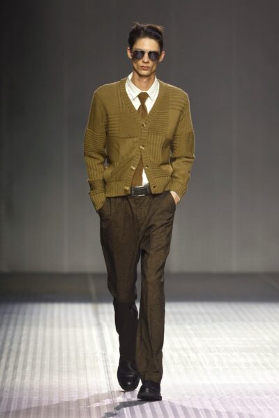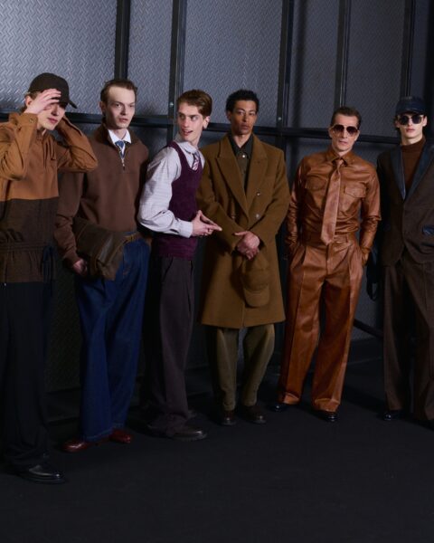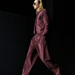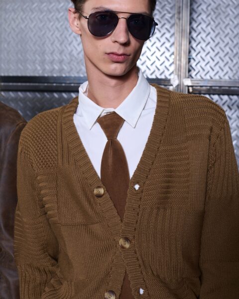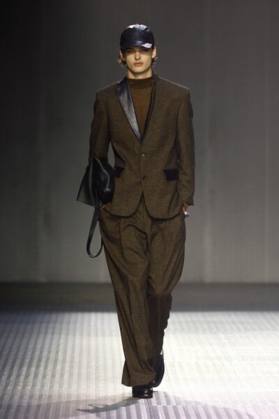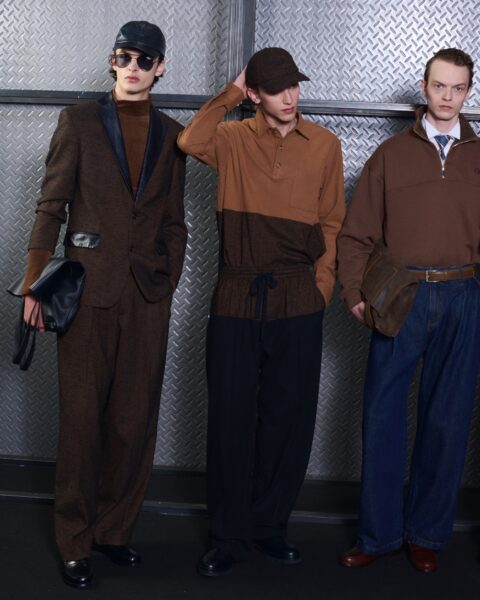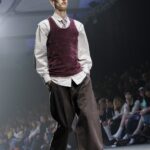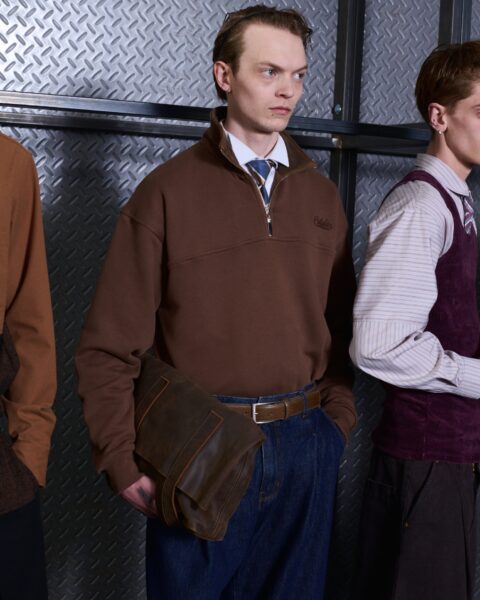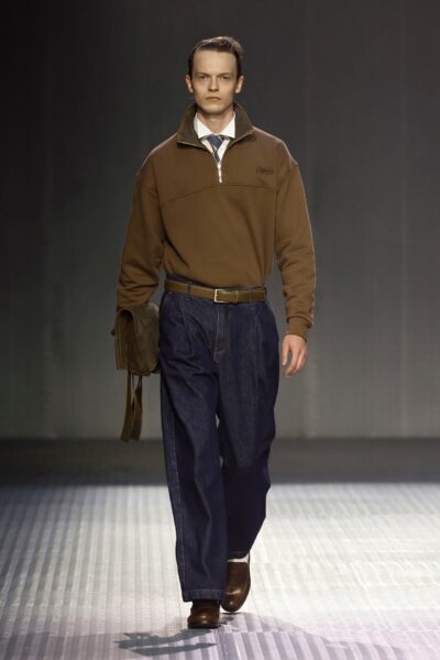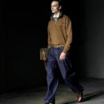Las siluetas son sólidas y contundentes. El volumen se sostiene con intención. Las prendas de abrigo estructuran la figura, mientras los pantalones caen amplios y con peso. La superposición no es exceso, sino sistema, permitiendo que las piezas se articulen y se adapten. La paleta se mantiene contenida, moviéndose entre marrones, camel, burdeos, marino y gris, priorizando la profundidad y la textura frente al adorno.