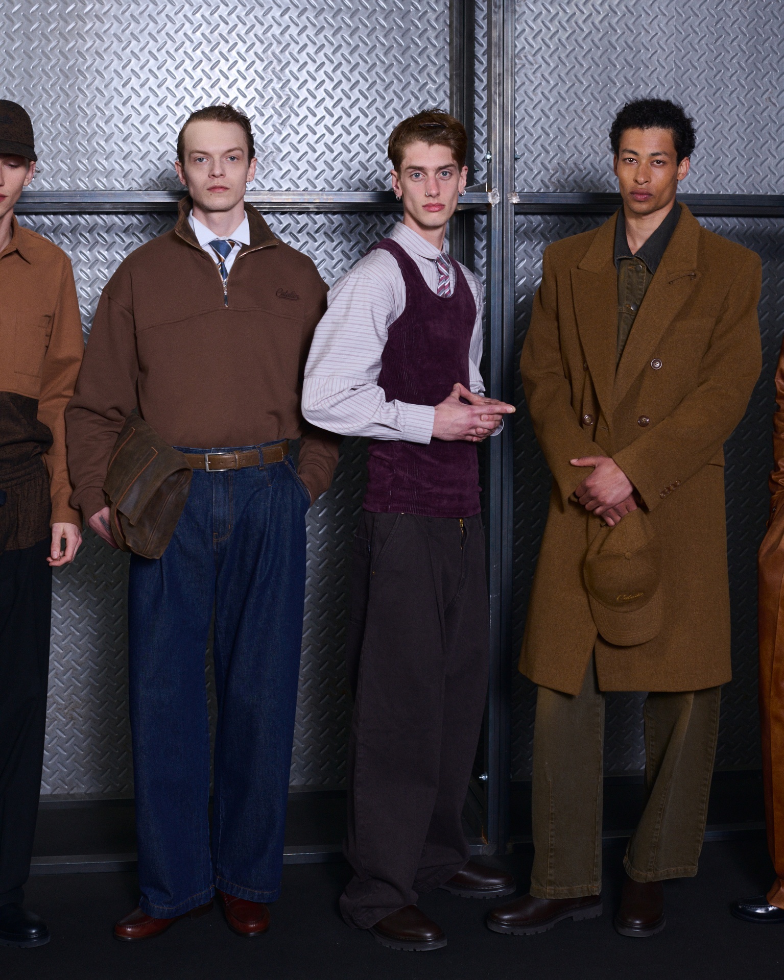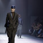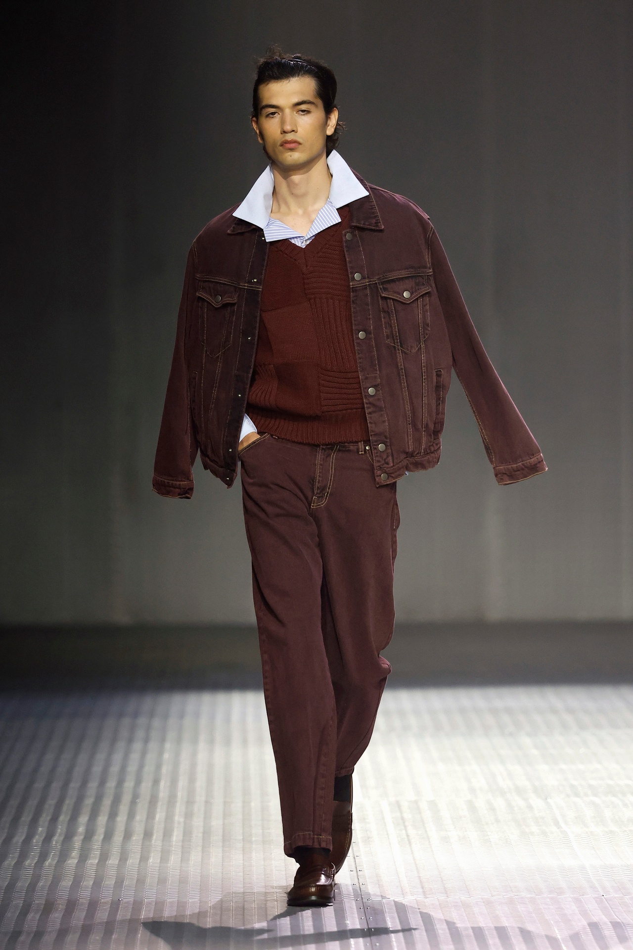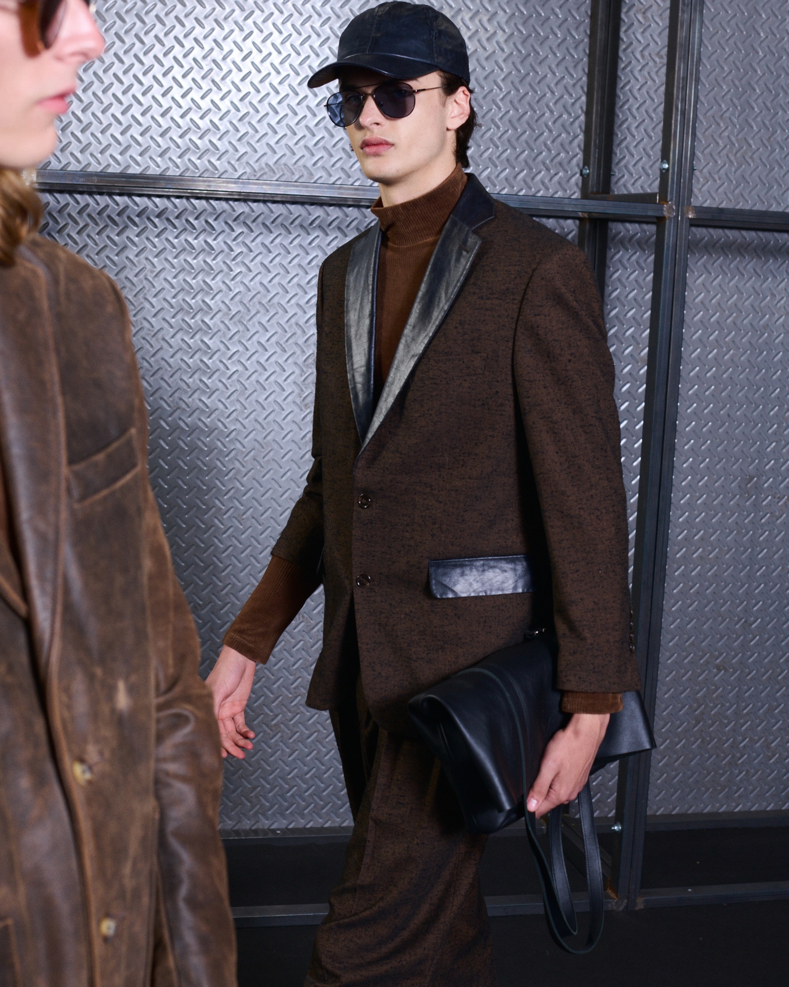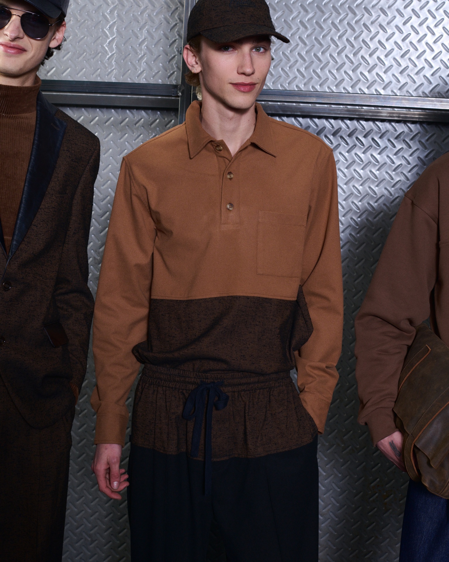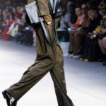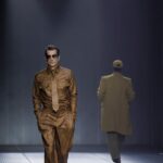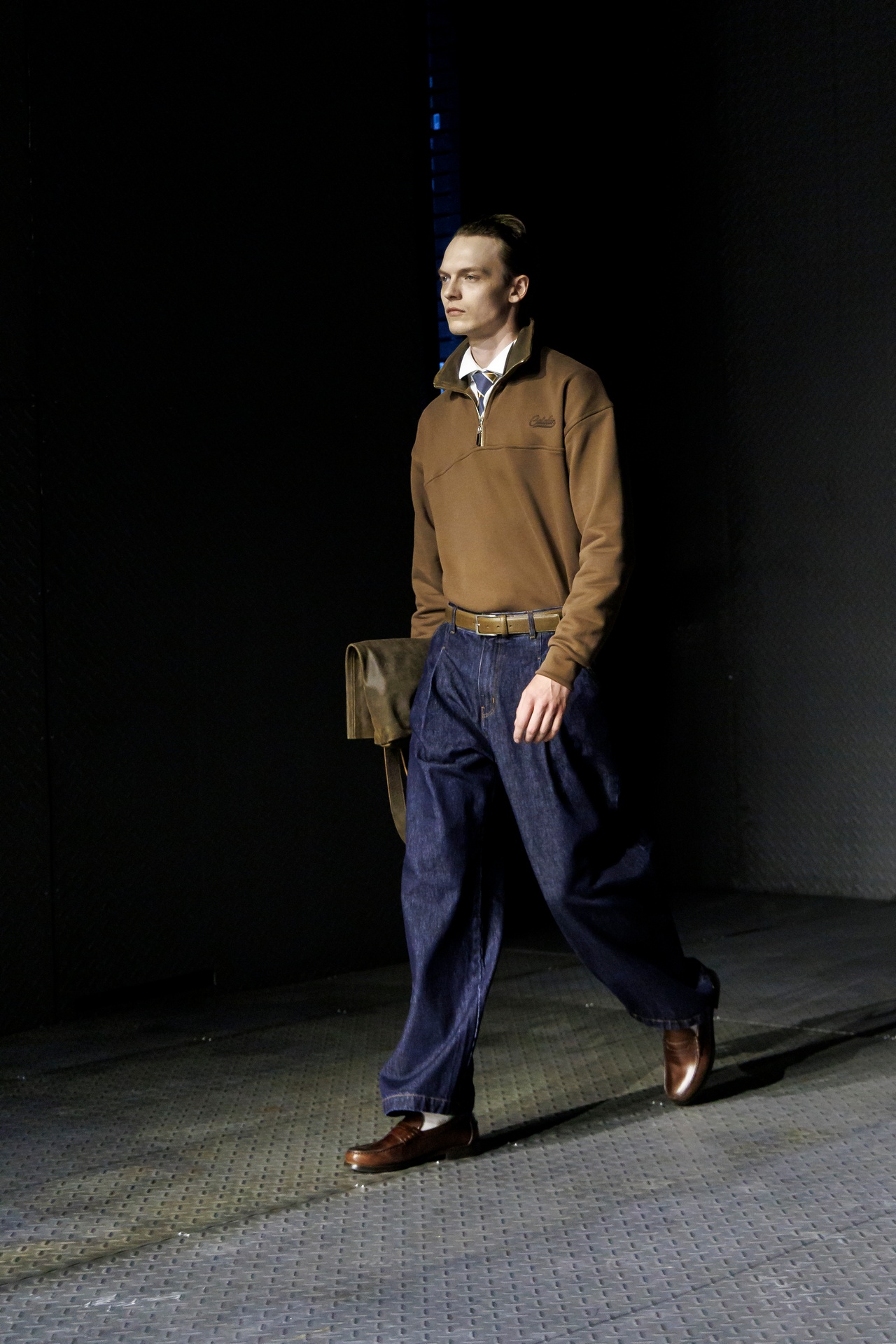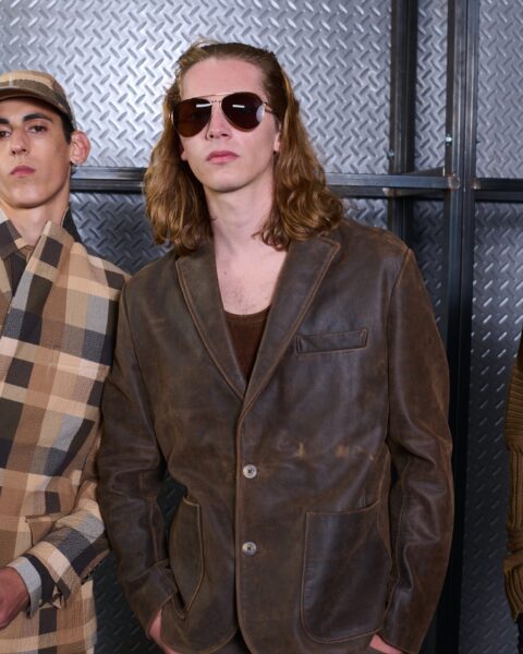 Las siluetas son sólidas y contundentes. El volumen se sostiene con intención. Las prendas de abrigo estructuran la figura, mientras los pantalones caen amplios y con peso. La superposición no es exceso, sino sistema, permitiendo que las piezas se articulen y se adapten. La paleta se mantiene contenida, moviéndose entre marrones, camel, burdeos, marino y gris, priorizando la profundidad y la textura frente al adorno.
