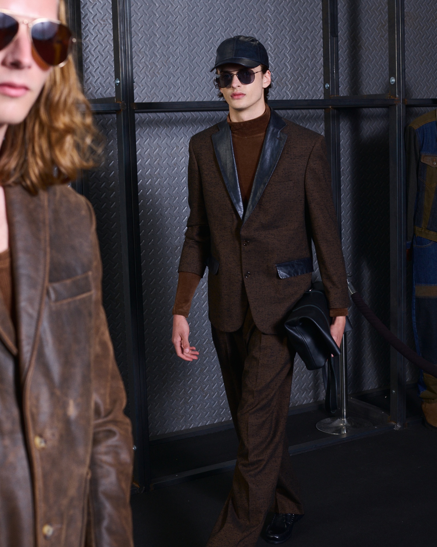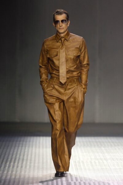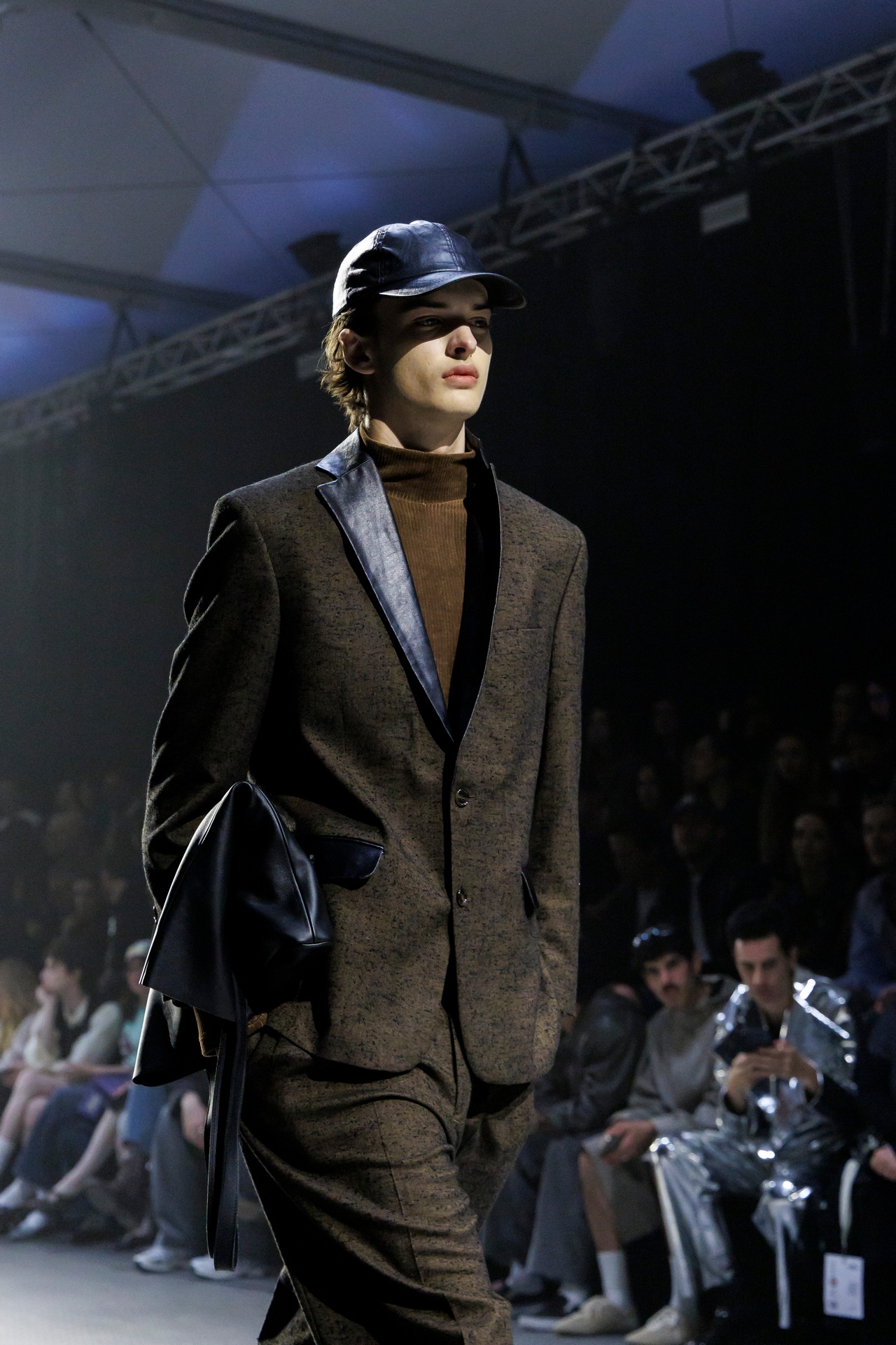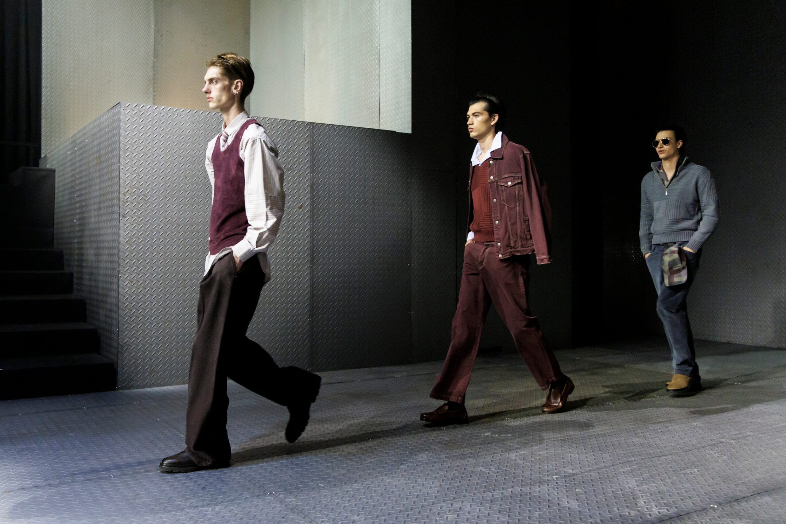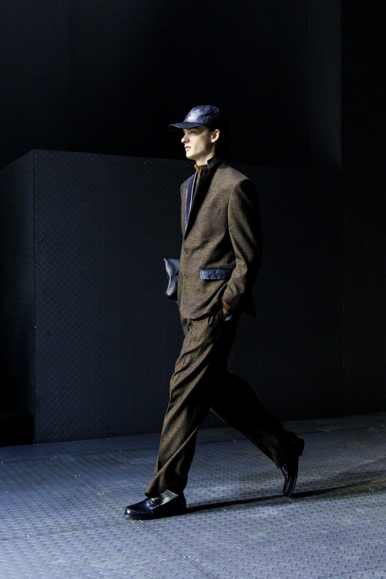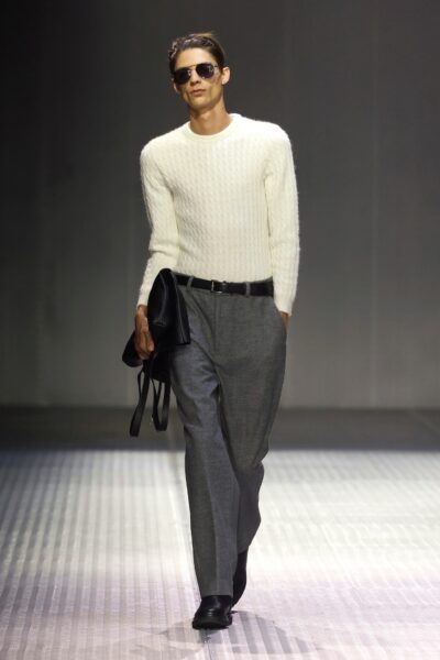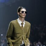 Las siluetas son sólidas y contundentes. El volumen se sostiene con intención. Las prendas de abrigo estructuran la figura, mientras los pantalones caen amplios y con peso. La superposición no es exceso, sino sistema, permitiendo que las piezas se articulen y se adapten. La paleta se mantiene contenida, moviéndose entre marrones, camel, burdeos, marino y gris, priorizando la profundidad y la textura frente al adorno.