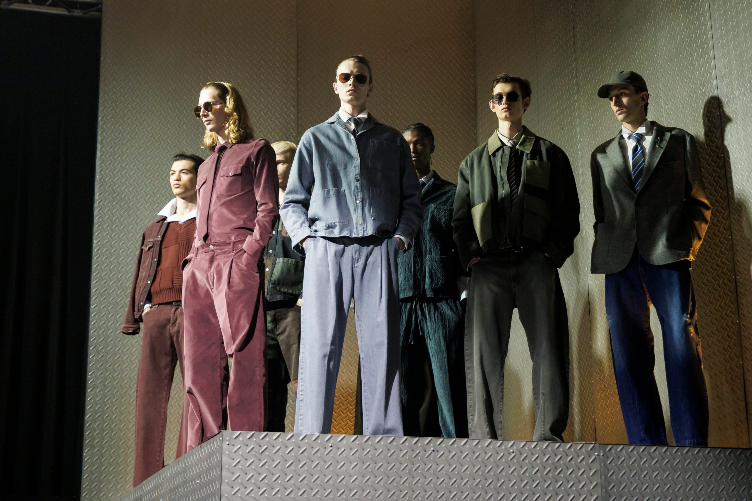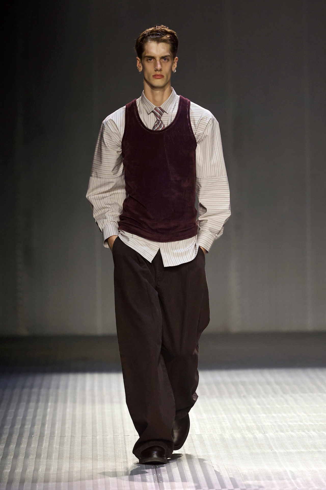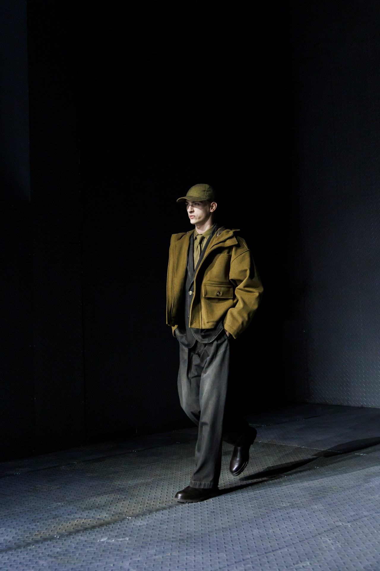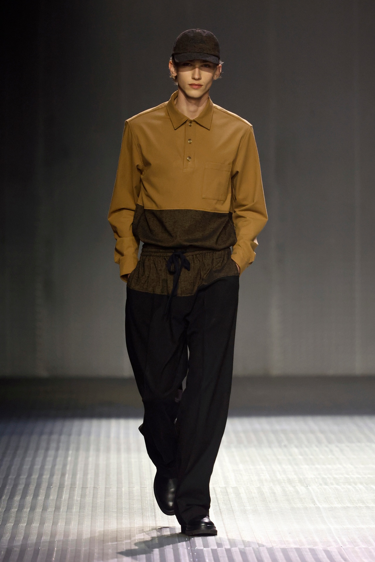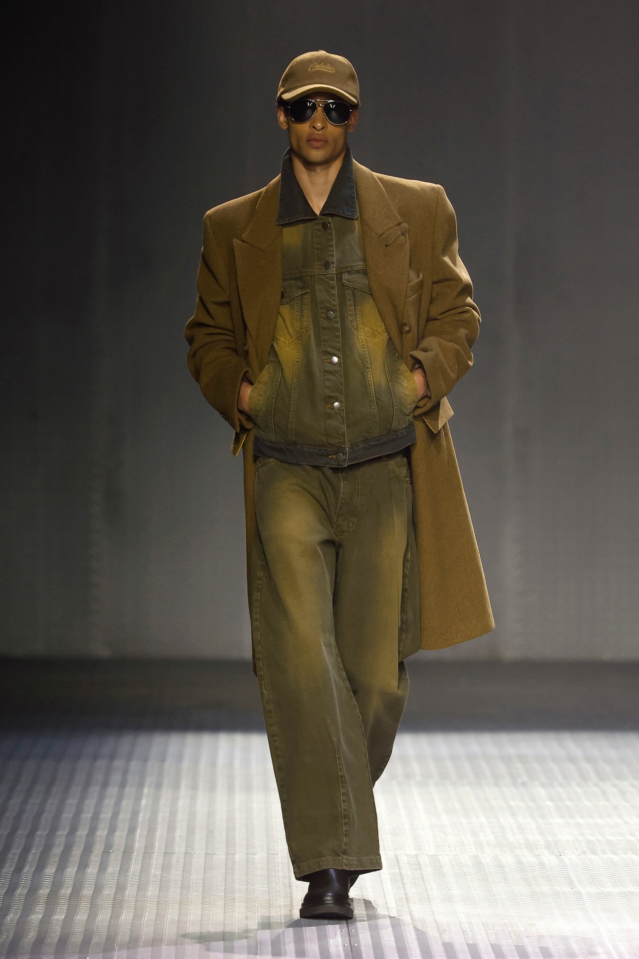 Las siluetas son sólidas y contundentes. El volumen se sostiene con intención. Las prendas de abrigo estructuran la figura, mientras los pantalones caen amplios y con peso. La superposición no es exceso, sino sistema, permitiendo que las piezas se articulen y se adapten. La paleta se mantiene contenida, moviéndose entre marrones, camel, burdeos, marino y gris, priorizando la profundidad y la textura frente al adorno.