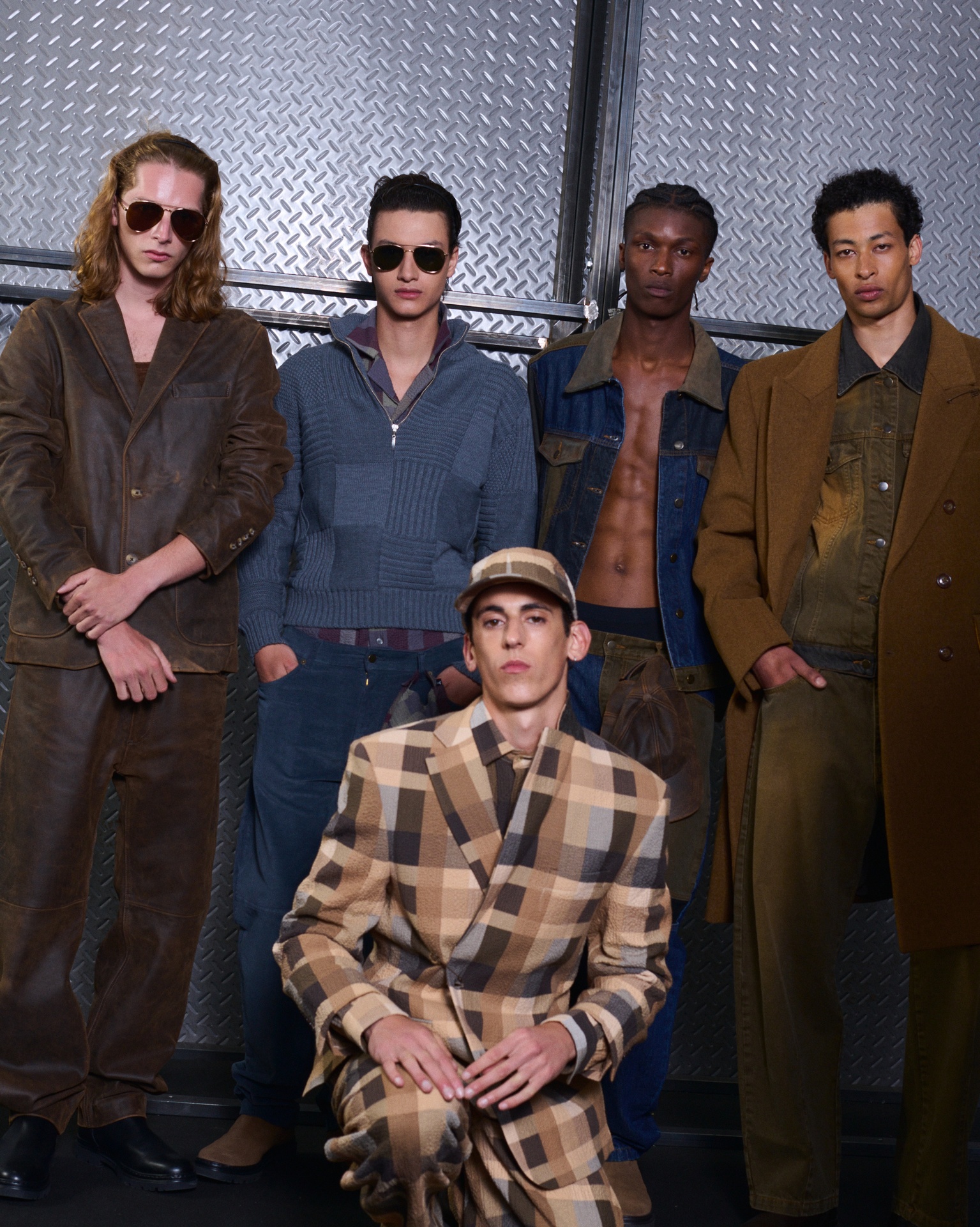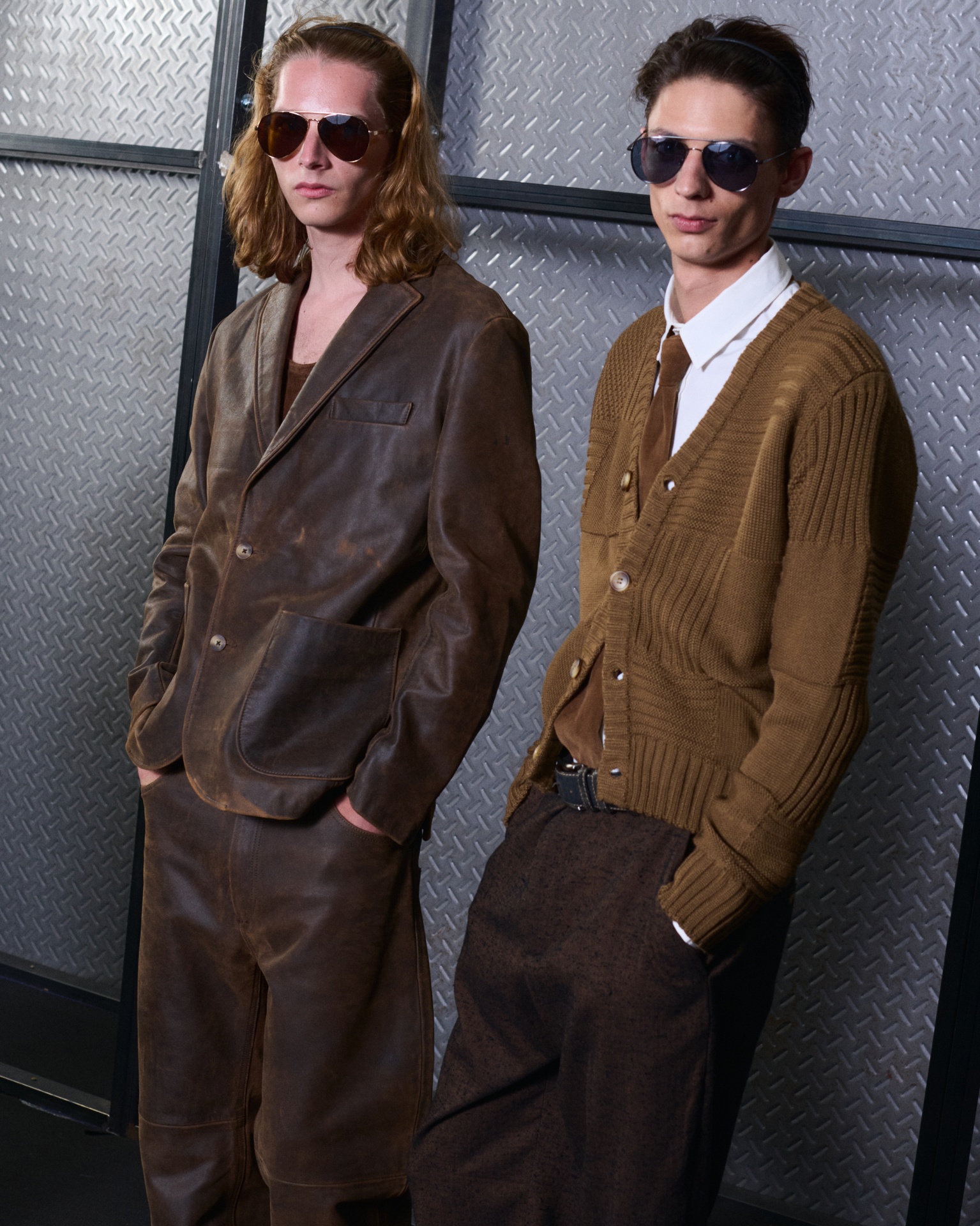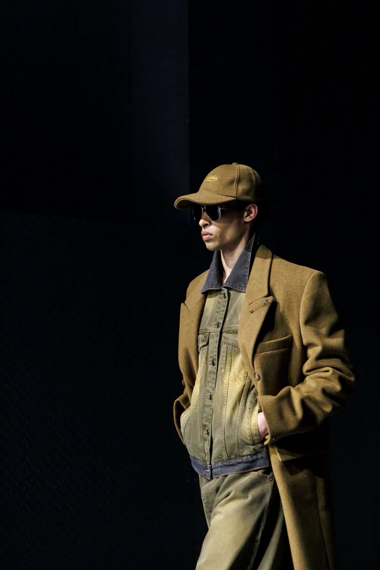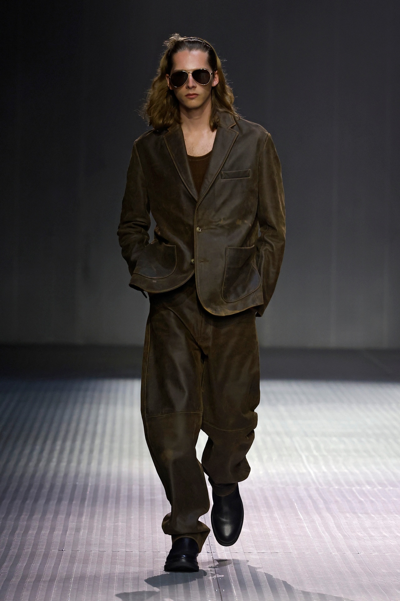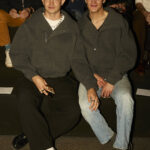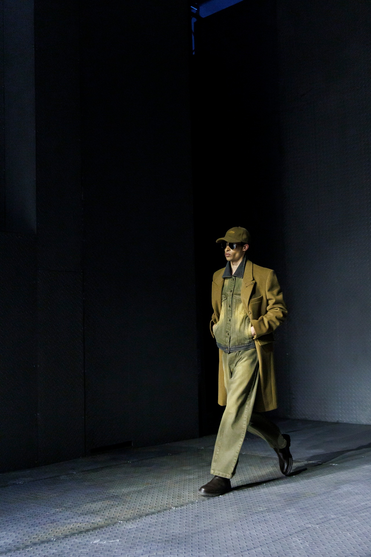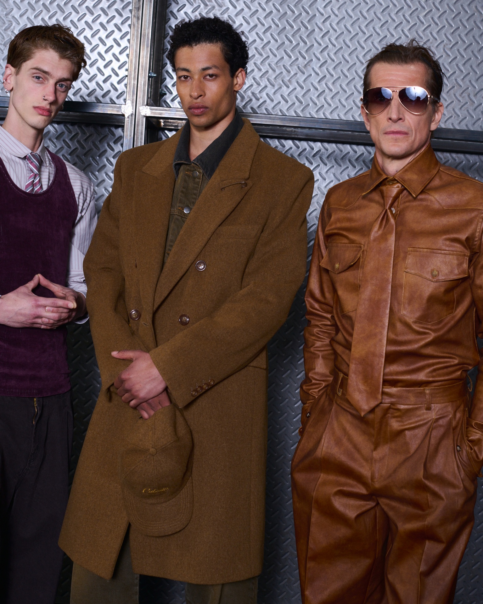 Las siluetas son sólidas y contundentes. El volumen se sostiene con intención. Las prendas de abrigo estructuran la figura, mientras los pantalones caen amplios y con peso. La superposición no es exceso, sino sistema, permitiendo que las piezas se articulen y se adapten. La paleta se mantiene contenida, moviéndose entre marrones, camel, burdeos, marino y gris, priorizando la profundidad y la textura frente al adorno.