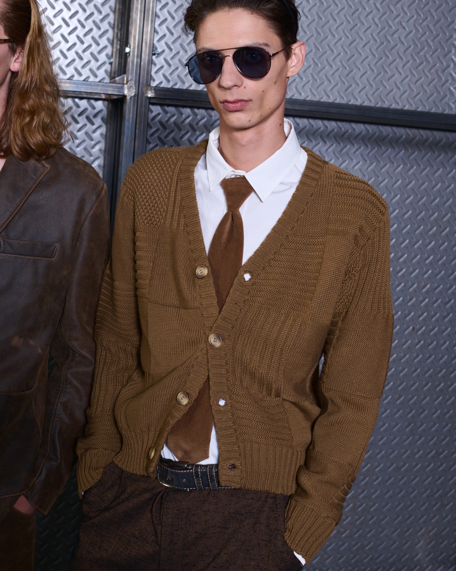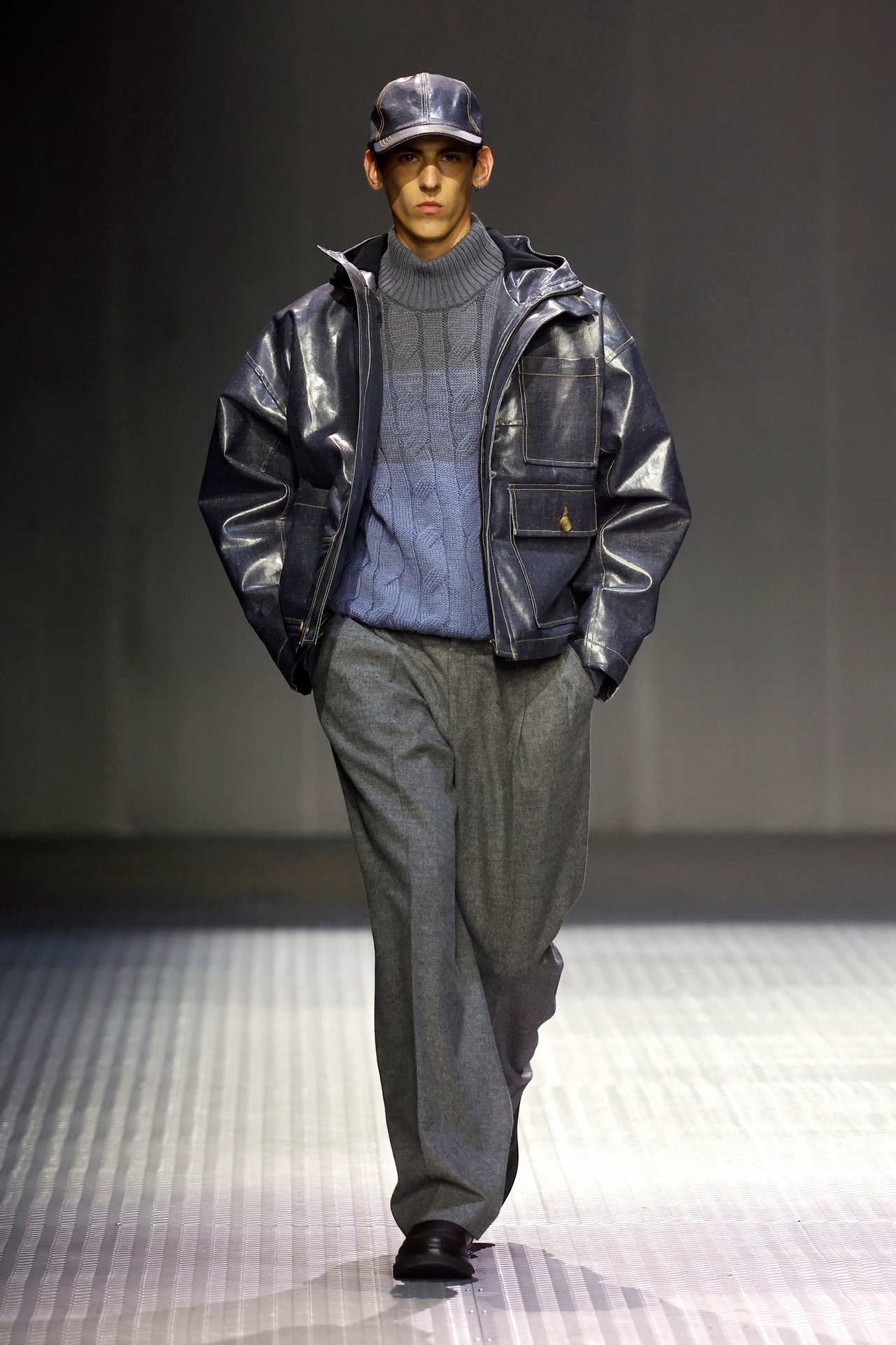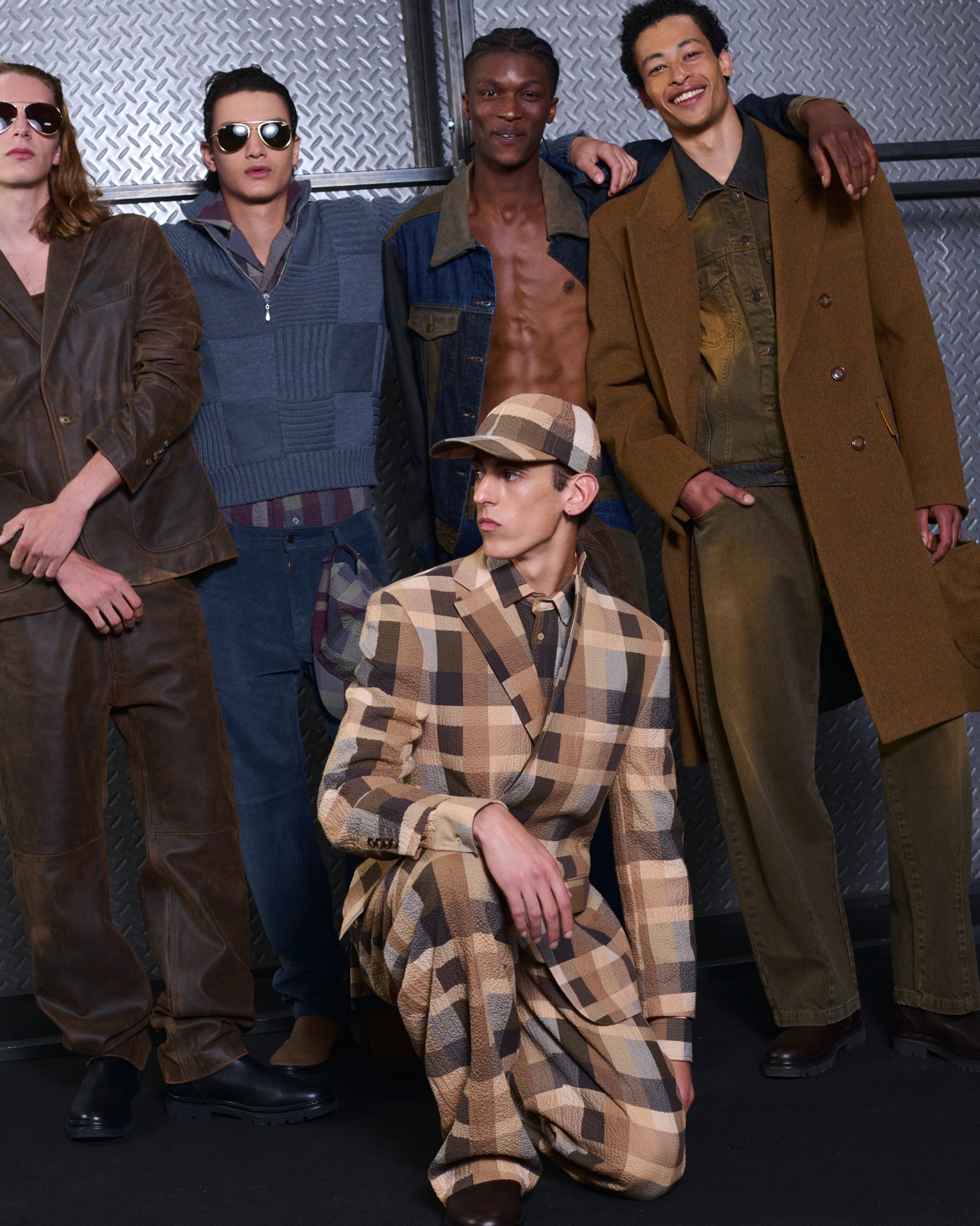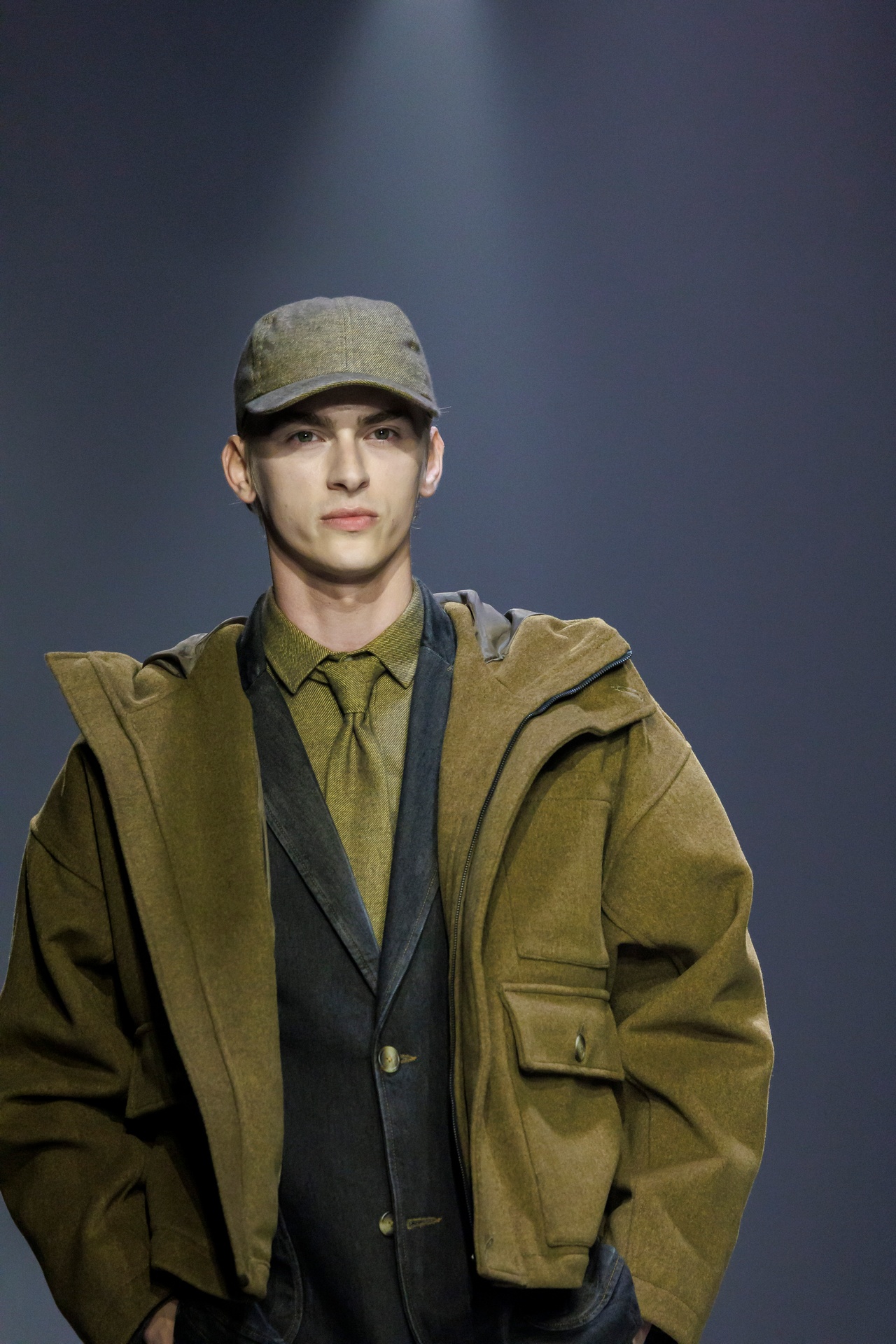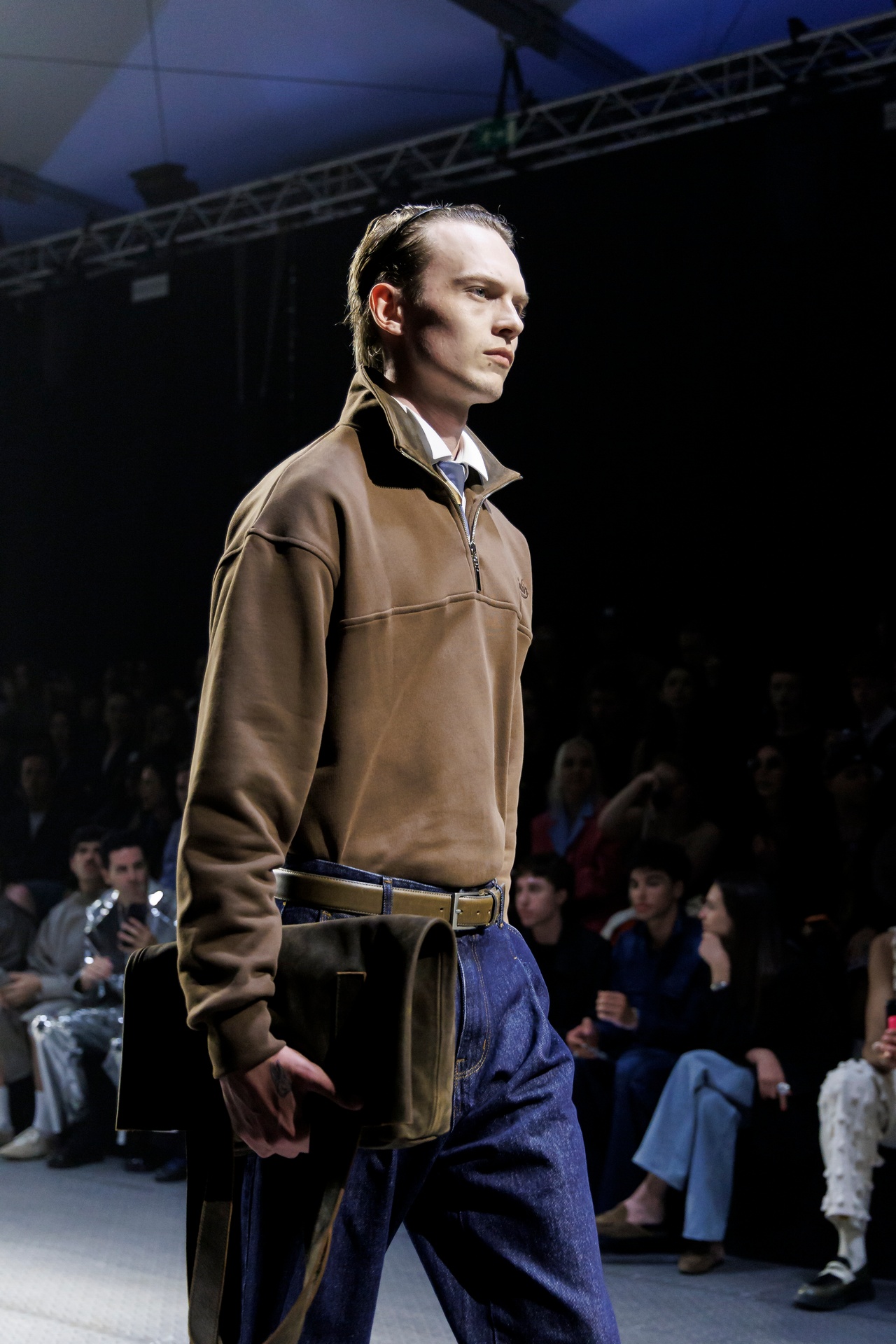 Las siluetas son sólidas y contundentes. El volumen se sostiene con intención. Las prendas de abrigo estructuran la figura, mientras los pantalones caen amplios y con peso. La superposición no es exceso, sino sistema, permitiendo que las piezas se articulen y se adapten. La paleta se mantiene contenida, moviéndose entre marrones, camel, burdeos, marino y gris, priorizando la profundidad y la textura frente al adorno.