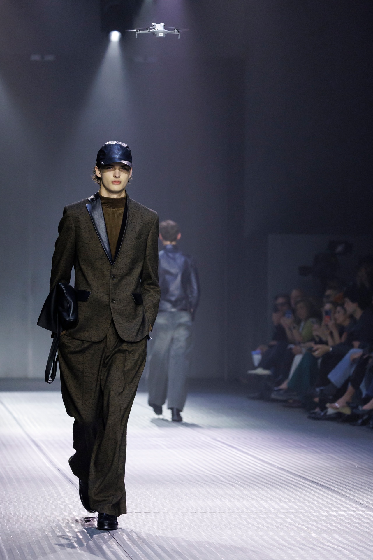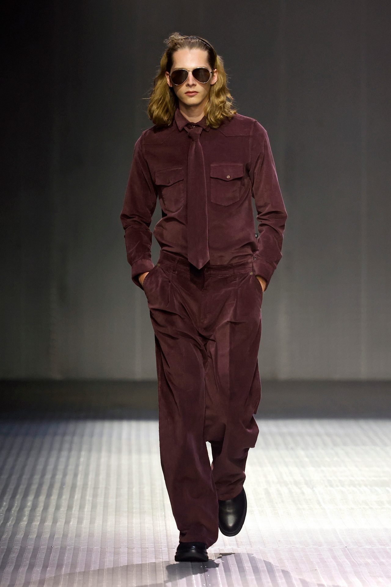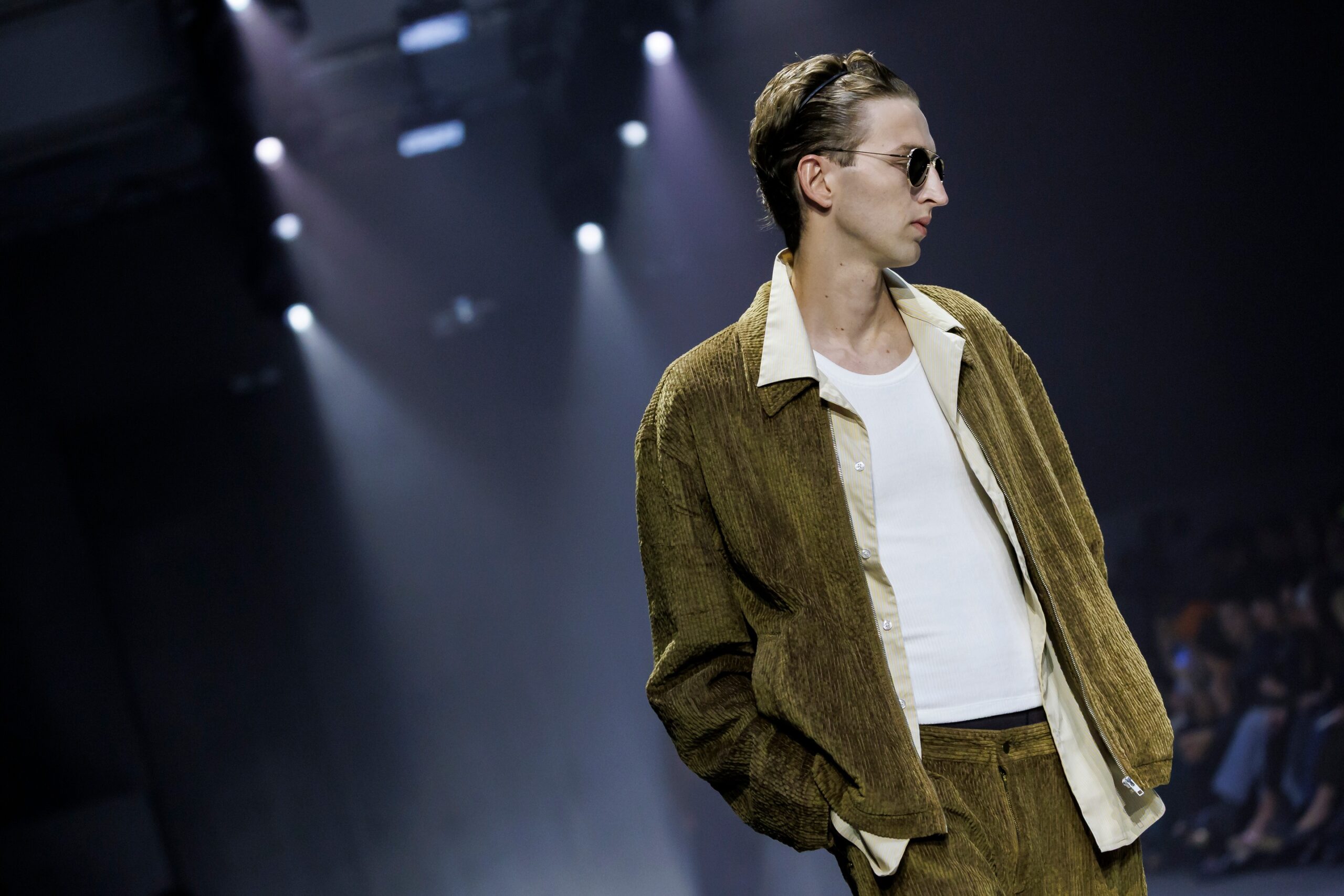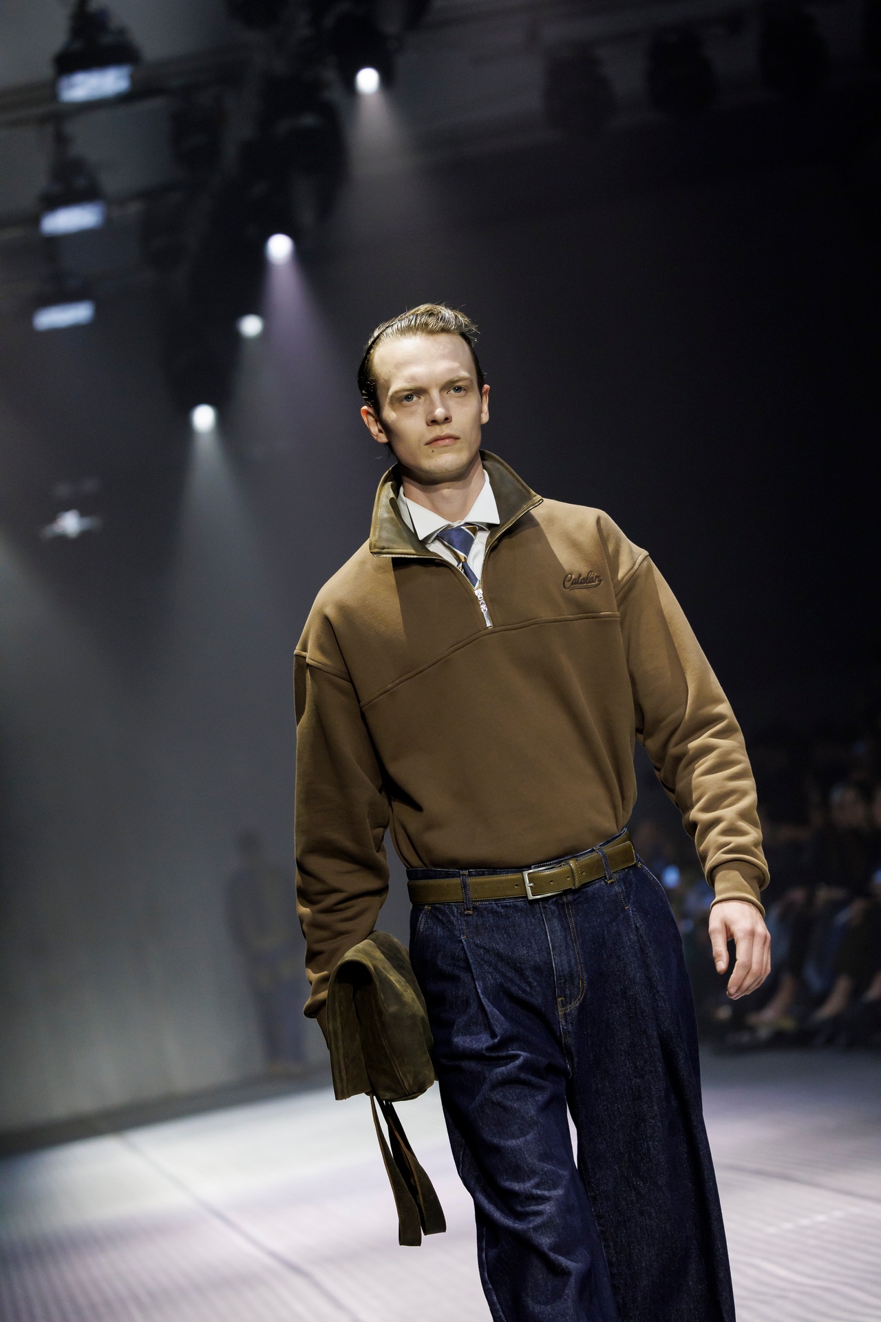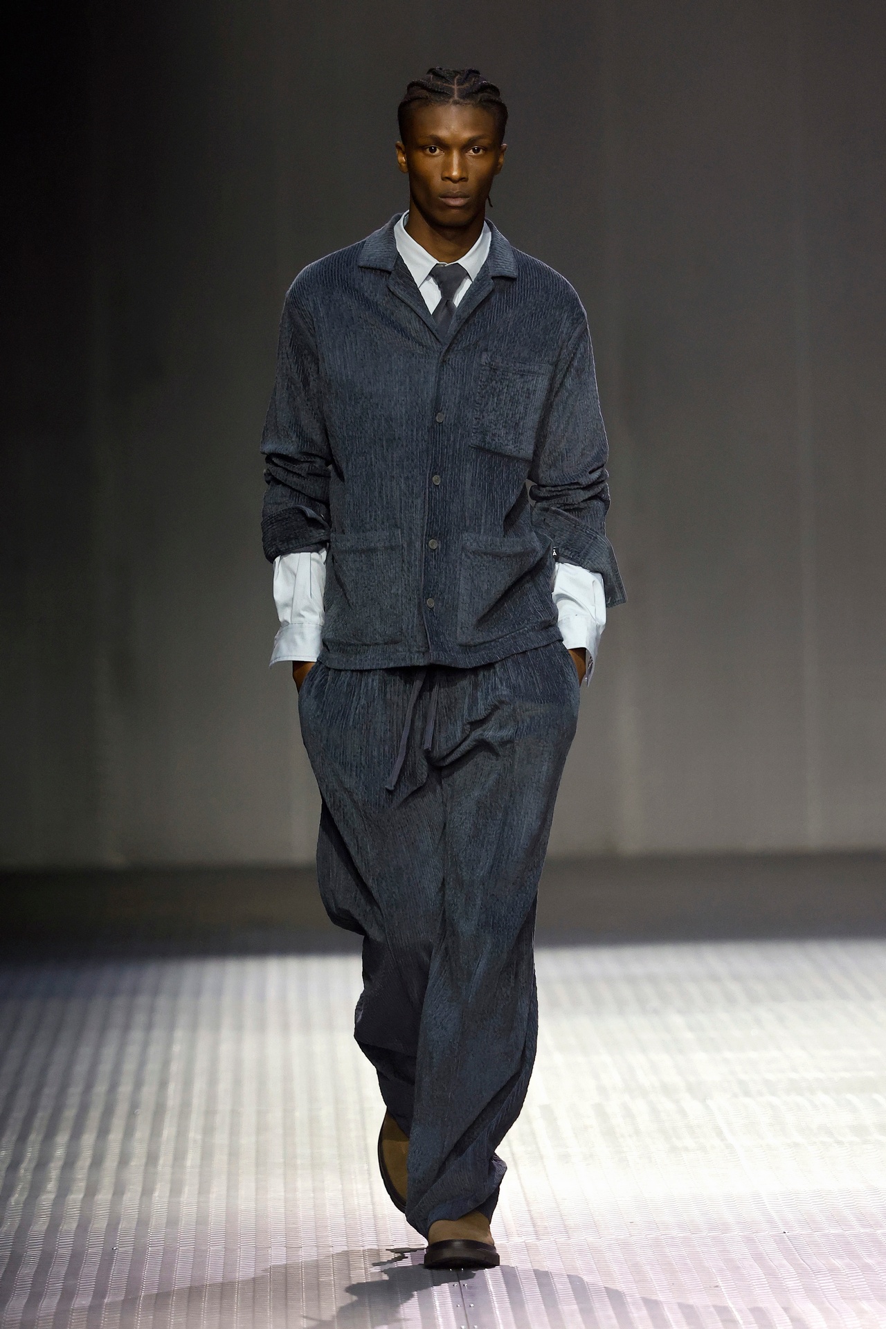 Las siluetas son sólidas y contundentes. El volumen se sostiene con intención. Las prendas de abrigo estructuran la figura, mientras los pantalones caen amplios y con peso. La superposición no es exceso, sino sistema, permitiendo que las piezas se articulen y se adapten. La paleta se mantiene contenida, moviéndose entre marrones, camel, burdeos, marino y gris, priorizando la profundidad y la textura frente al adorno.