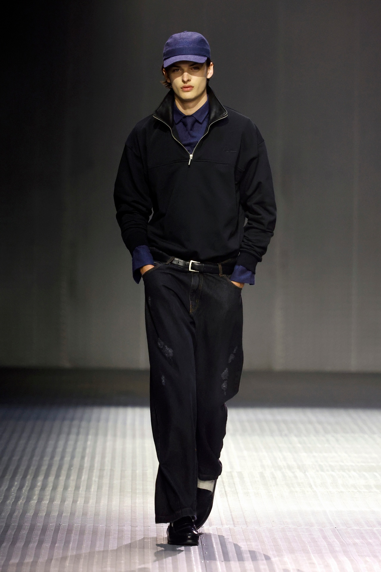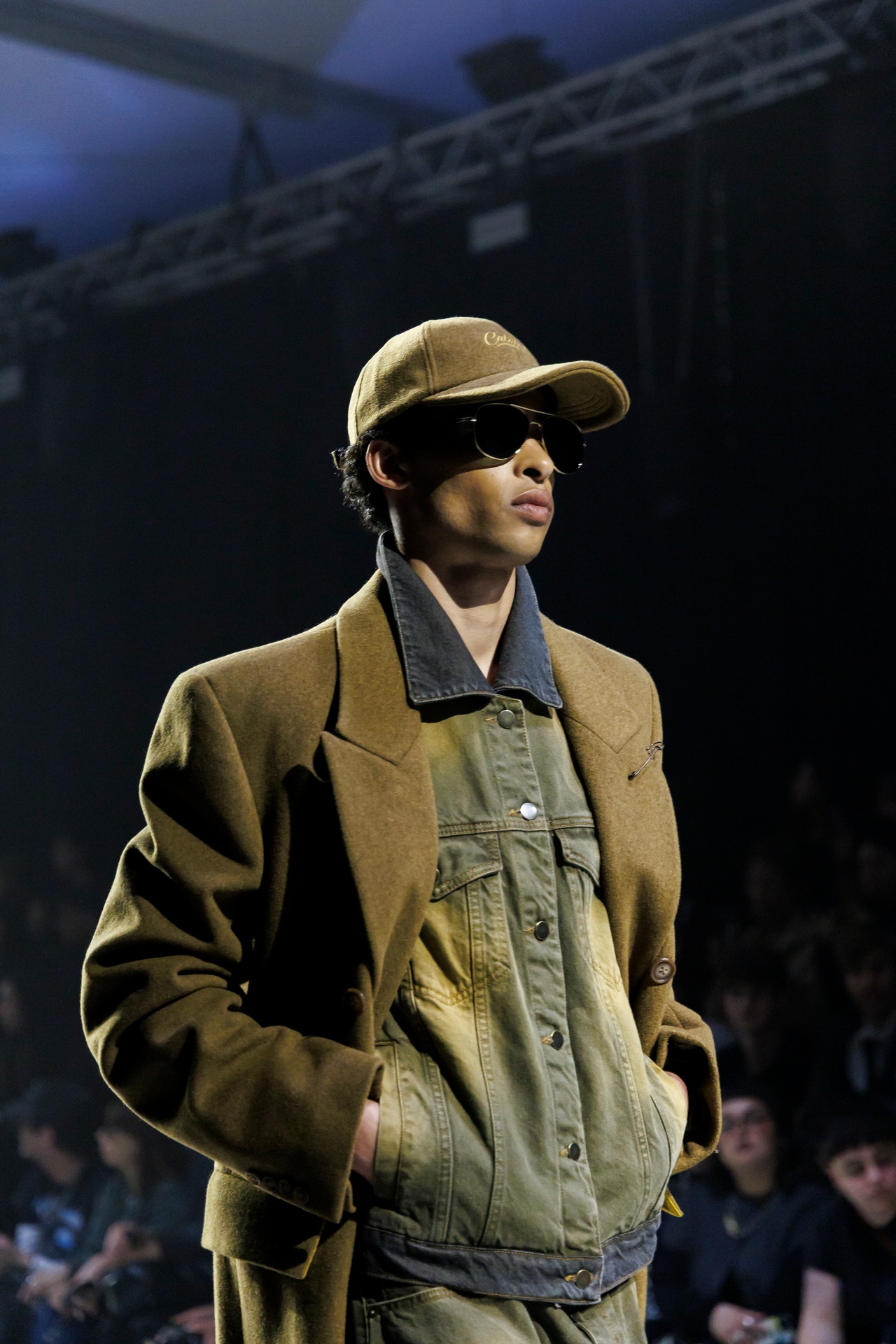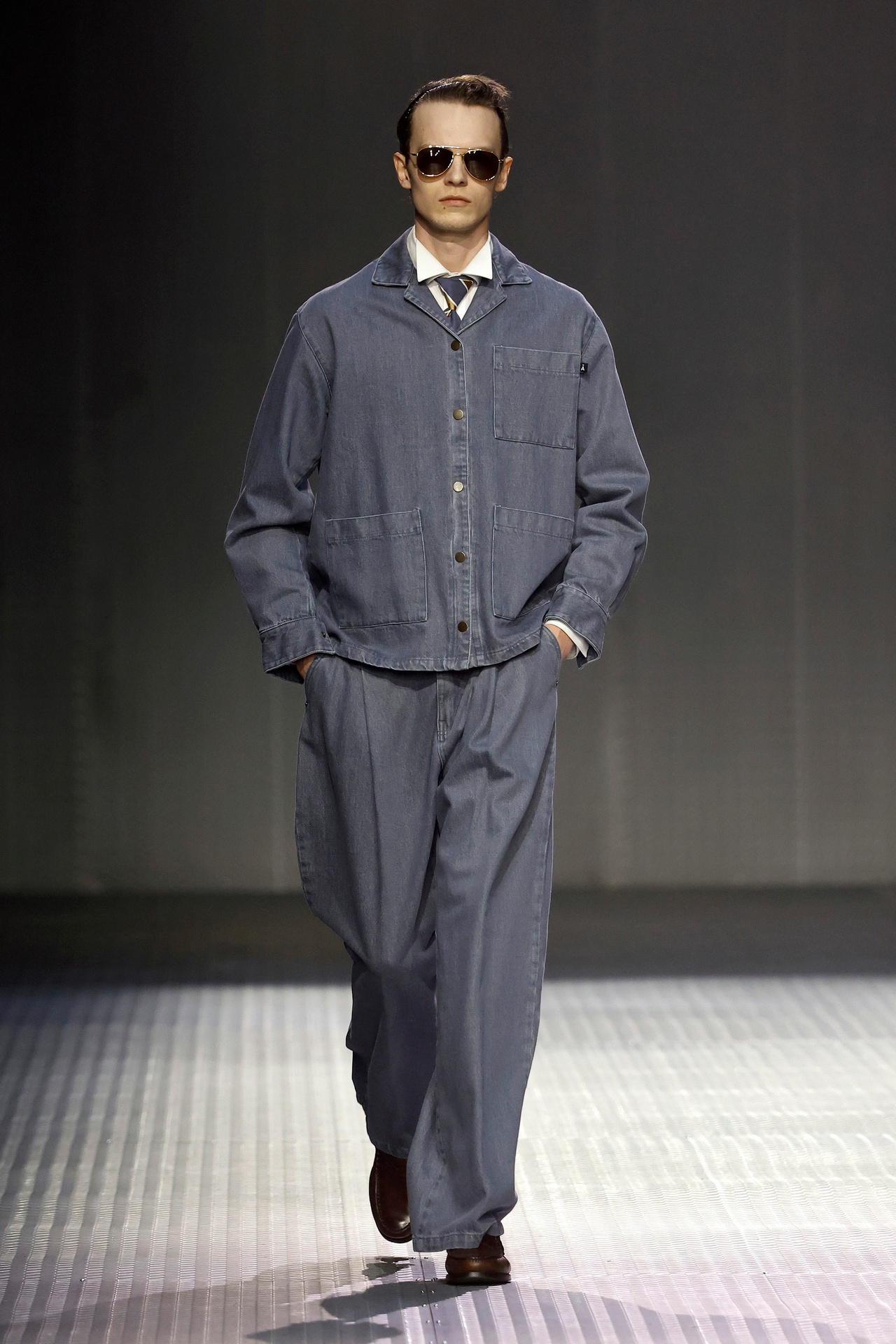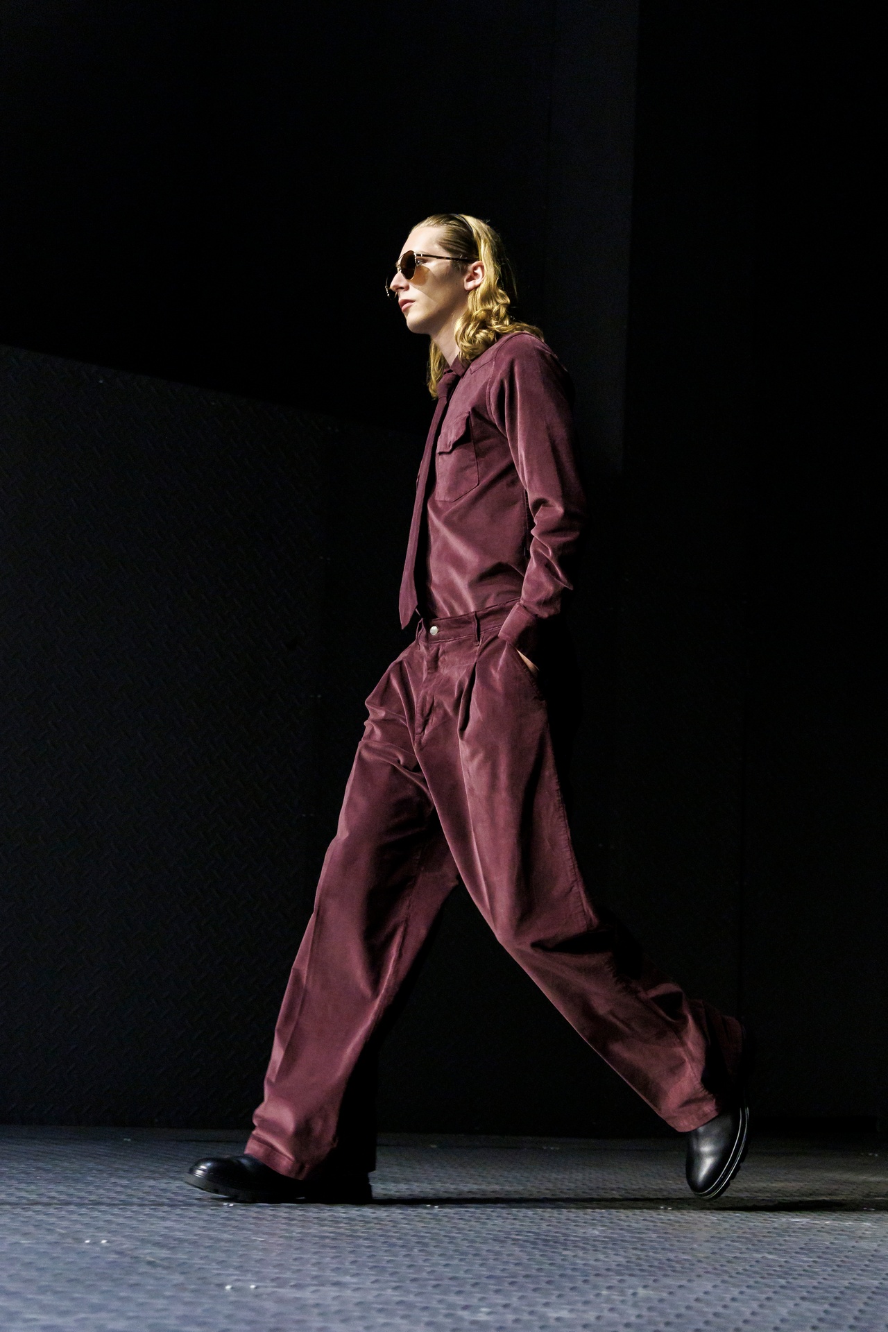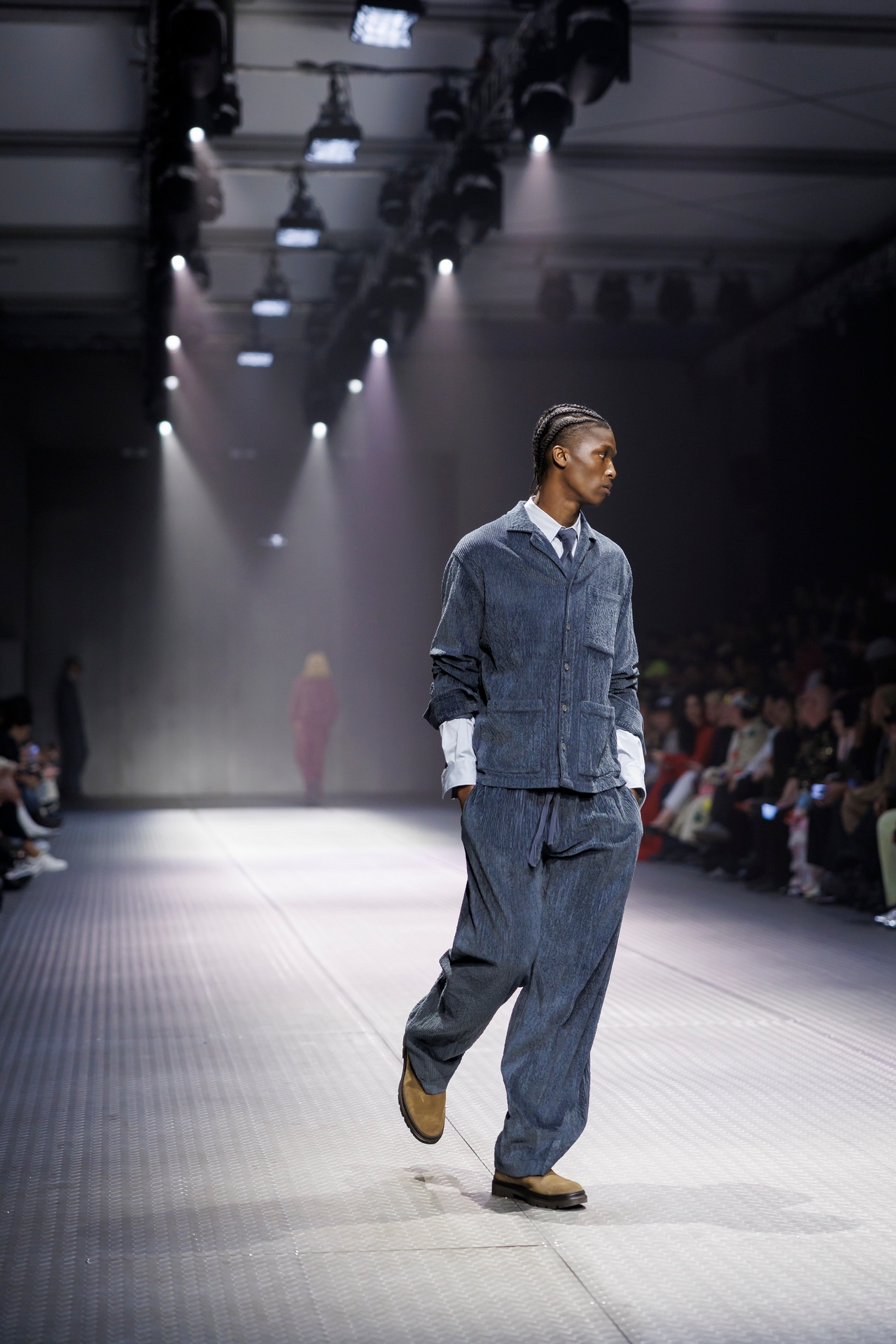 Las siluetas son sólidas y contundentes. El volumen se sostiene con intención. Las prendas de abrigo estructuran la figura, mientras los pantalones caen amplios y con peso. La superposición no es exceso, sino sistema, permitiendo que las piezas se articulen y se adapten. La paleta se mantiene contenida, moviéndose entre marrones, camel, burdeos, marino y gris, priorizando la profundidad y la textura frente al adorno.