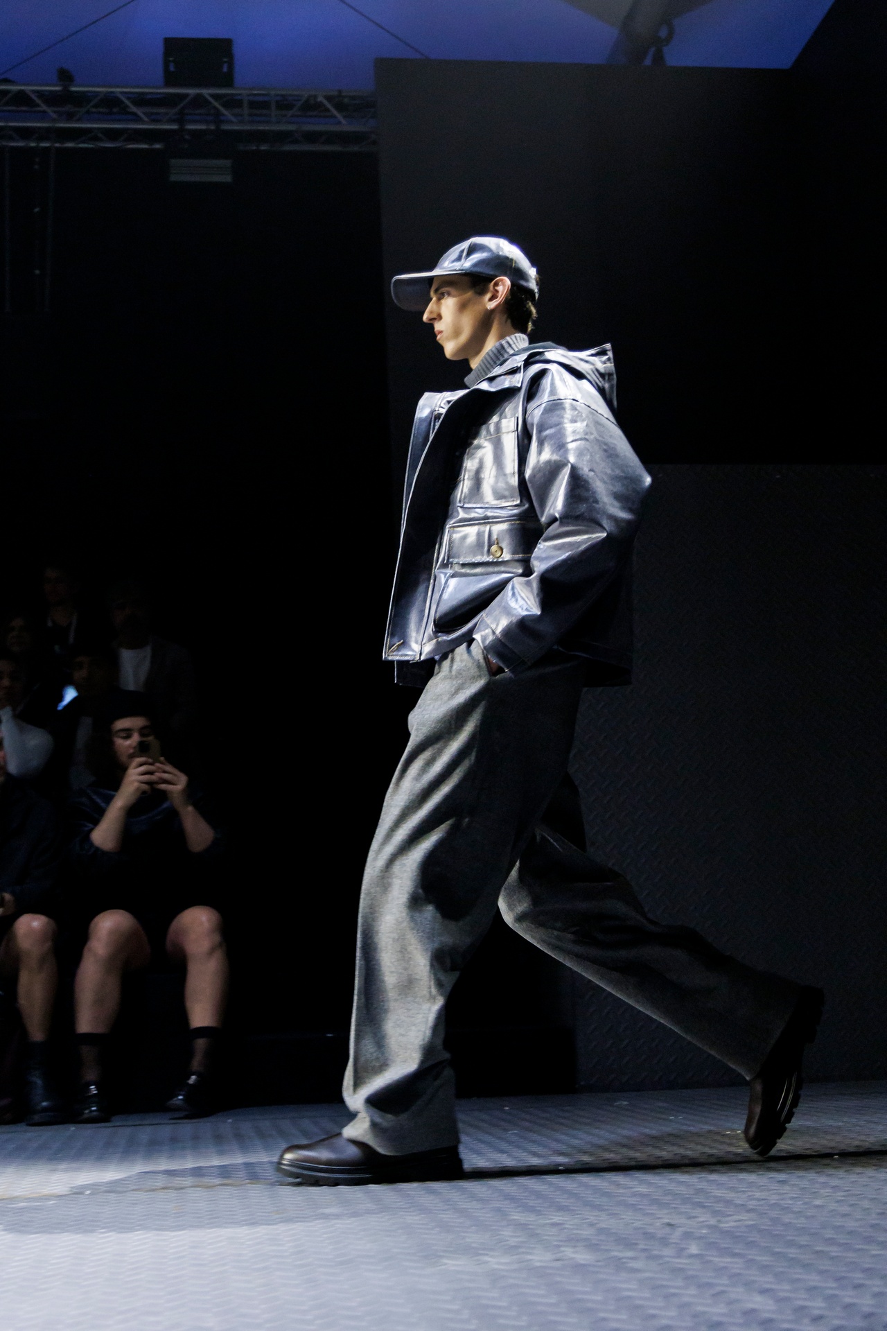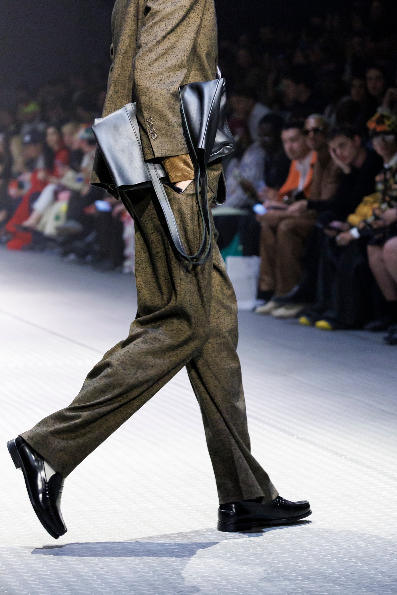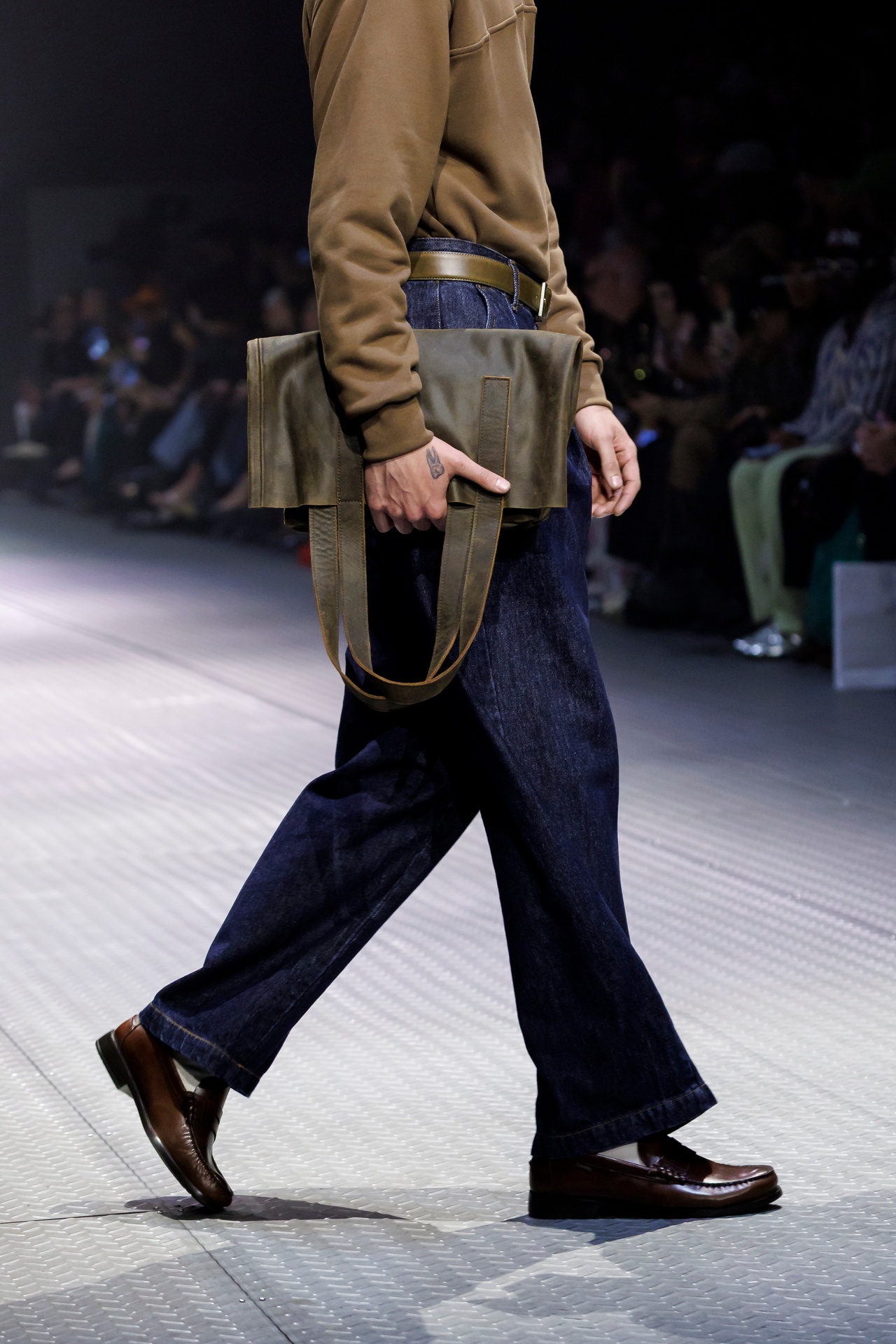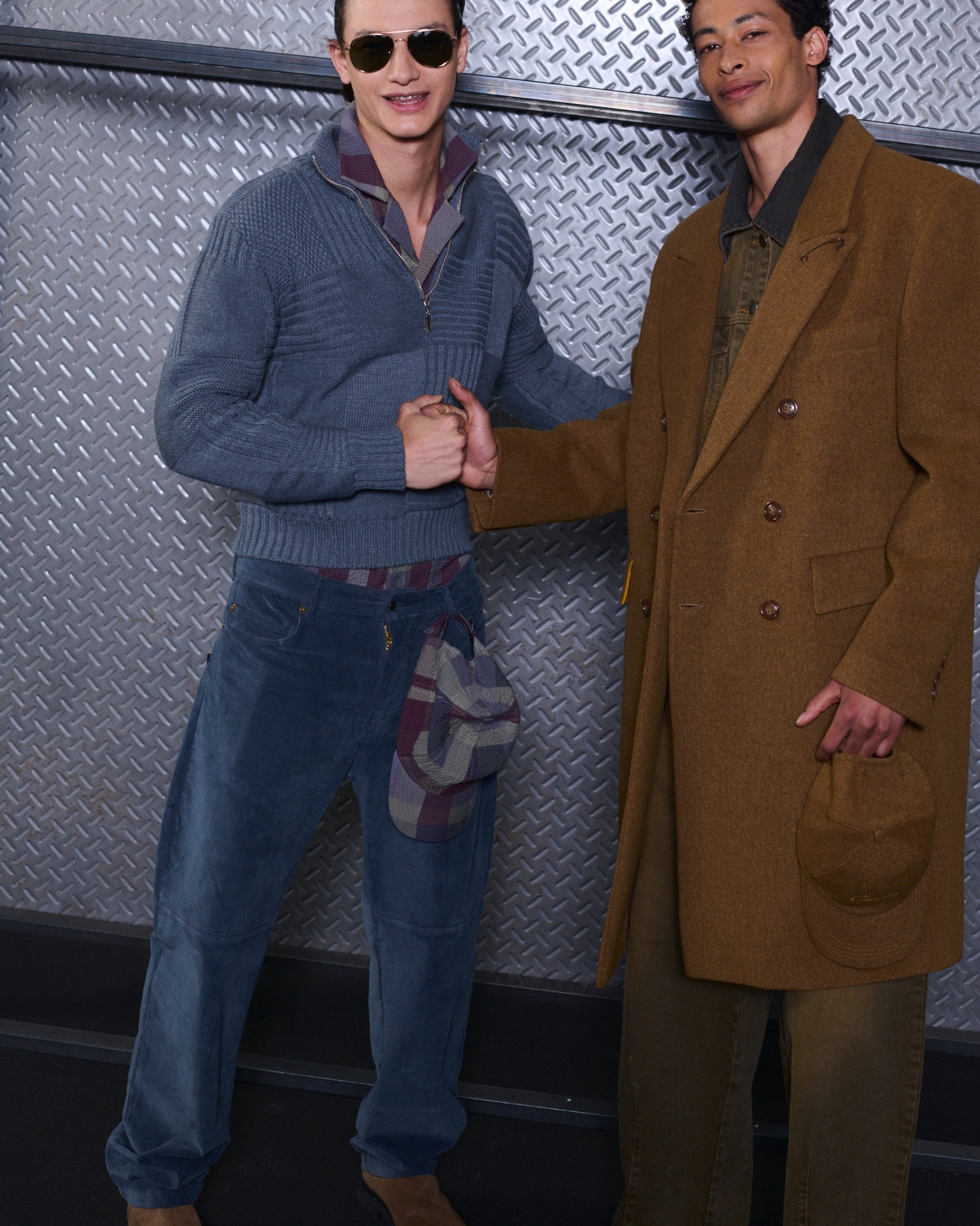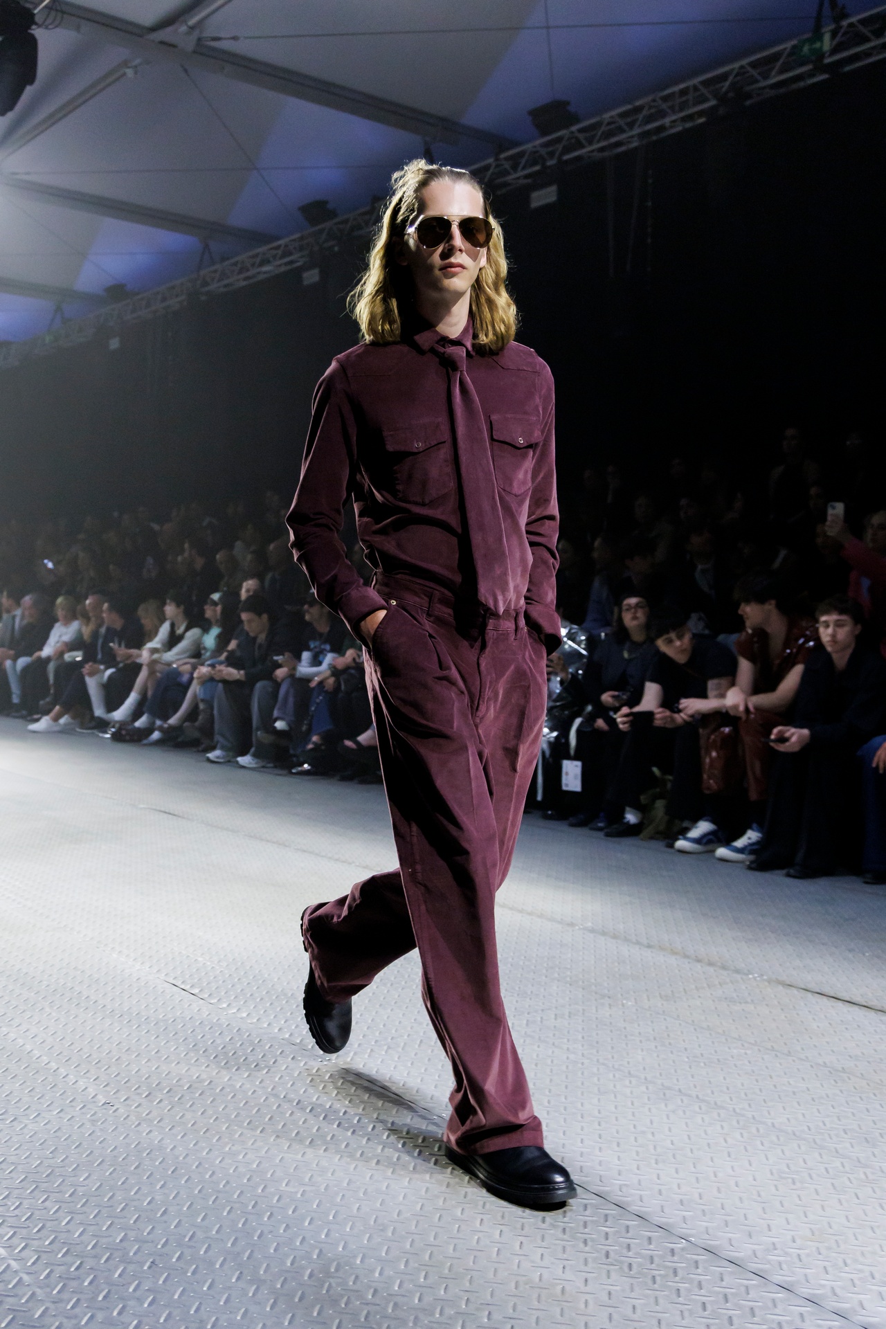 Las siluetas son sólidas y contundentes. El volumen se sostiene con intención. Las prendas de abrigo estructuran la figura, mientras los pantalones caen amplios y con peso. La superposición no es exceso, sino sistema, permitiendo que las piezas se articulen y se adapten. La paleta se mantiene contenida, moviéndose entre marrones, camel, burdeos, marino y gris, priorizando la profundidad y la textura frente al adorno.