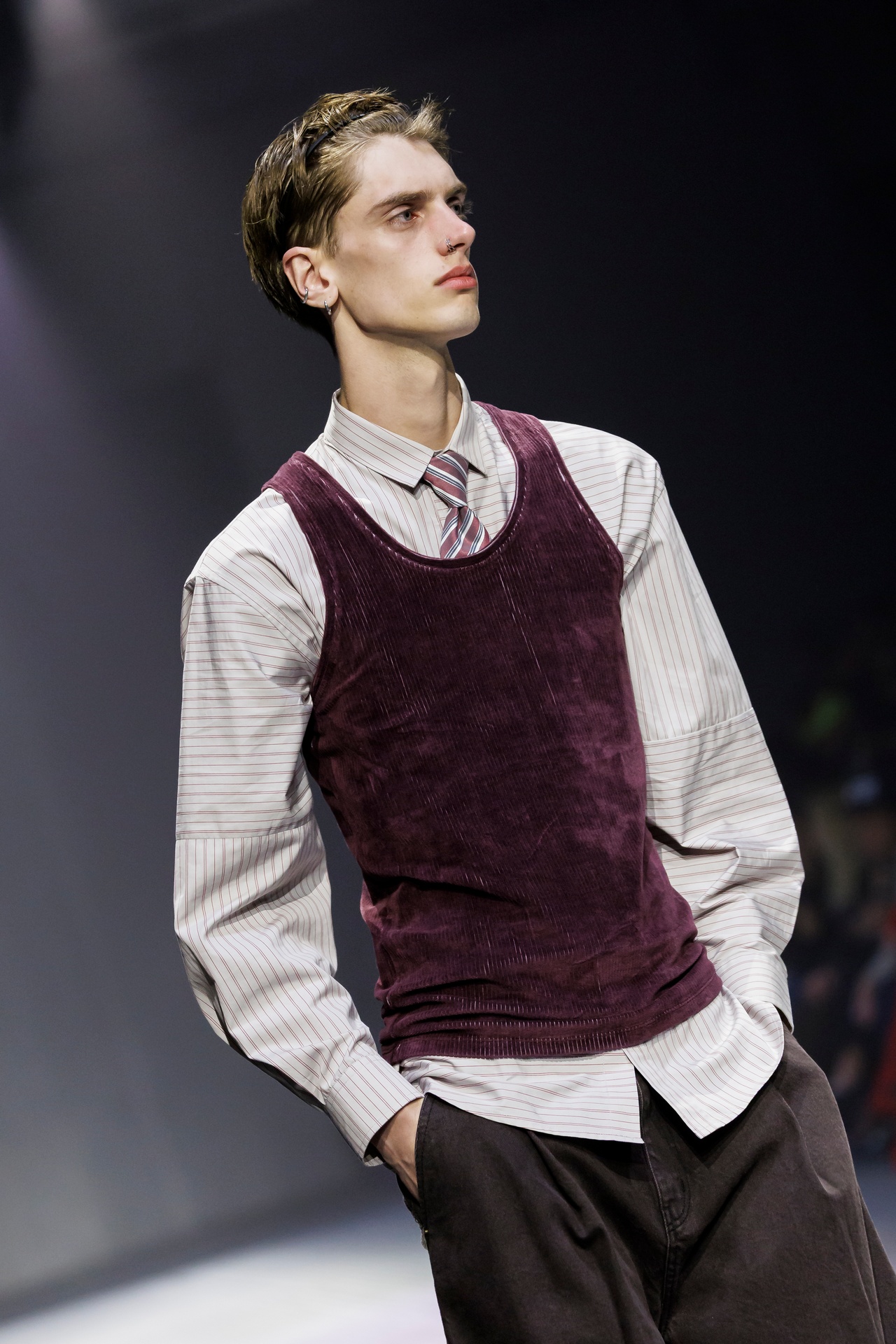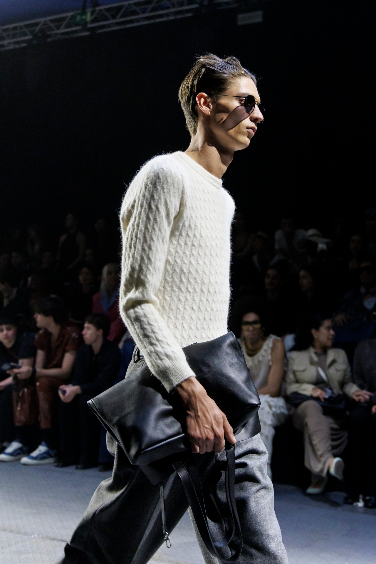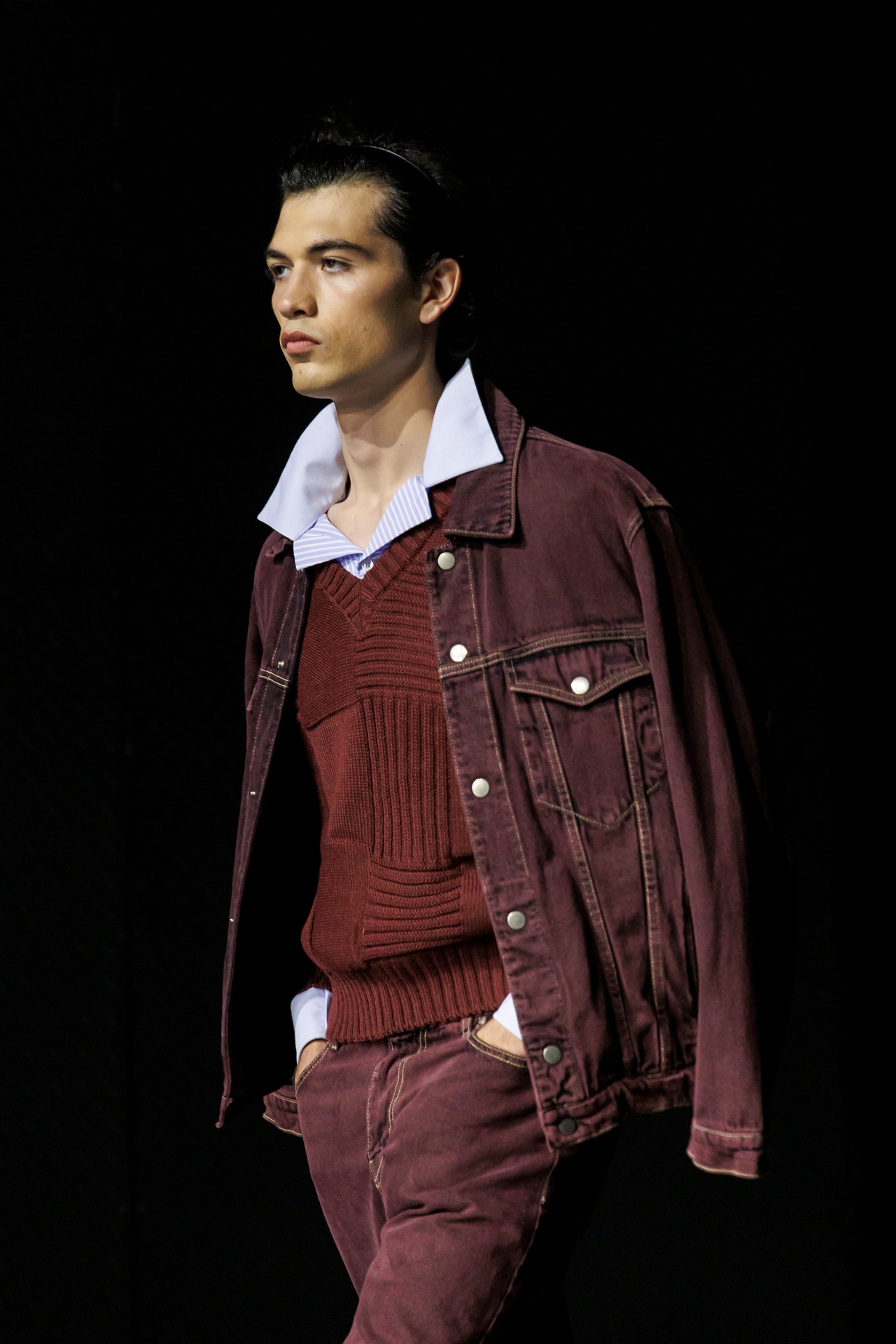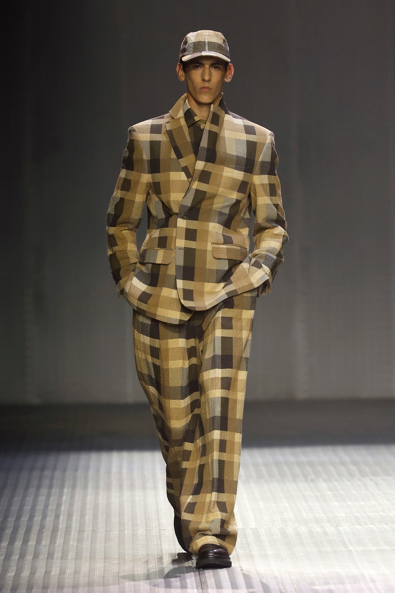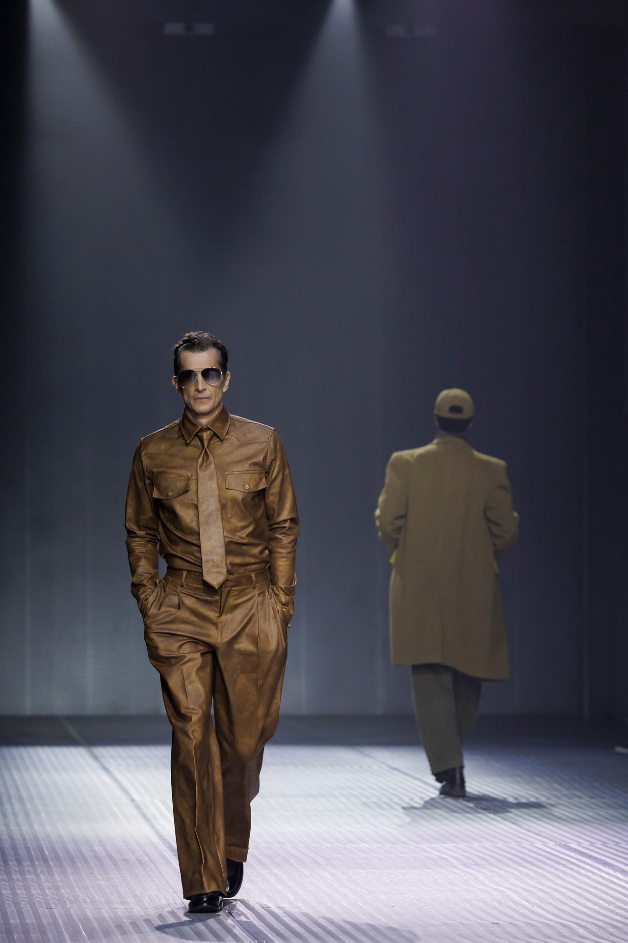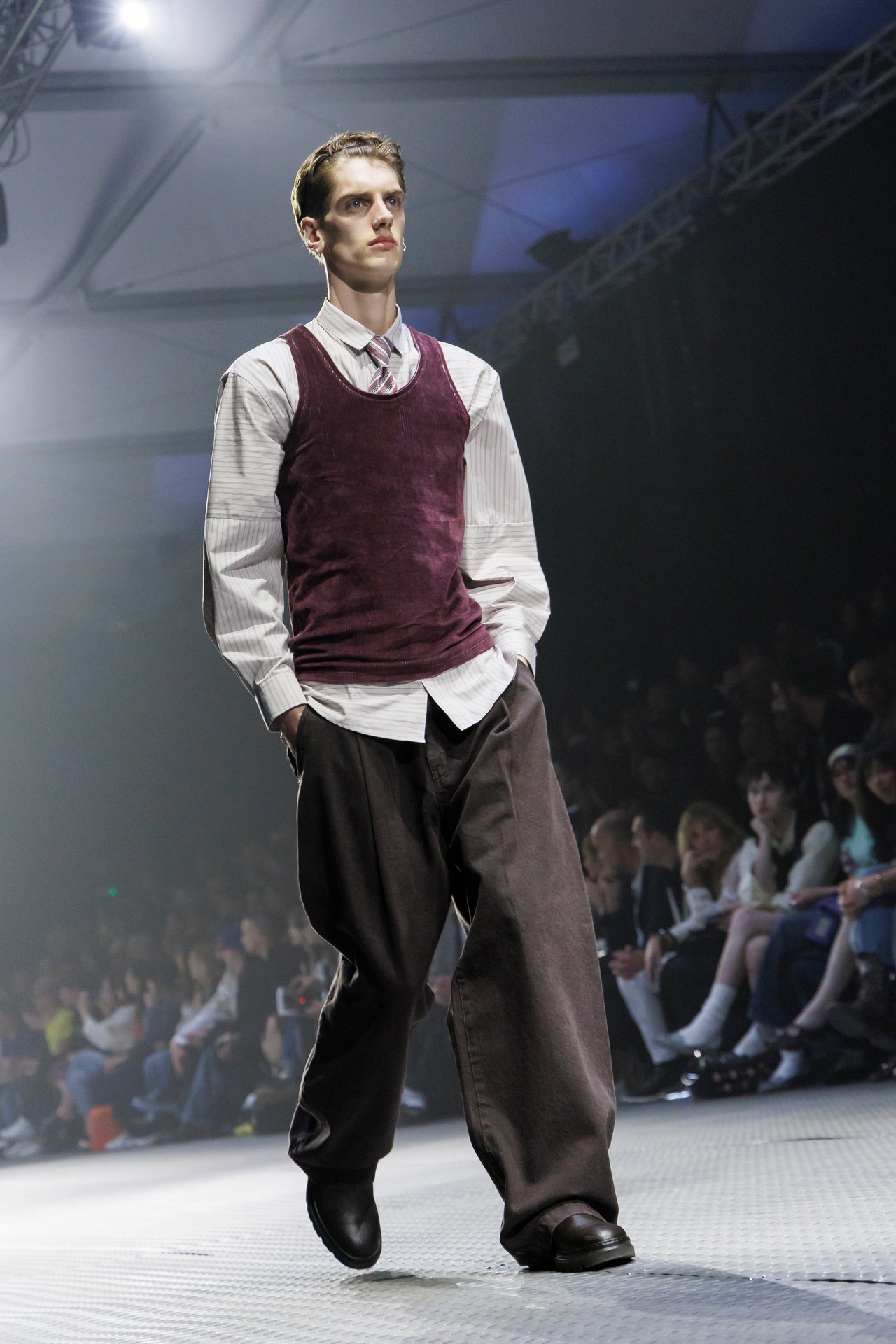 Las siluetas son sólidas y contundentes. El volumen se sostiene con intención. Las prendas de abrigo estructuran la figura, mientras los pantalones caen amplios y con peso. La superposición no es exceso, sino sistema, permitiendo que las piezas se articulen y se adapten. La paleta se mantiene contenida, moviéndose entre marrones, camel, burdeos, marino y gris, priorizando la profundidad y la textura frente al adorno.