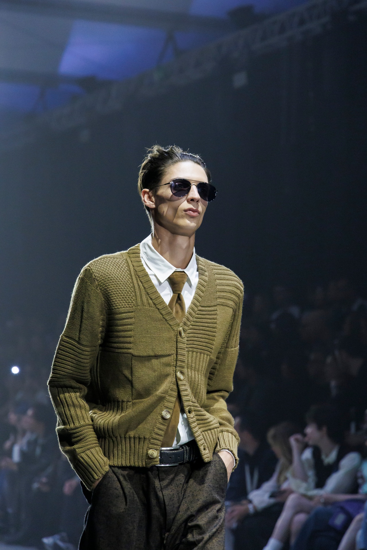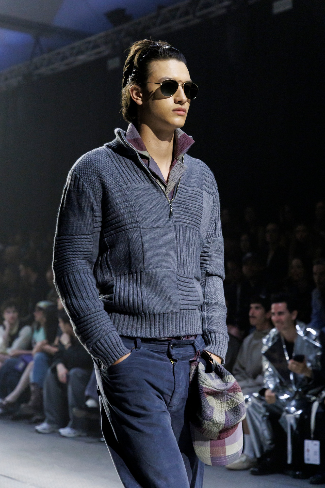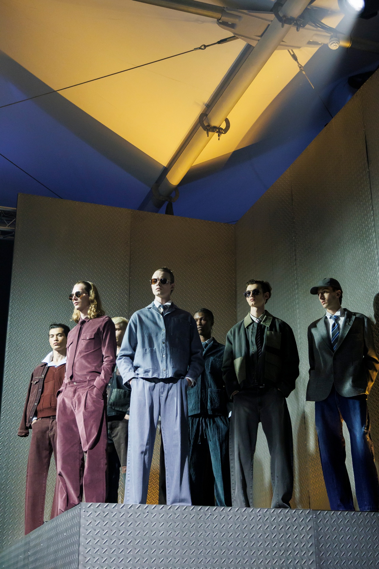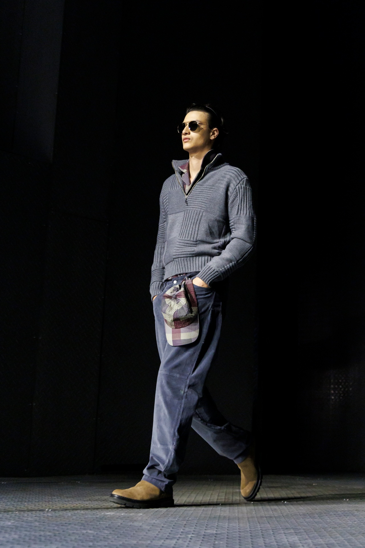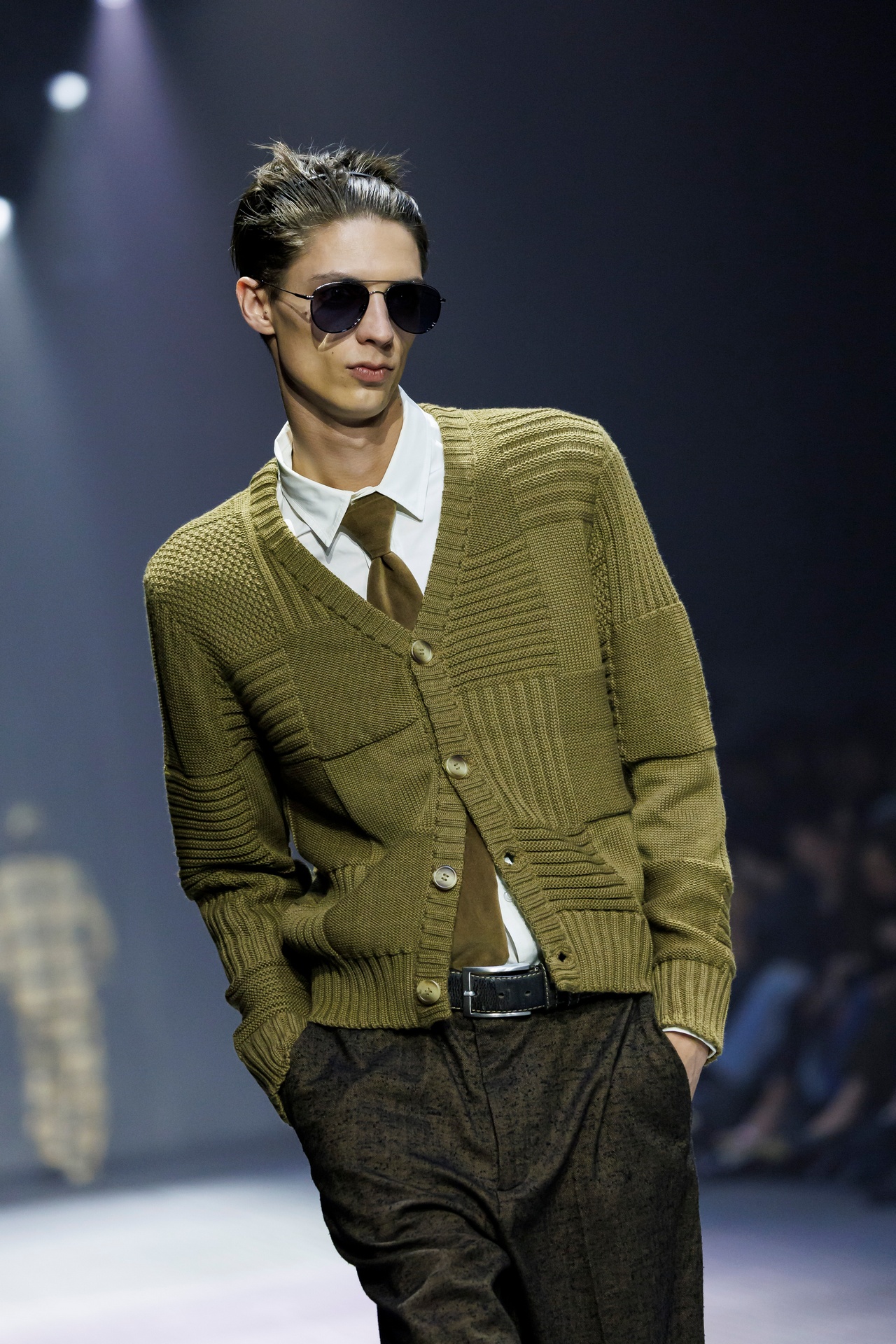 Las siluetas son sólidas y contundentes. El volumen se sostiene con intención. Las prendas de abrigo estructuran la figura, mientras los pantalones caen amplios y con peso. La superposición no es exceso, sino sistema, permitiendo que las piezas se articulen y se adapten. La paleta se mantiene contenida, moviéndose entre marrones, camel, burdeos, marino y gris, priorizando la profundidad y la textura frente al adorno.