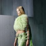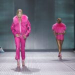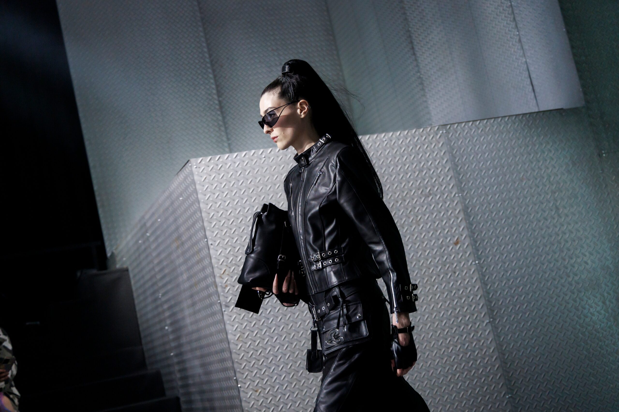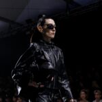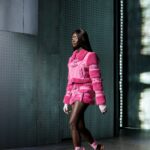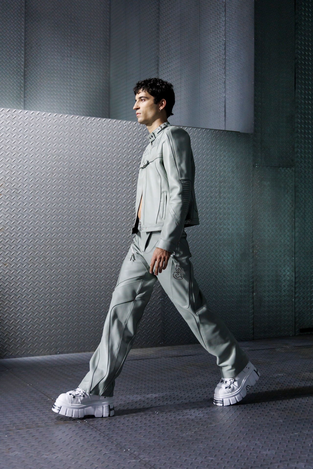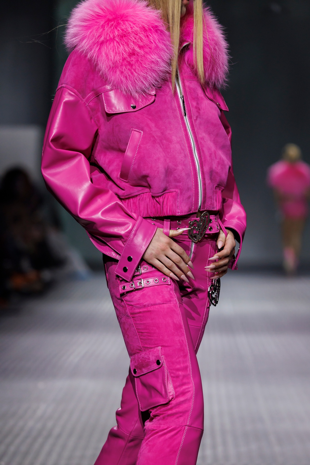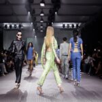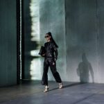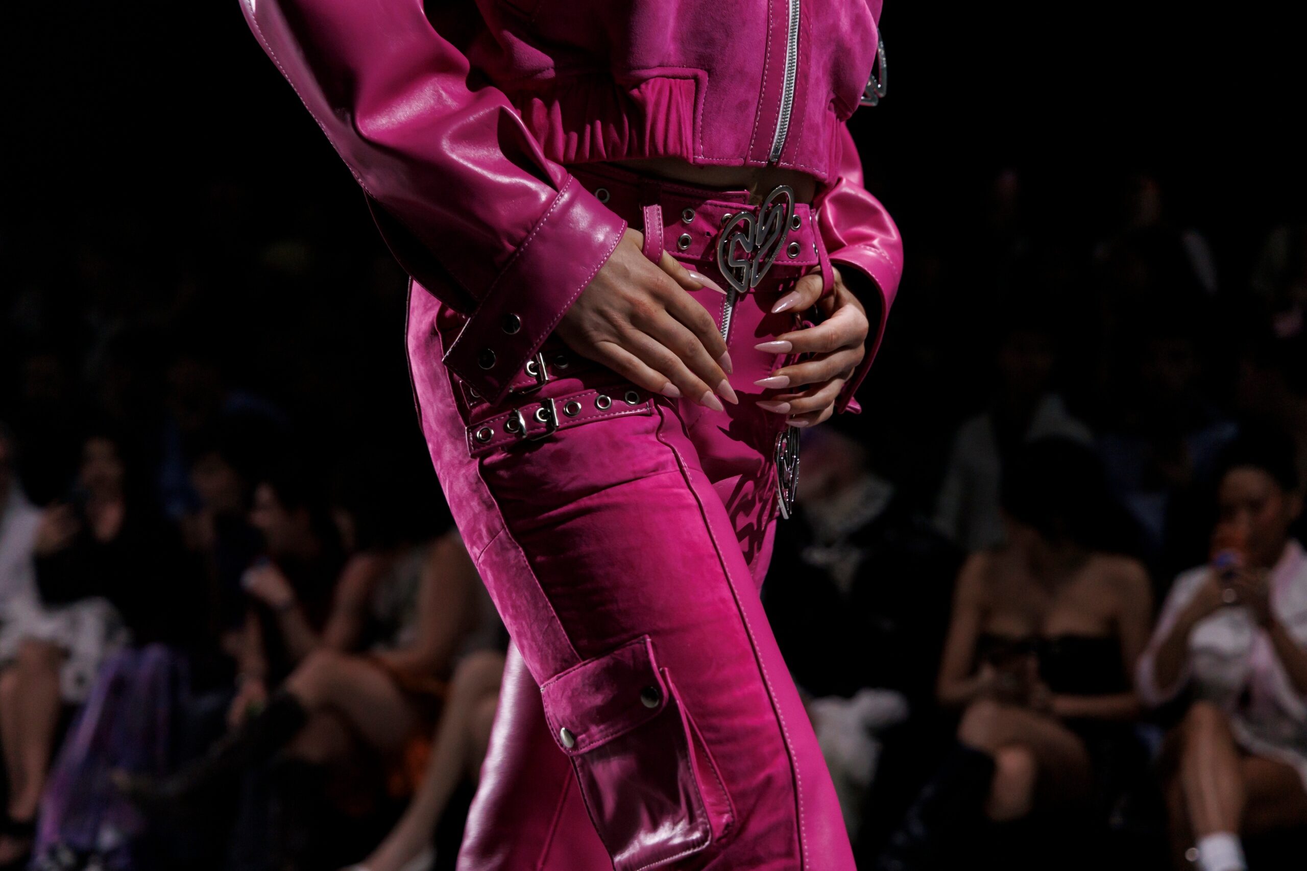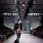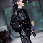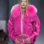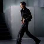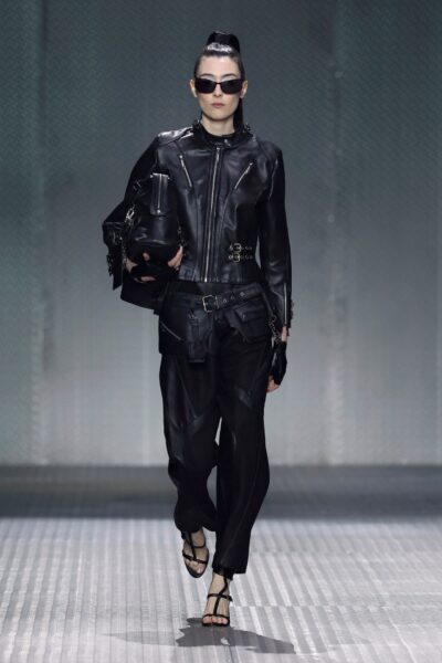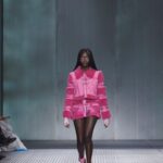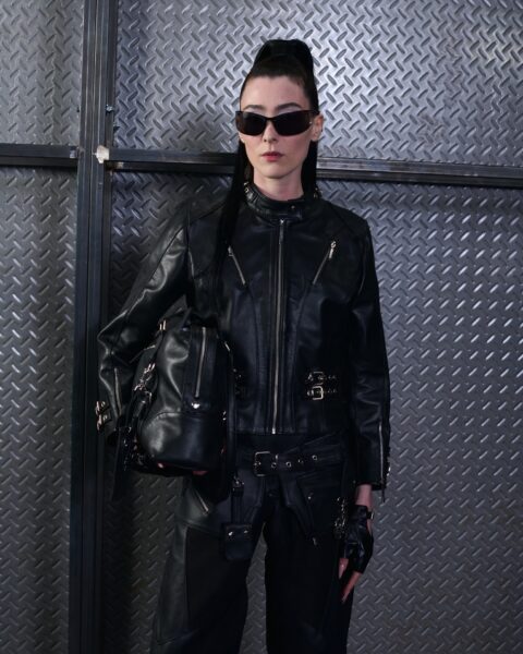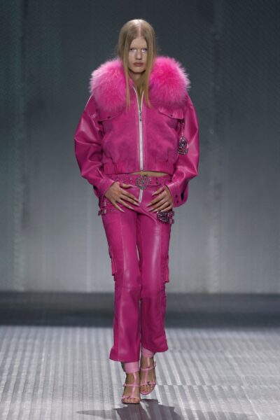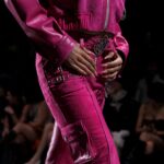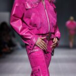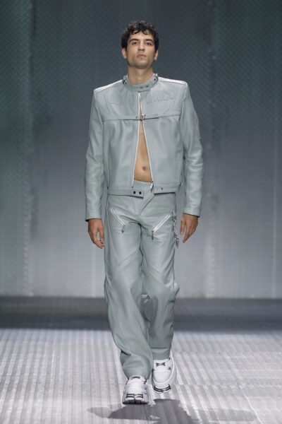 La paleta combina rosa pastel, fucsia lavado, azul desgastado, amarillo mostaza y verde manzana, junto a blanco coco y un morado tecnológico. Estas tonalidades se traducen en abrigos doble faz, cuero de líneas limpias, denim texturizado y la revisión del icónico traje moto, manteniendo una estética monocroma pero atrevida.