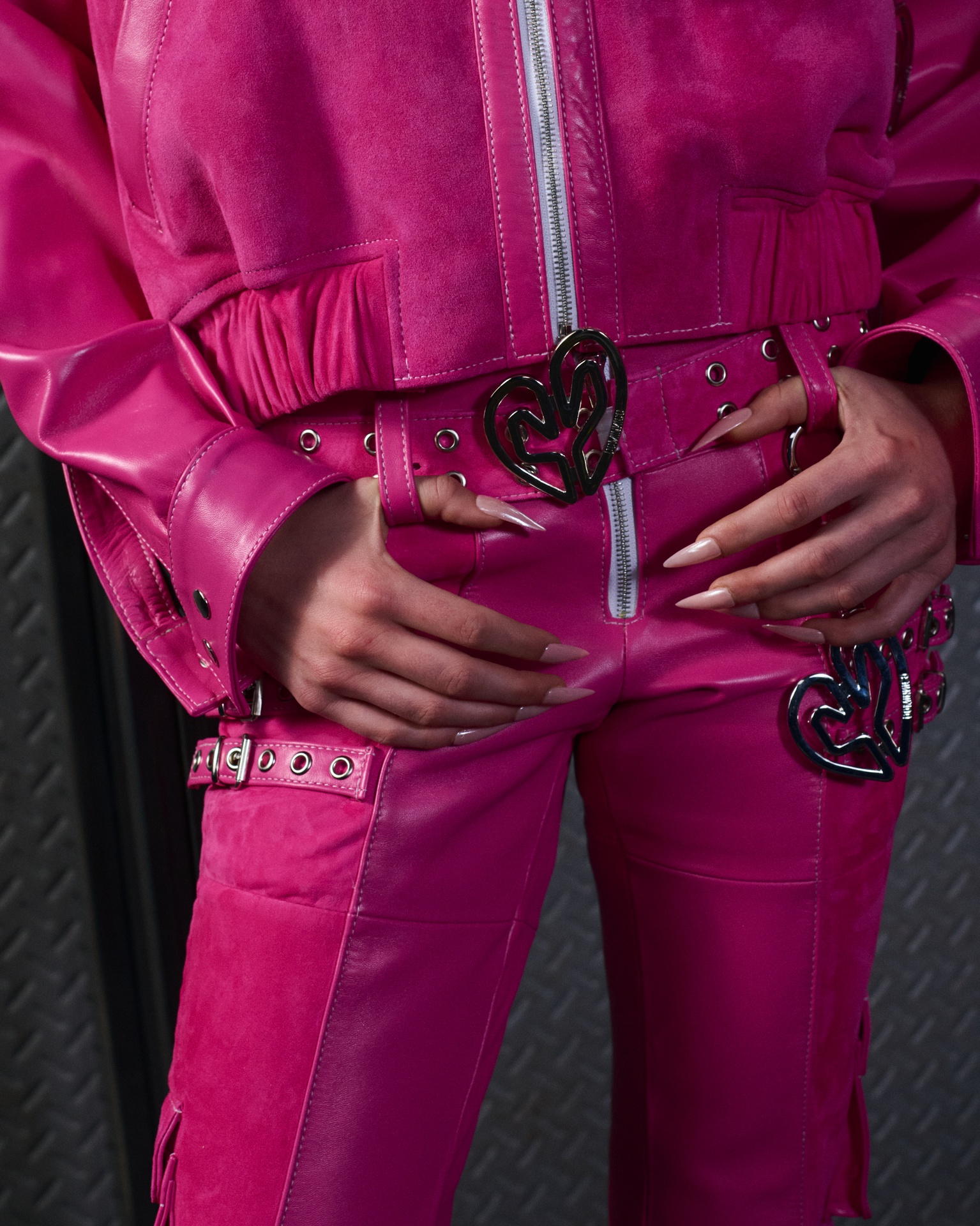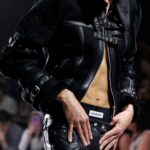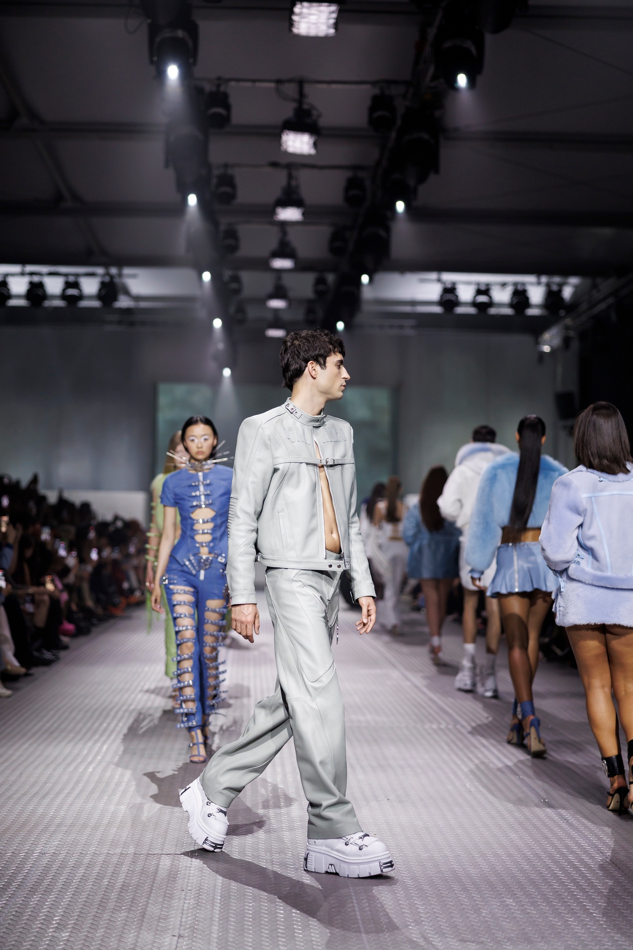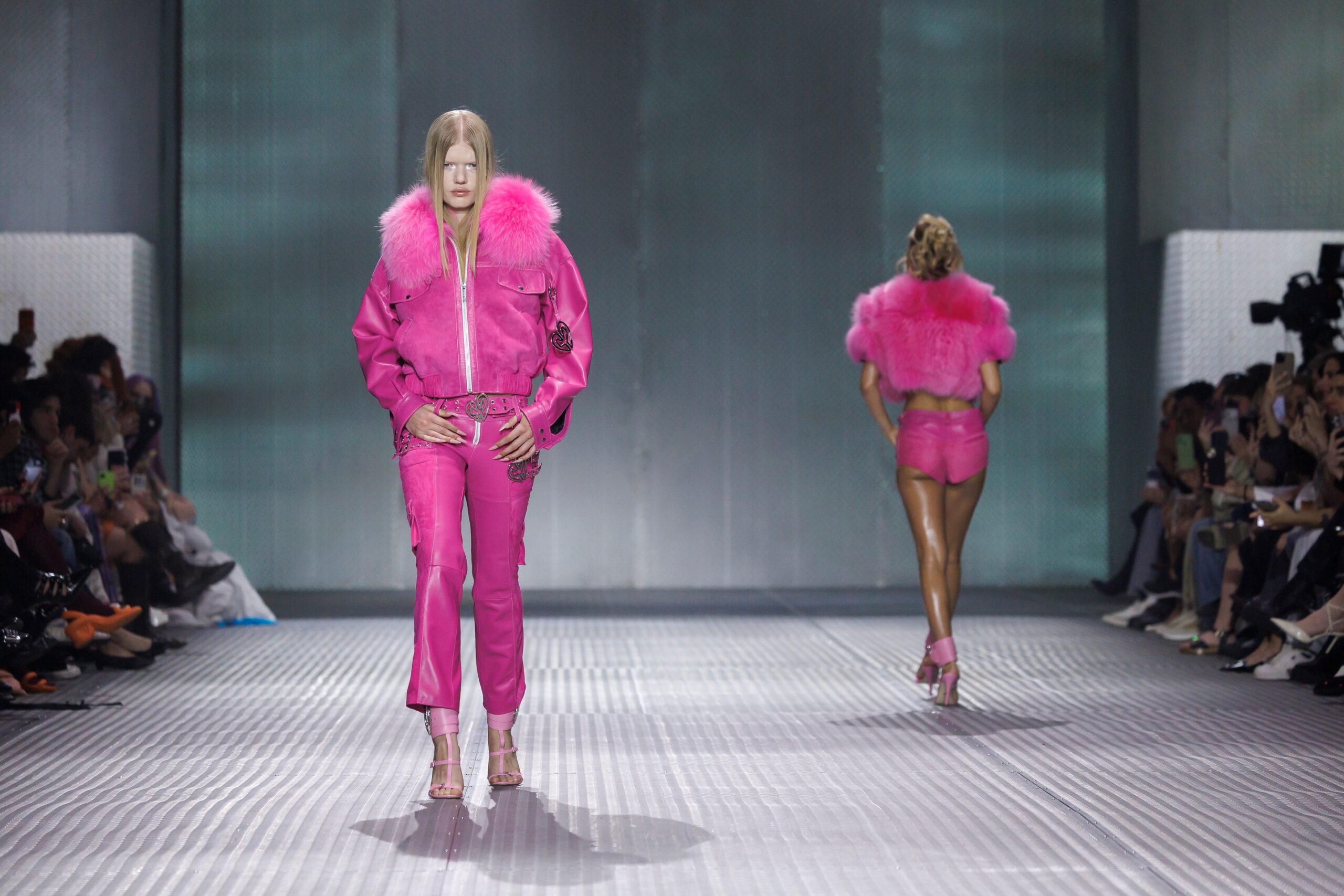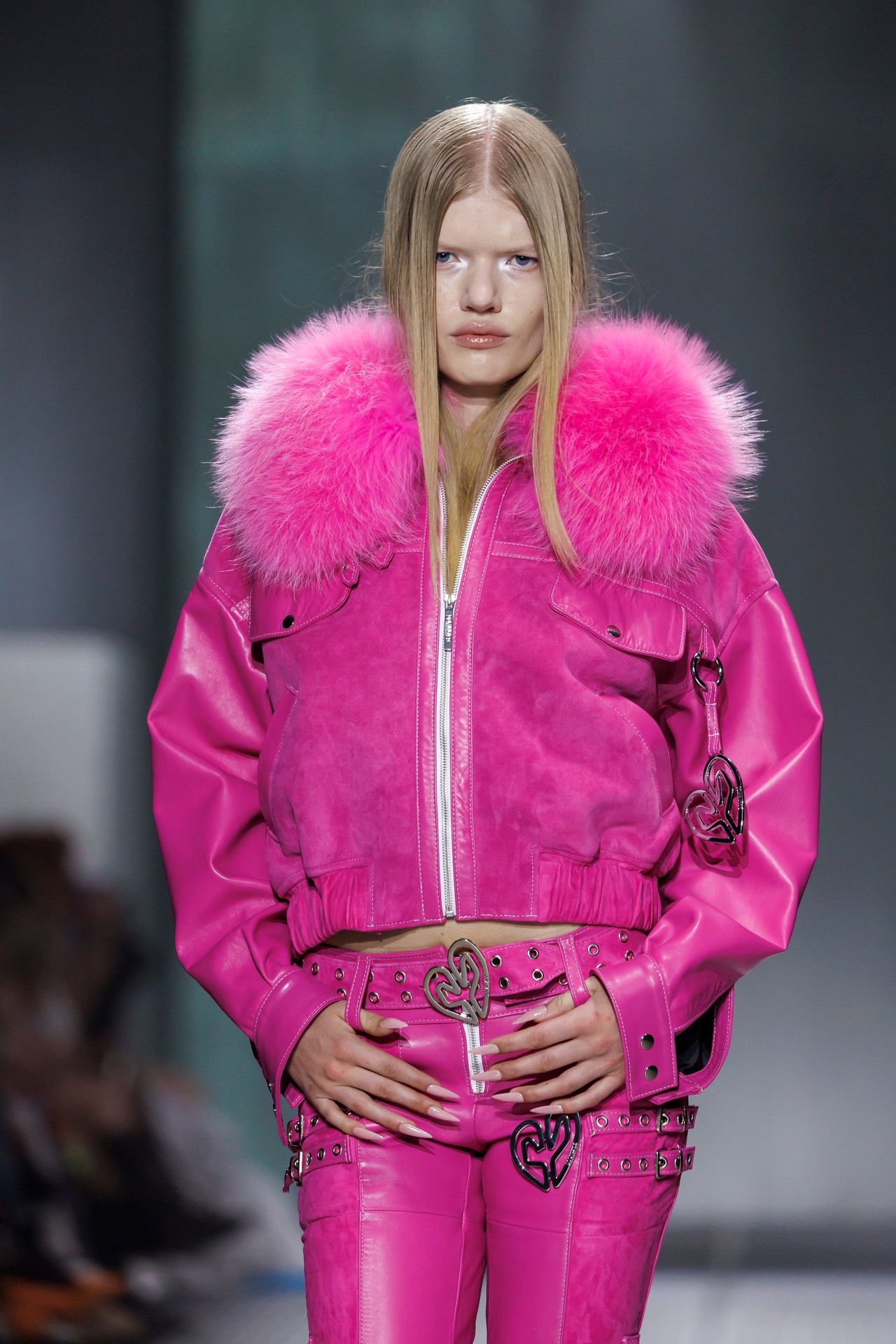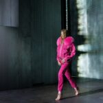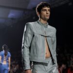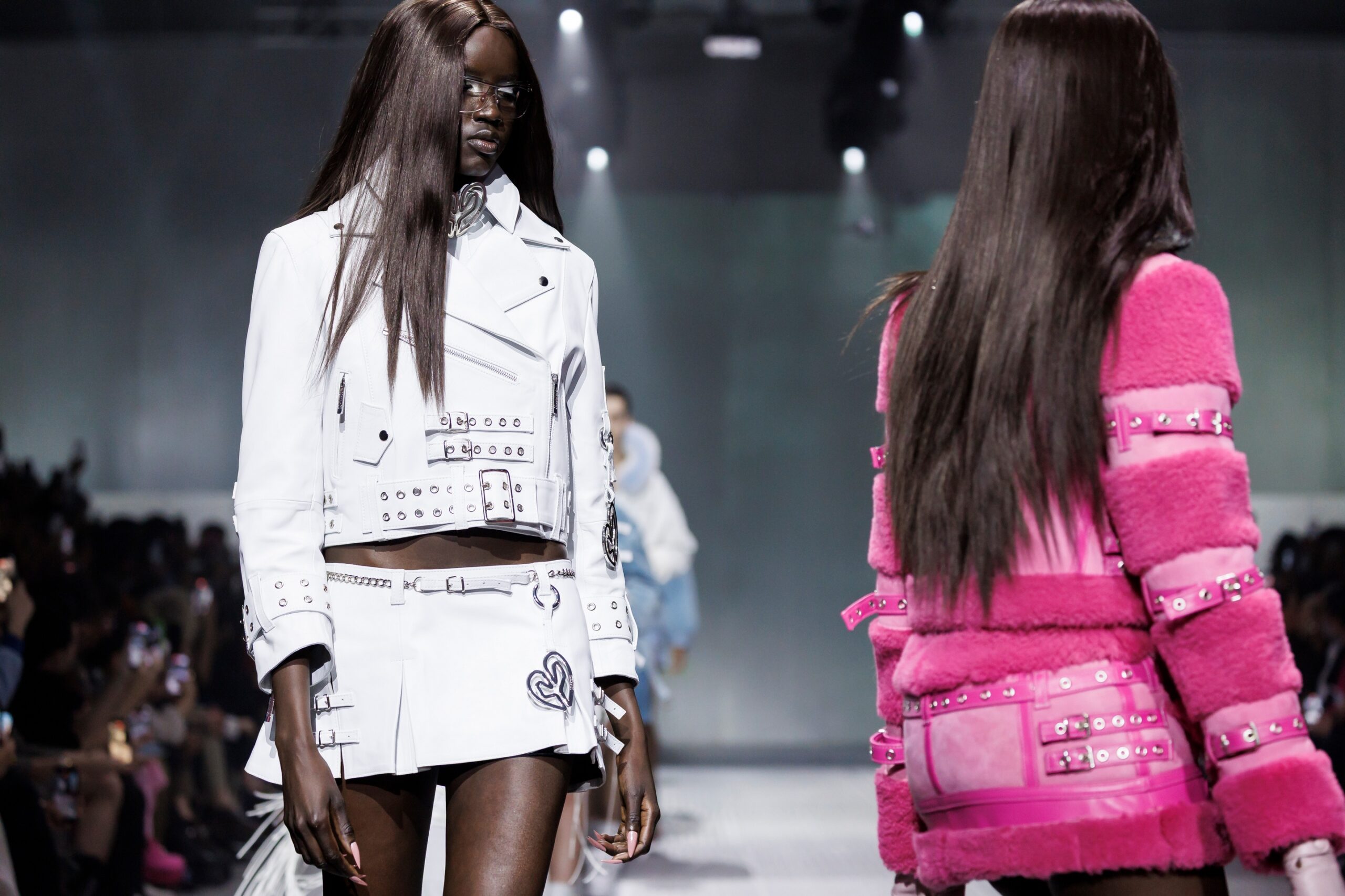 La paleta combina rosa pastel, fucsia lavado, azul desgastado, amarillo mostaza y verde manzana, junto a blanco coco y un morado tecnológico. Estas tonalidades se traducen en abrigos doble faz, cuero de líneas limpias, denim texturizado y la revisión del icónico traje moto, manteniendo una estética monocroma pero atrevida.