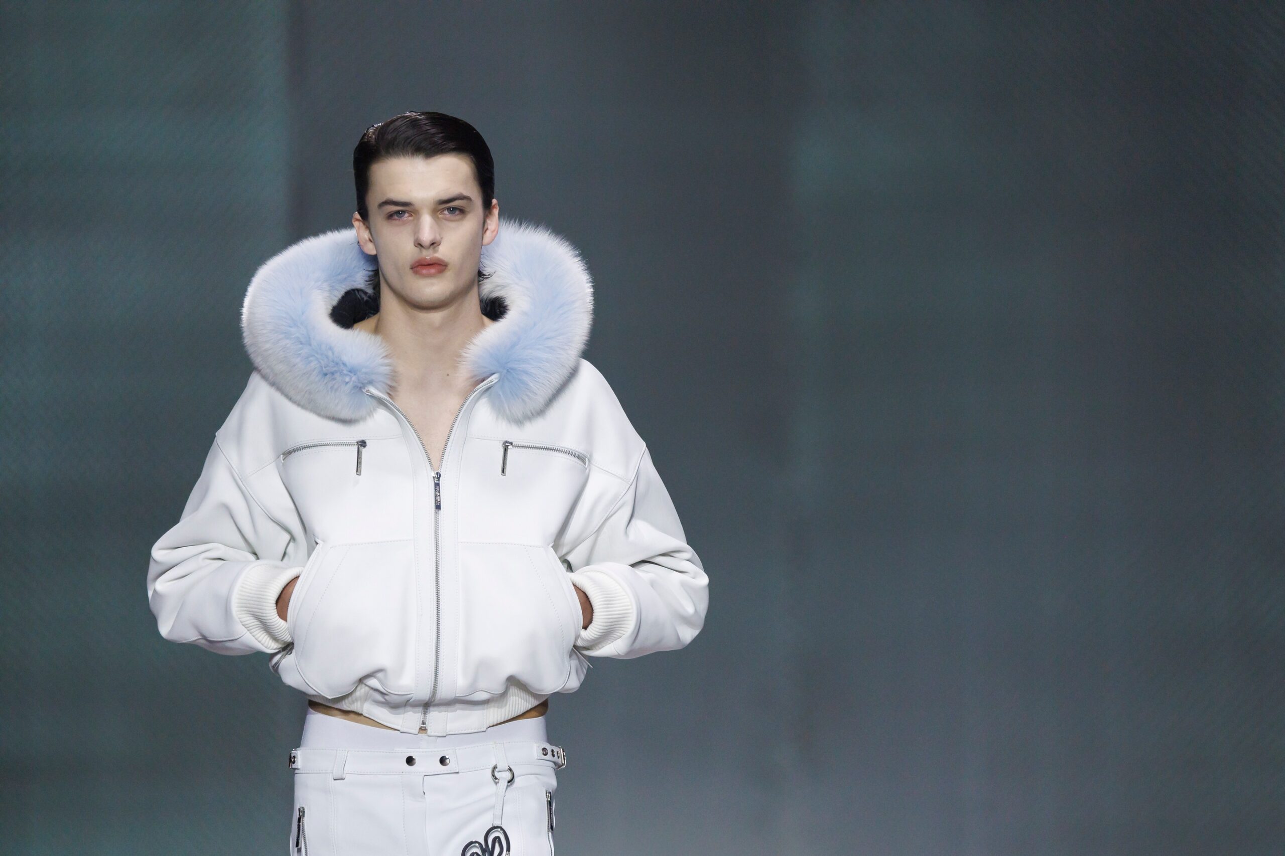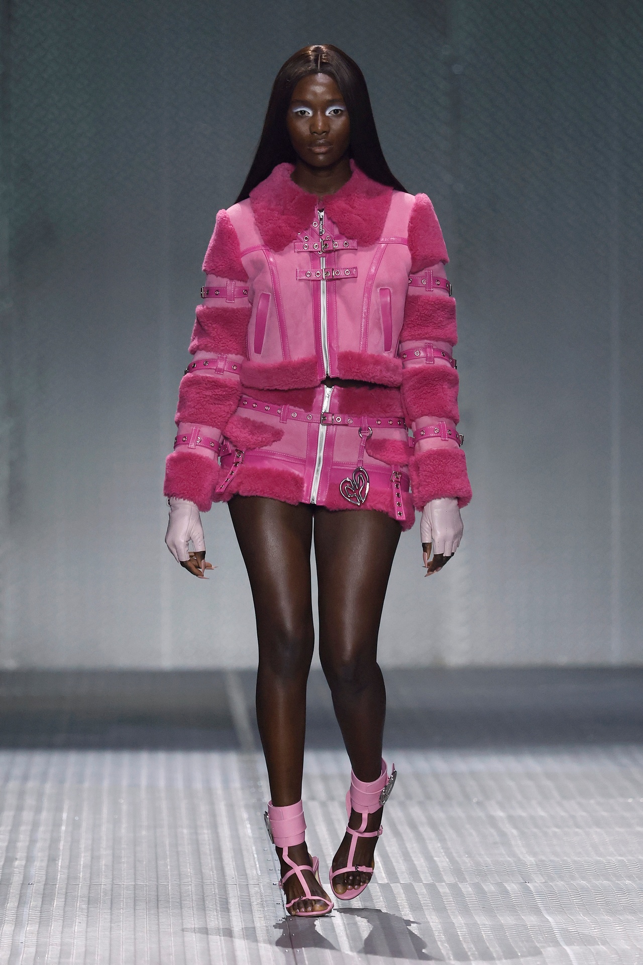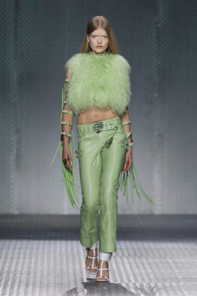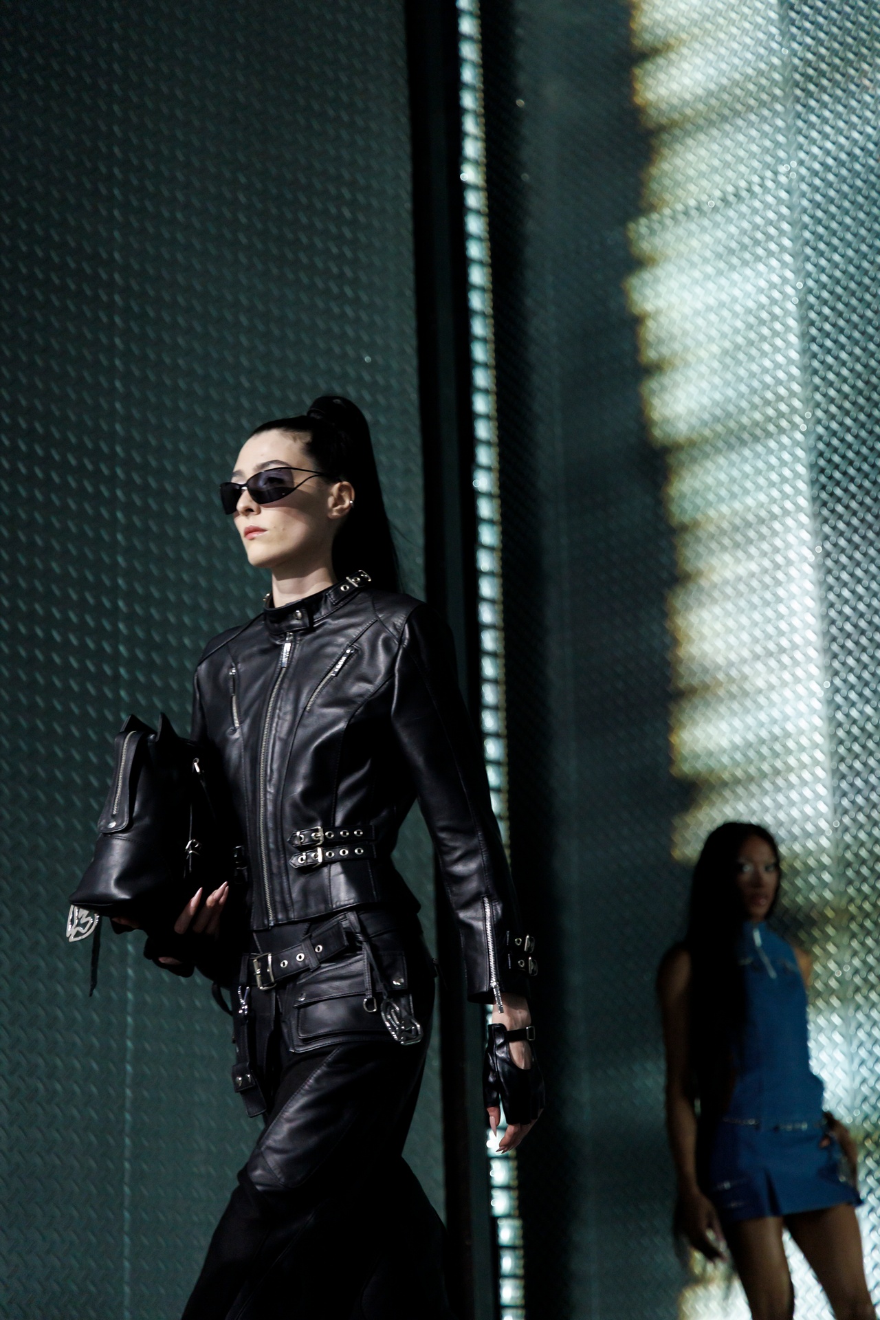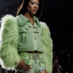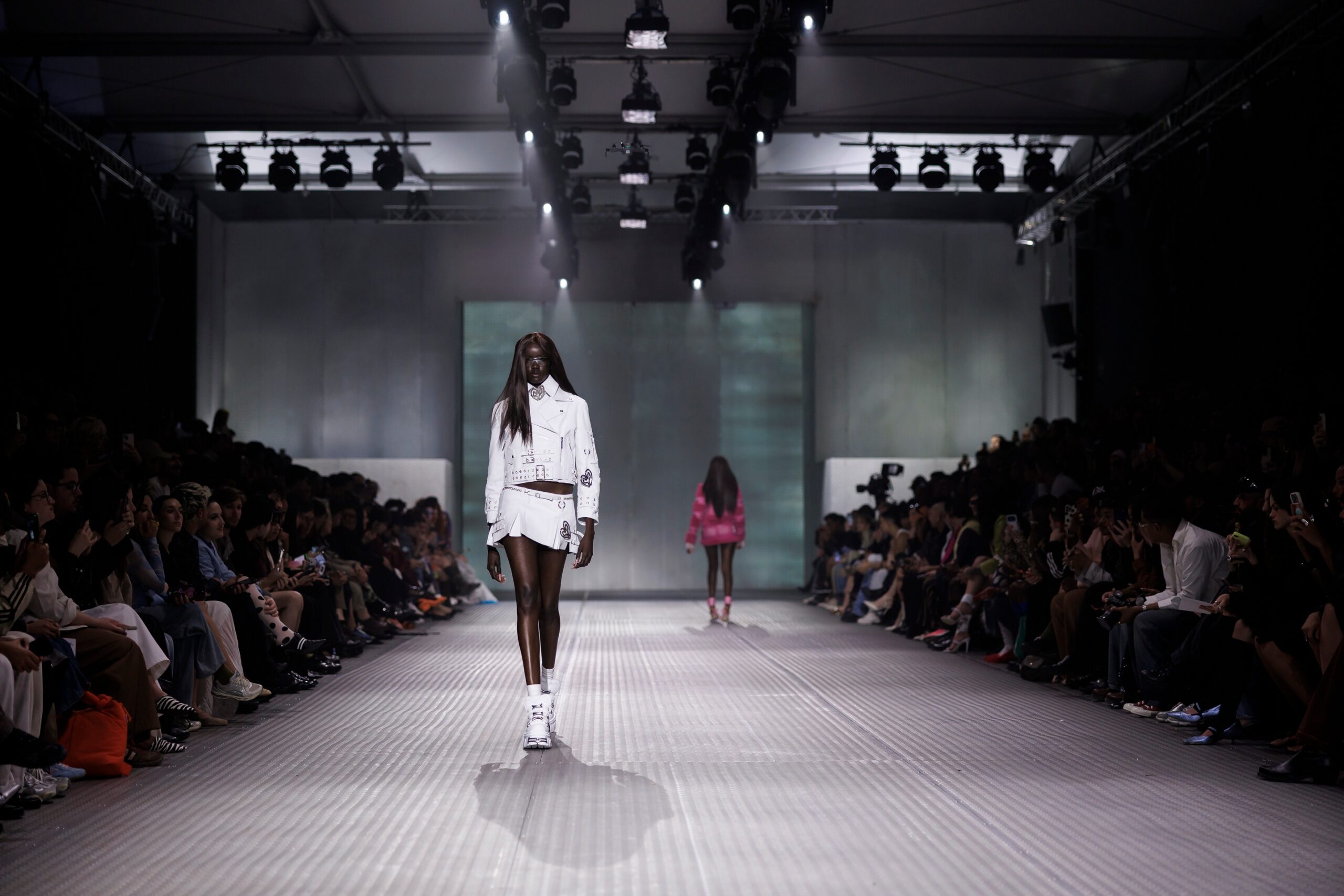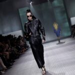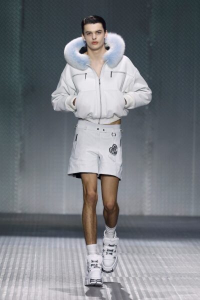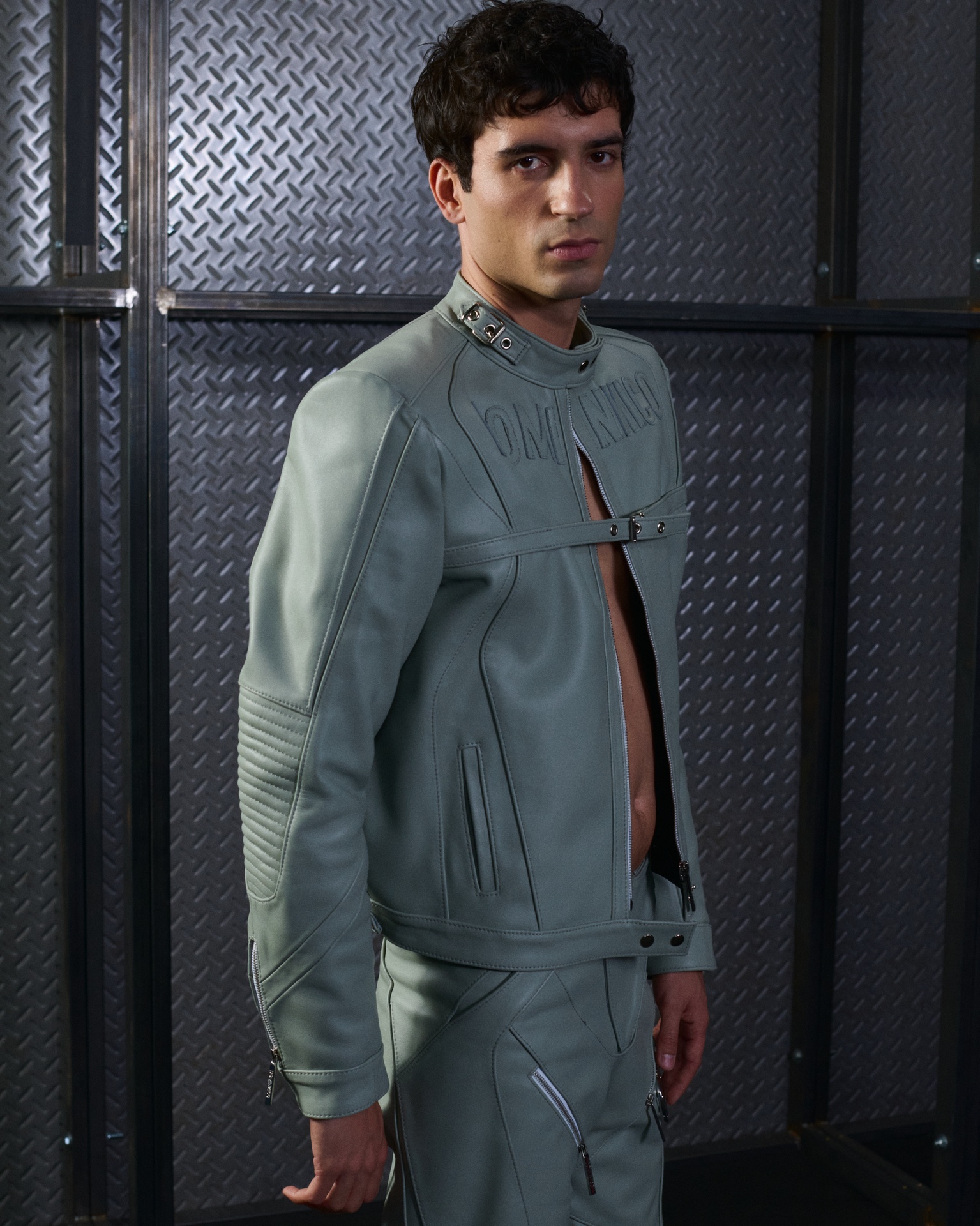 La paleta combina rosa pastel, fucsia lavado, azul desgastado, amarillo mostaza y verde manzana, junto a blanco coco y un morado tecnológico. Estas tonalidades se traducen en abrigos doble faz, cuero de líneas limpias, denim texturizado y la revisión del icónico traje moto, manteniendo una estética monocroma pero atrevida.