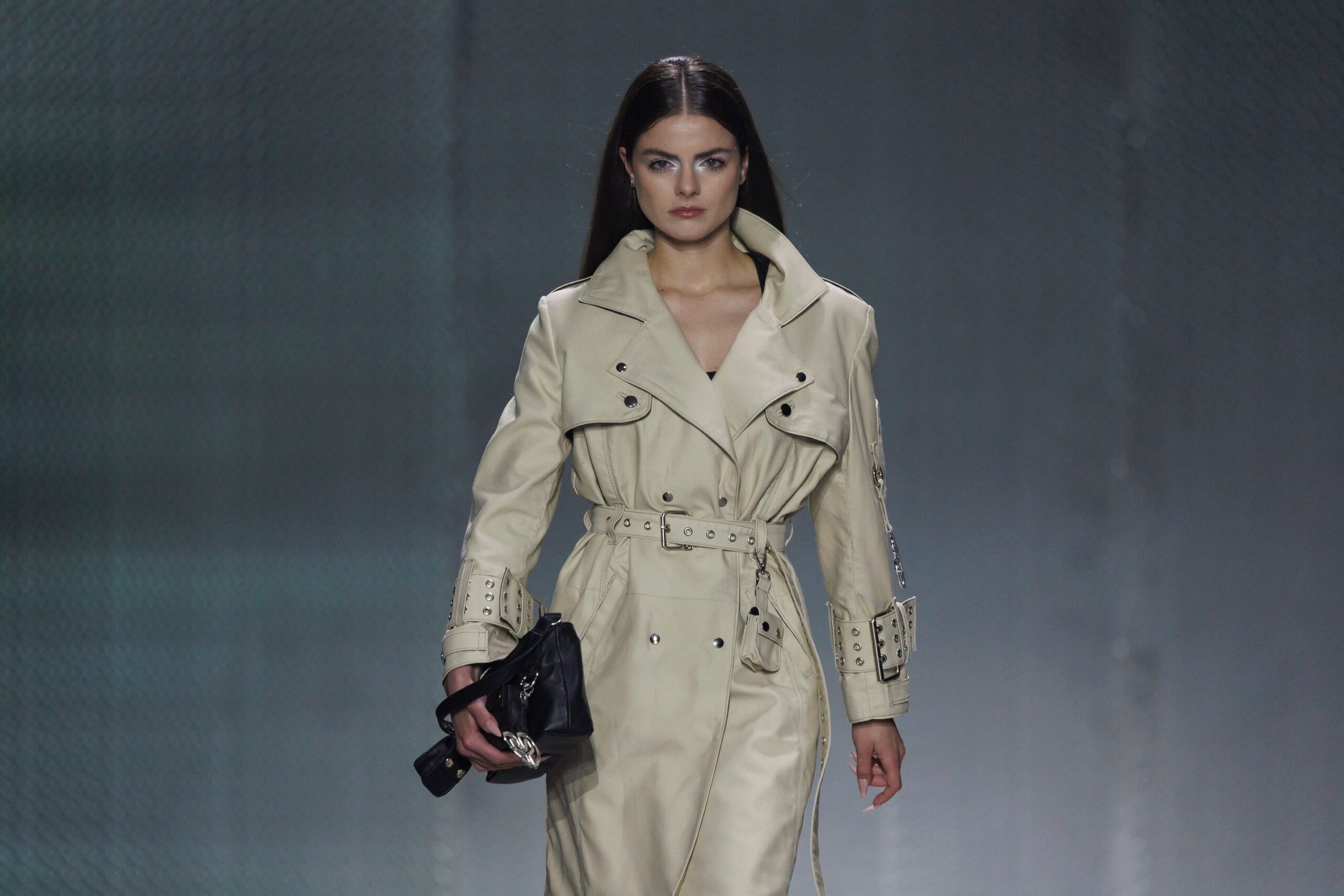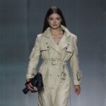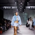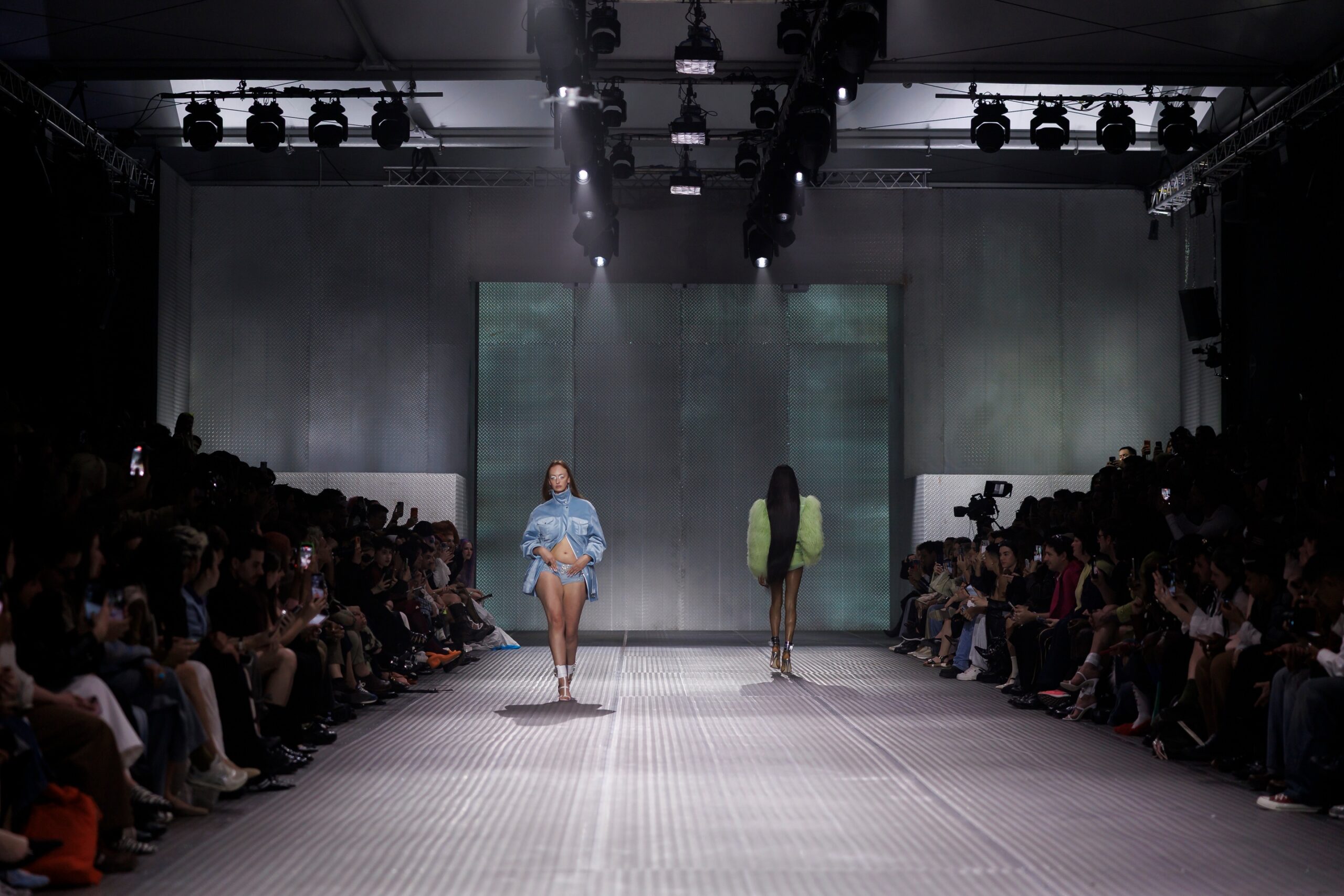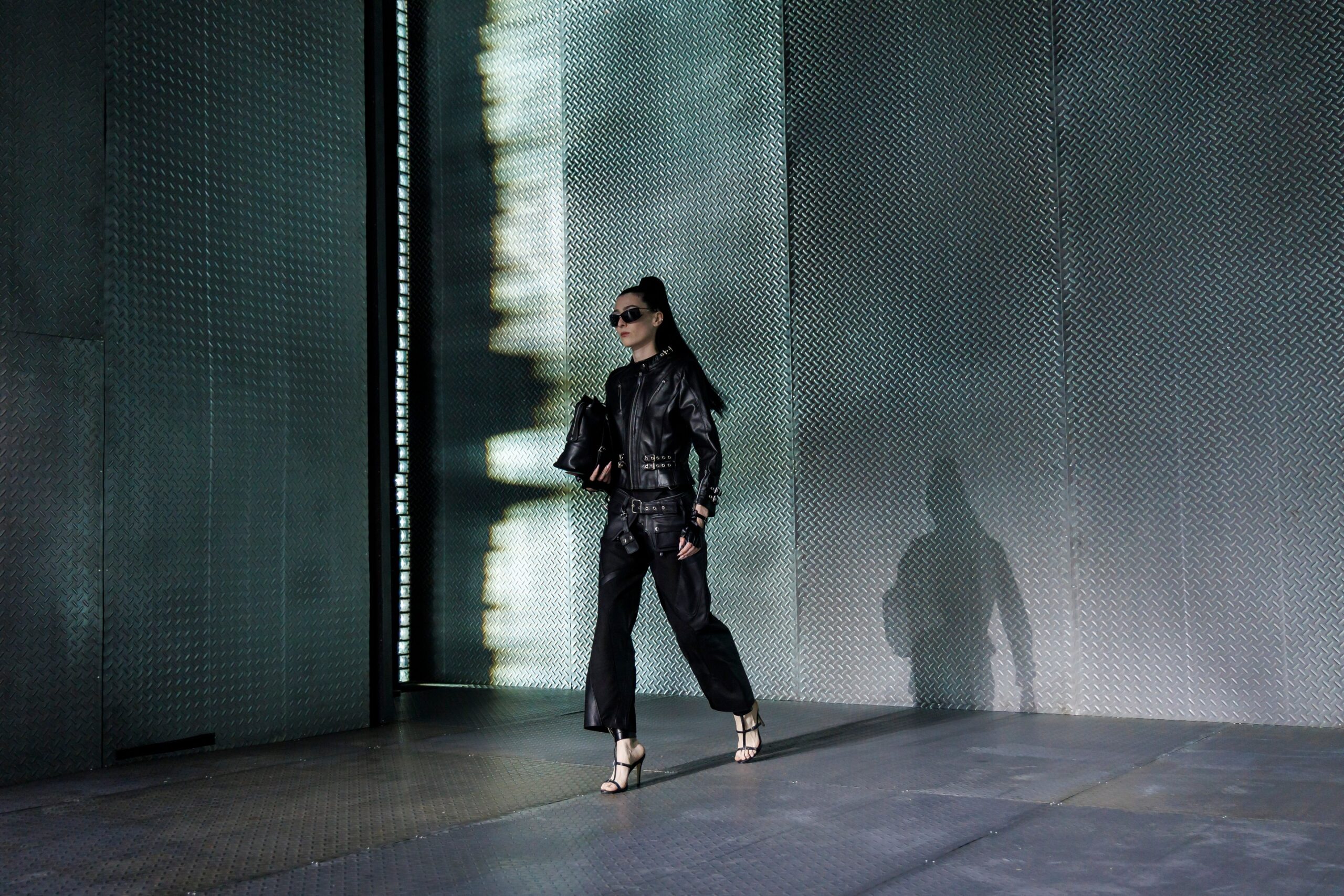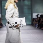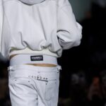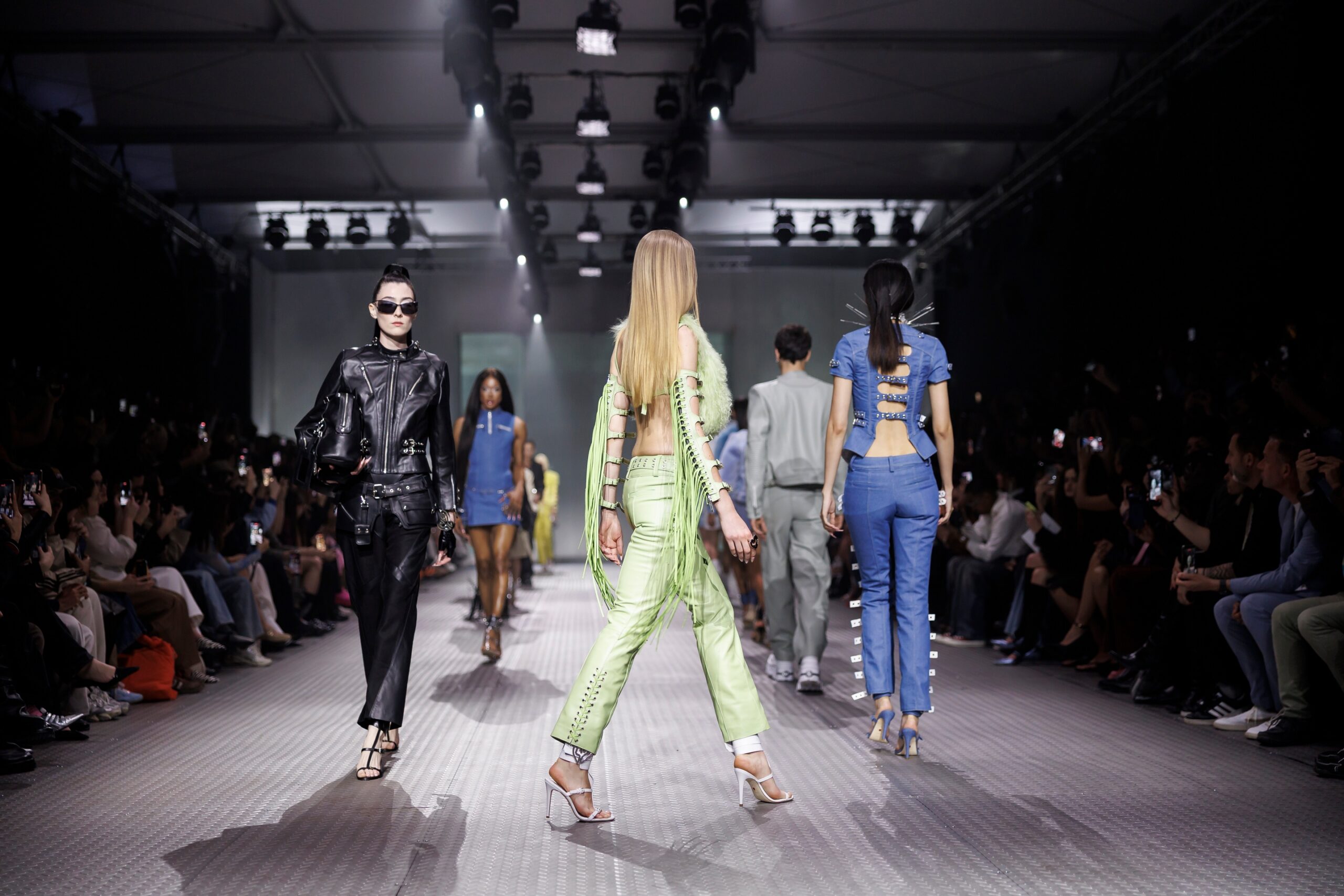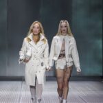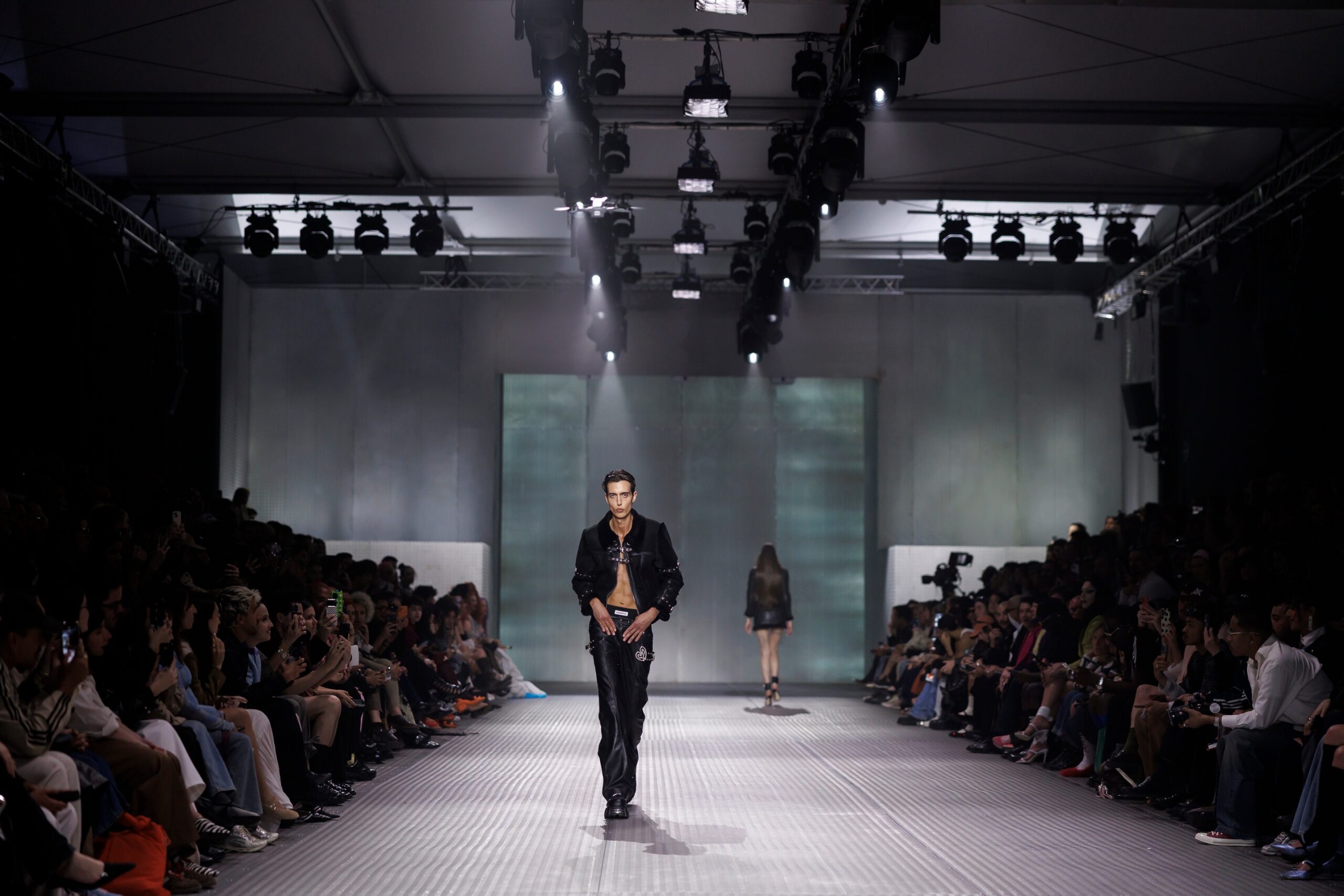 La paleta combina rosa pastel, fucsia lavado, azul desgastado, amarillo mostaza y verde manzana, junto a blanco coco y un morado tecnológico. Estas tonalidades se traducen en abrigos doble faz, cuero de líneas limpias, denim texturizado y la revisión del icónico traje moto, manteniendo una estética monocroma pero atrevida.