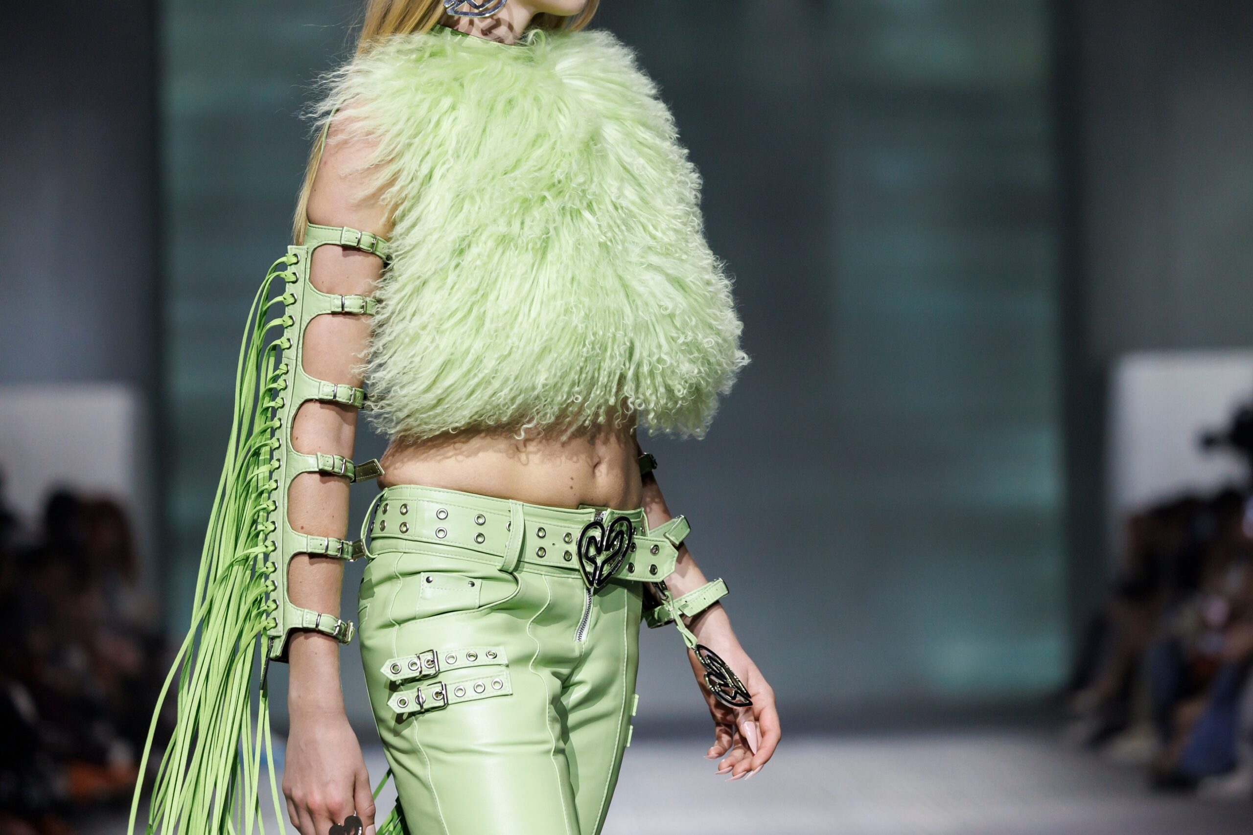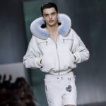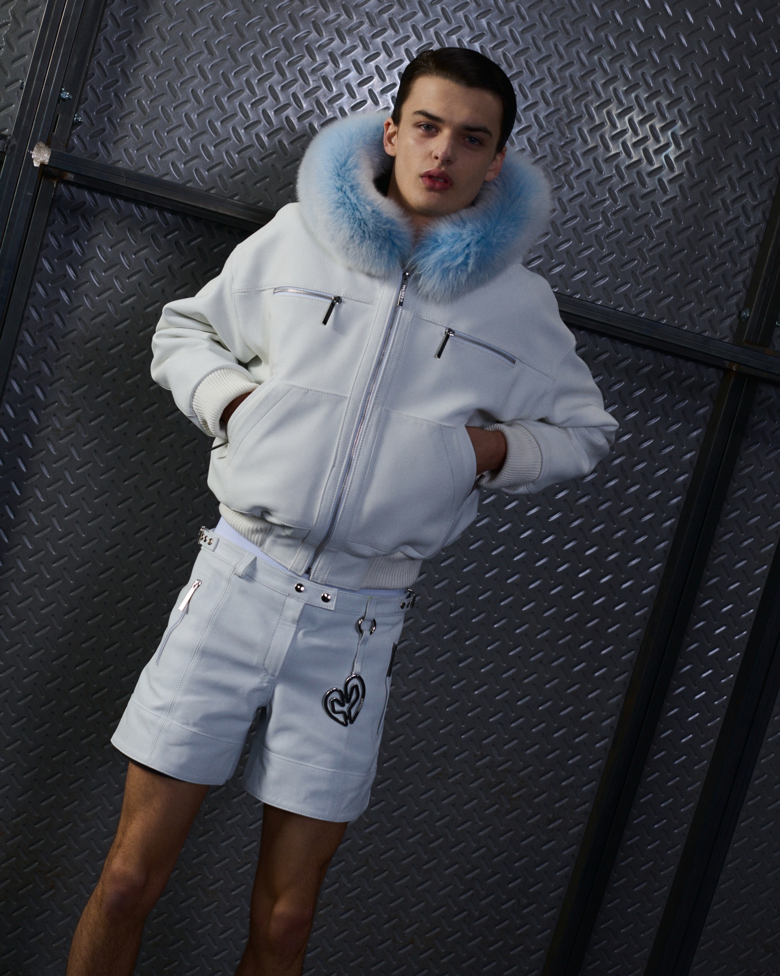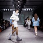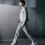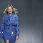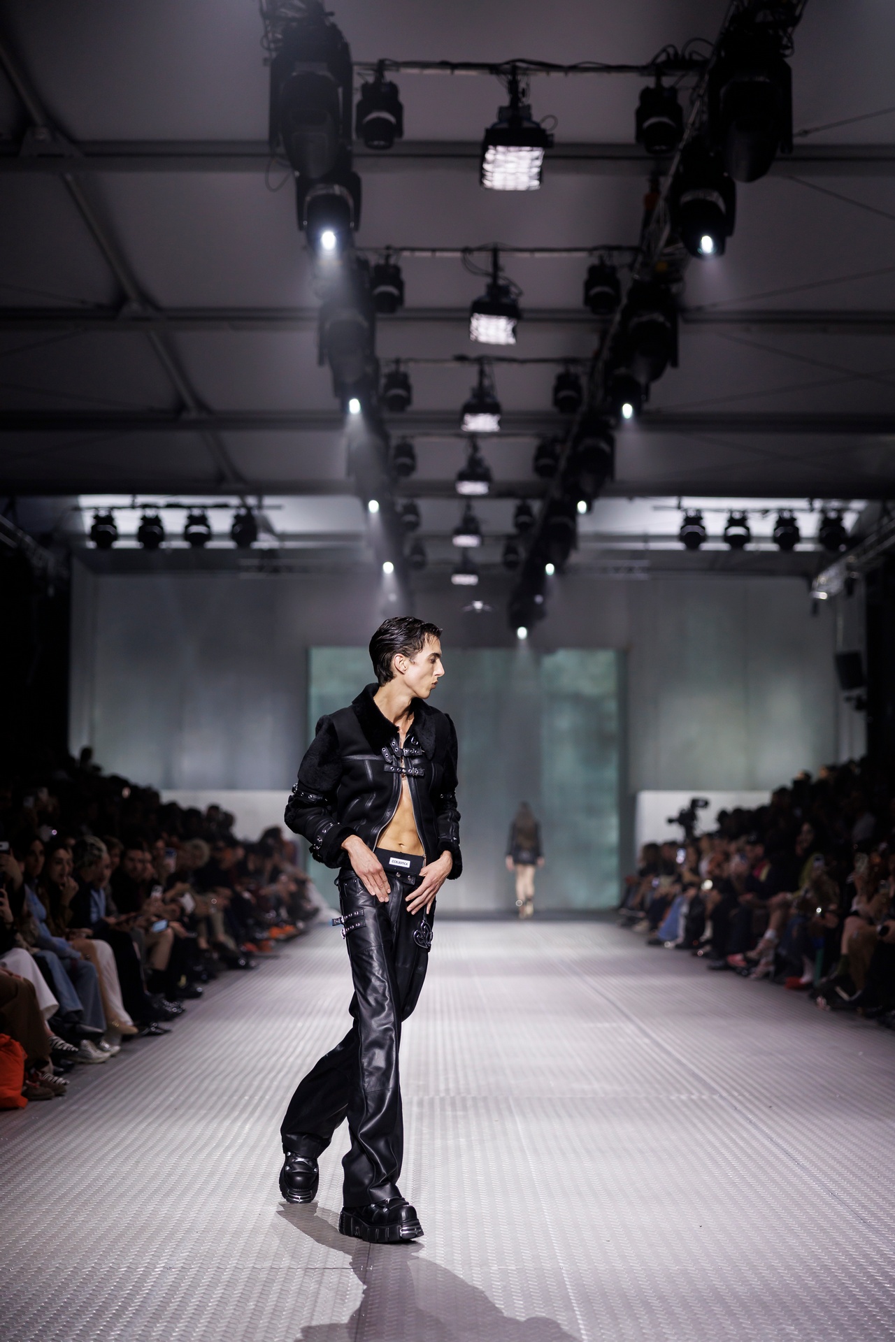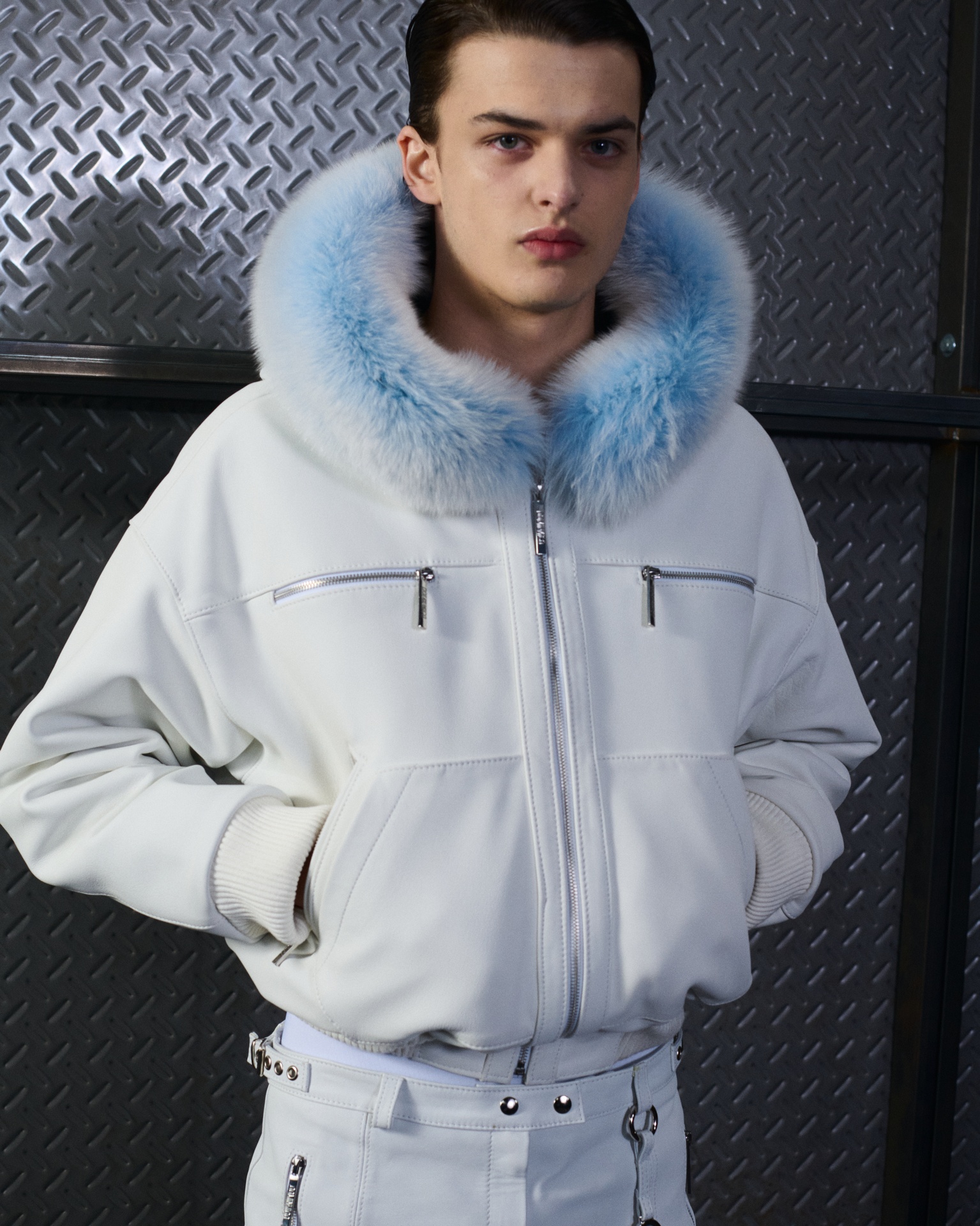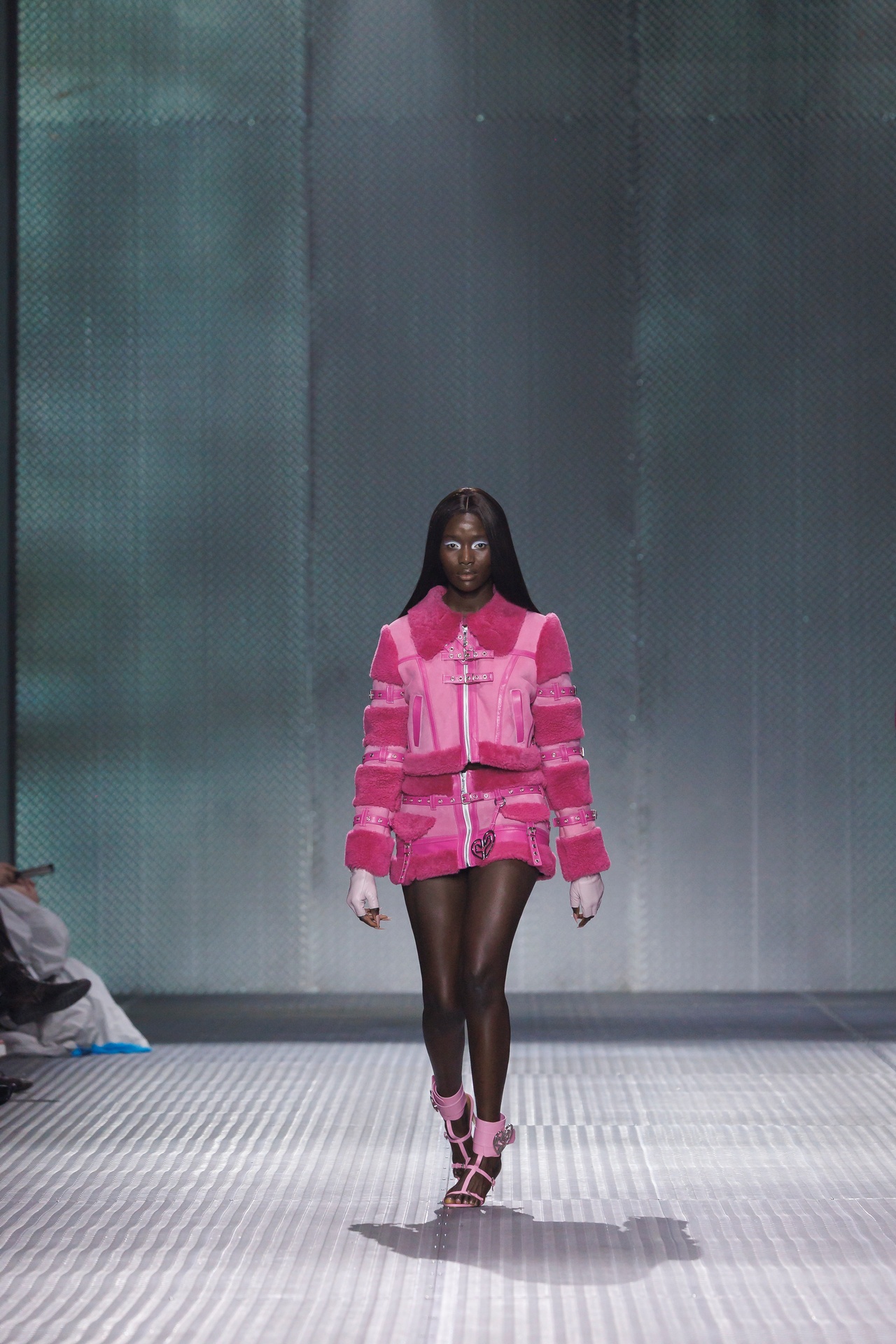 La paleta combina rosa pastel, fucsia lavado, azul desgastado, amarillo mostaza y verde manzana, junto a blanco coco y un morado tecnológico. Estas tonalidades se traducen en abrigos doble faz, cuero de líneas limpias, denim texturizado y la revisión del icónico traje moto, manteniendo una estética monocroma pero atrevida.