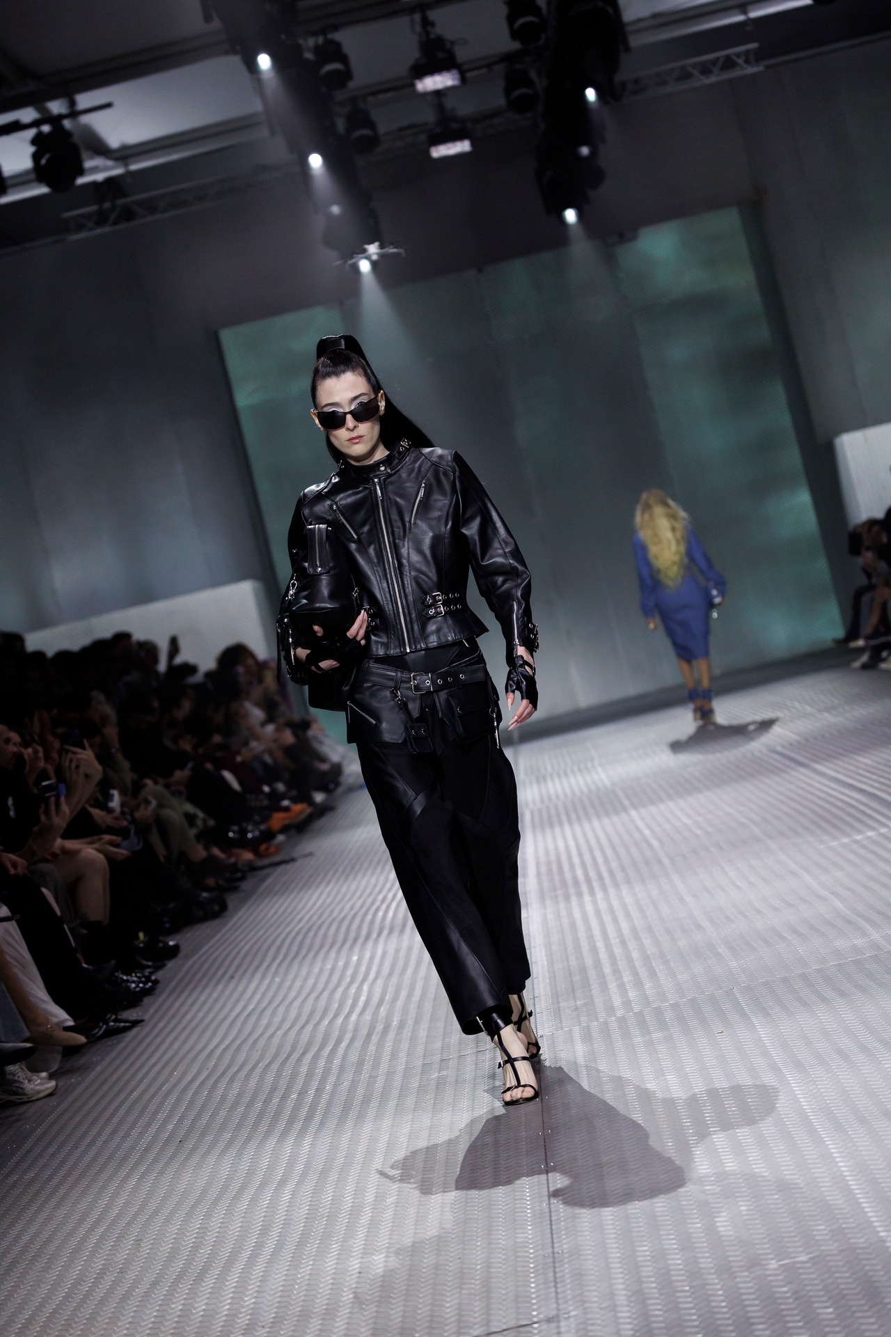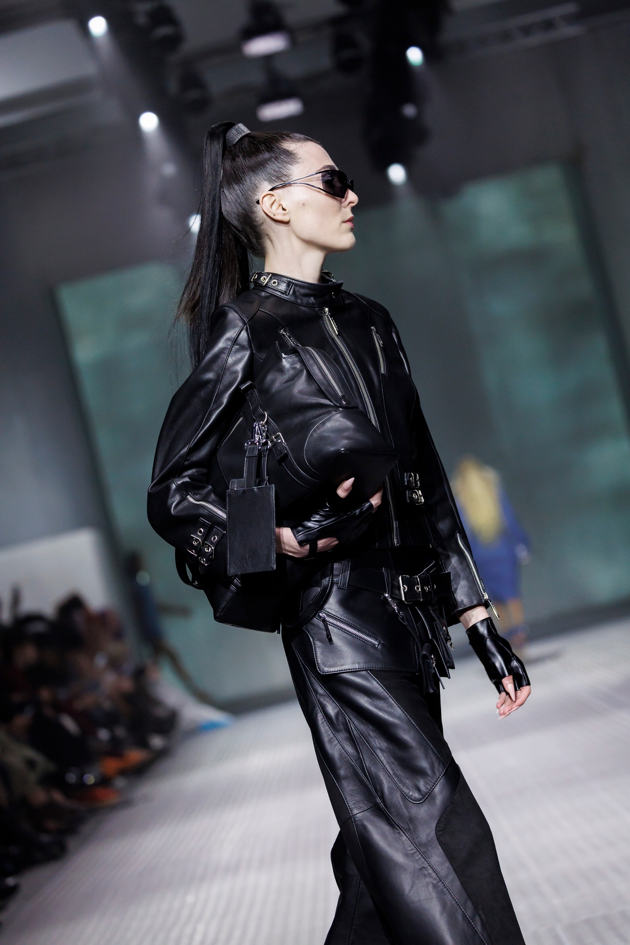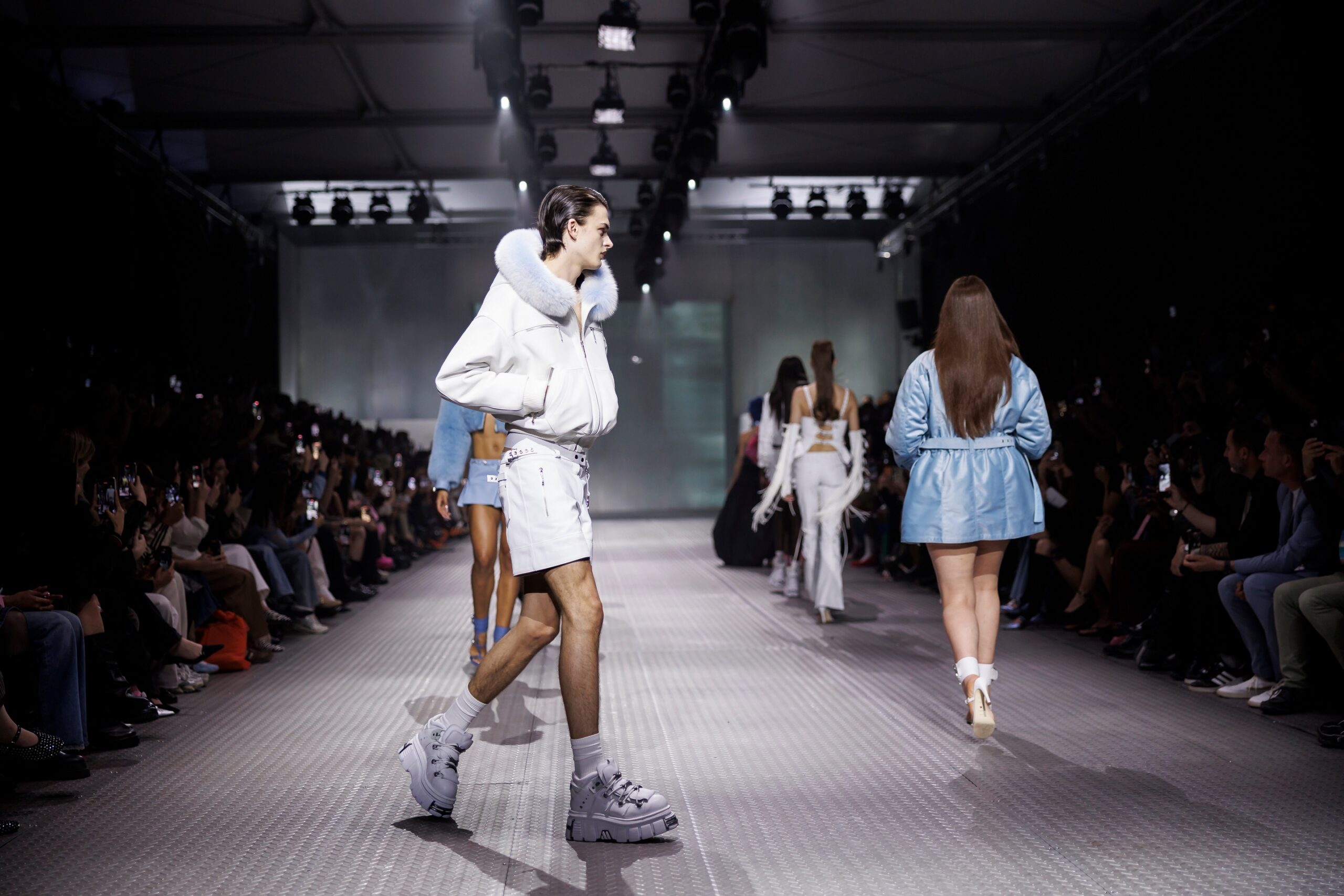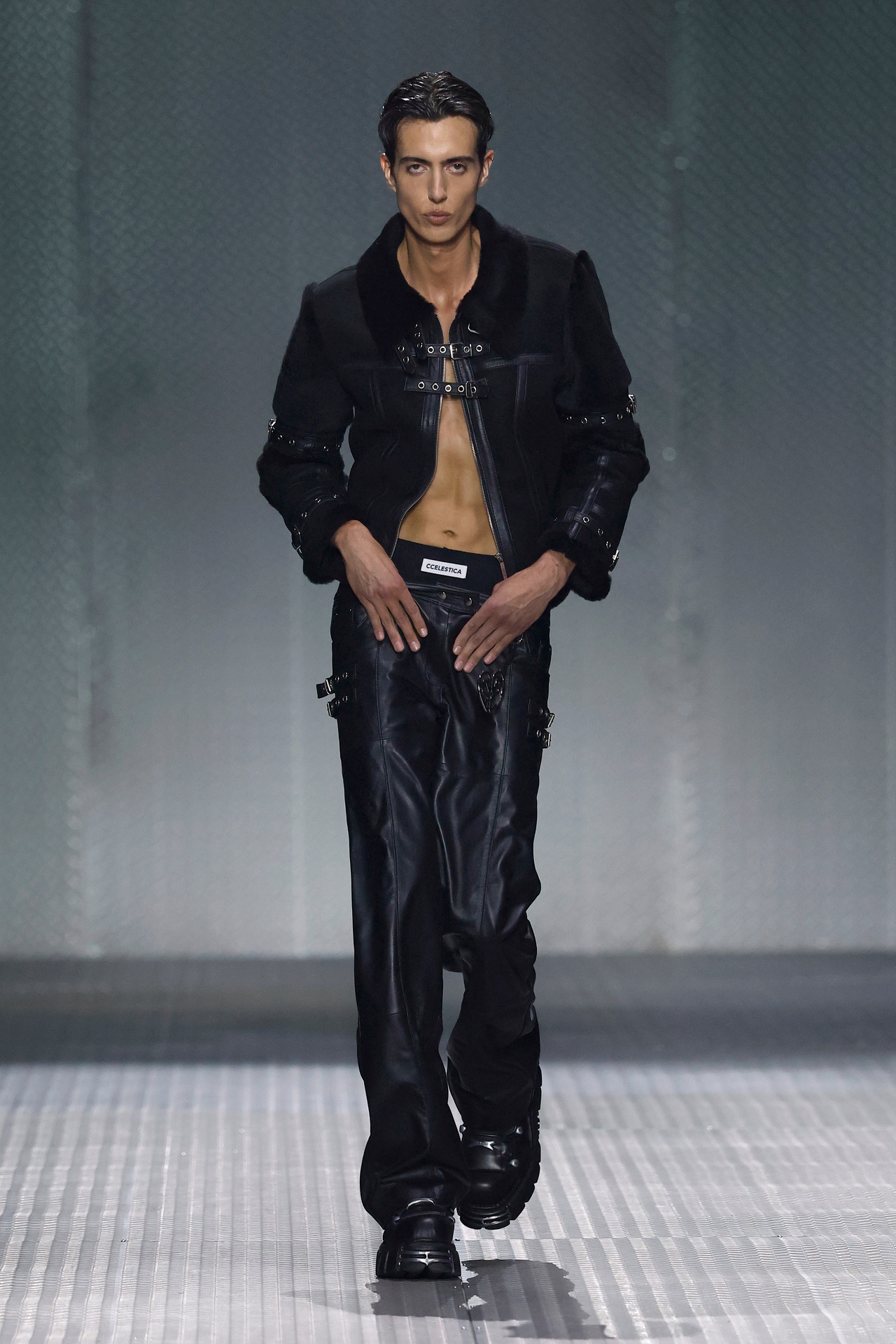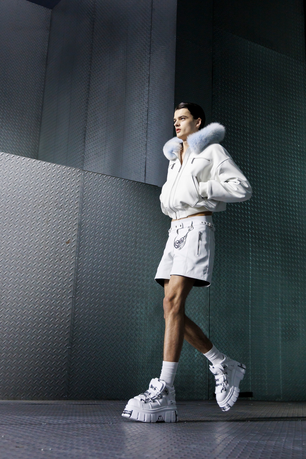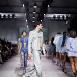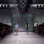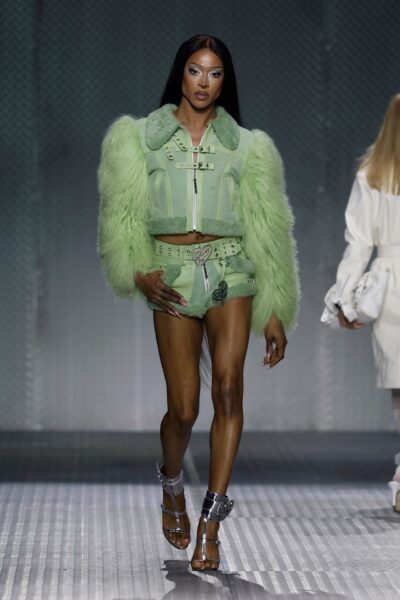 La paleta combina rosa pastel, fucsia lavado, azul desgastado, amarillo mostaza y verde manzana, junto a blanco coco y un morado tecnológico. Estas tonalidades se traducen en abrigos doble faz, cuero de líneas limpias, denim texturizado y la revisión del icónico traje moto, manteniendo una estética monocroma pero atrevida.
