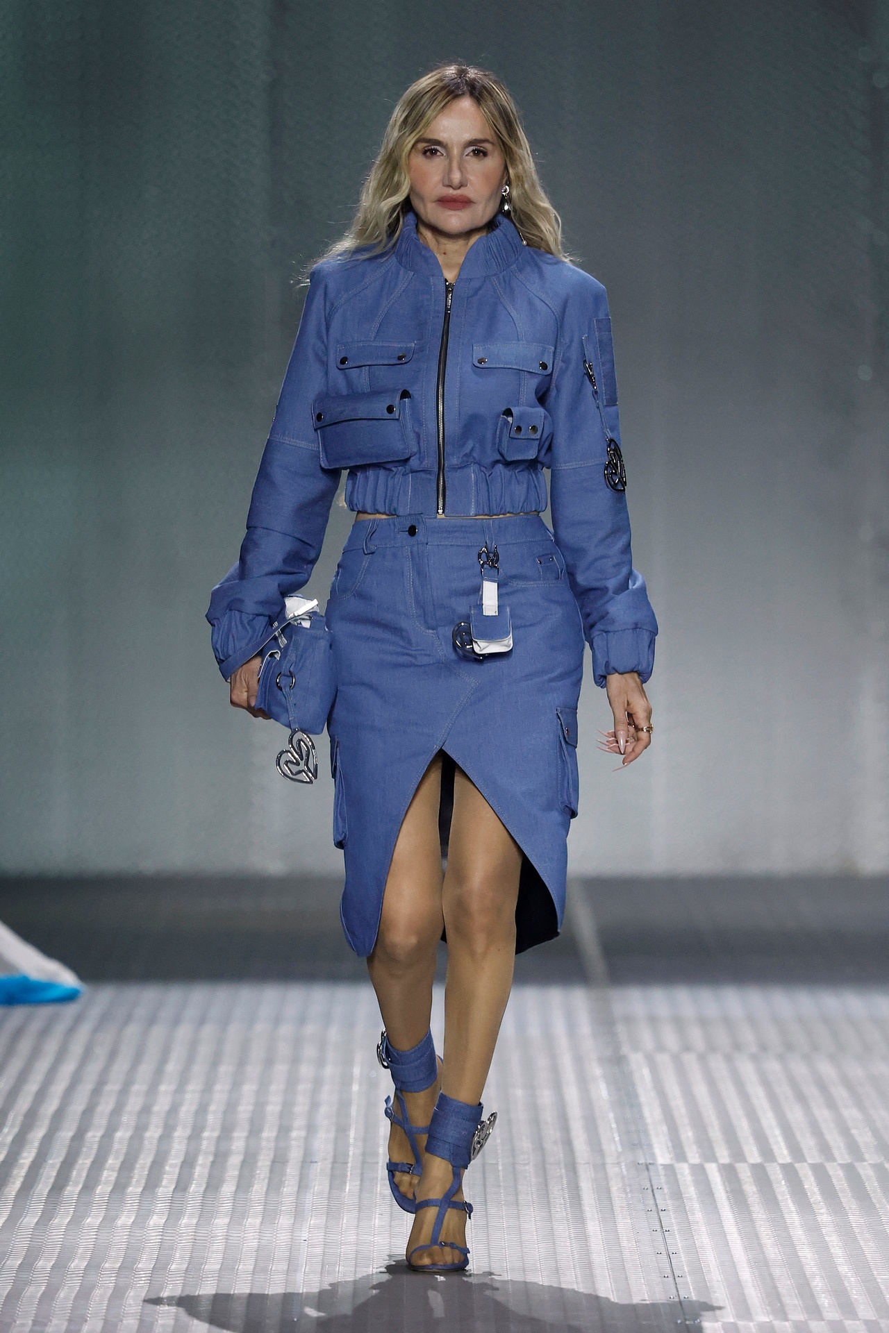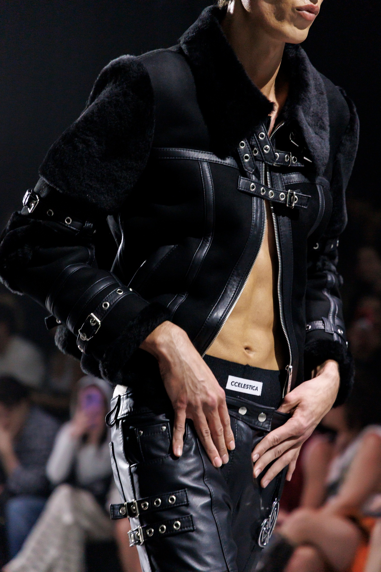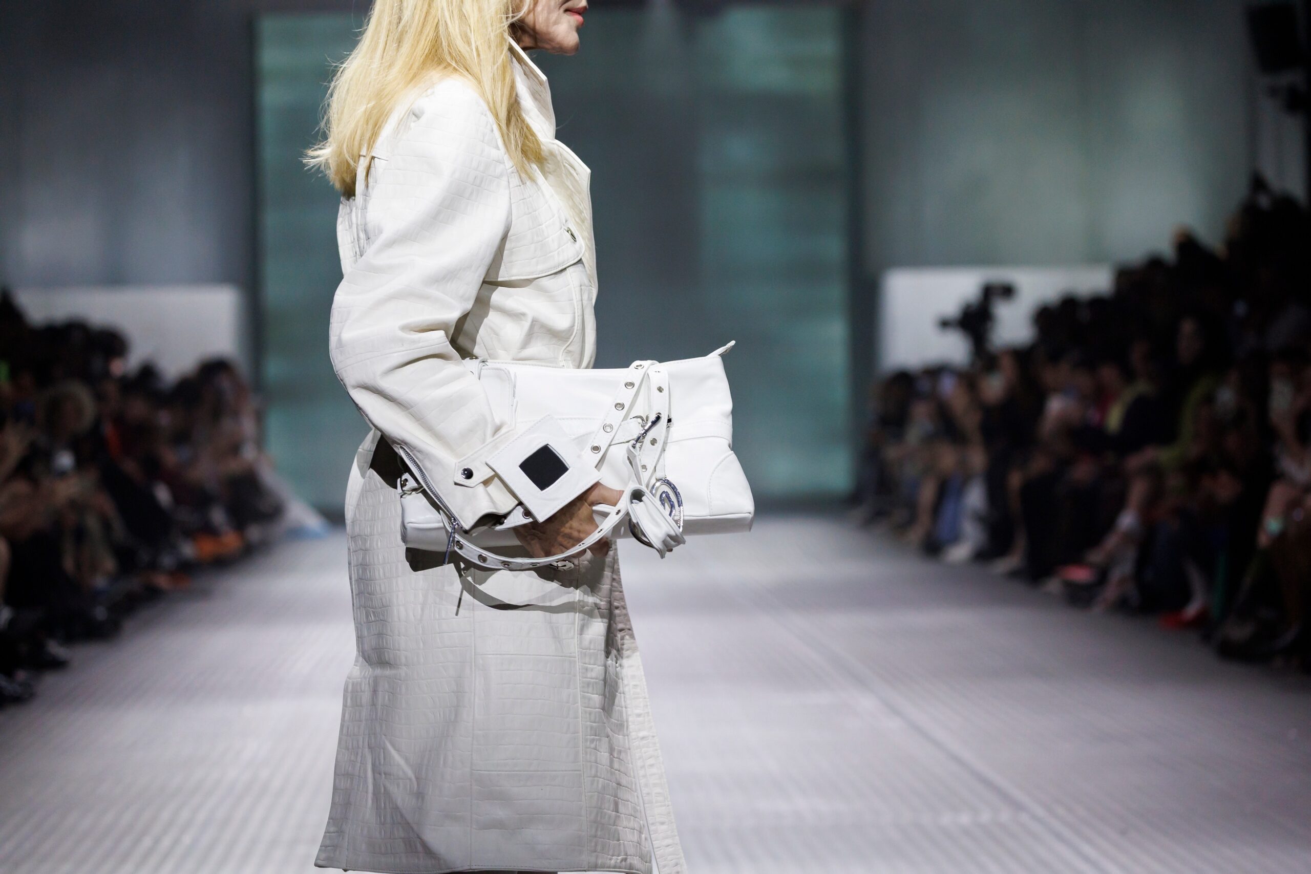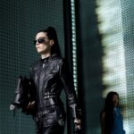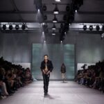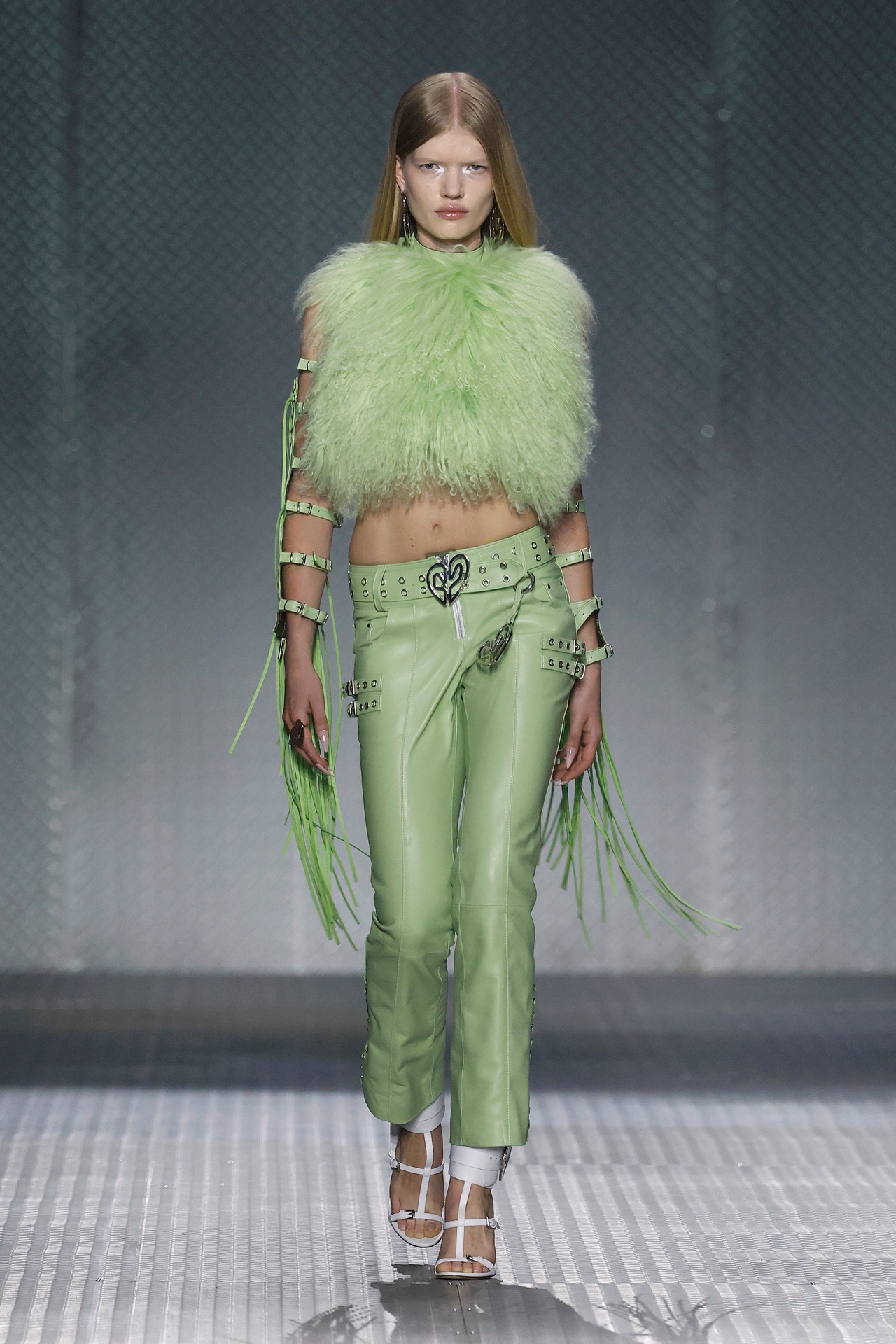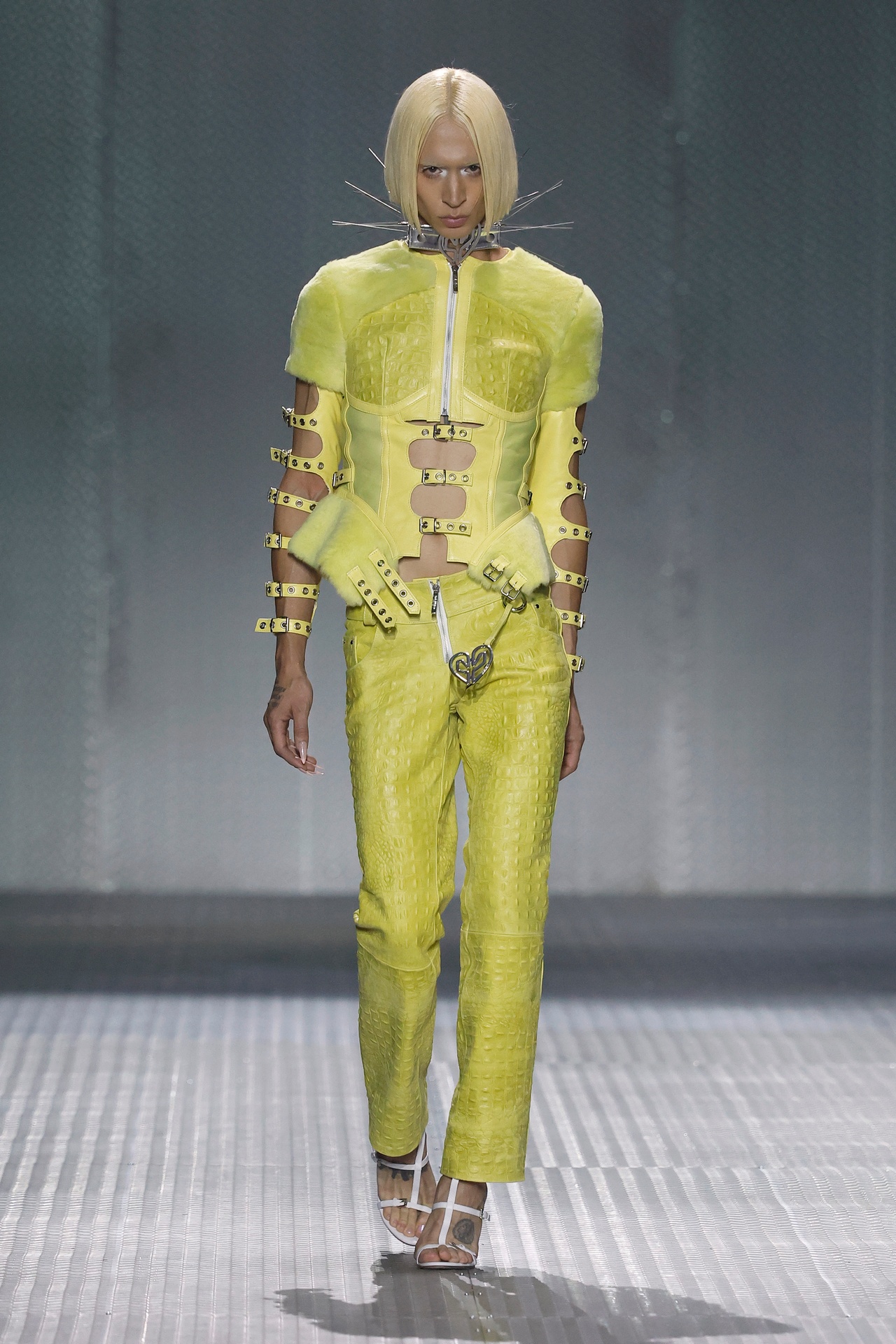La paleta combina rosa pastel, fucsia lavado, azul desgastado, amarillo mostaza y verde manzana, junto a blanco coco y un morado tecnológico. Estas tonalidades se traducen en abrigos doble faz, cuero de líneas limpias, denim texturizado y la revisión del icónico traje moto, manteniendo una estética monocroma pero atrevida.