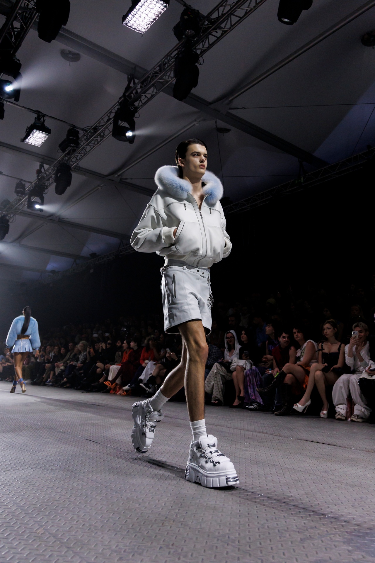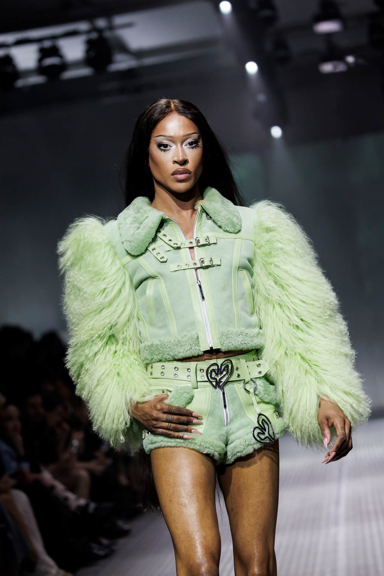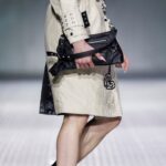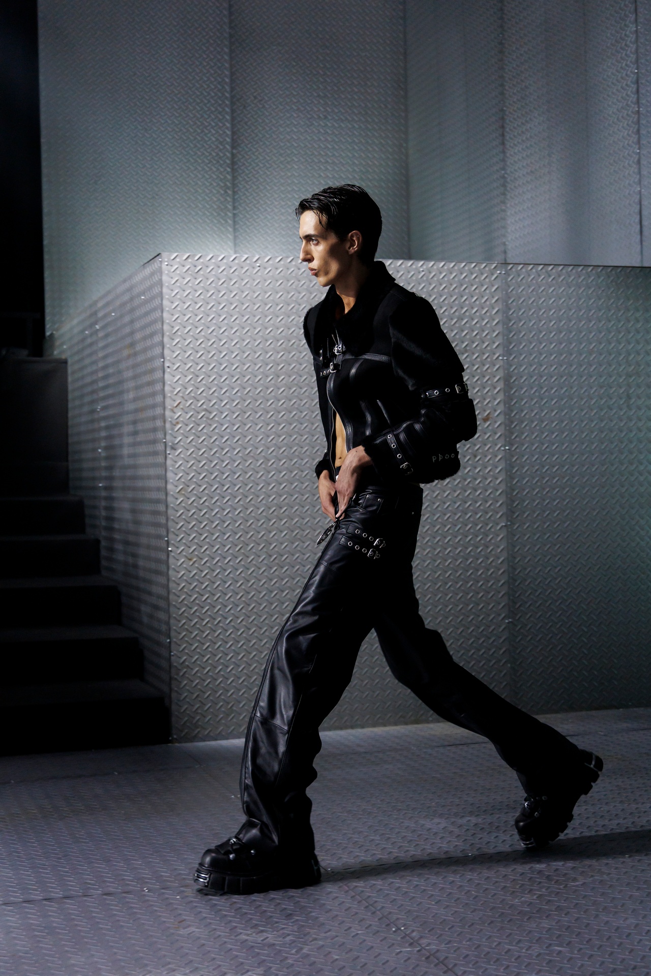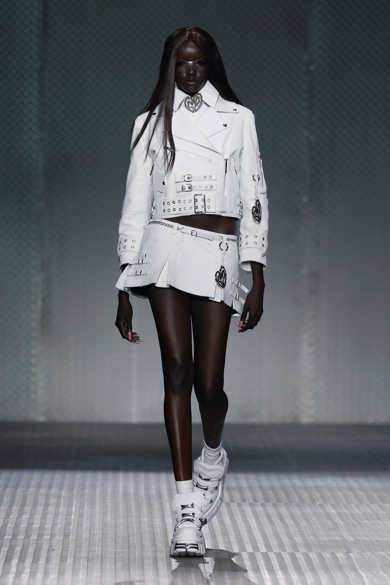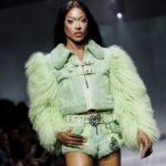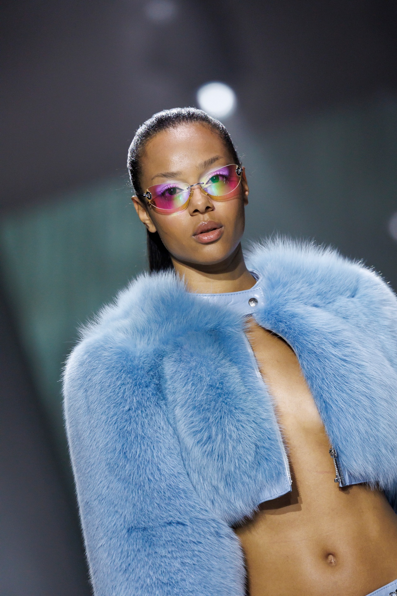 La paleta combina rosa pastel, fucsia lavado, azul desgastado, amarillo mostaza y verde manzana, junto a blanco coco y un morado tecnológico. Estas tonalidades se traducen en abrigos doble faz, cuero de líneas limpias, denim texturizado y la revisión del icónico traje moto, manteniendo una estética monocroma pero atrevida.