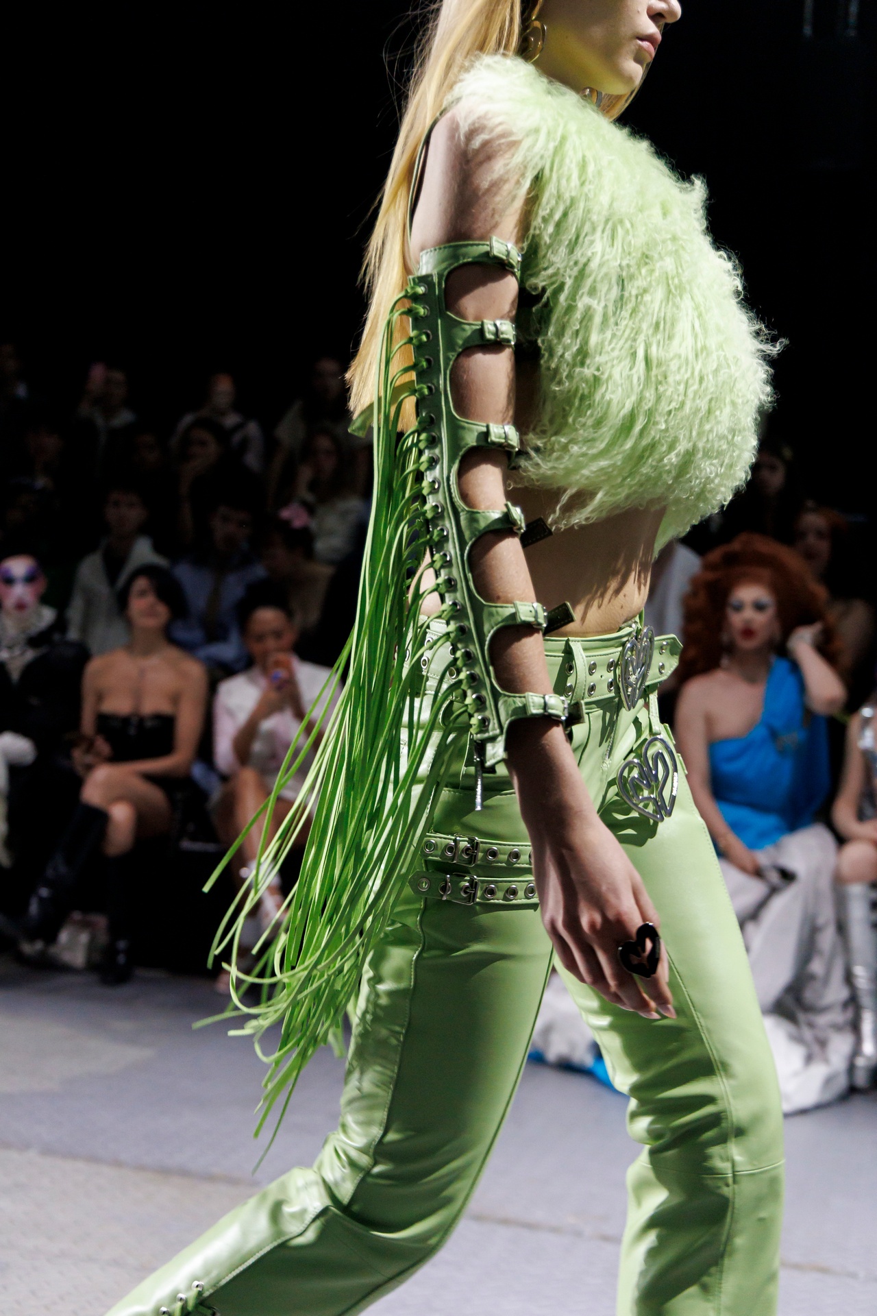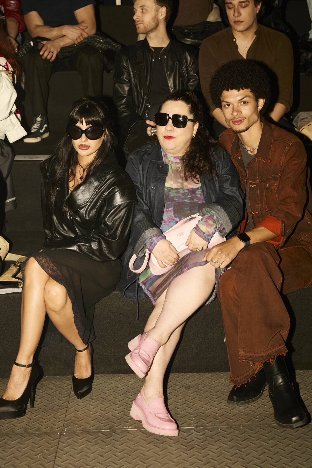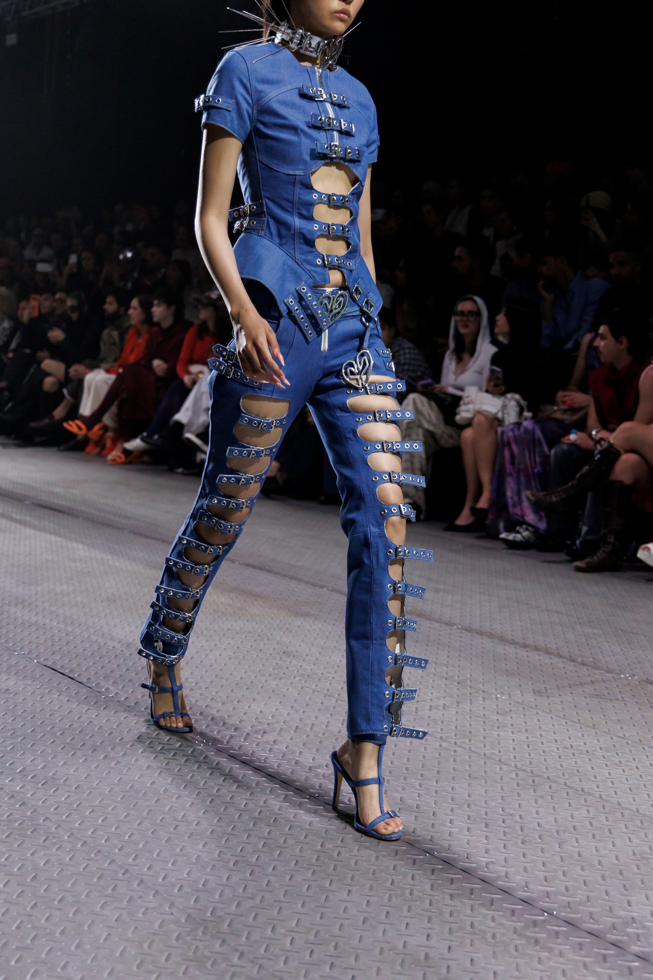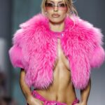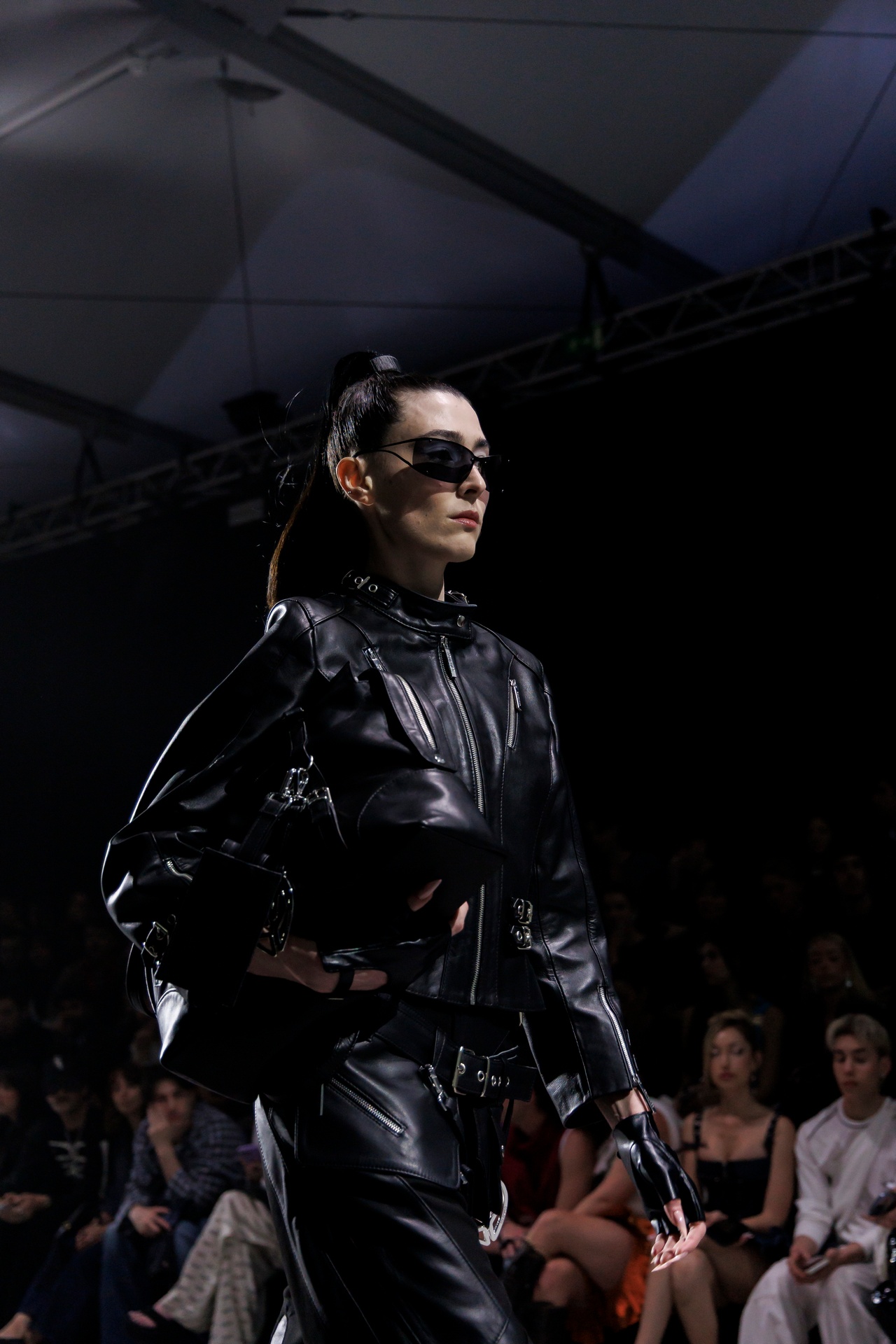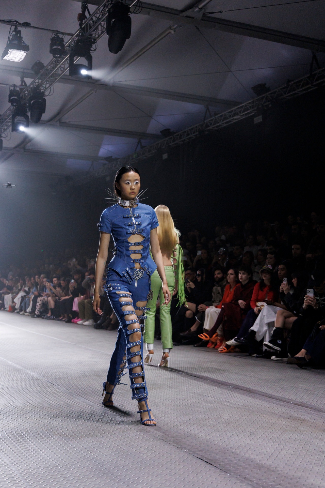 La paleta combina rosa pastel, fucsia lavado, azul desgastado, amarillo mostaza y verde manzana, junto a blanco coco y un morado tecnológico. Estas tonalidades se traducen en abrigos doble faz, cuero de líneas limpias, denim texturizado y la revisión del icónico traje moto, manteniendo una estética monocroma pero atrevida.