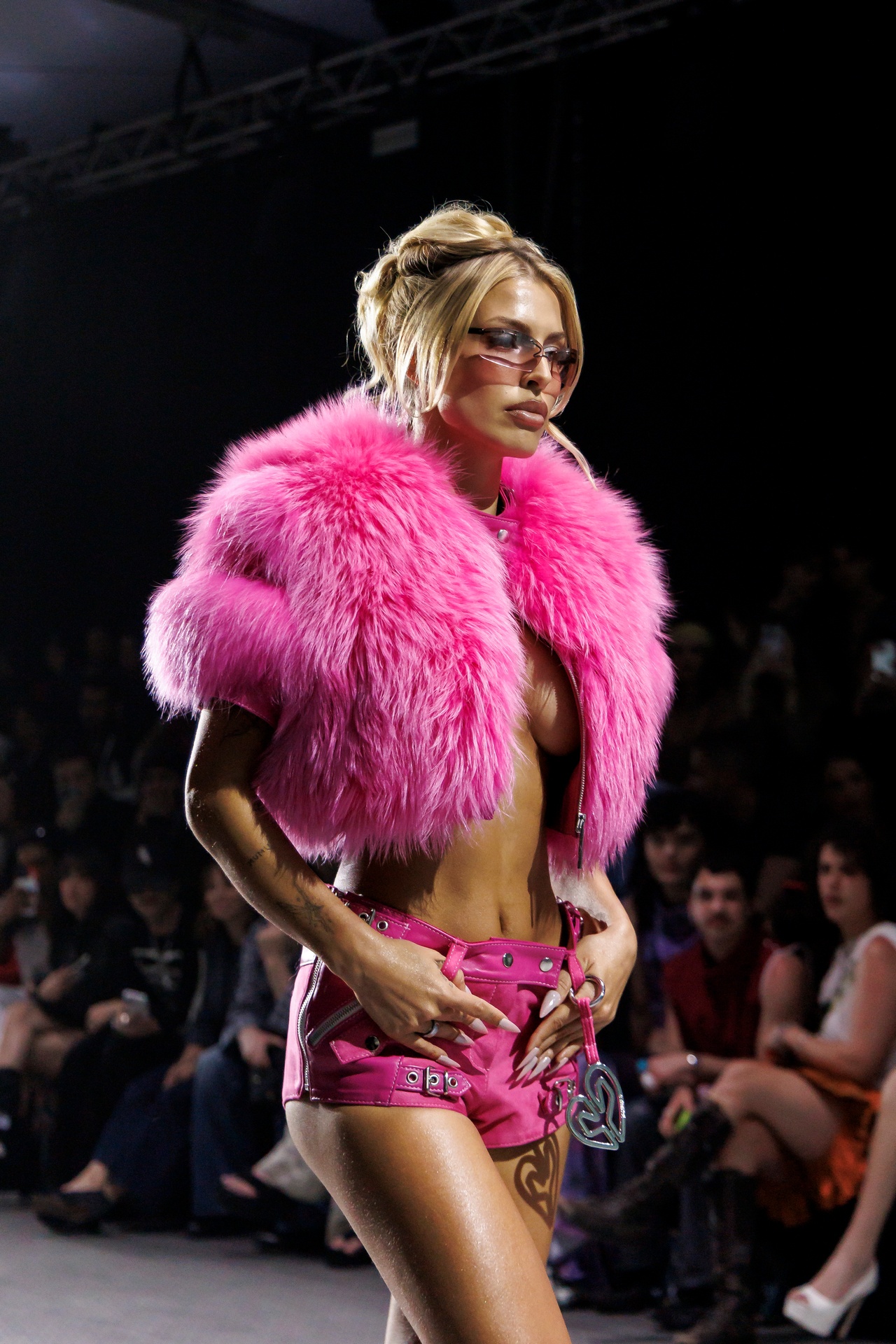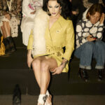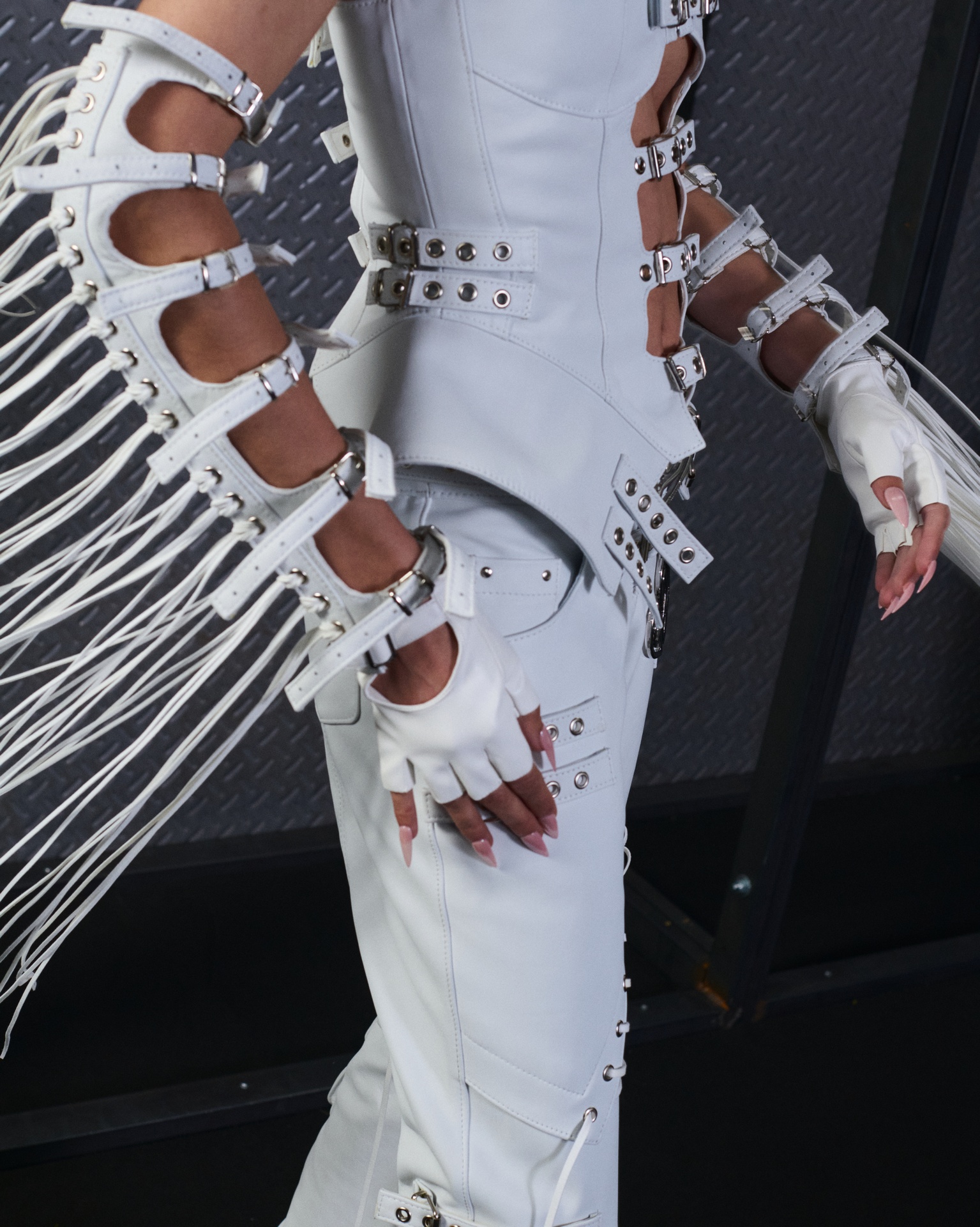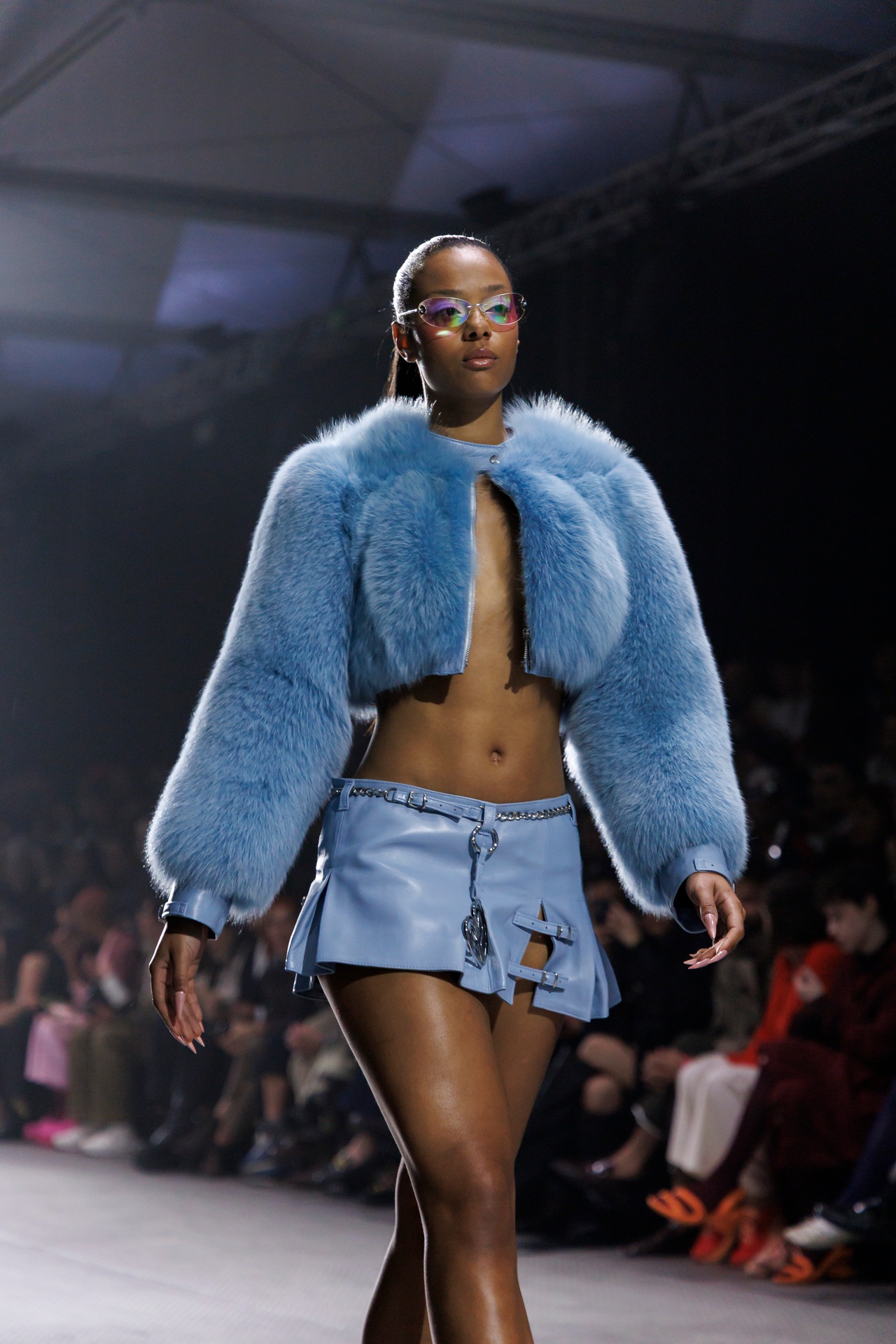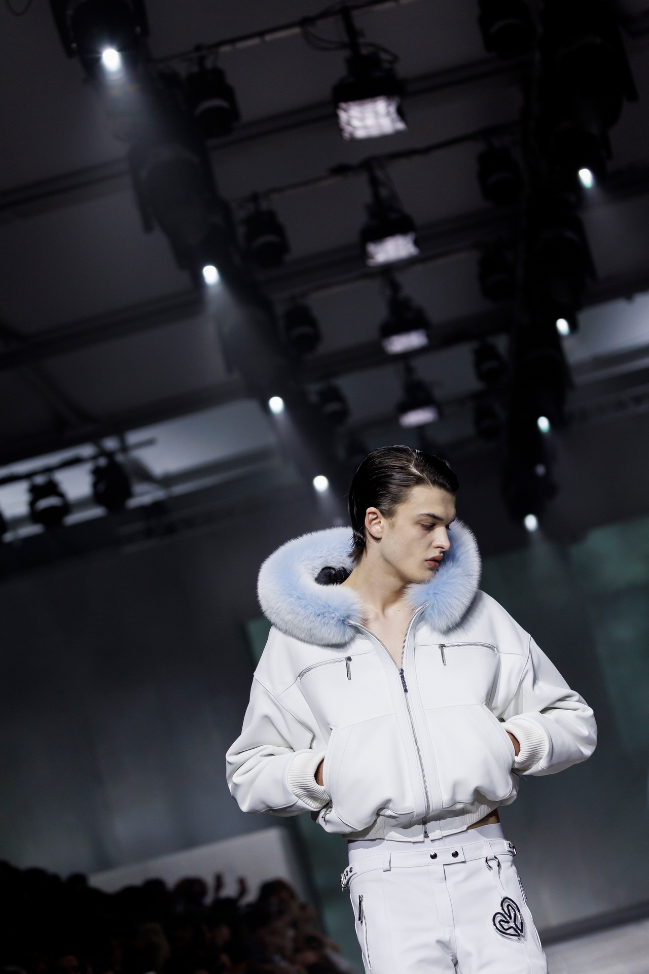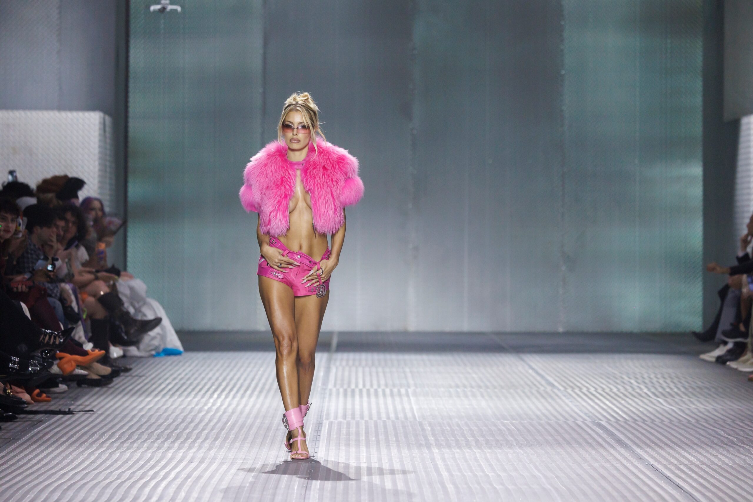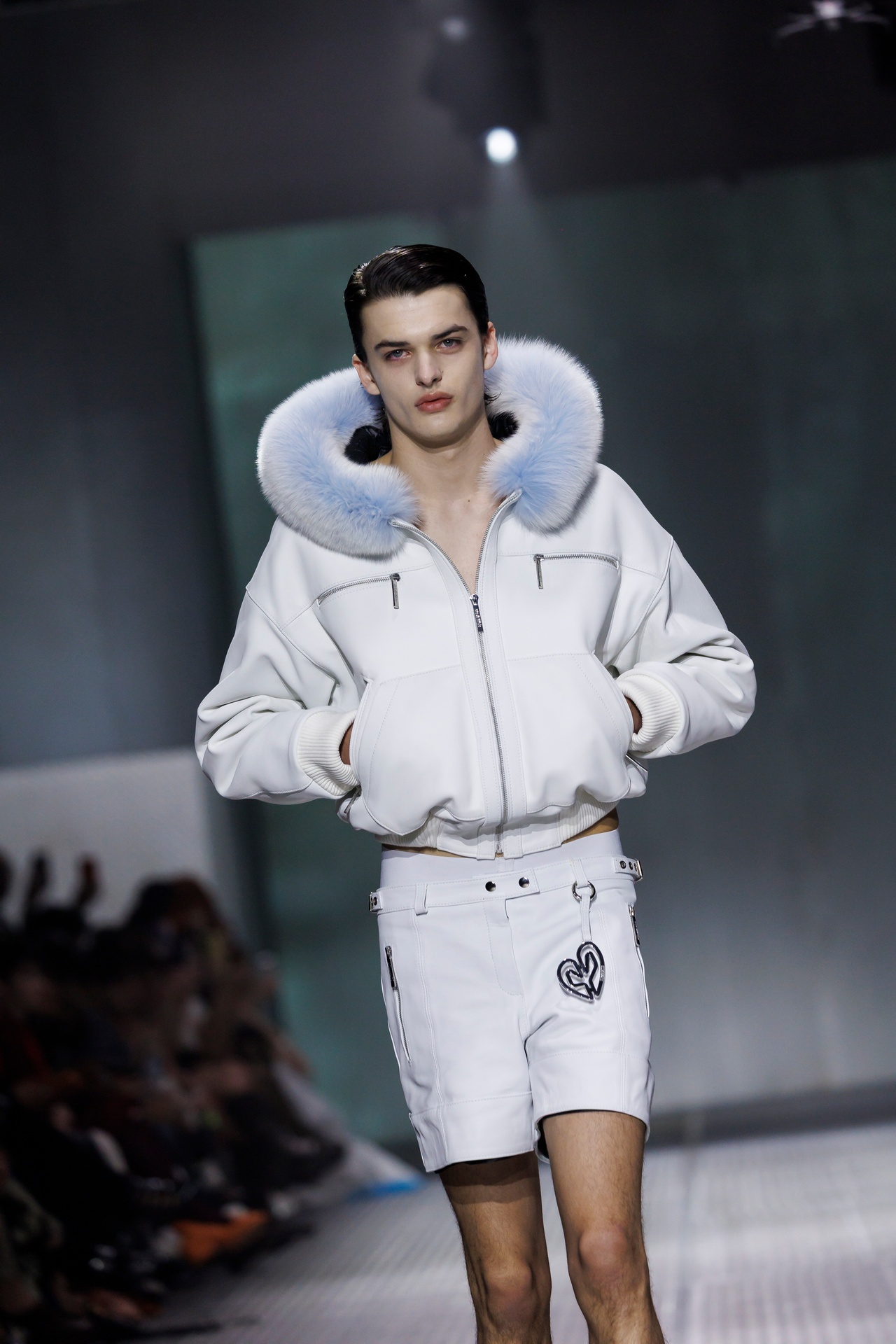 La paleta combina rosa pastel, fucsia lavado, azul desgastado, amarillo mostaza y verde manzana, junto a blanco coco y un morado tecnológico. Estas tonalidades se traducen en abrigos doble faz, cuero de líneas limpias, denim texturizado y la revisión del icónico traje moto, manteniendo una estética monocroma pero atrevida.