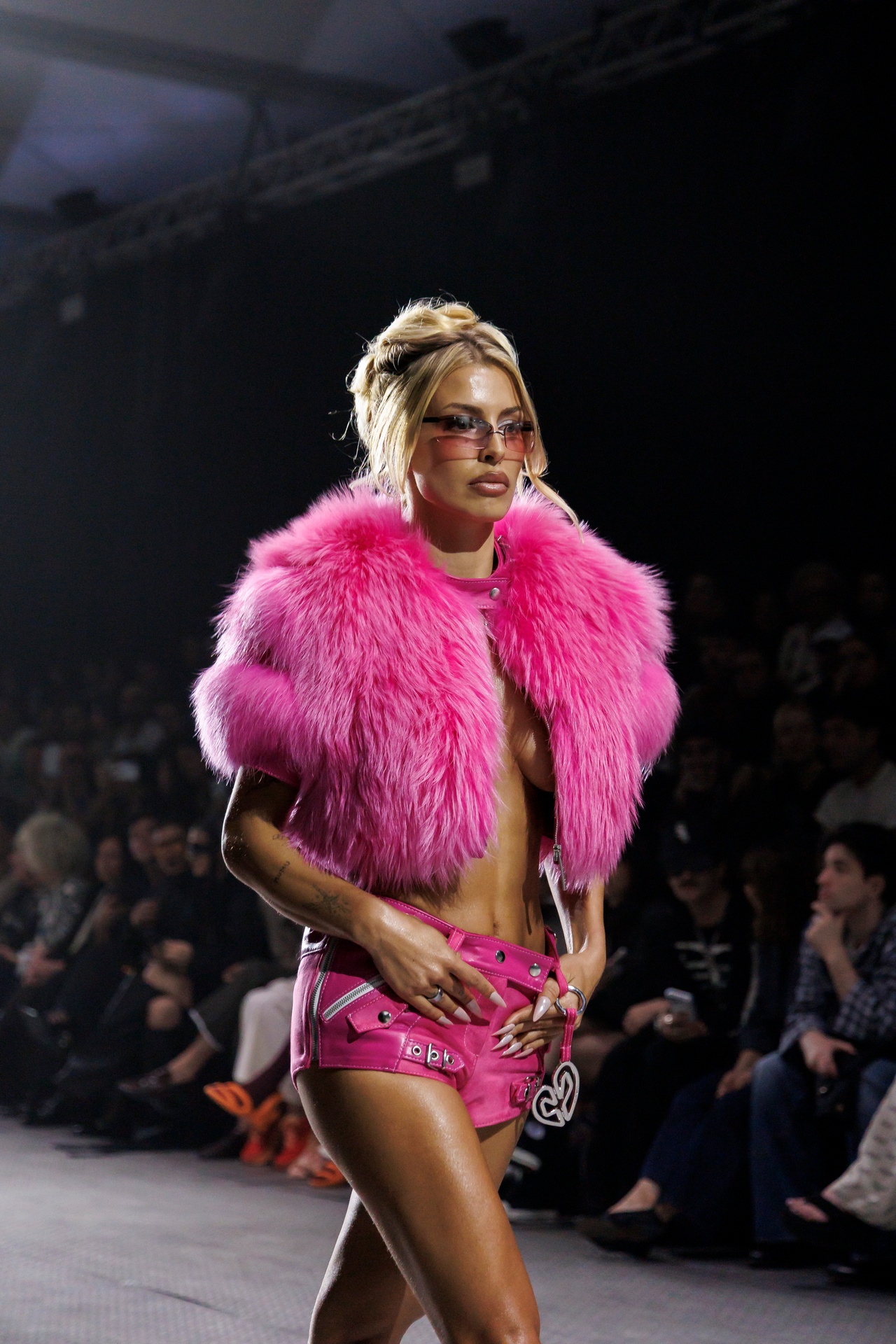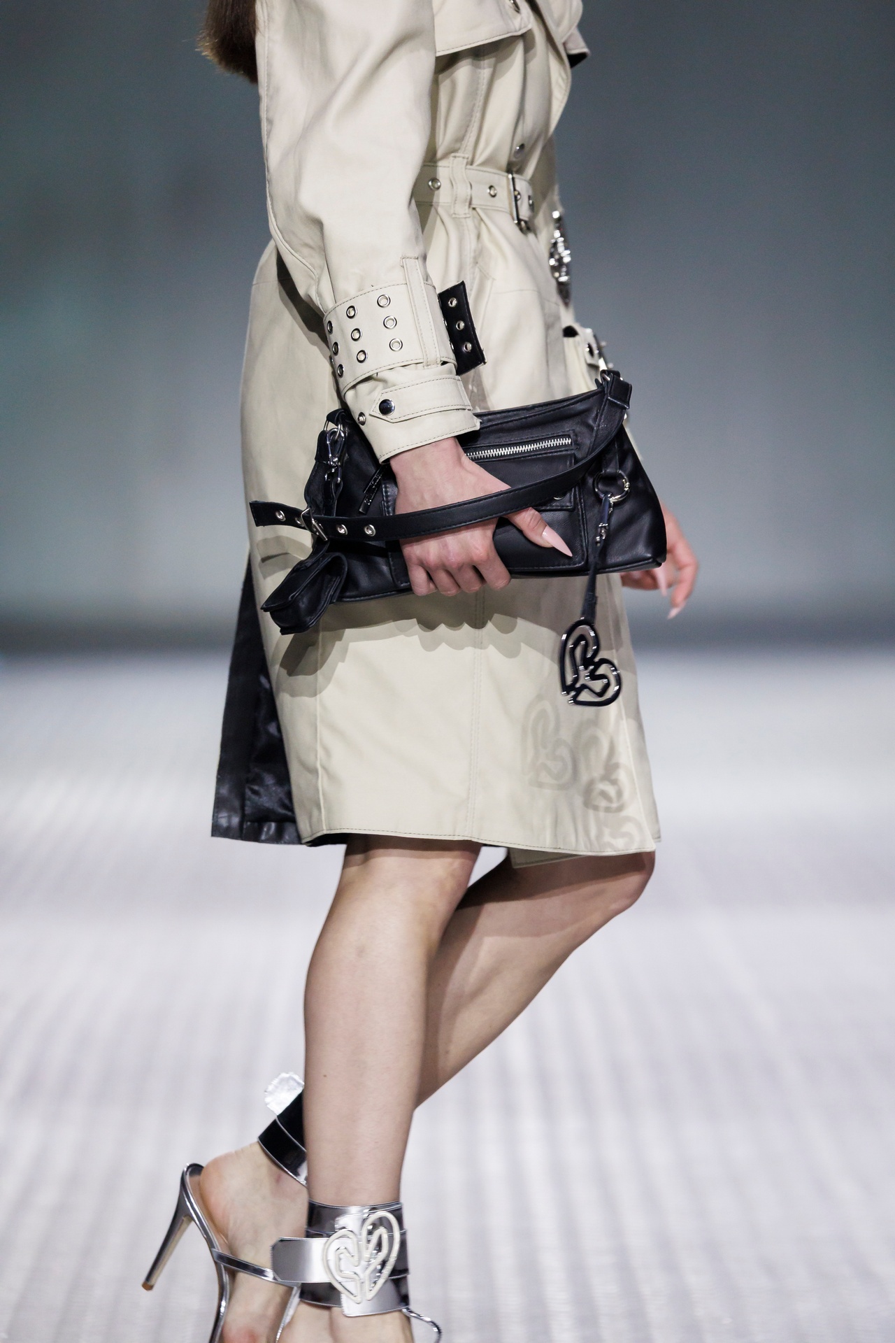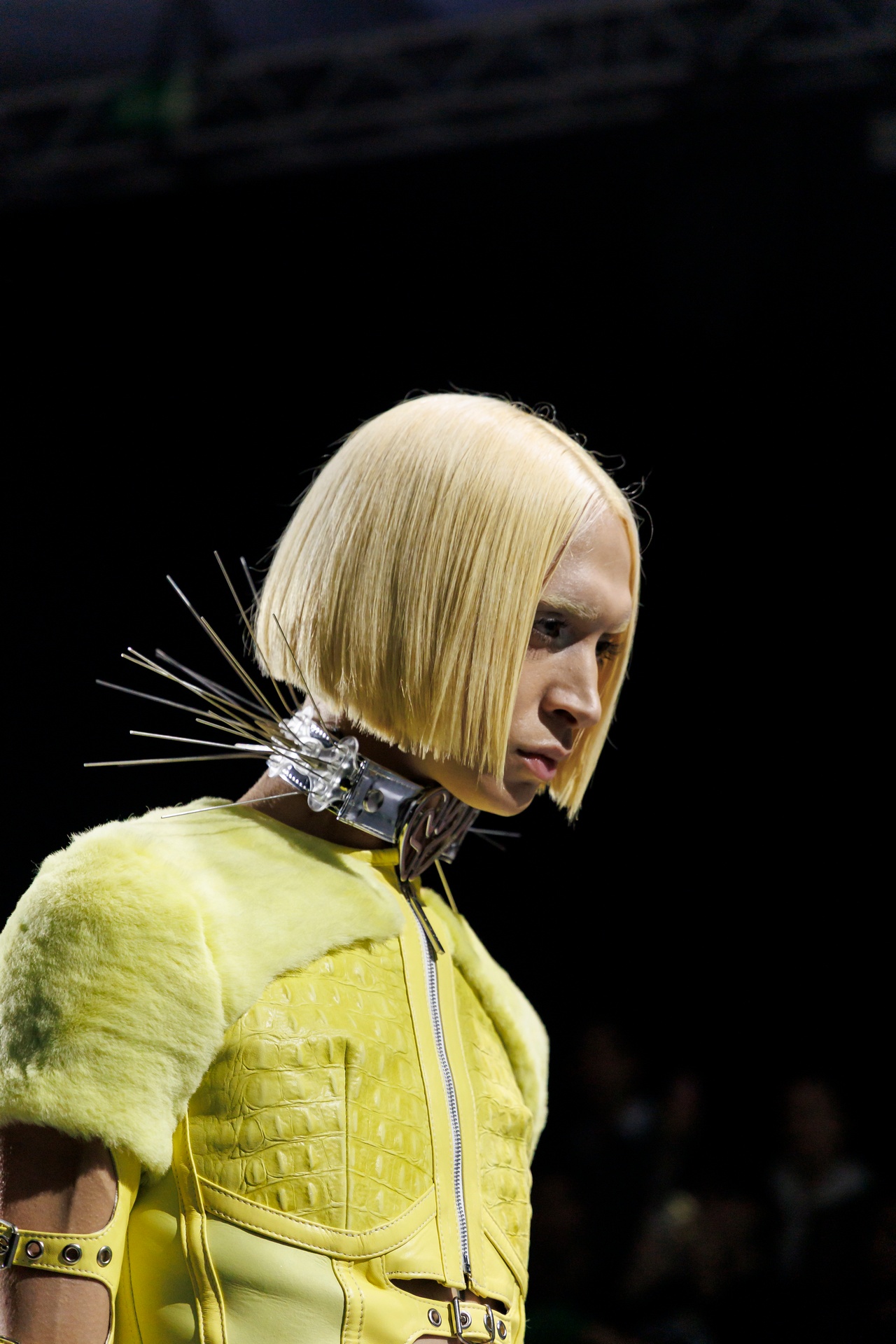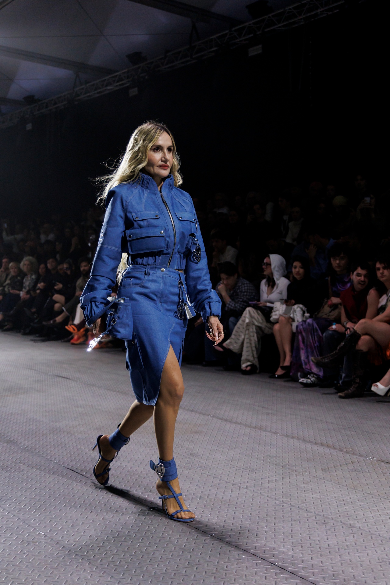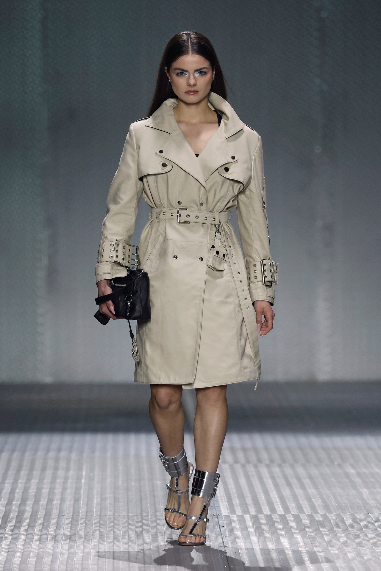 La paleta combina rosa pastel, fucsia lavado, azul desgastado, amarillo mostaza y verde manzana, junto a blanco coco y un morado tecnológico. Estas tonalidades se traducen en abrigos doble faz, cuero de líneas limpias, denim texturizado y la revisión del icónico traje moto, manteniendo una estética monocroma pero atrevida.