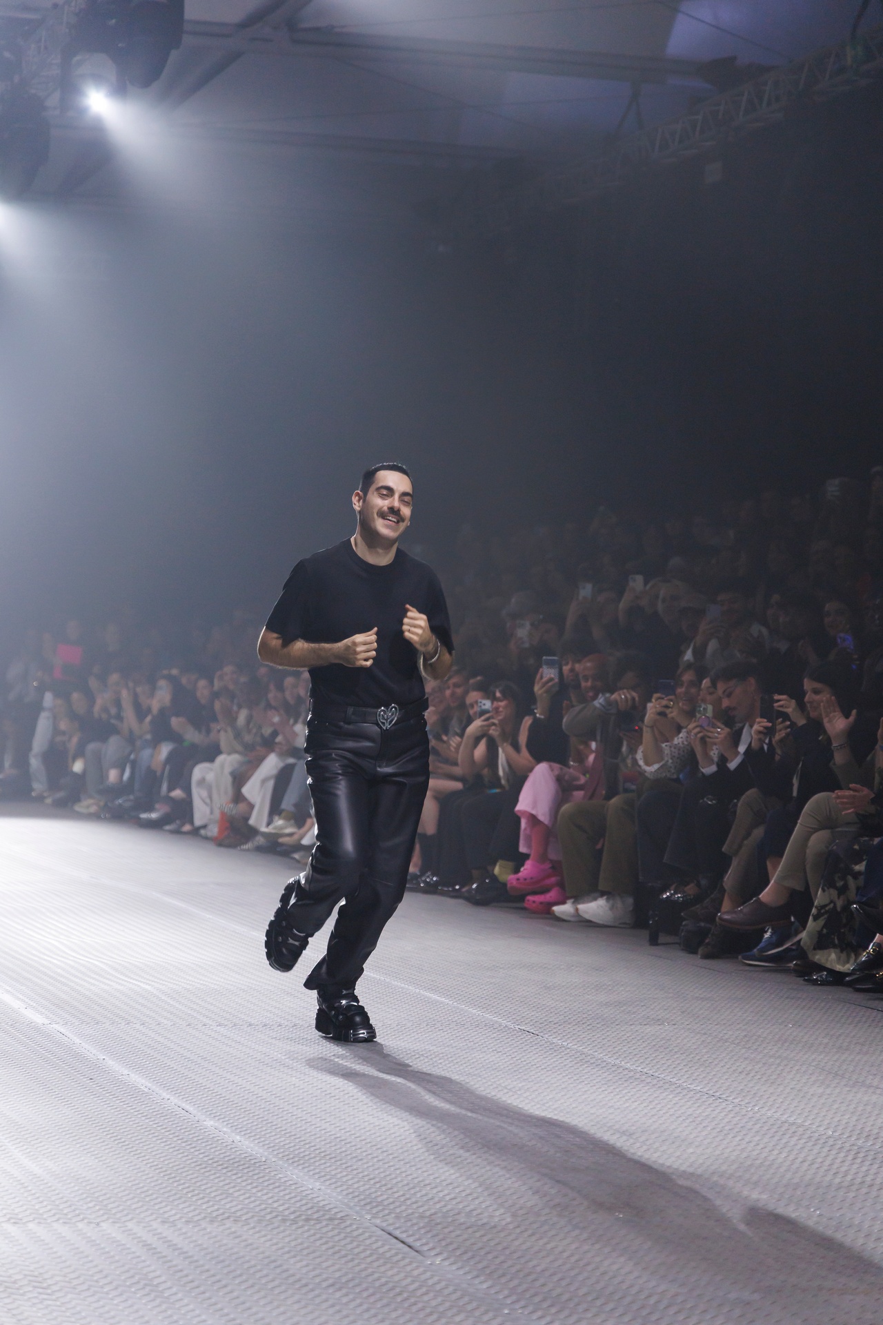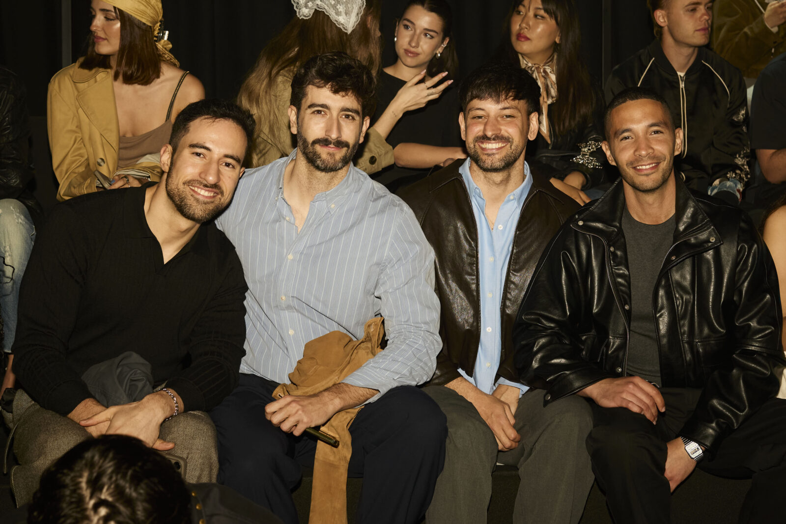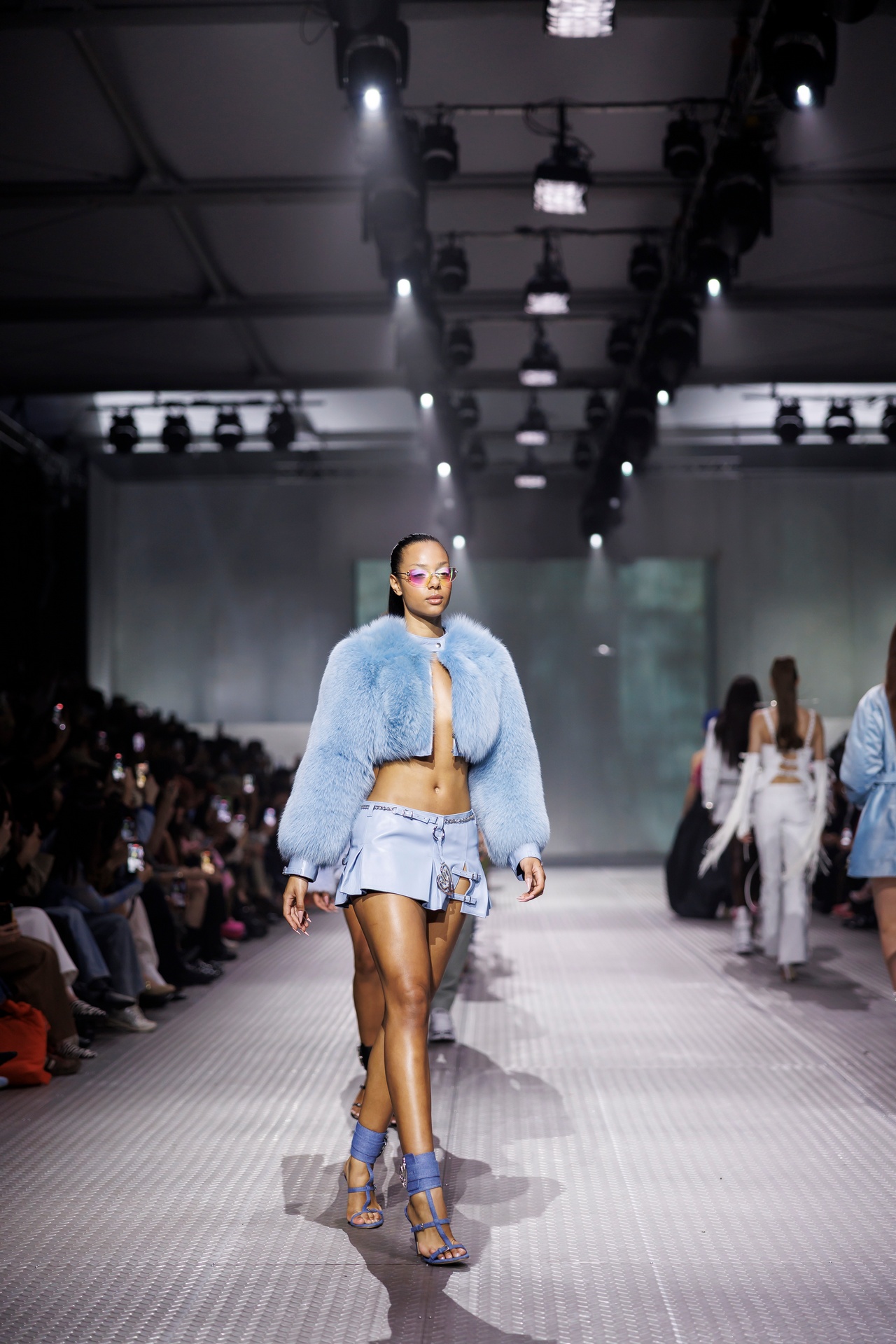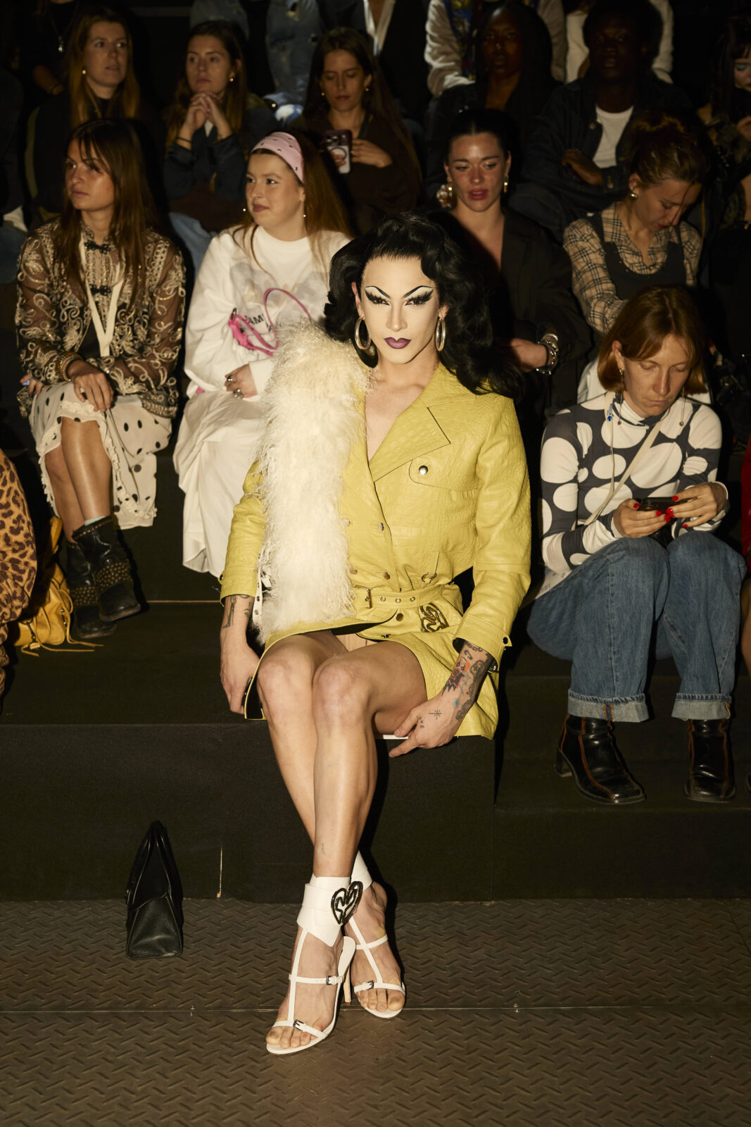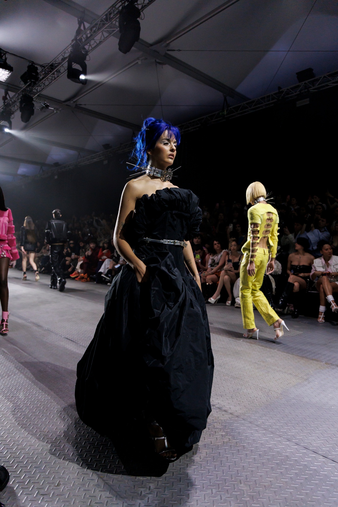 La paleta combina rosa pastel, fucsia lavado, azul desgastado, amarillo mostaza y verde manzana, junto a blanco coco y un morado tecnológico. Estas tonalidades se traducen en abrigos doble faz, cuero de líneas limpias, denim texturizado y la revisión del icónico traje moto, manteniendo una estética monocroma pero atrevida.