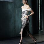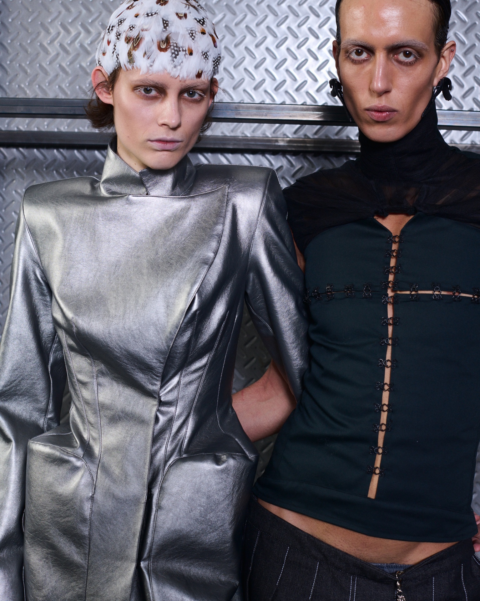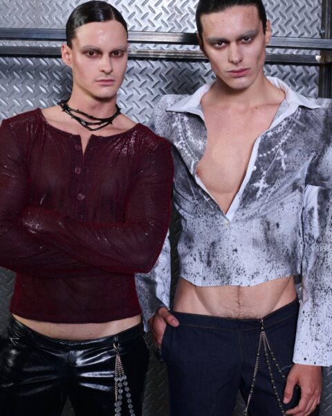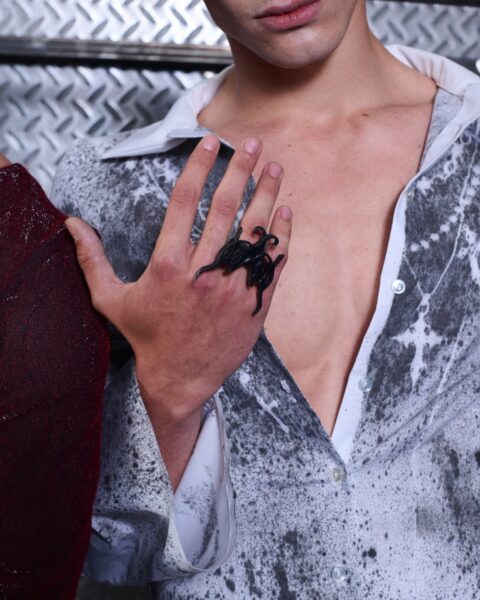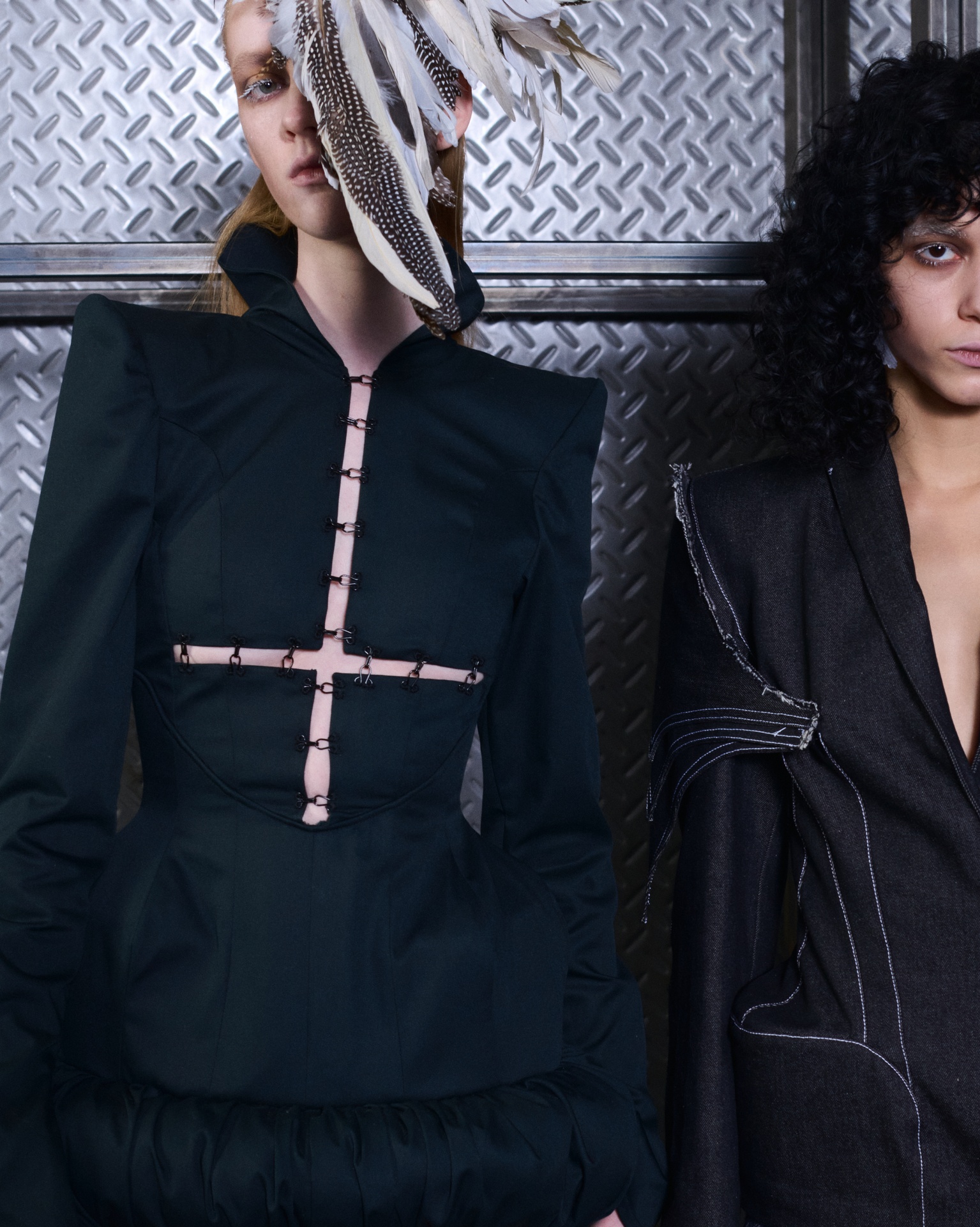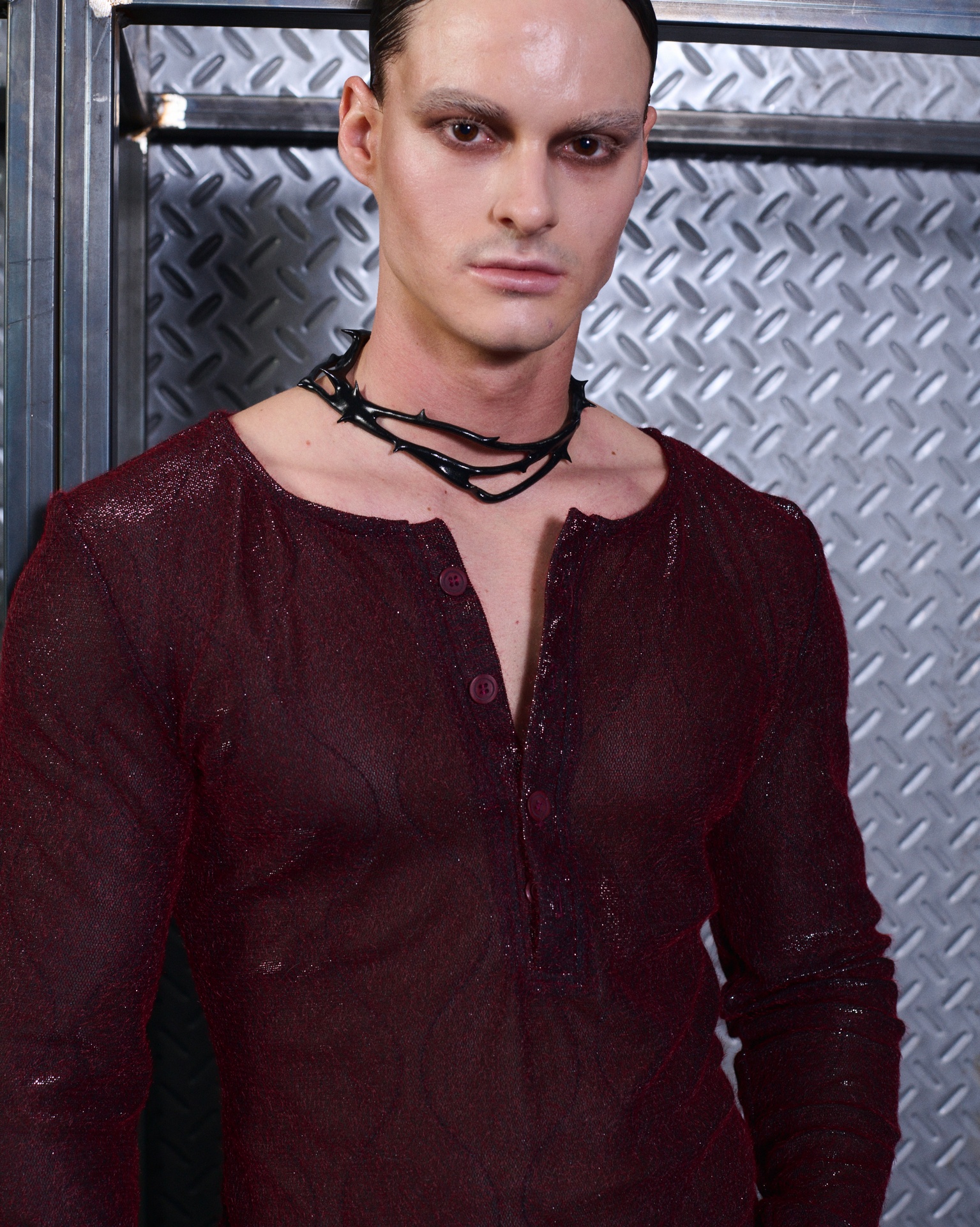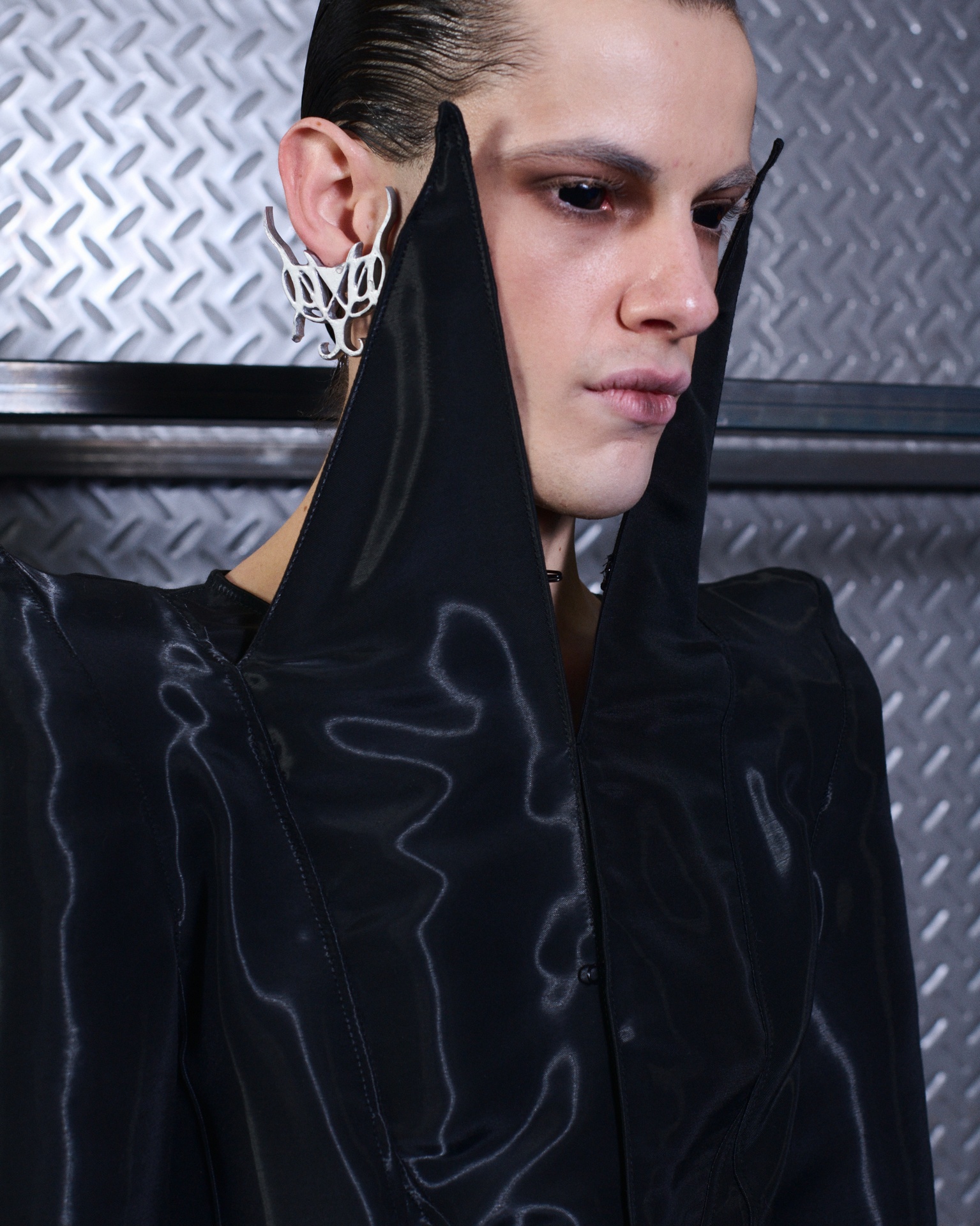 La propuesta habita un territorio entre lo espiritual y lo estructural, entre la luz metálica y la sombra del fuego. A través de materiales como organza, cuero sintético, pelo y encaje quemado, la colección aborda la idea de regeneración: el cuerpo que se quema, muta y renace. Cada textura cumple una función narrativa —estructura, ligereza, memoria abrasada, protección— construyendo un lenguaje visual de resistencia y transformación. La paleta cromática, del gris perla al negro carbón con reflejos plateados y pulsos de rojo, refuerza la tensión entre vulnerabilidad, poder y fortaleza interior.
