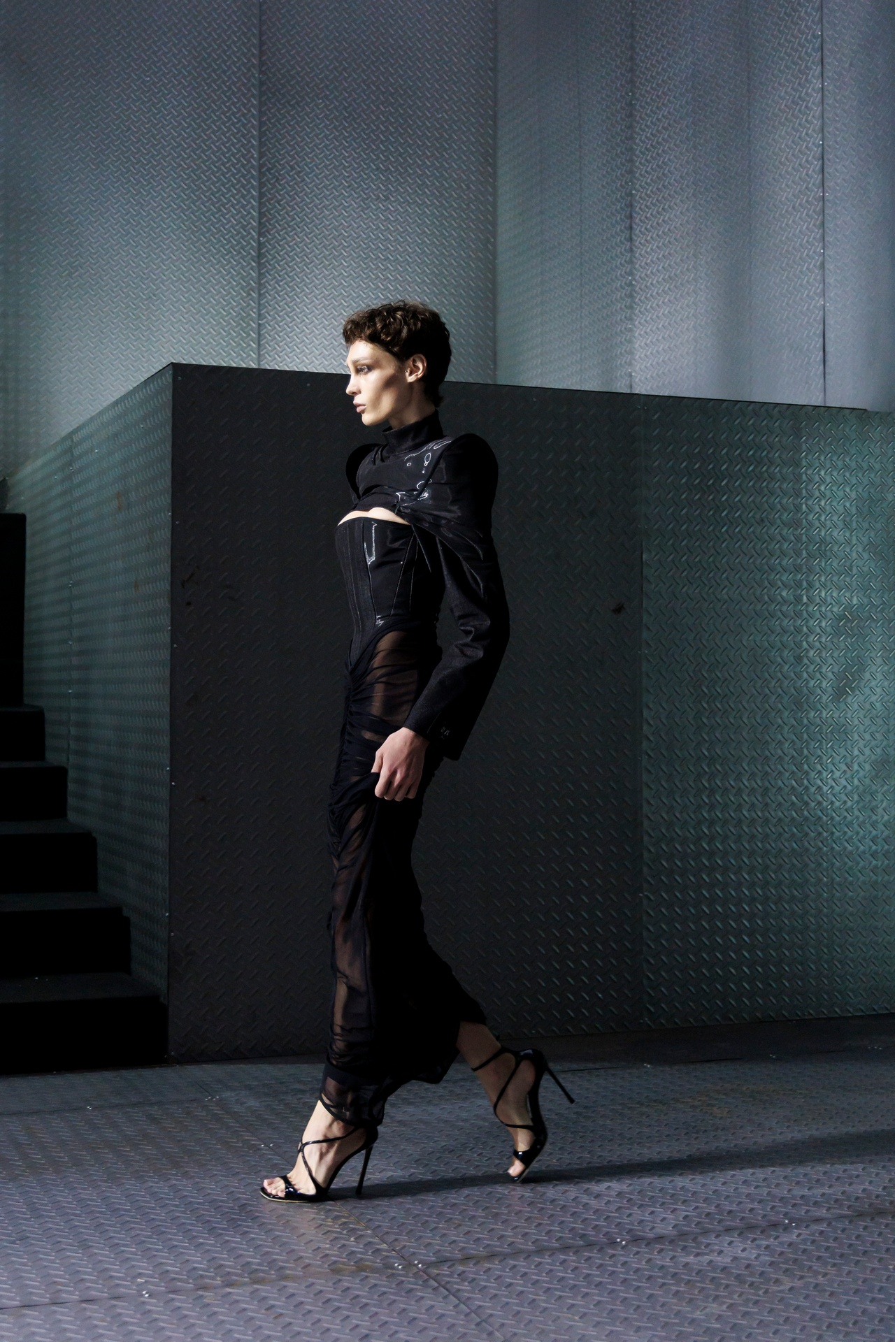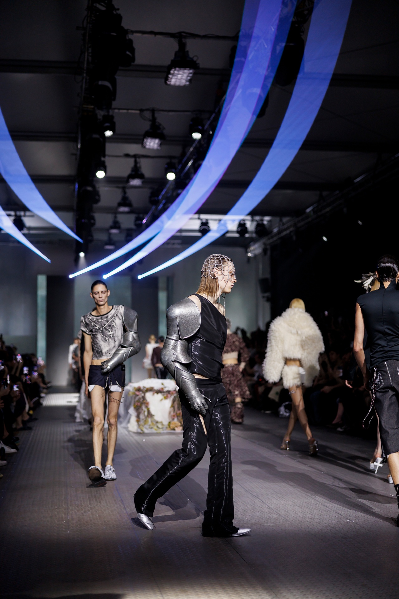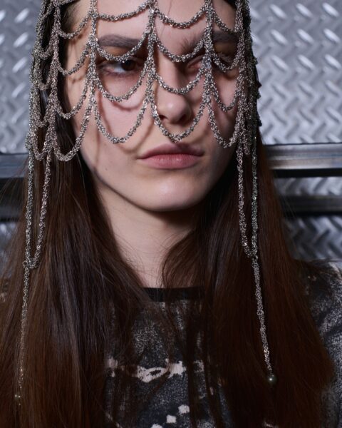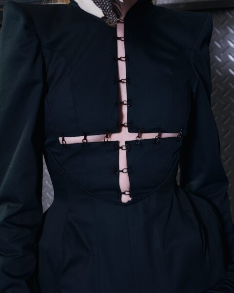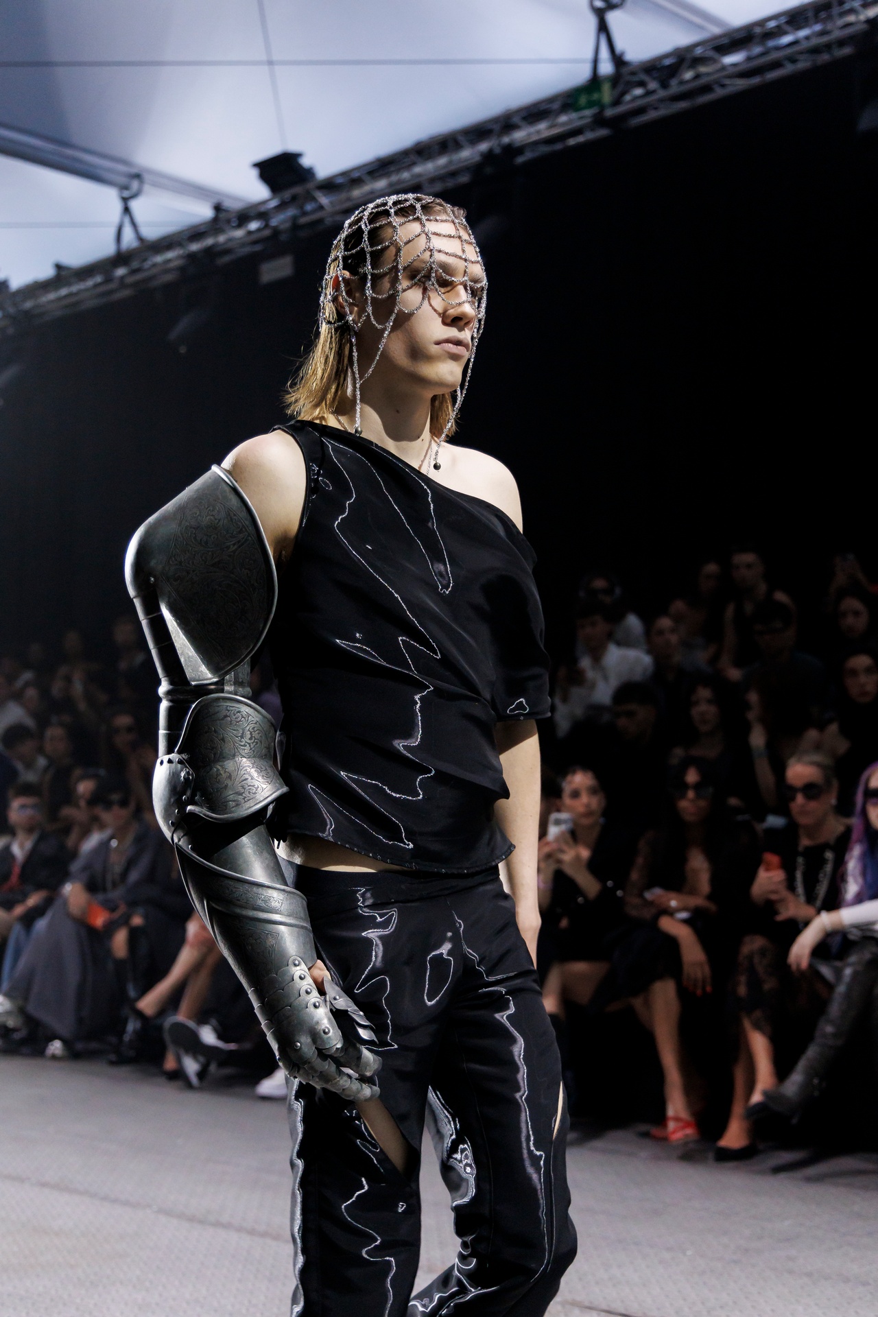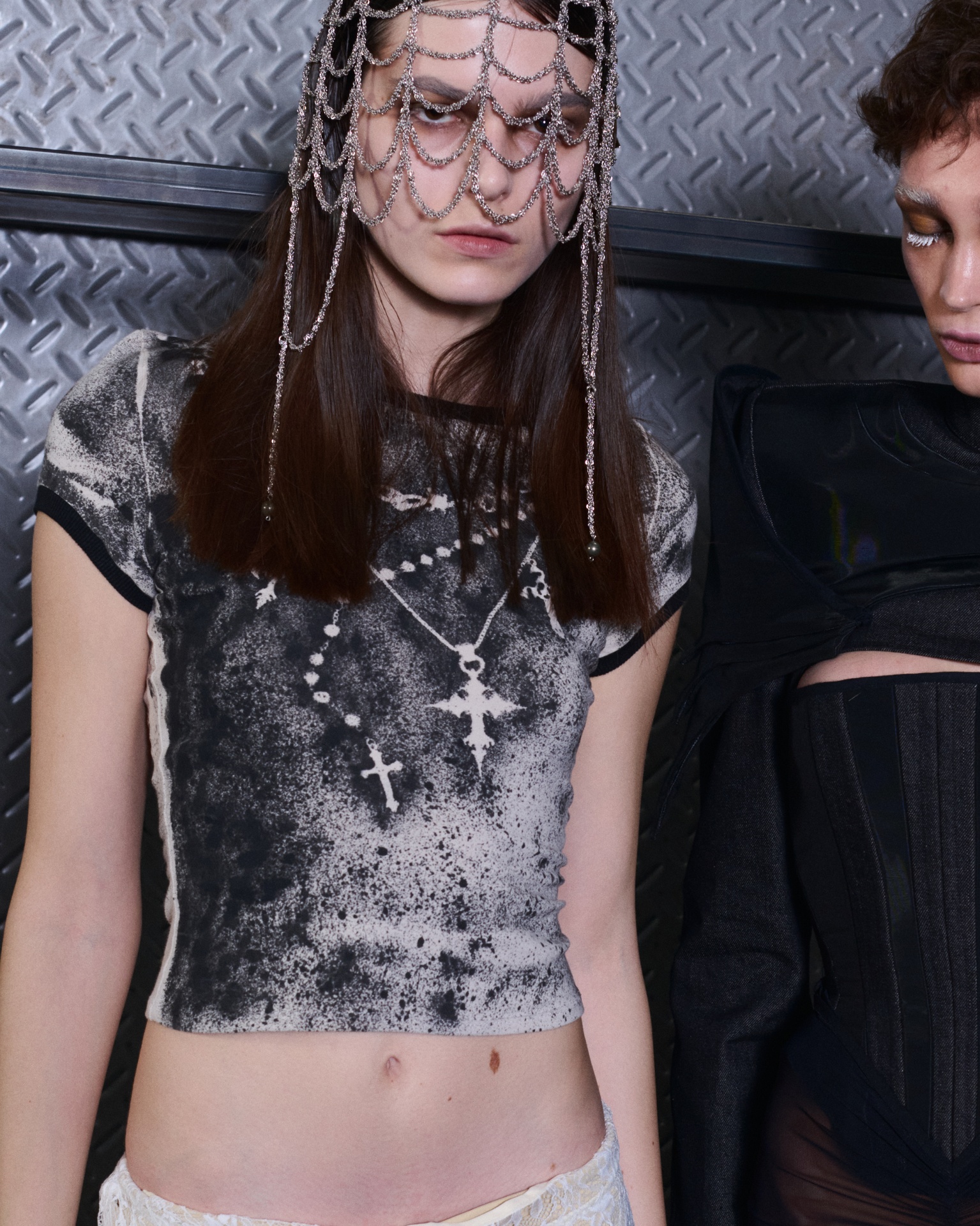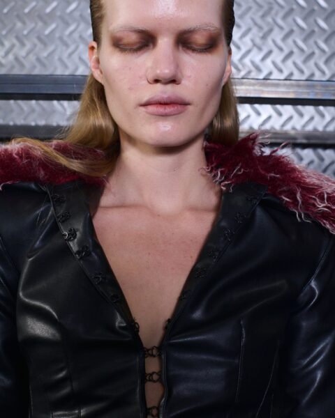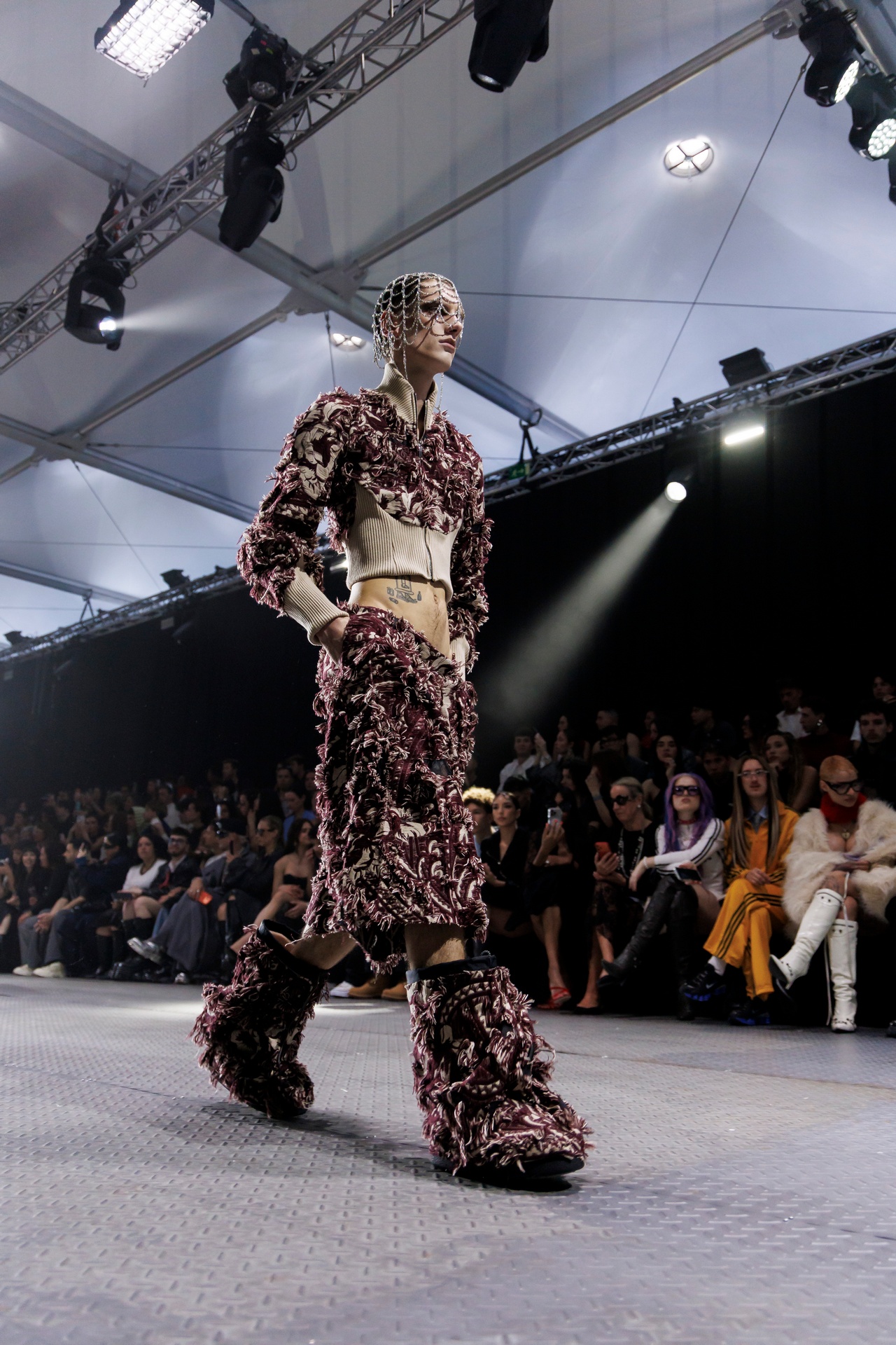 La propuesta habita un territorio entre lo espiritual y lo estructural, entre la luz metálica y la sombra del fuego. A través de materiales como organza, cuero sintético, pelo y encaje quemado, la colección aborda la idea de regeneración: el cuerpo que se quema, muta y renace. Cada textura cumple una función narrativa —estructura, ligereza, memoria abrasada, protección— construyendo un lenguaje visual de resistencia y transformación. La paleta cromática, del gris perla al negro carbón con reflejos plateados y pulsos de rojo, refuerza la tensión entre vulnerabilidad, poder y fortaleza interior.