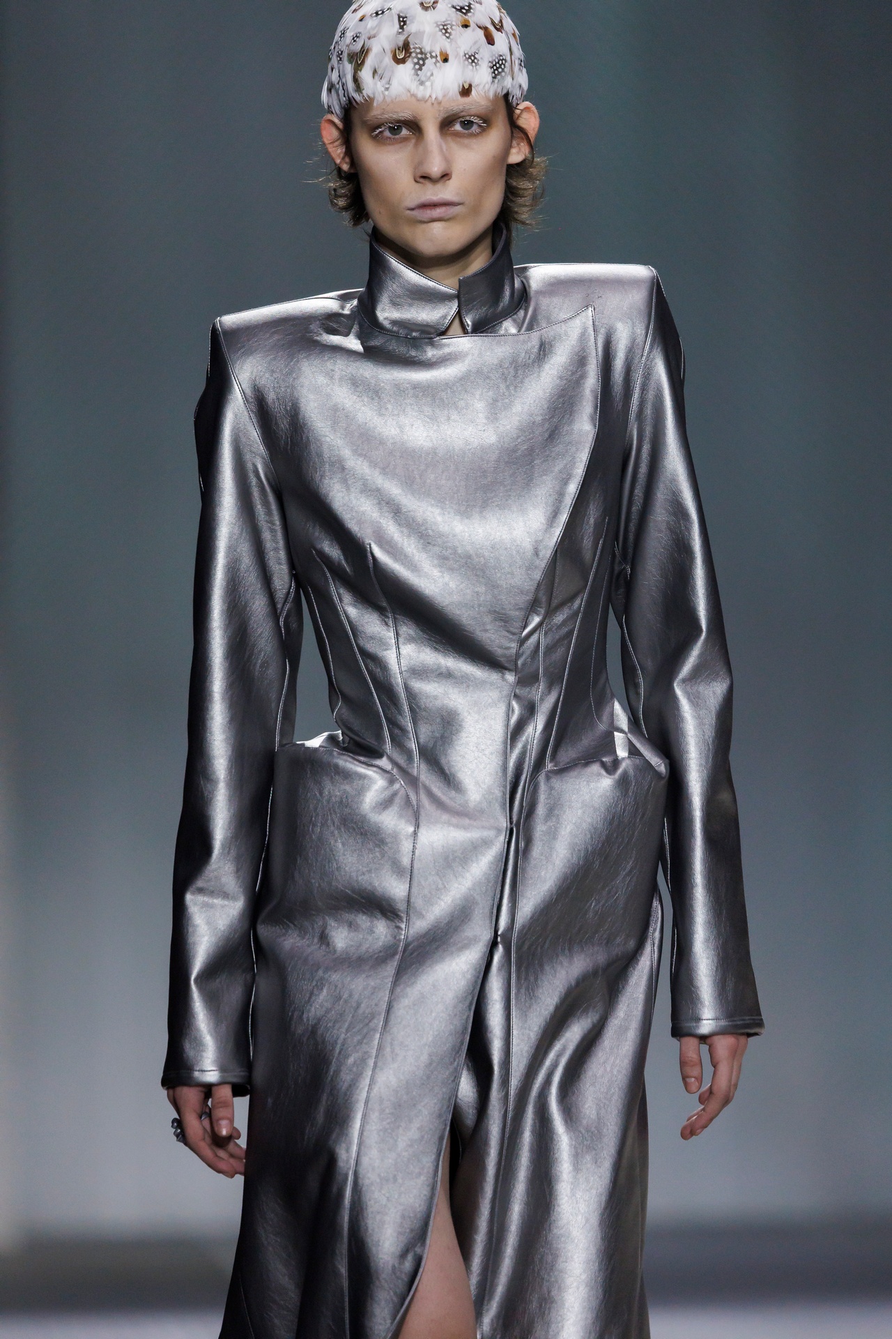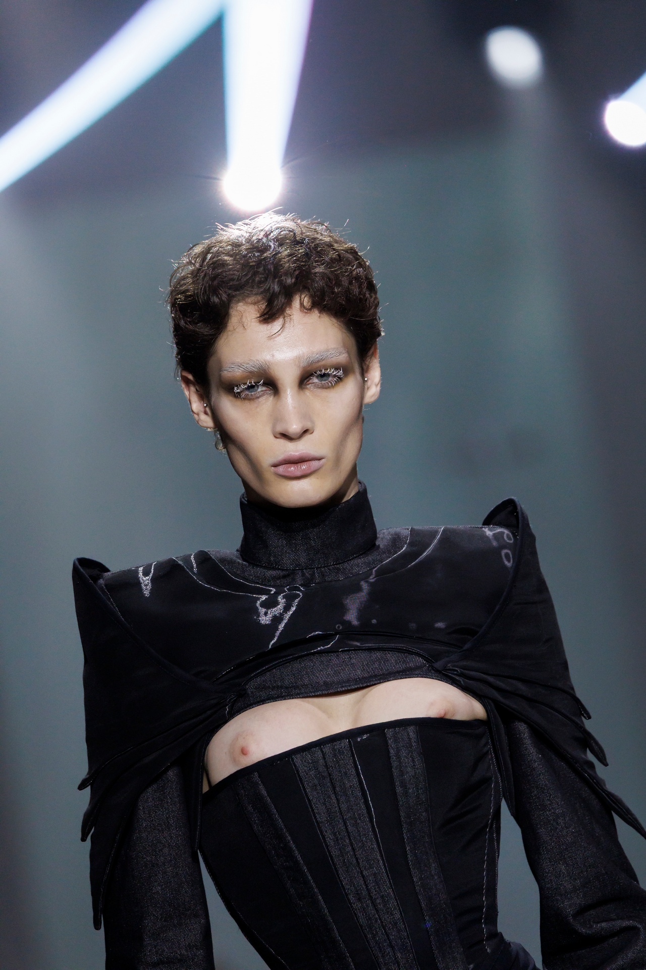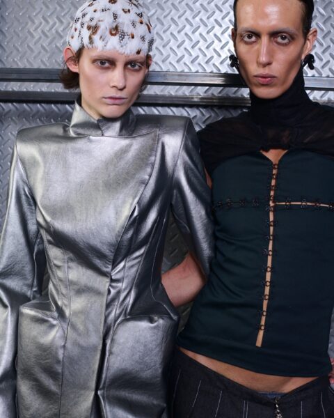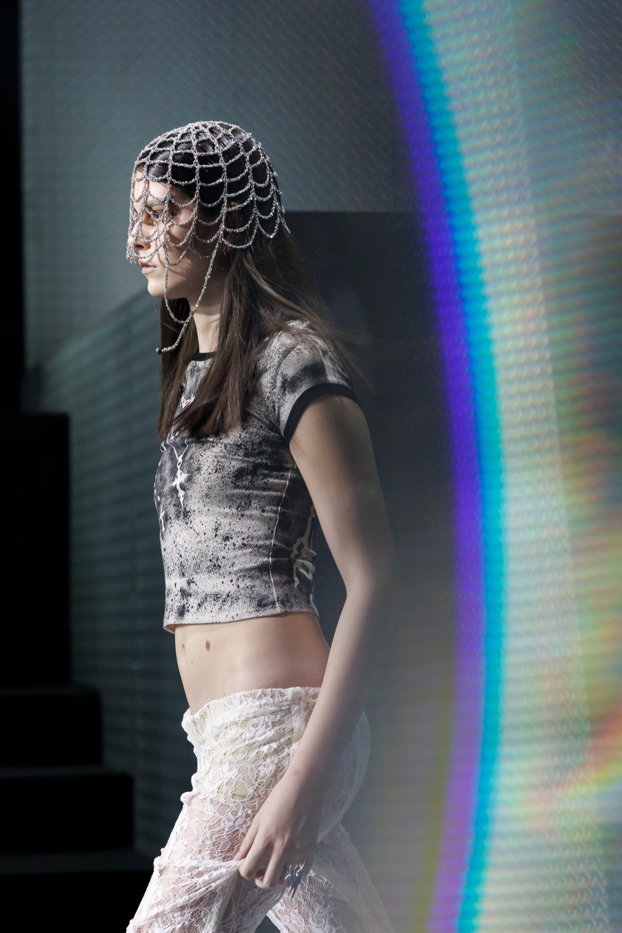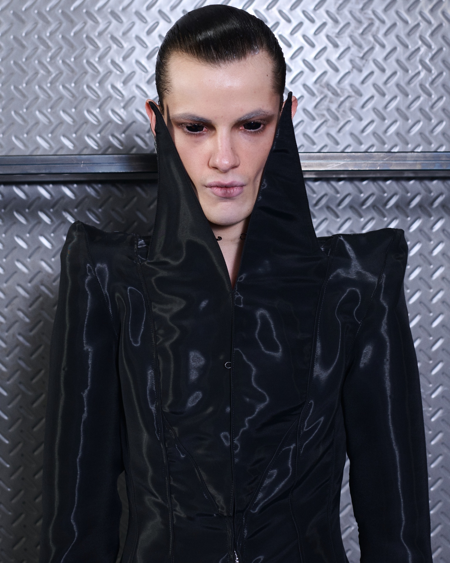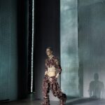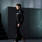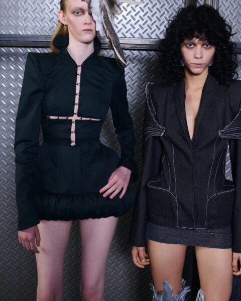 La propuesta habita un territorio entre lo espiritual y lo estructural, entre la luz metálica y la sombra del fuego. A través de materiales como organza, cuero sintético, pelo y encaje quemado, la colección aborda la idea de regeneración: el cuerpo que se quema, muta y renace. Cada textura cumple una función narrativa —estructura, ligereza, memoria abrasada, protección— construyendo un lenguaje visual de resistencia y transformación. La paleta cromática, del gris perla al negro carbón con reflejos plateados y pulsos de rojo, refuerza la tensión entre vulnerabilidad, poder y fortaleza interior.