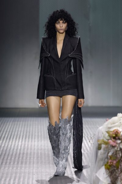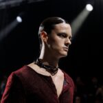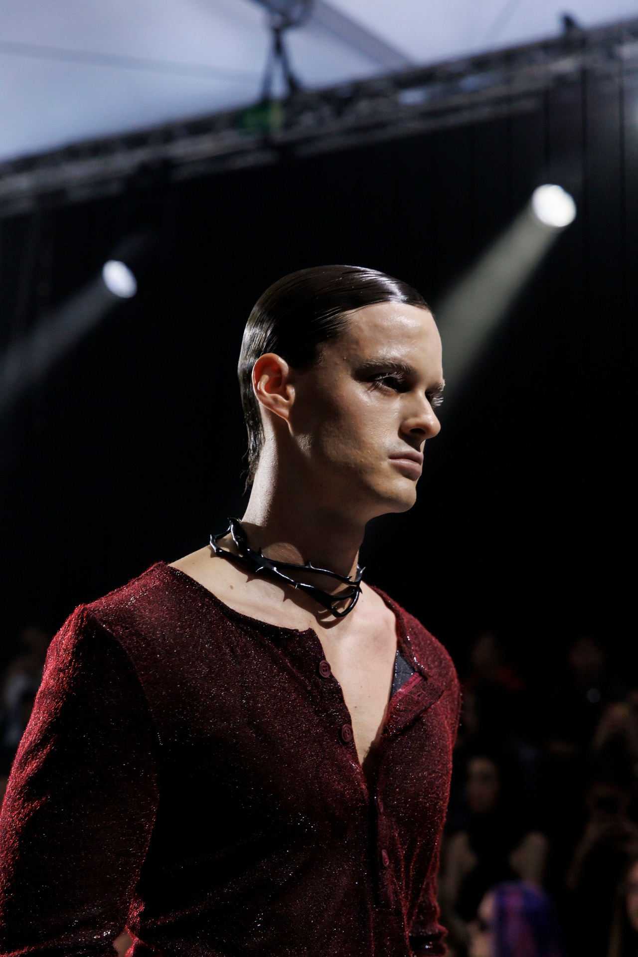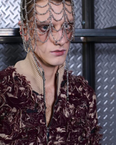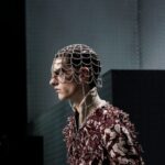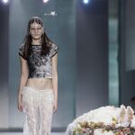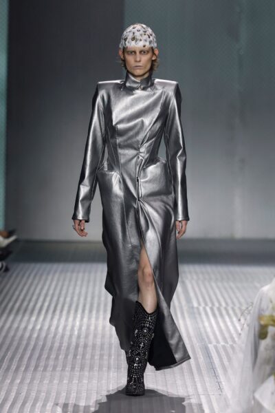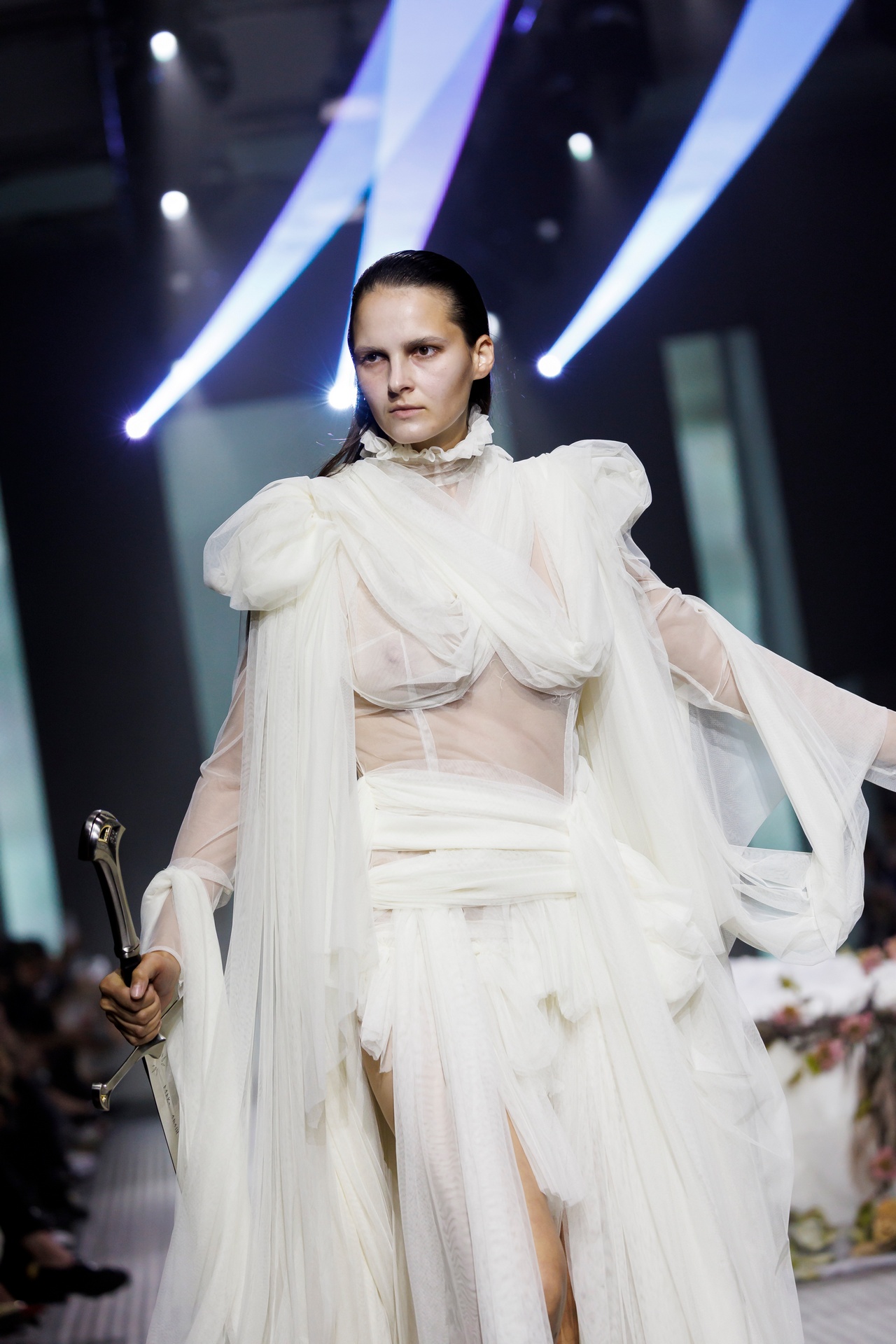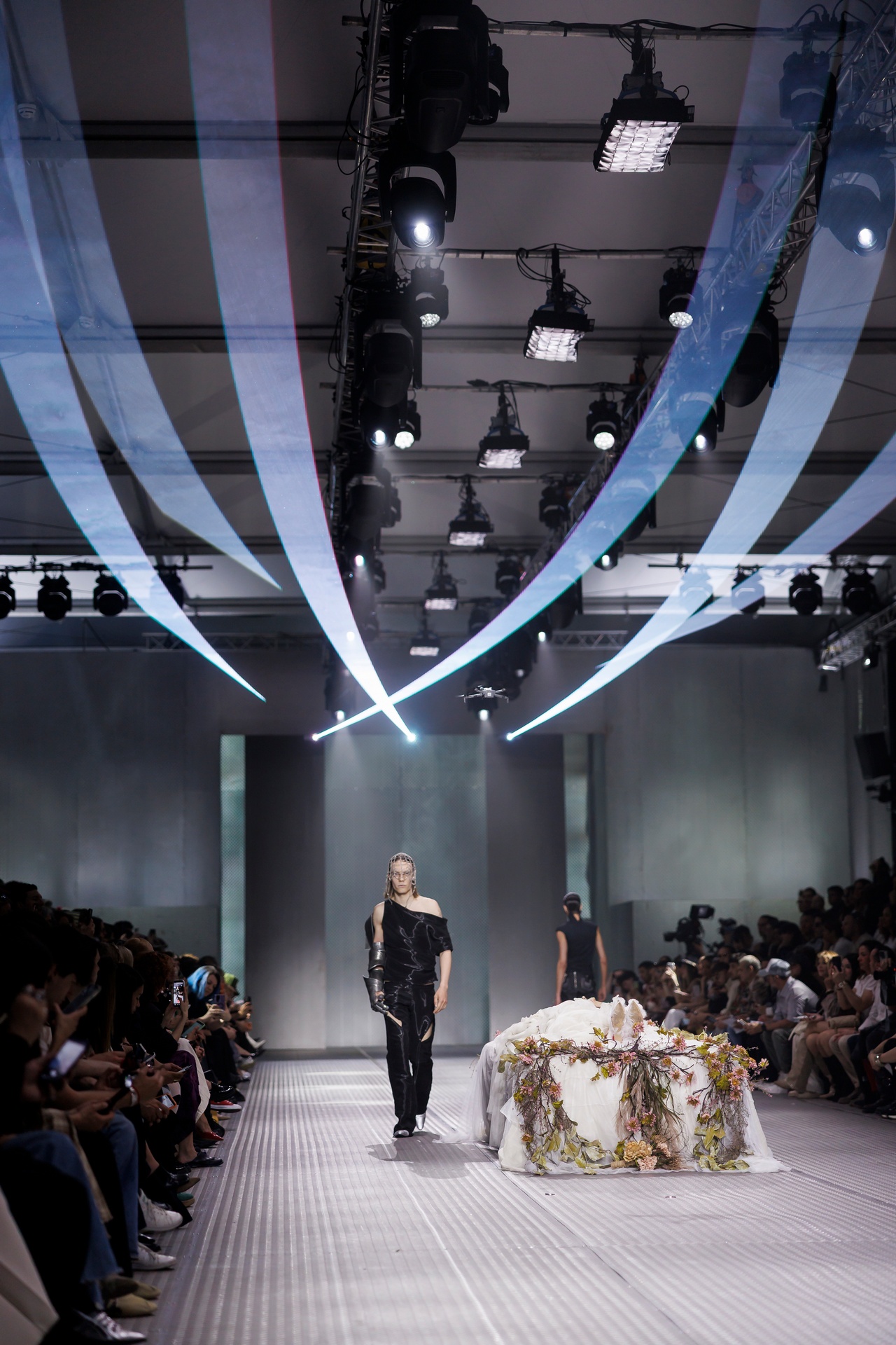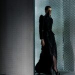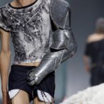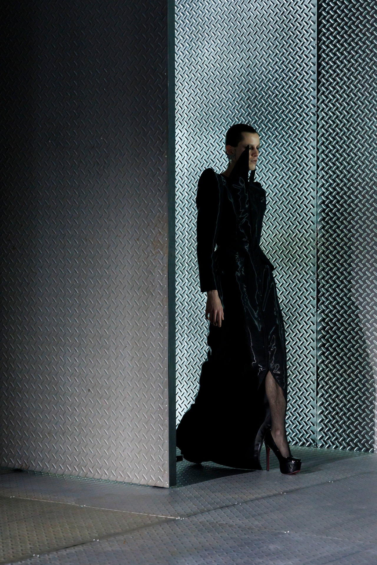 La propuesta habita un territorio entre lo espiritual y lo estructural, entre la luz metálica y la sombra del fuego. A través de materiales como organza, cuero sintético, pelo y encaje quemado, la colección aborda la idea de regeneración: el cuerpo que se quema, muta y renace. Cada textura cumple una función narrativa —estructura, ligereza, memoria abrasada, protección— construyendo un lenguaje visual de resistencia y transformación. La paleta cromática, del gris perla al negro carbón con reflejos plateados y pulsos de rojo, refuerza la tensión entre vulnerabilidad, poder y fortaleza interior.