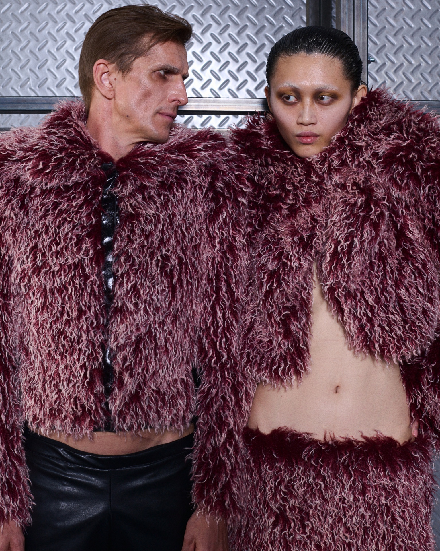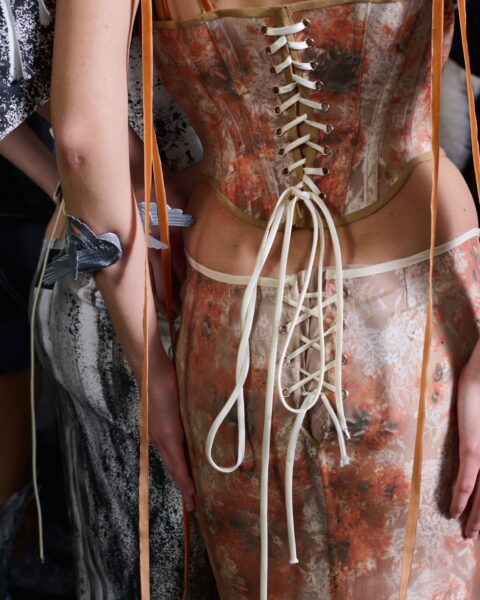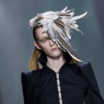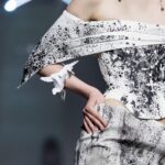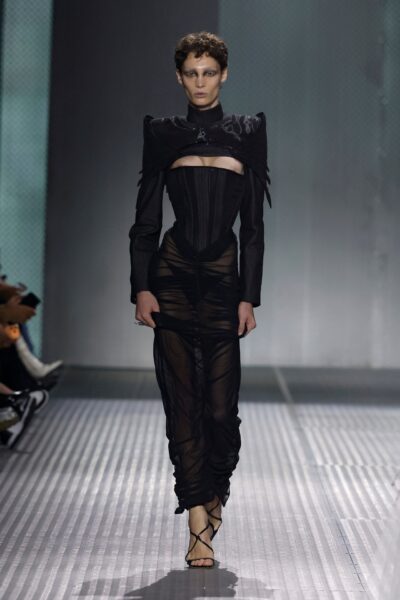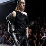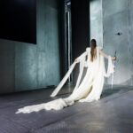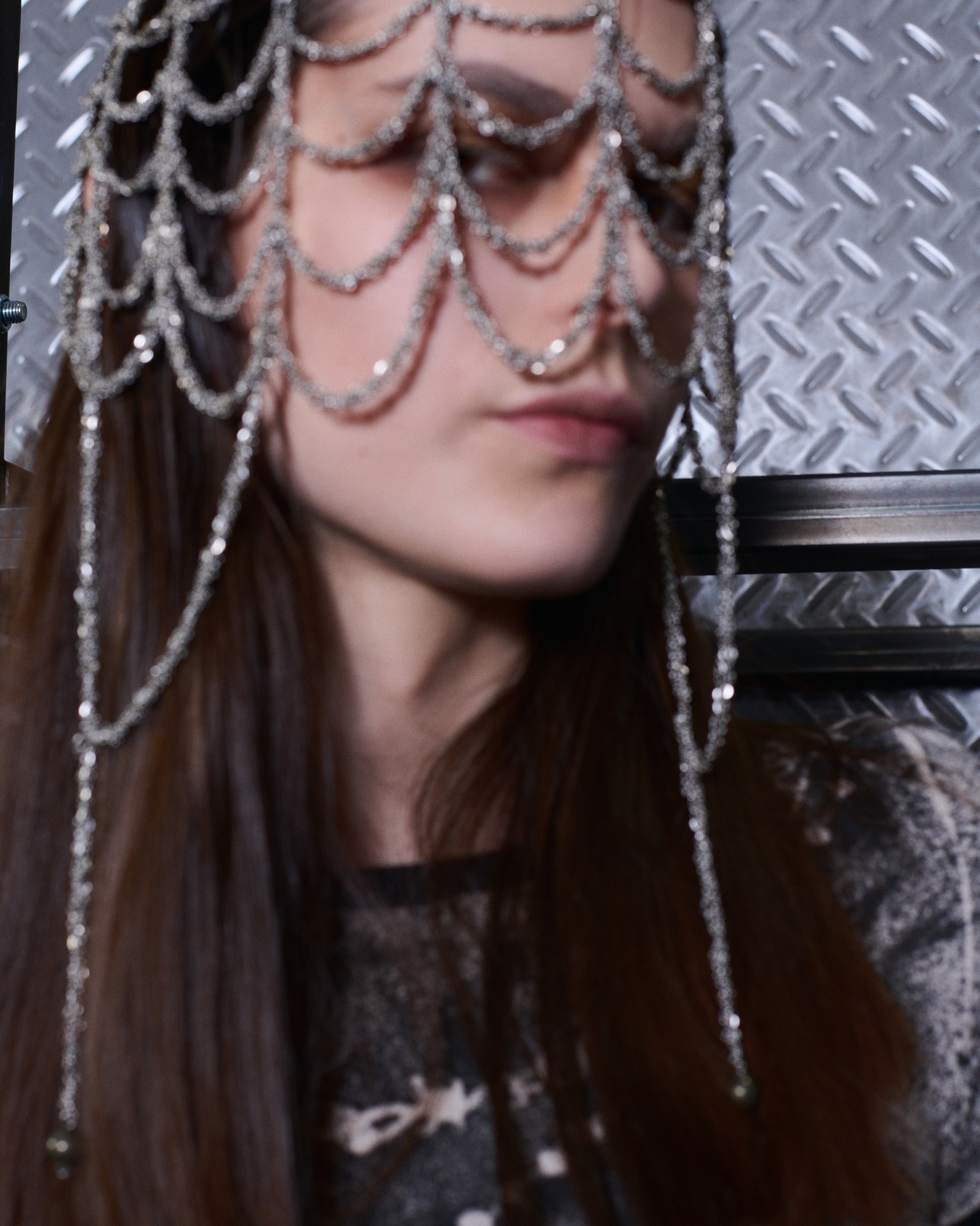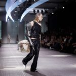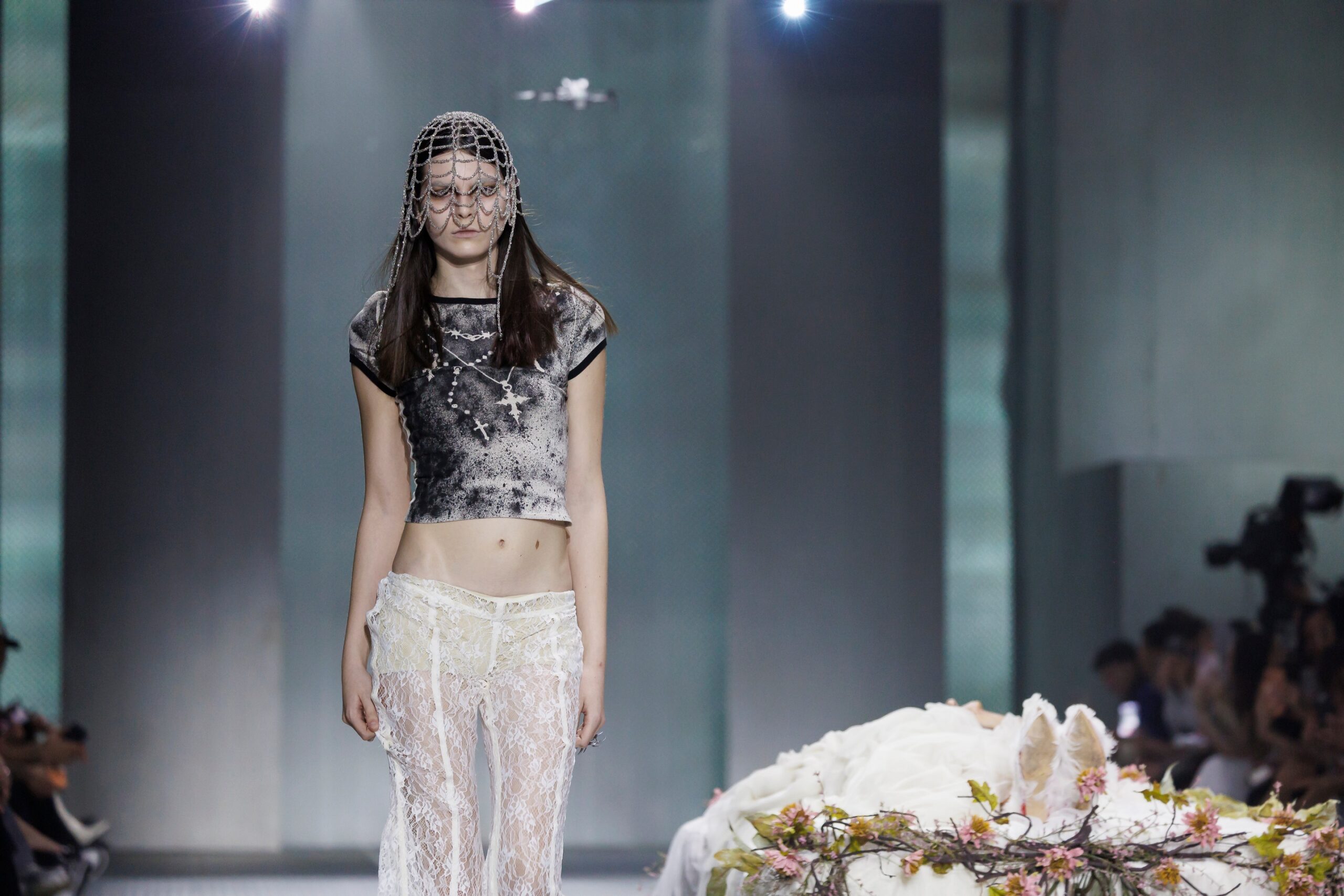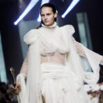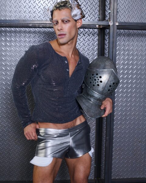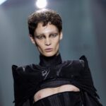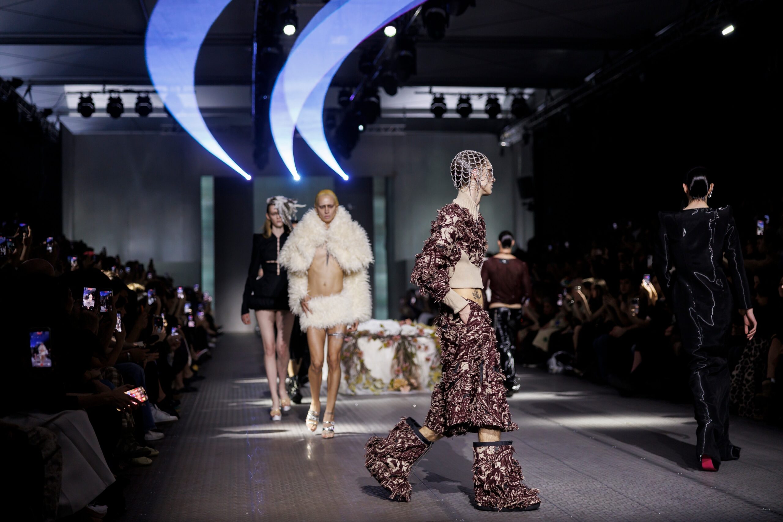 La propuesta habita un territorio entre lo espiritual y lo estructural, entre la luz metálica y la sombra del fuego. A través de materiales como organza, cuero sintético, pelo y encaje quemado, la colección aborda la idea de regeneración: el cuerpo que se quema, muta y renace. Cada textura cumple una función narrativa —estructura, ligereza, memoria abrasada, protección— construyendo un lenguaje visual de resistencia y transformación. La paleta cromática, del gris perla al negro carbón con reflejos plateados y pulsos de rojo, refuerza la tensión entre vulnerabilidad, poder y fortaleza interior.