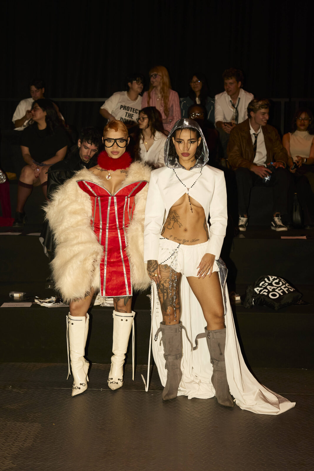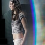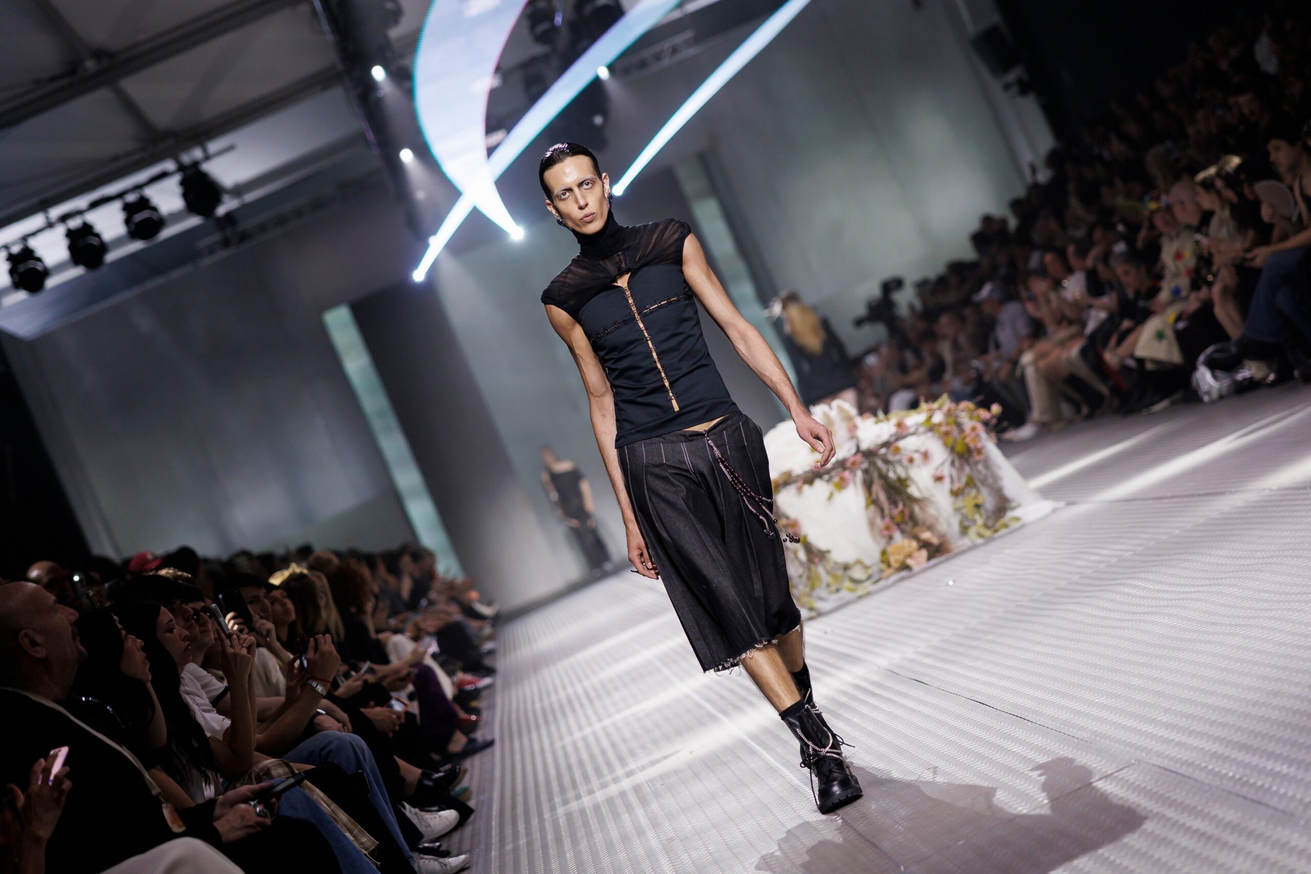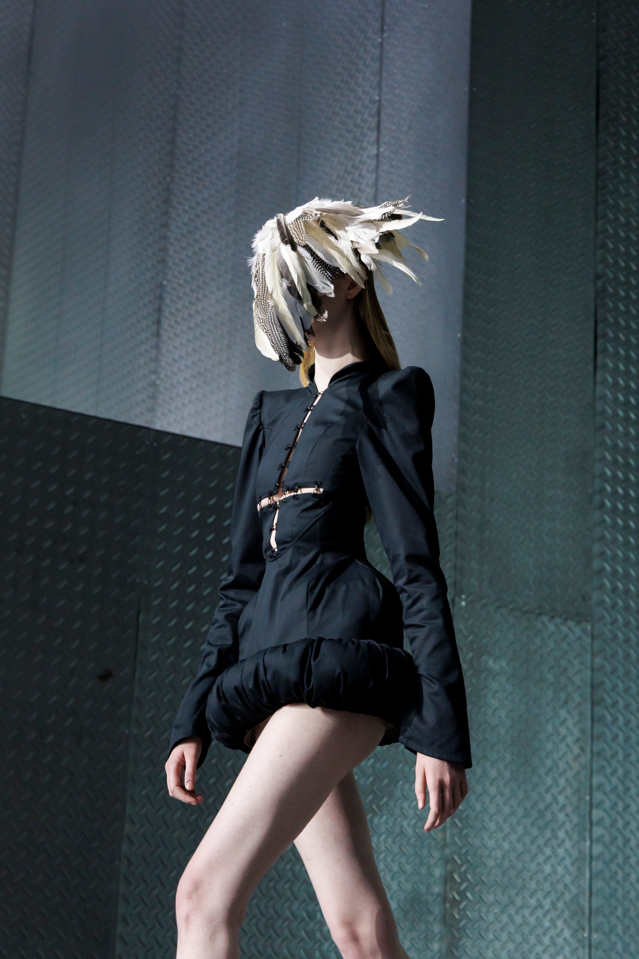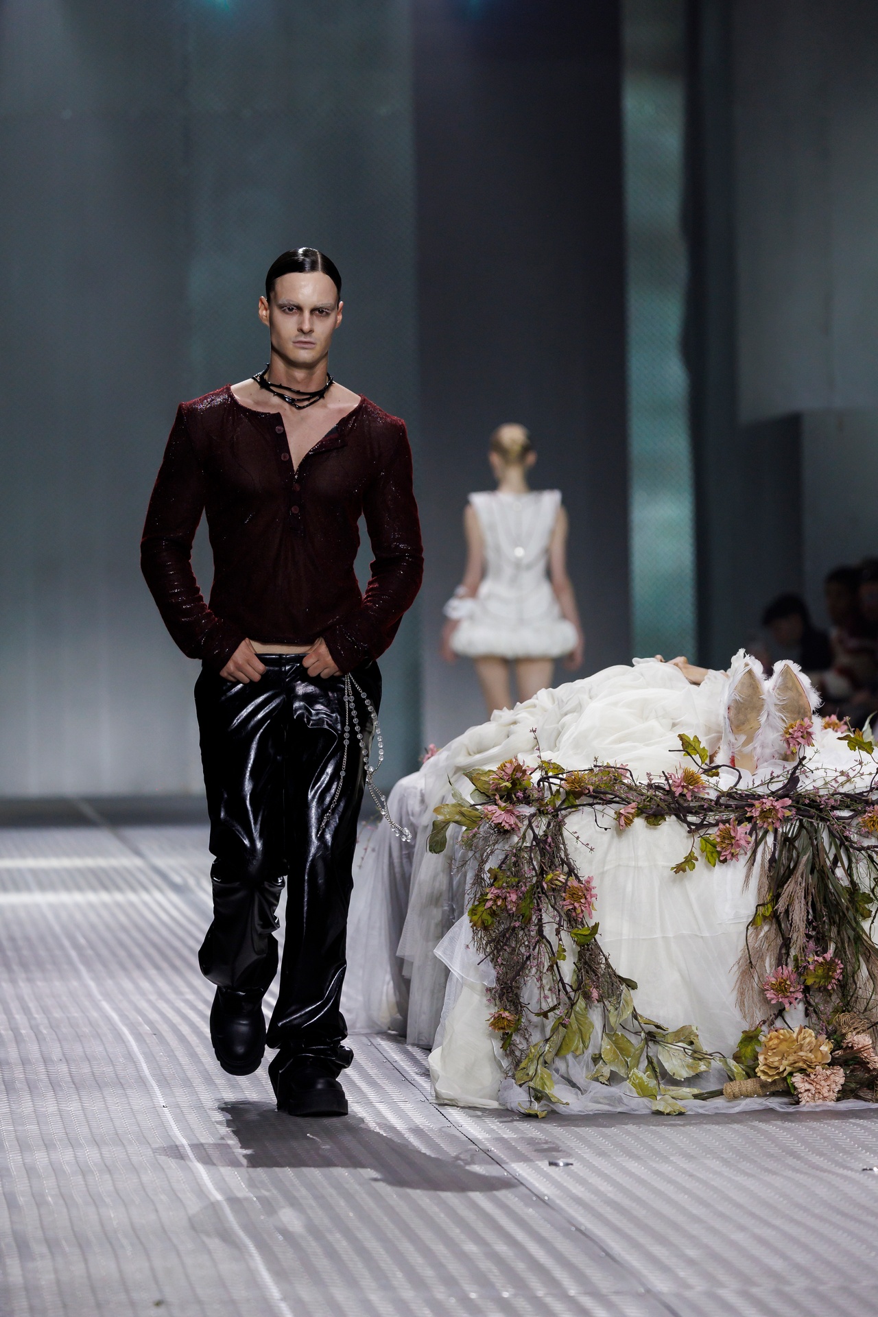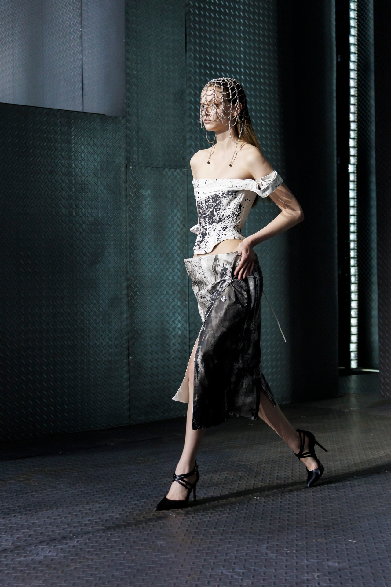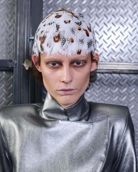La propuesta habita un territorio entre lo espiritual y lo estructural, entre la luz metálica y la sombra del fuego. A través de materiales como organza, cuero sintético, pelo y encaje quemado, la colección aborda la idea de regeneración: el cuerpo que se quema, muta y renace. Cada textura cumple una función narrativa —estructura, ligereza, memoria abrasada, protección— construyendo un lenguaje visual de resistencia y transformación. La paleta cromática, del gris perla al negro carbón con reflejos plateados y pulsos de rojo, refuerza la tensión entre vulnerabilidad, poder y fortaleza interior.